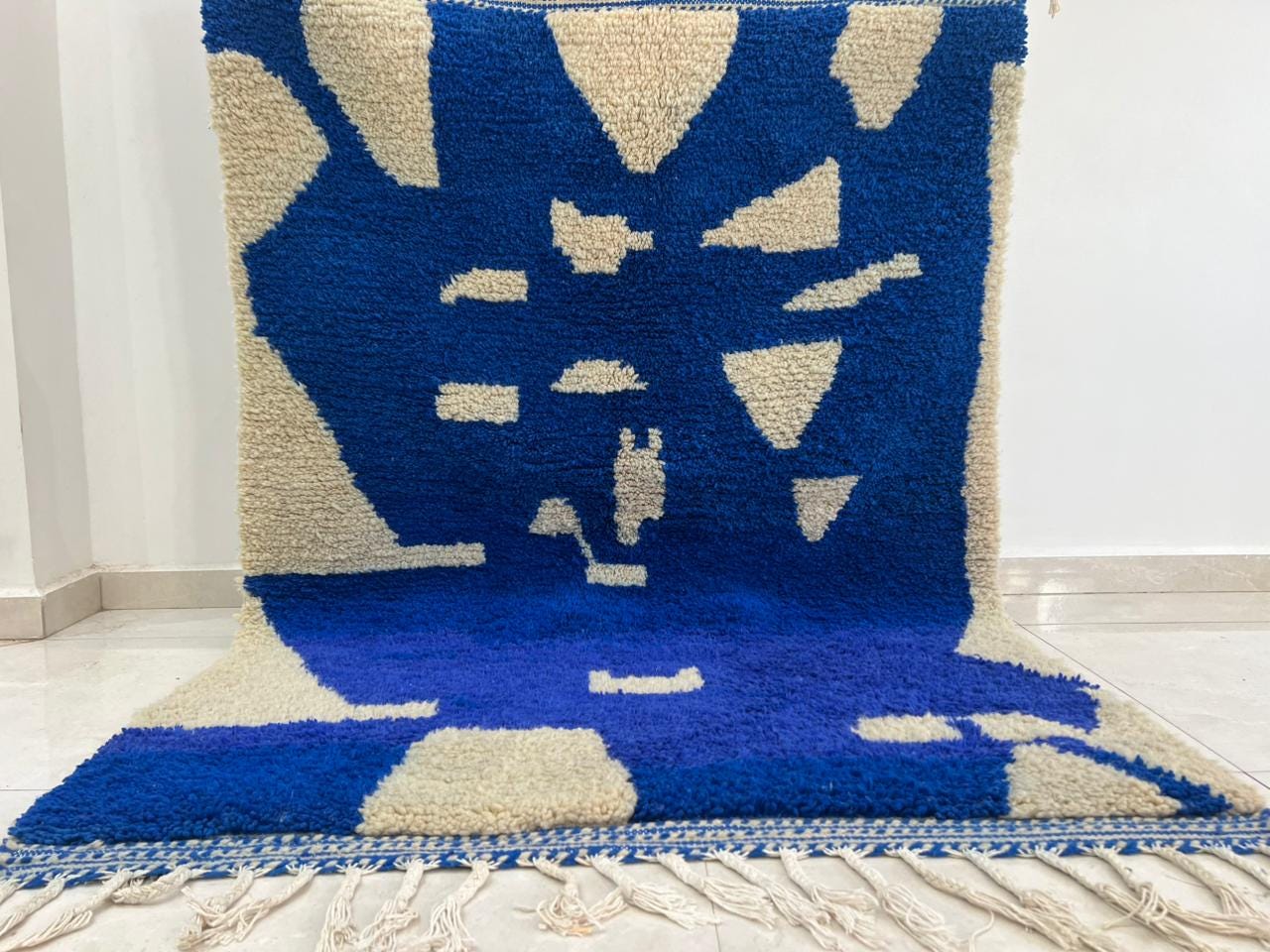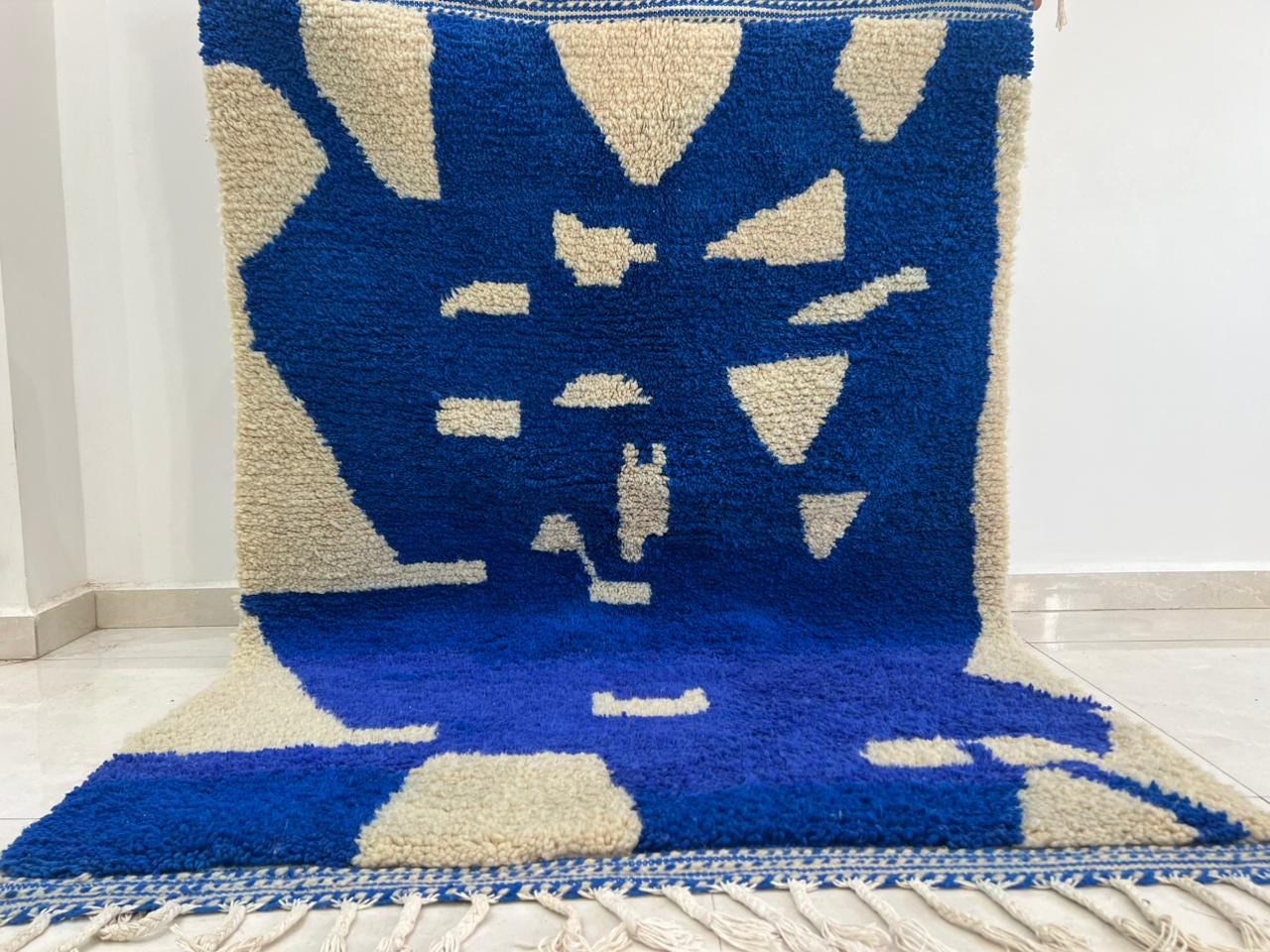 ✨ Transform your space with this stunning handwoven Moroccan Beni Ourain rug. Crafted in vibrant royal blue and natural cream, it's designed for those who appreciate authentic Berber artistry and bohemian elegance in their home.