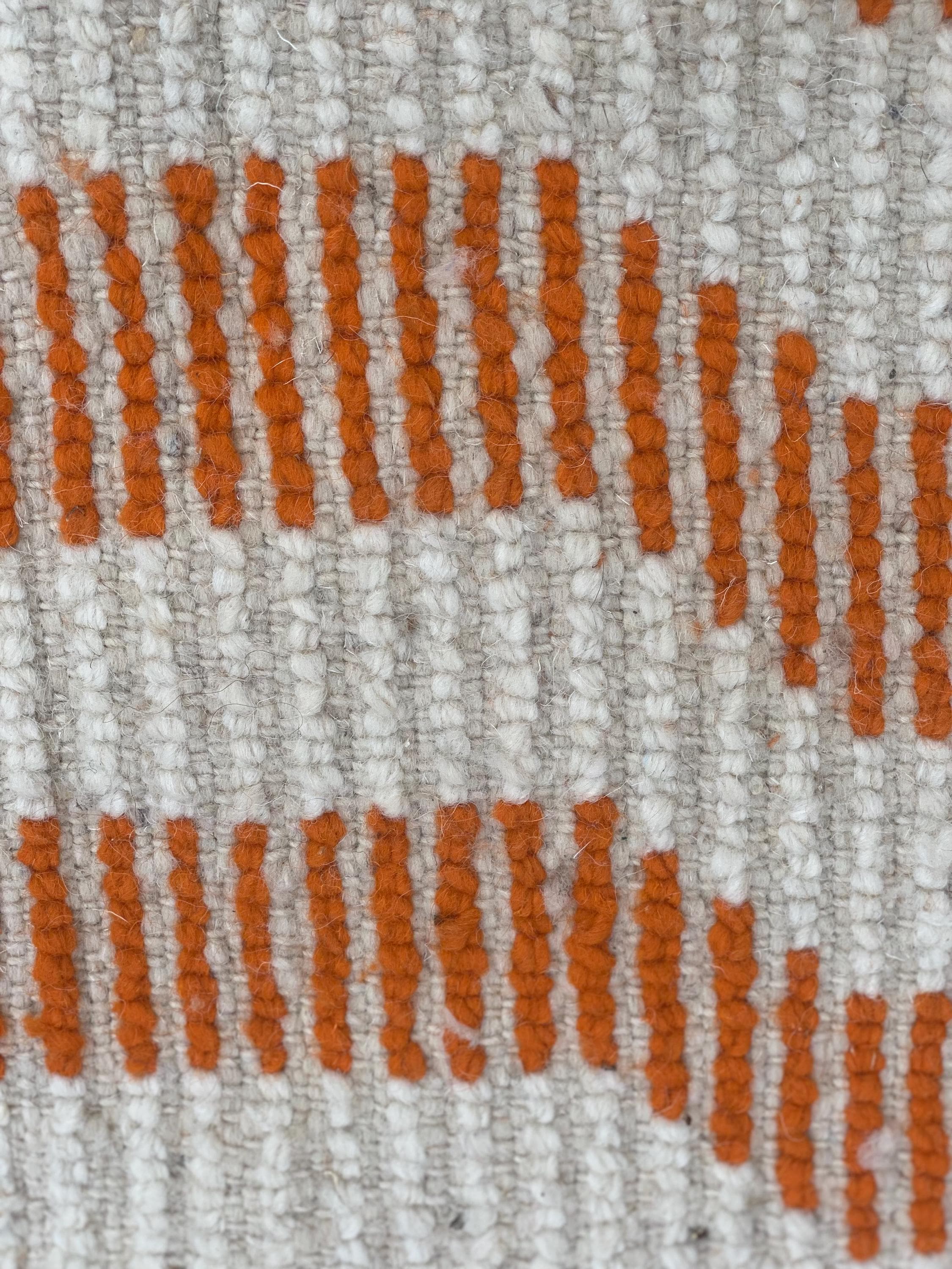 This rug is handwoven by skilled Berber women in Morocco using techniques passed down through generations. Each chevron wave is carefully created on a traditional wooden loom, taking weeks to complete. The warm orange represents joy and energy in Moroccan culture, while the flowing pattern symbolizes the movement of life.