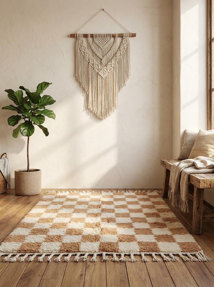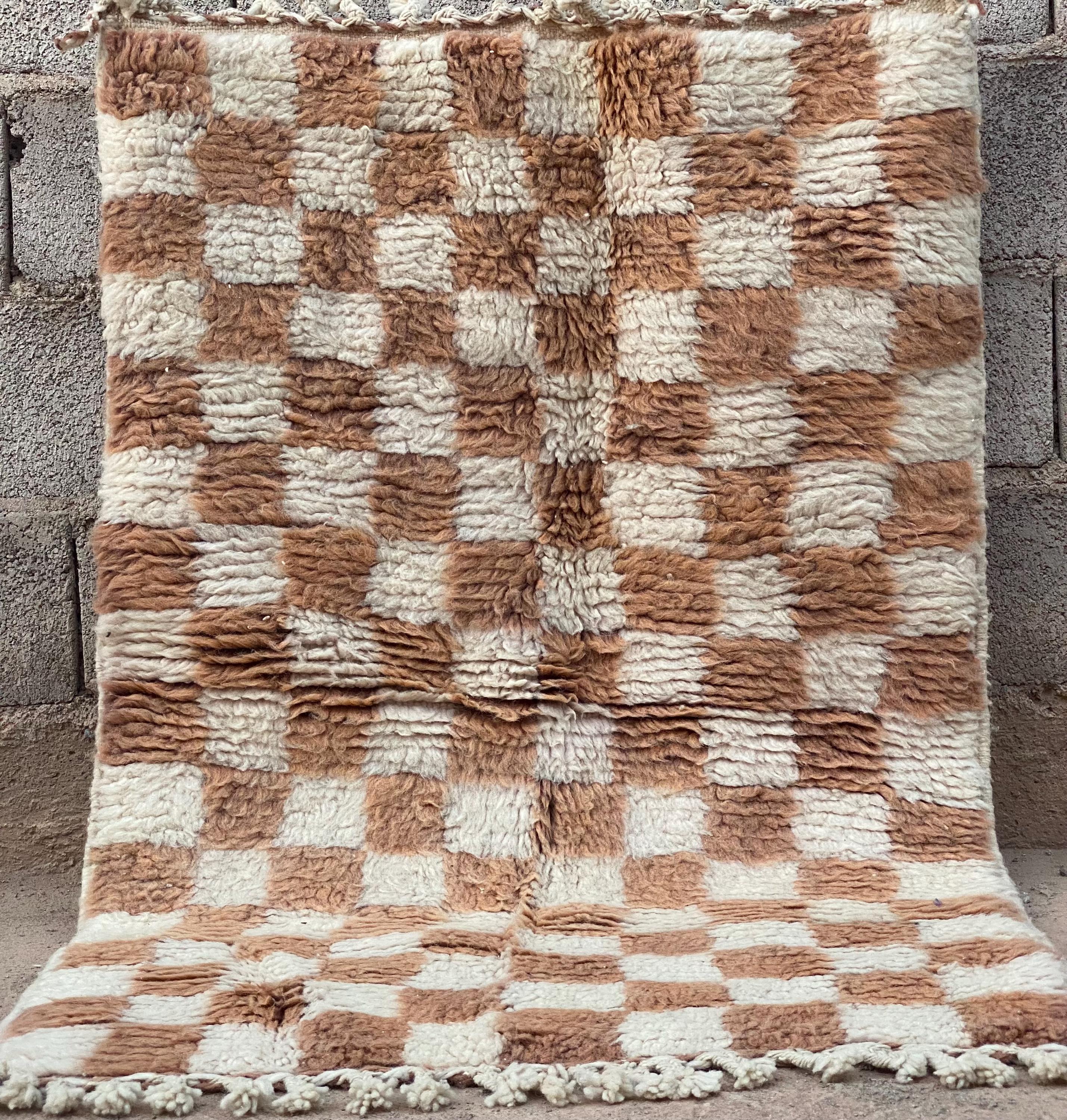 Natural cream and caramel brown checkered pattern, high-pile plush texture, handmade decorative .