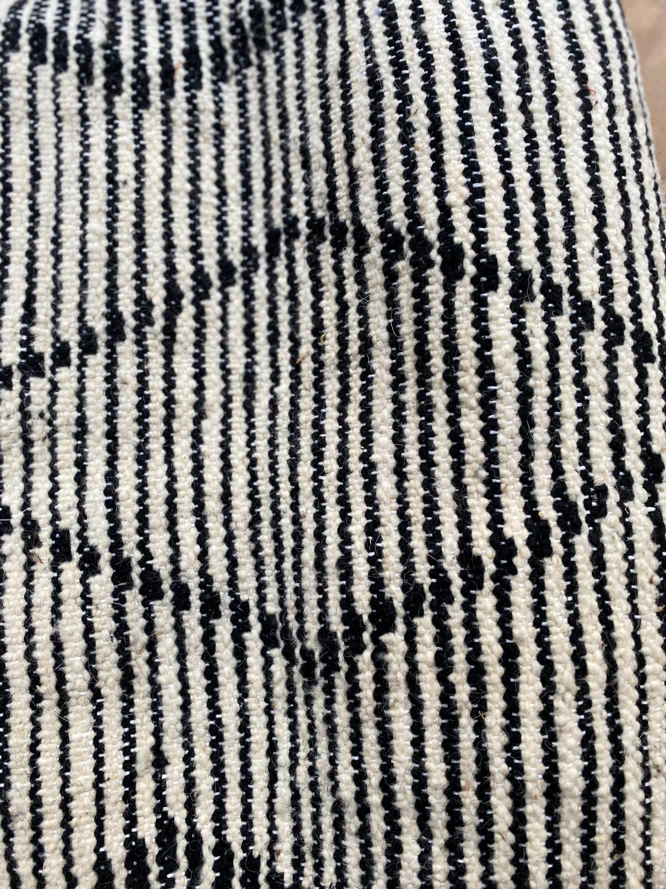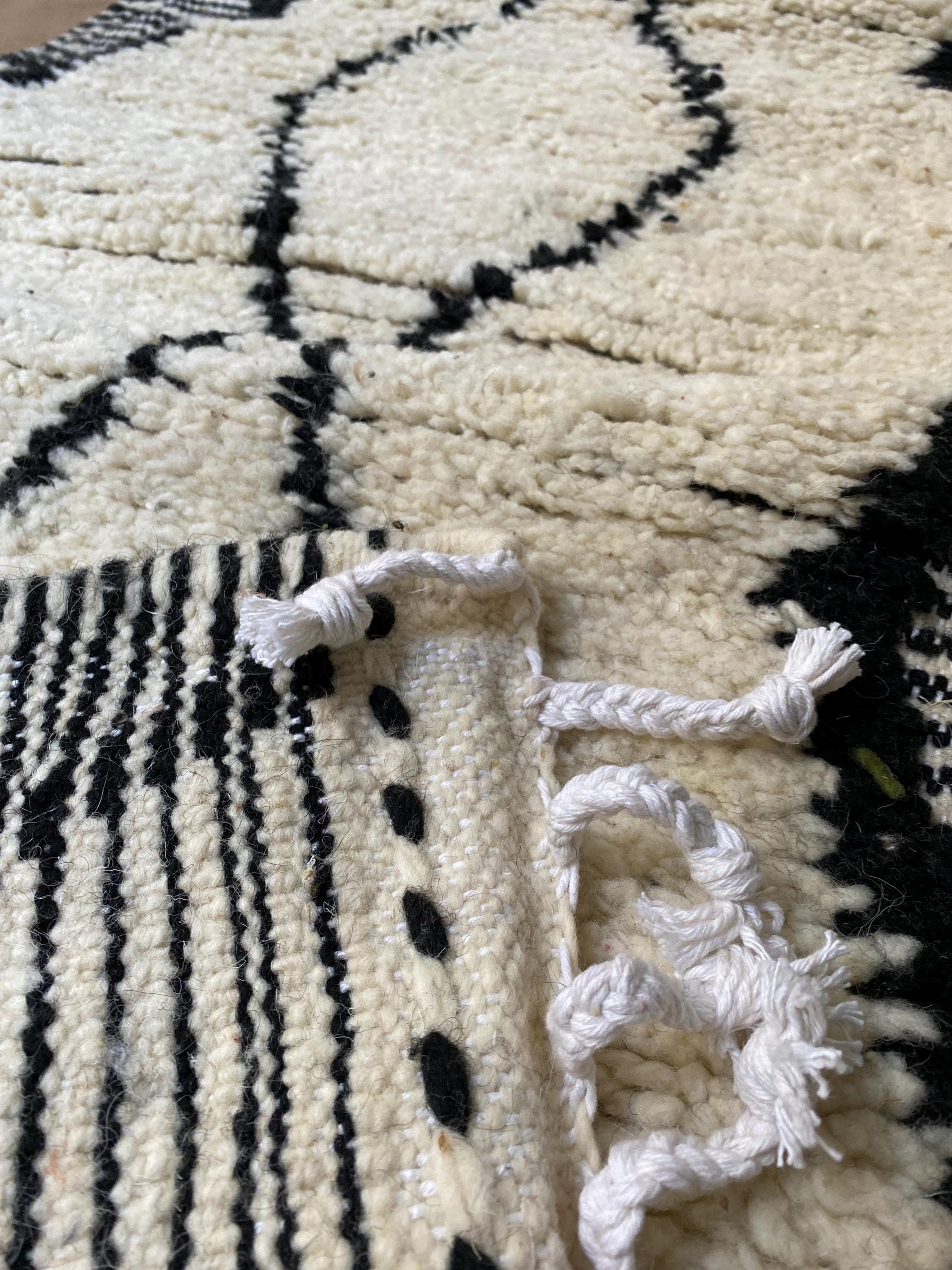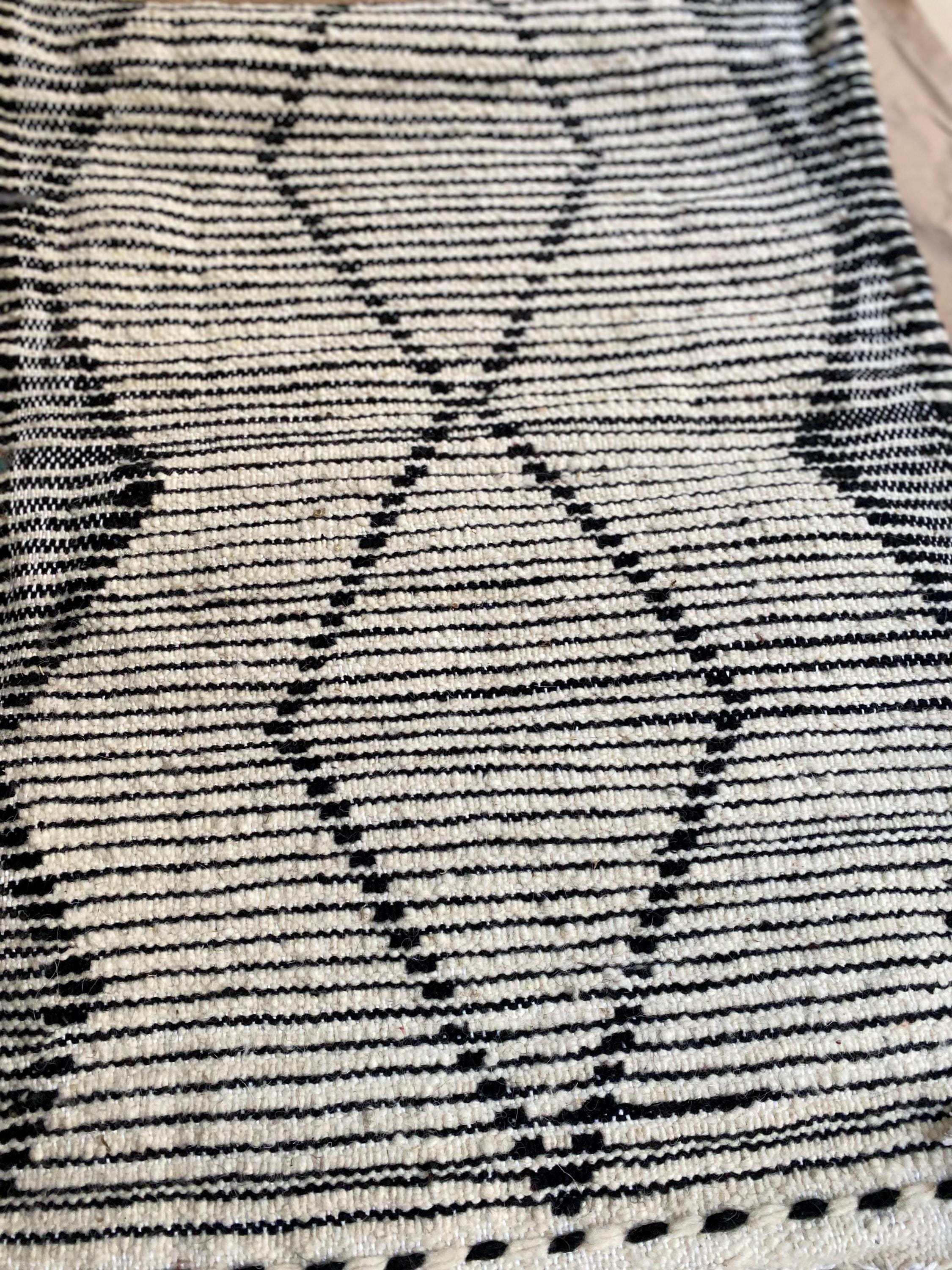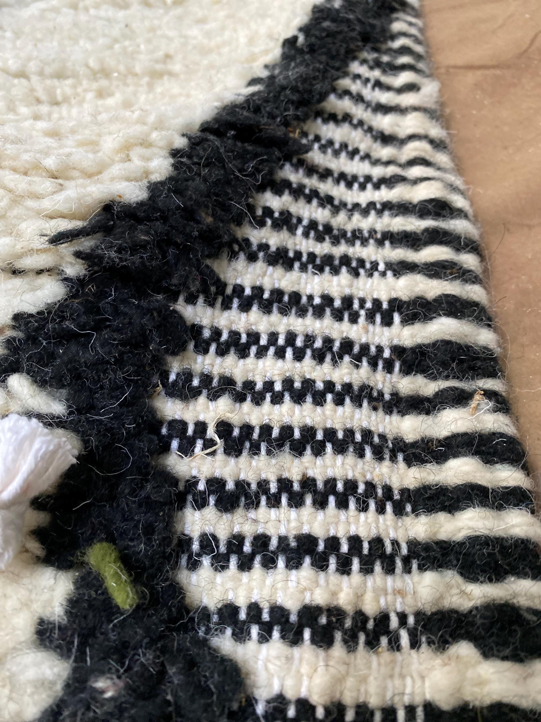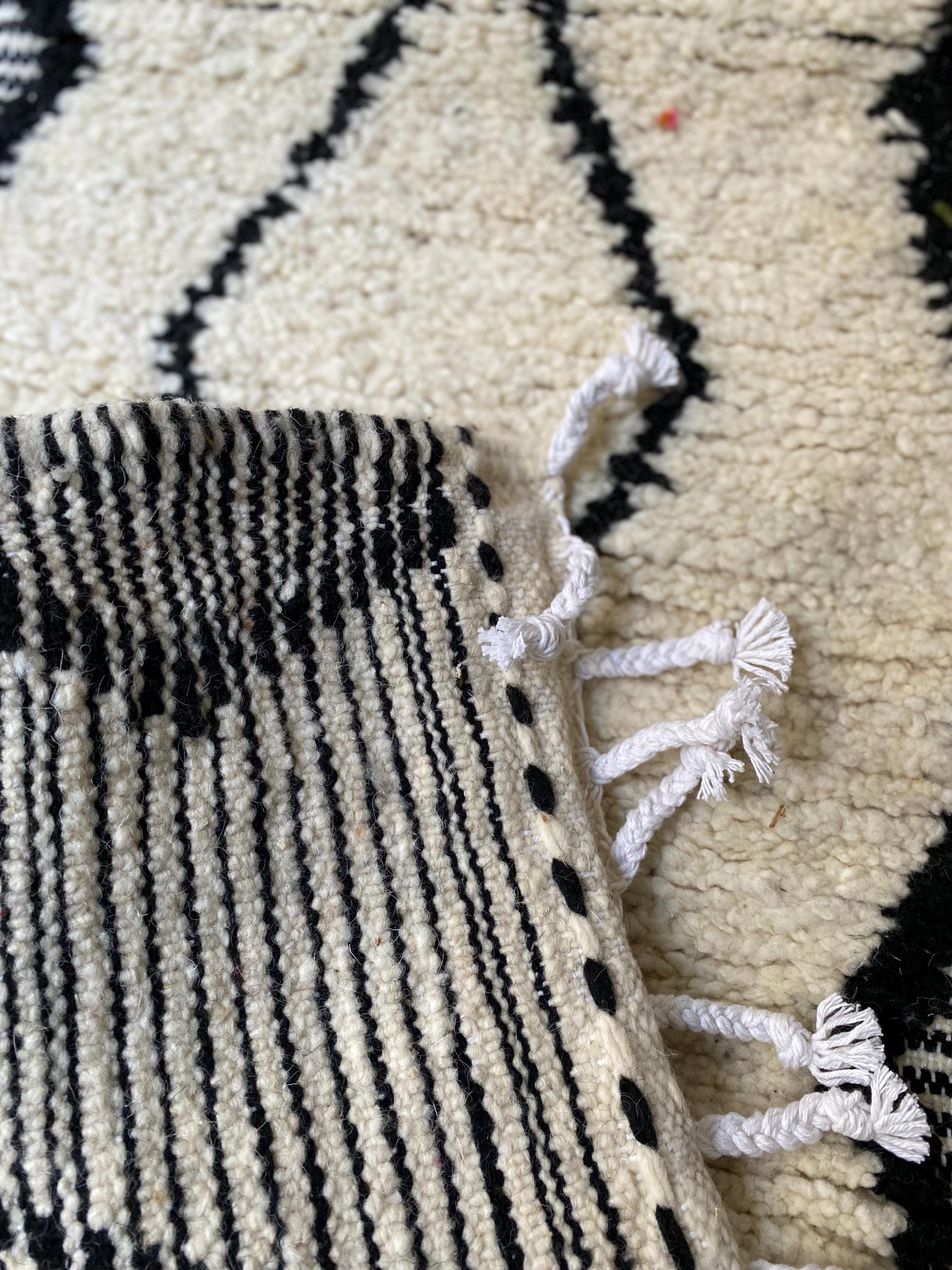 Border: Black and white striped flat-weave edges with decorative white tassels