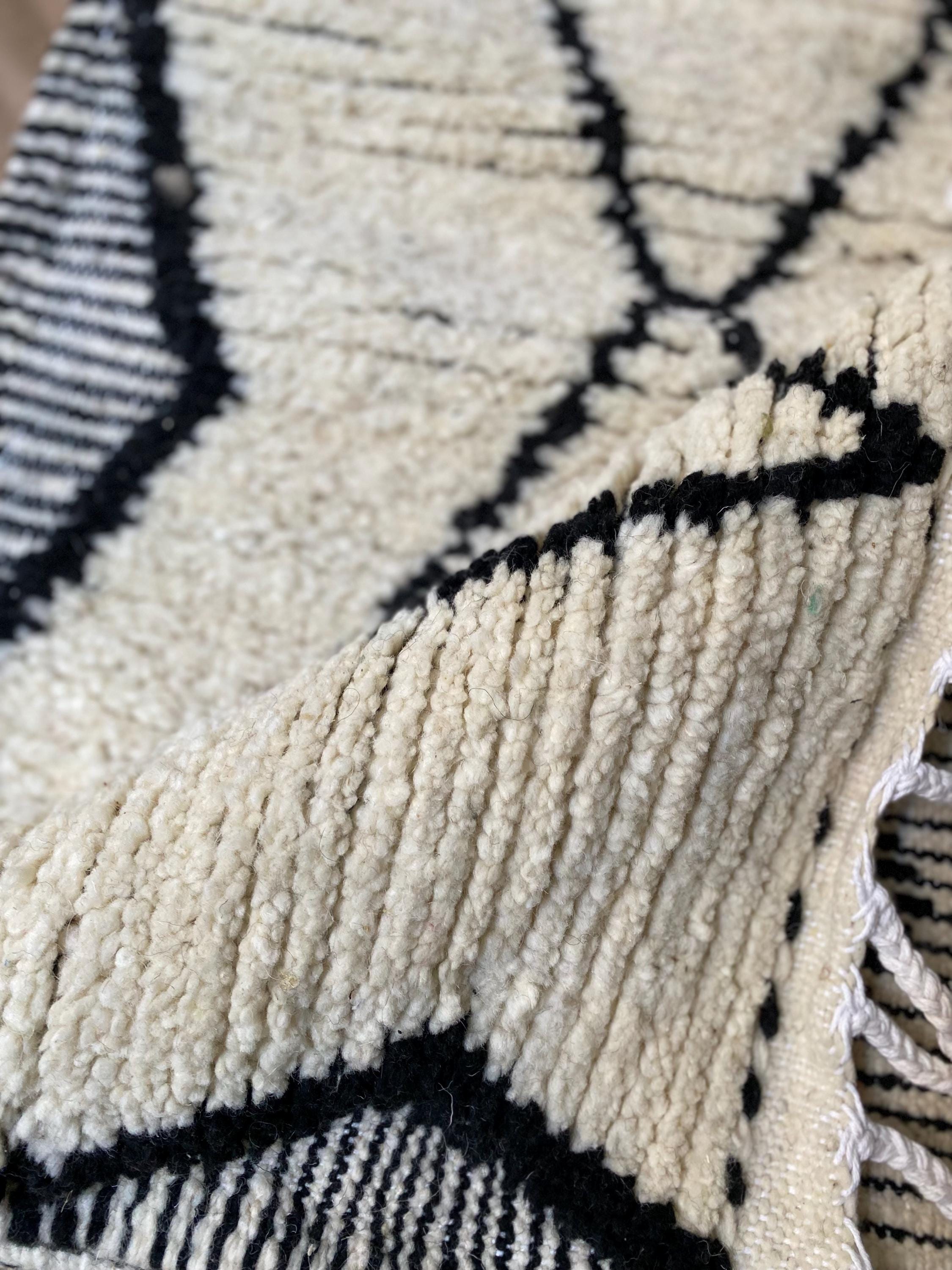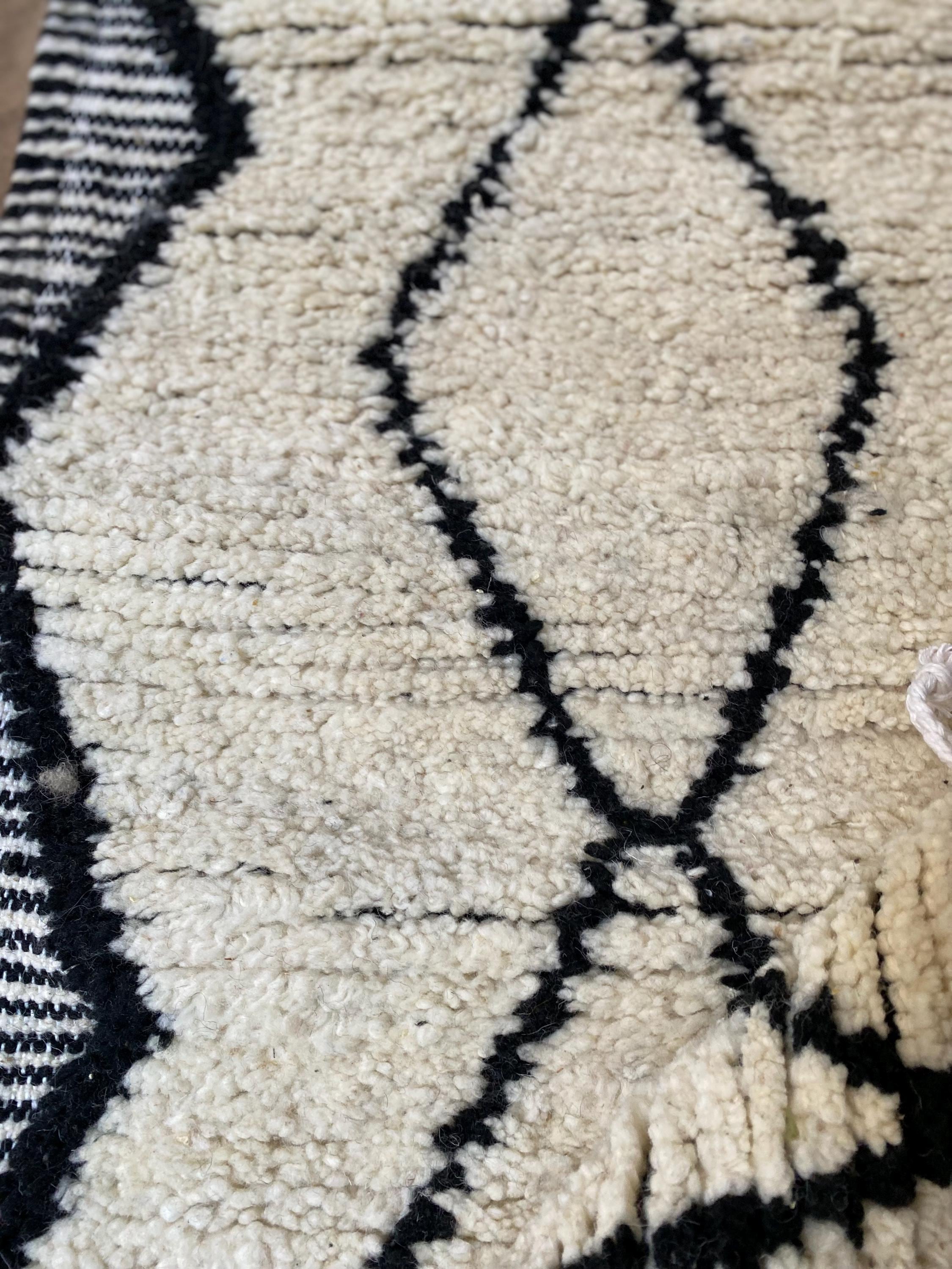 This stunning handwoven Moroccan runner showcases the timeless beauty of authentic Beni Ourain craftsmanship. Featuring a classic diamond geometric pattern in natural cream wool with bold black accents, this piece brings warmth and bohemian elegance to any space.