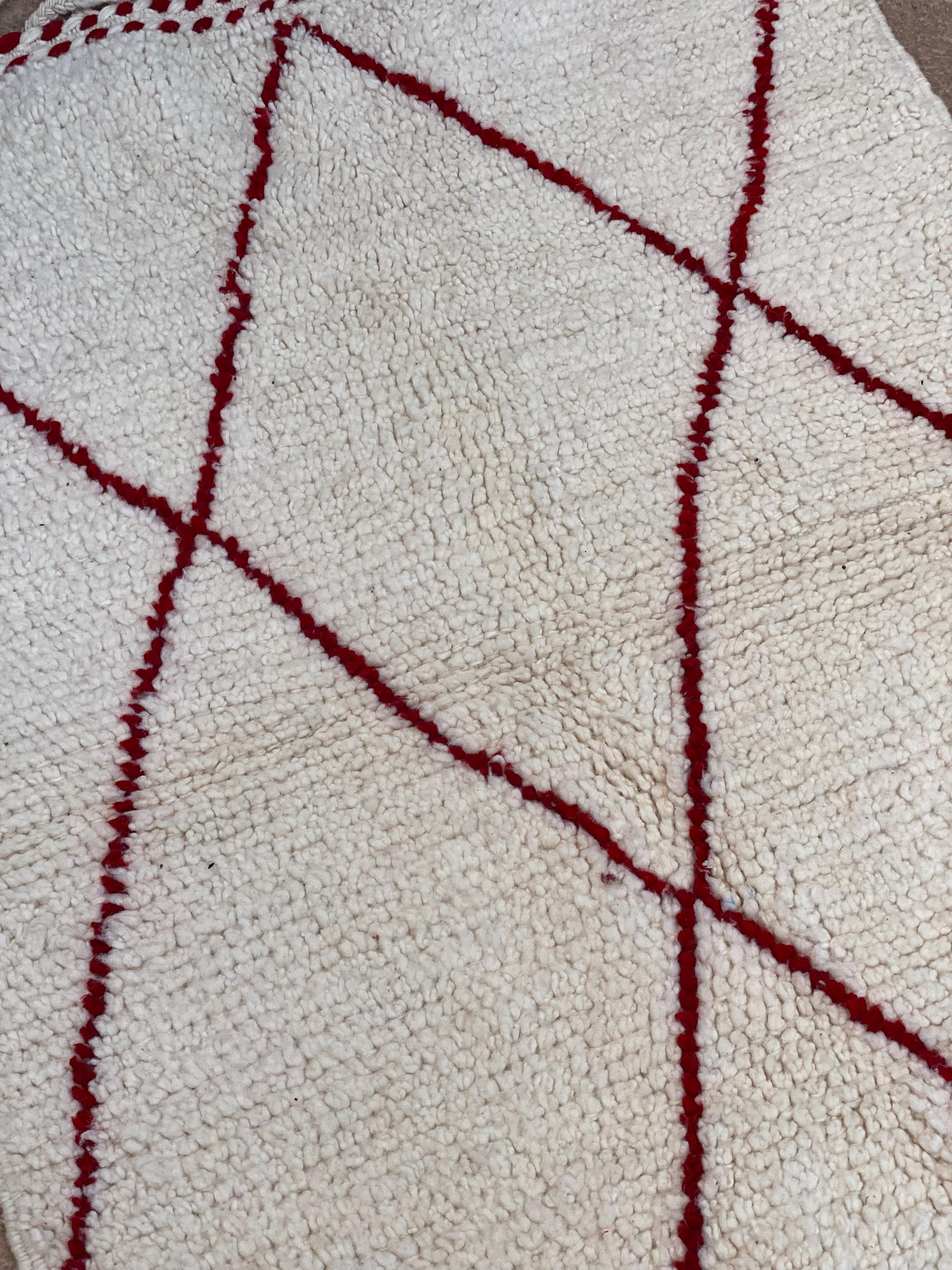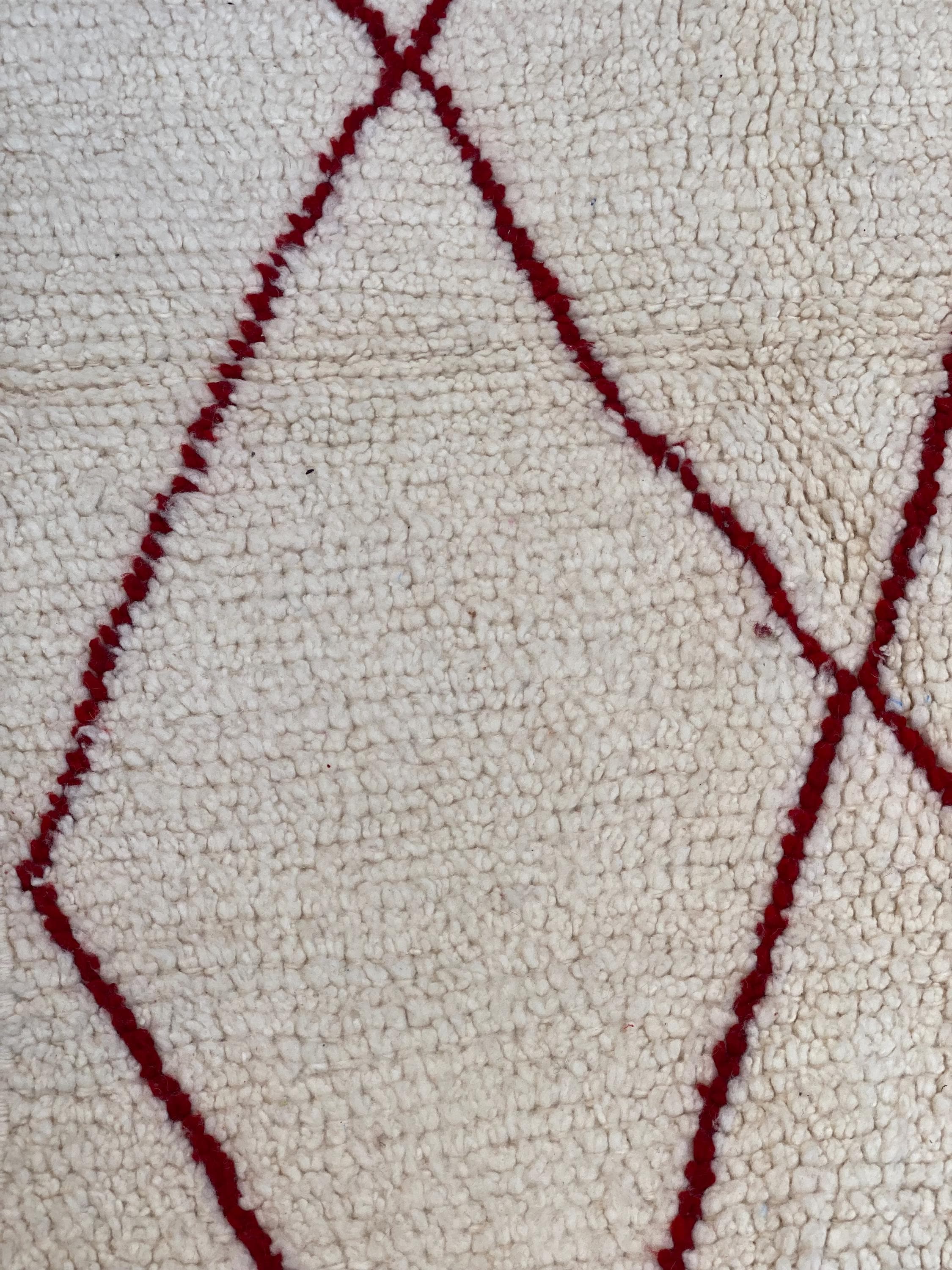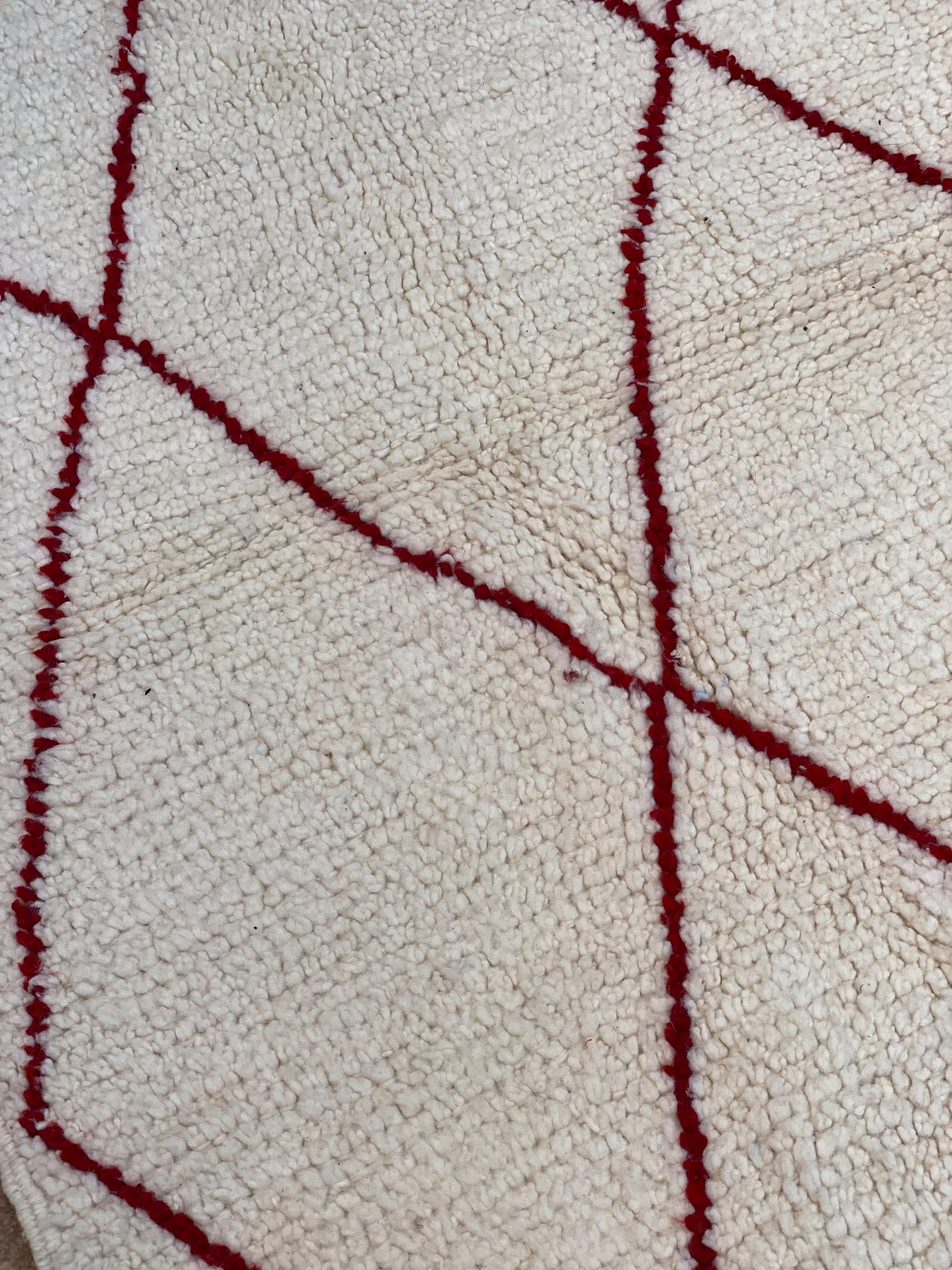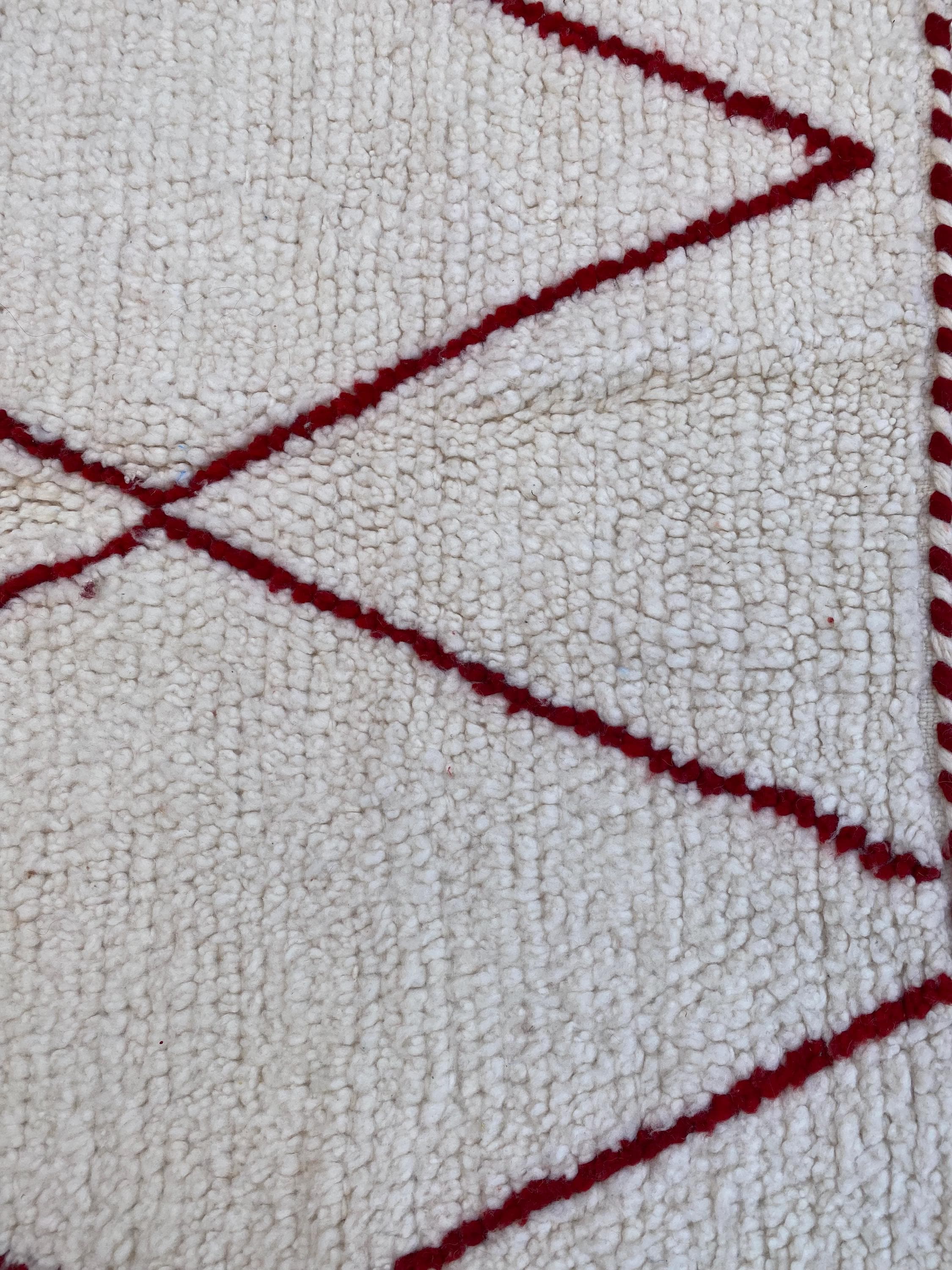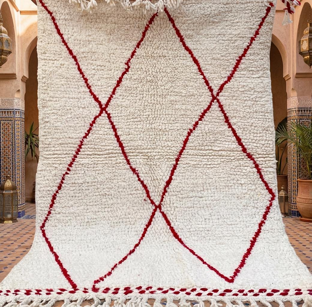 Timizar Elegance: Moroccan rugs are renowned for their exquisite craftsmanship, vibrant colors, and intricate designs that reflect the rich cultural heritage of Morocco. This particular White and Red Beni Ourain Rug features a beautiful off-white field contrasted by bold red geometric diamond lines, creating a striking and timeless look.