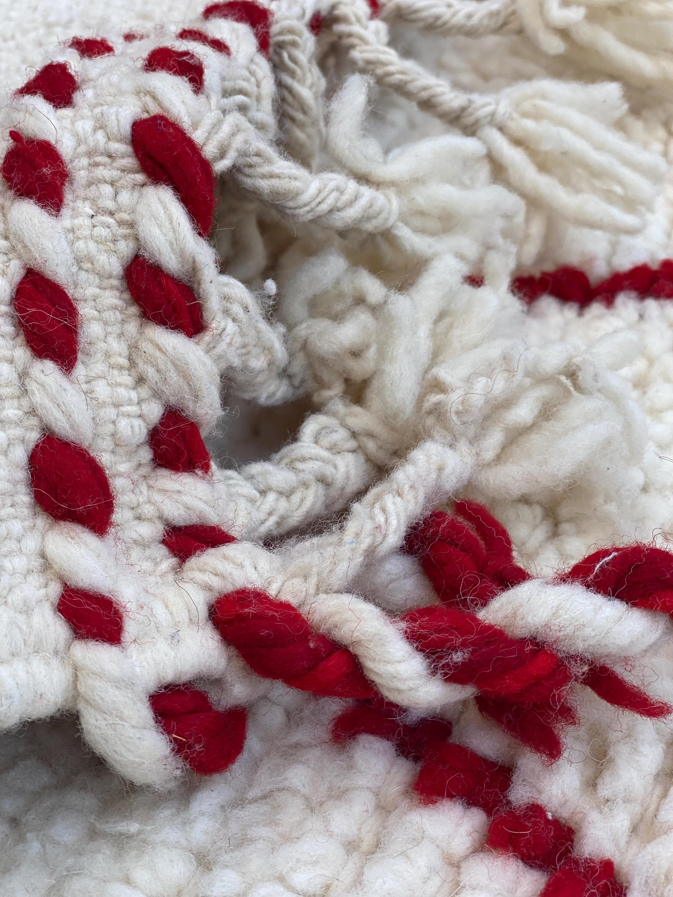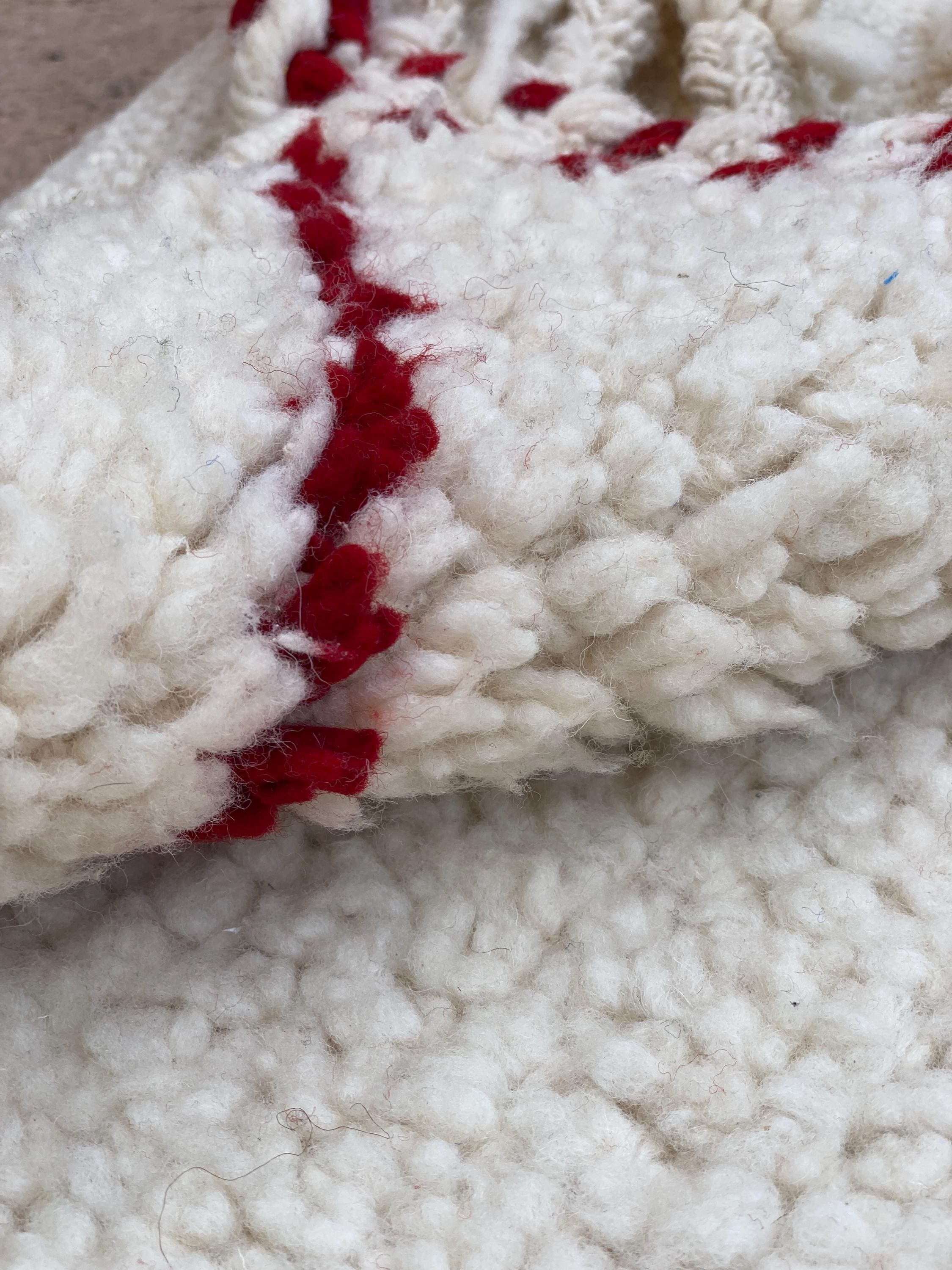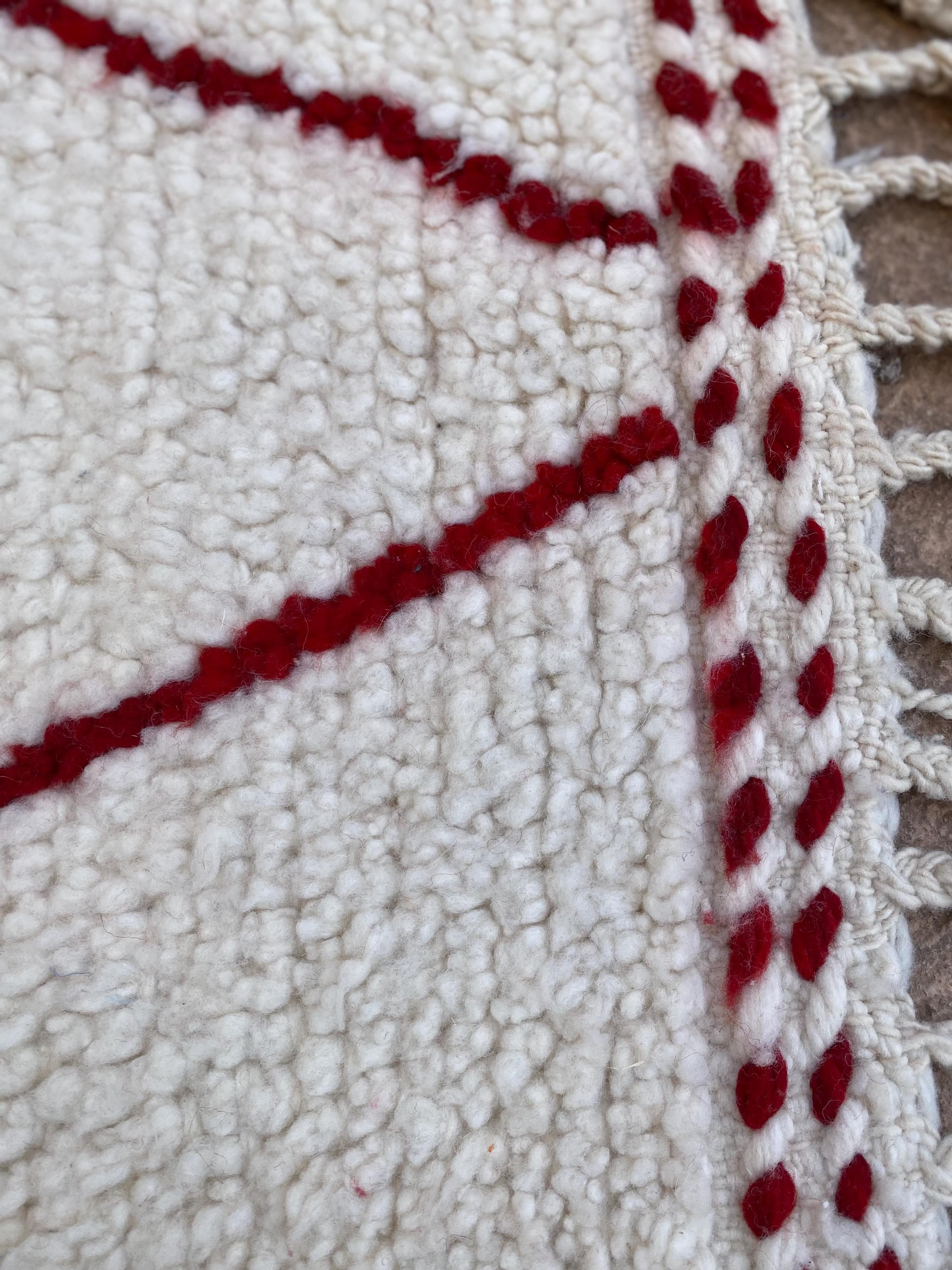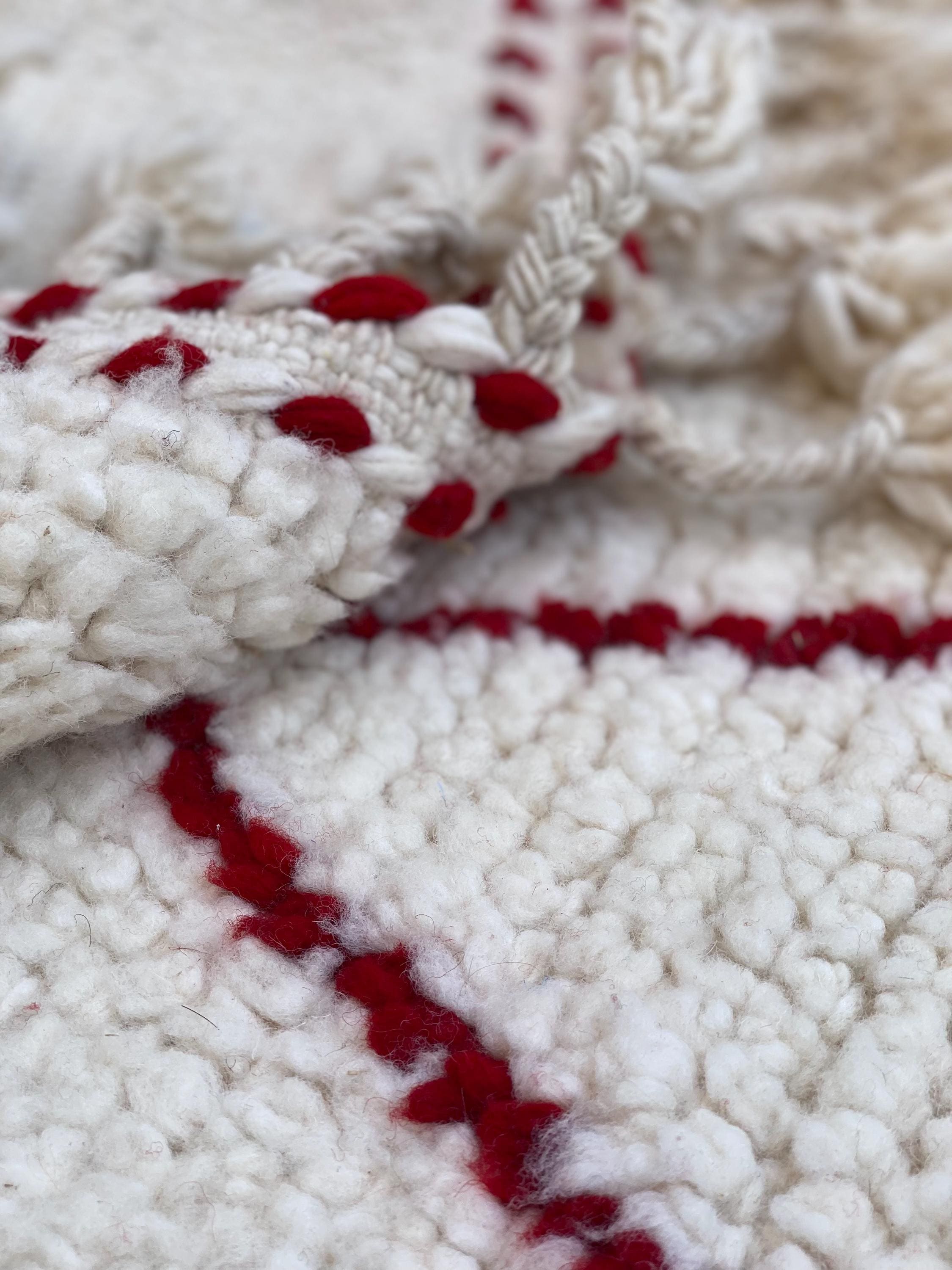 Timizar Elegance: Moroccan rugs are renowned for their exquisite craftsmanship, vibrant colors, and intricate designs that reflect the rich cultural heritage of Morocco. This particular White and Red Beni Ourain Rug features a beautiful off-white field contrasted by bold red geometric diamond lines, creating a striking and timeless look.