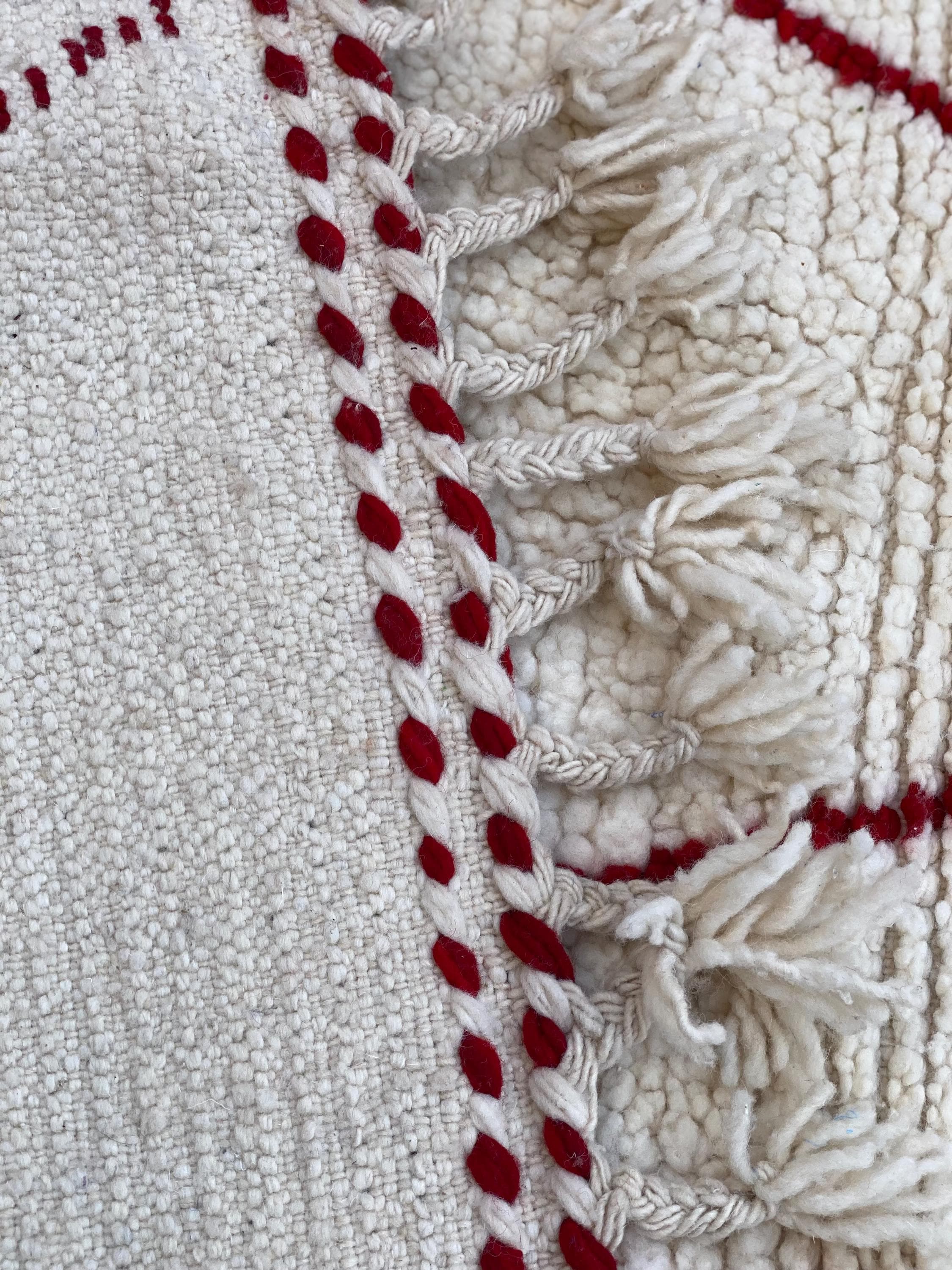 ➡️Material : Organic Wool of sheep 🐑 ➡️Type : Beni Ourain Rug. ➡️Color: Off-White/Cream with Red Geometric Design. ➡️Manufacturing: By hand. ➡️Production time: From 2 to 3 weeks. ➡️Shipping: Shipping is ensured via express transport companies such as (FEDEX -DHL - ARAMEX and other companies) "Door to Door" ➡️size: 150 x 100 cm (approx. 4.9 x 3.3 ft) ➡️fringe: Short braided fringe on both ends with matching white and red detail.
