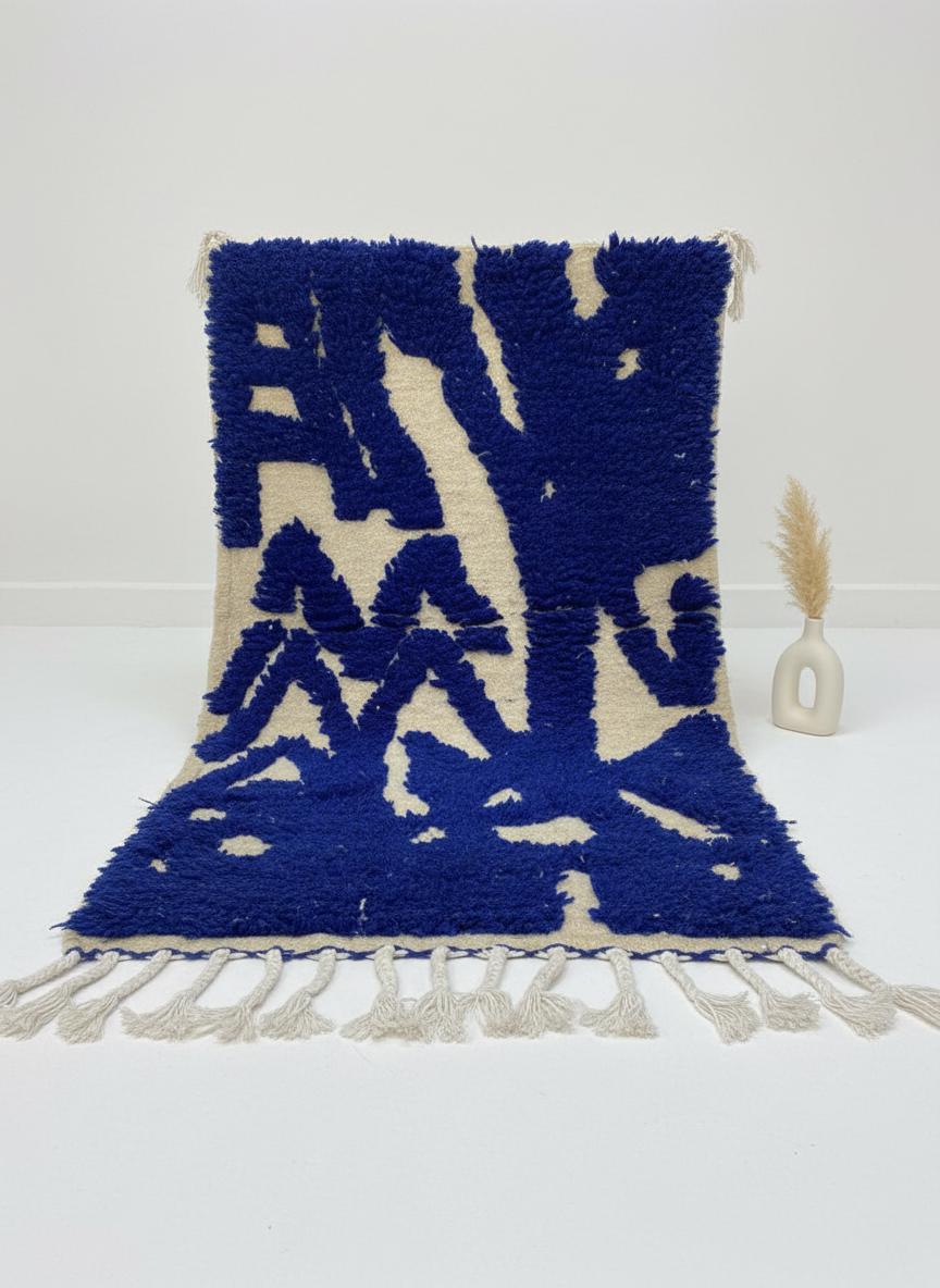 This stunning handwoven beni ourain rug brings the timeless beauty of Moroccan craftsmanship into your home. Featuring a captivating blue and white color palette with traditional Berber symbols, this piece is more than a rug—it's a work of art.