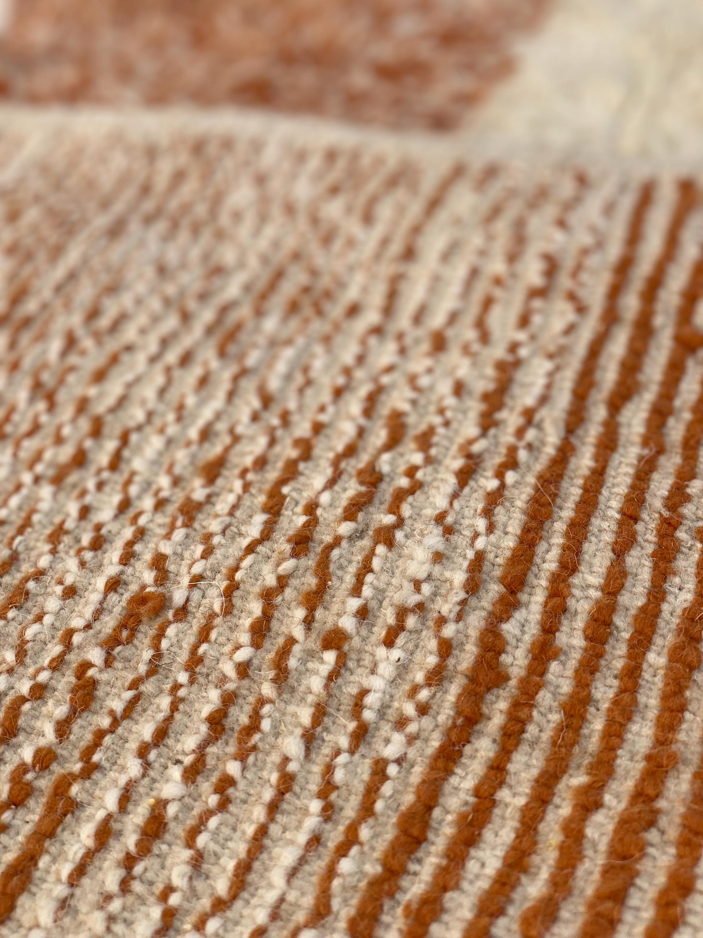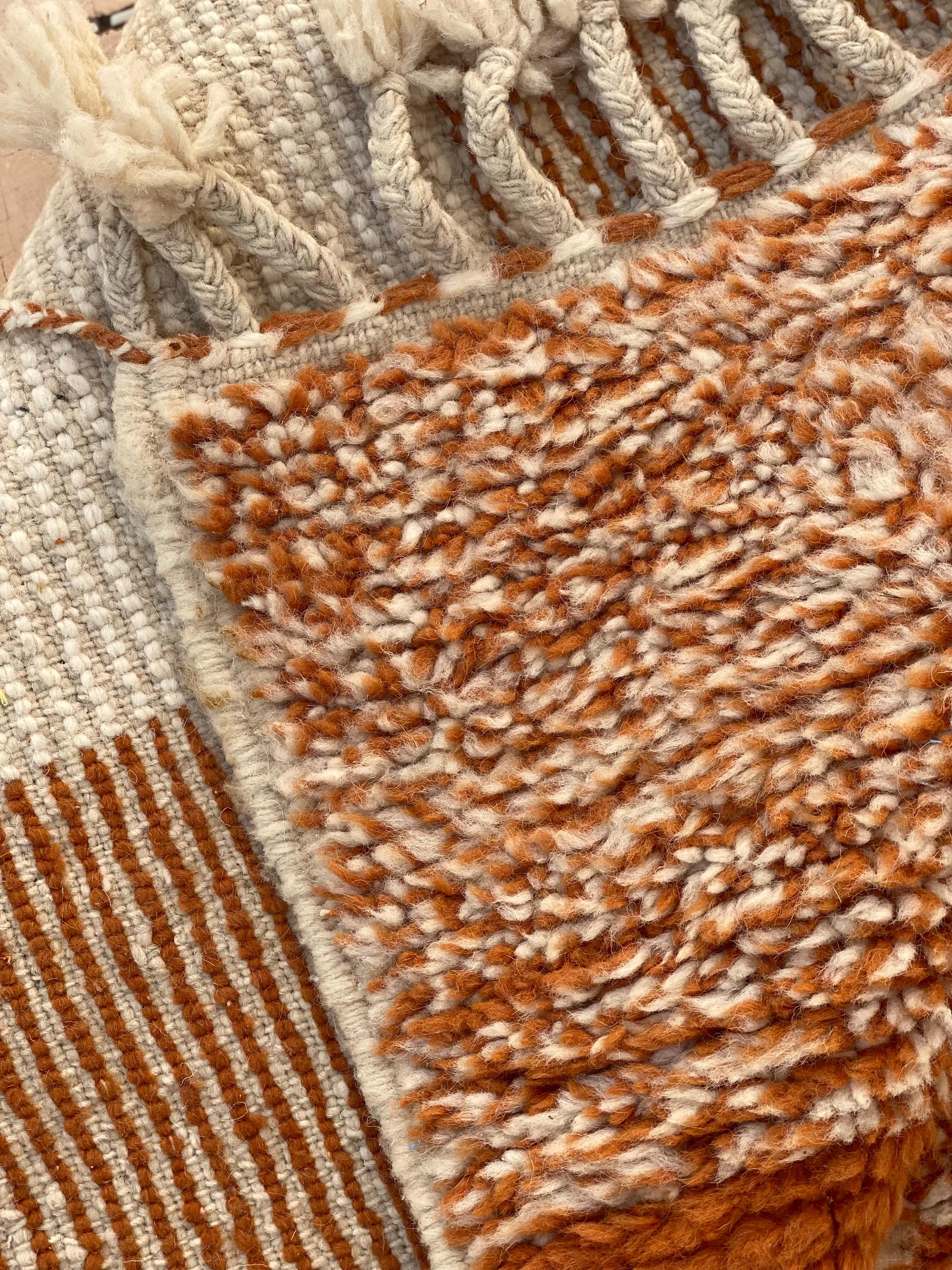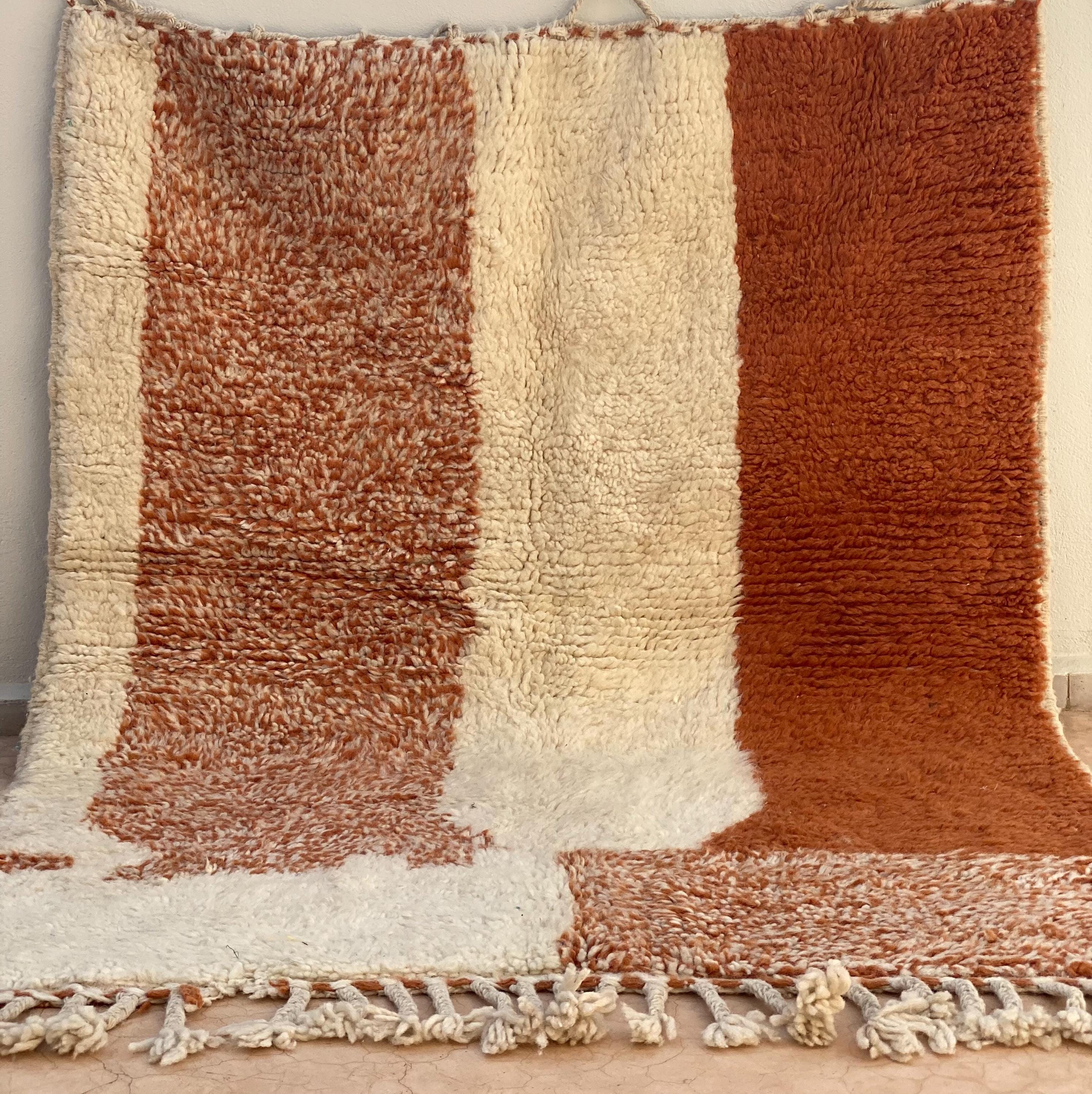 This stunning handwoven Moroccan rug showcases a modern color-block design in rich rust orange and creamy ivory tones. Luxuriously thick pile and artisan quality make this piece perfect for adding warmth and character to any room.