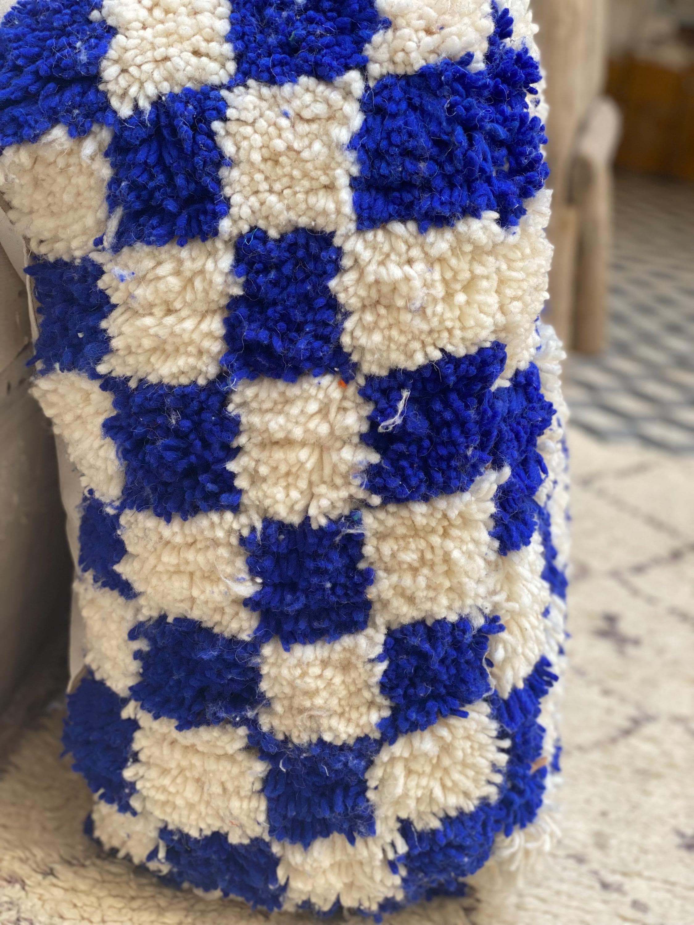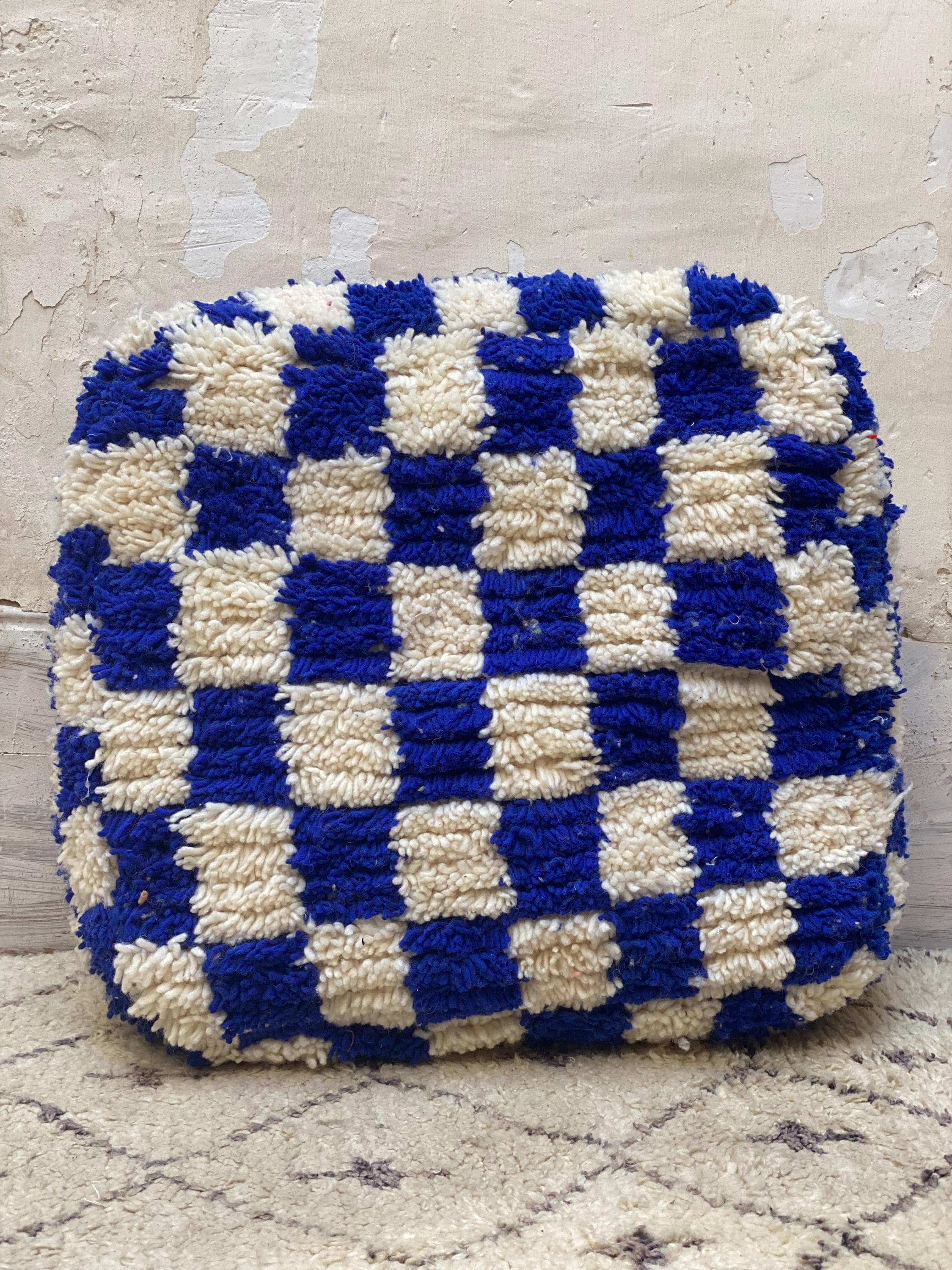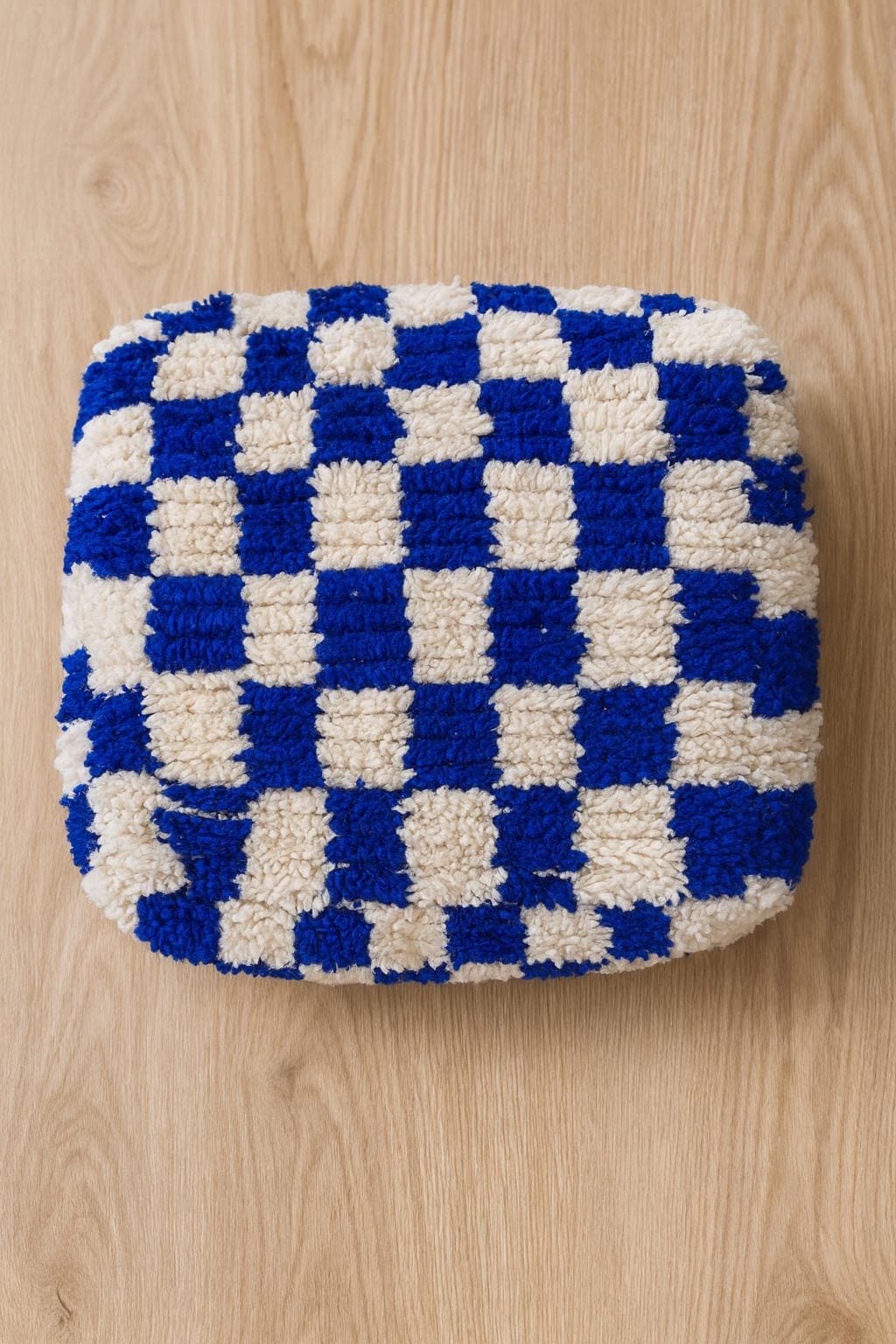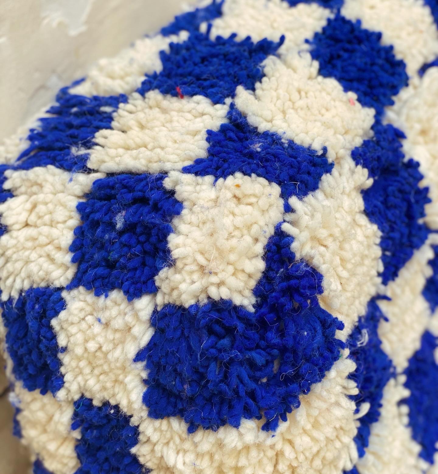 This gorgeous handwoven Moroccan pouf brings instant boho charm and cozy seating to any space. Featuring a stunning cobalt blue and cream checkered pattern with plush, cloud-like texture.