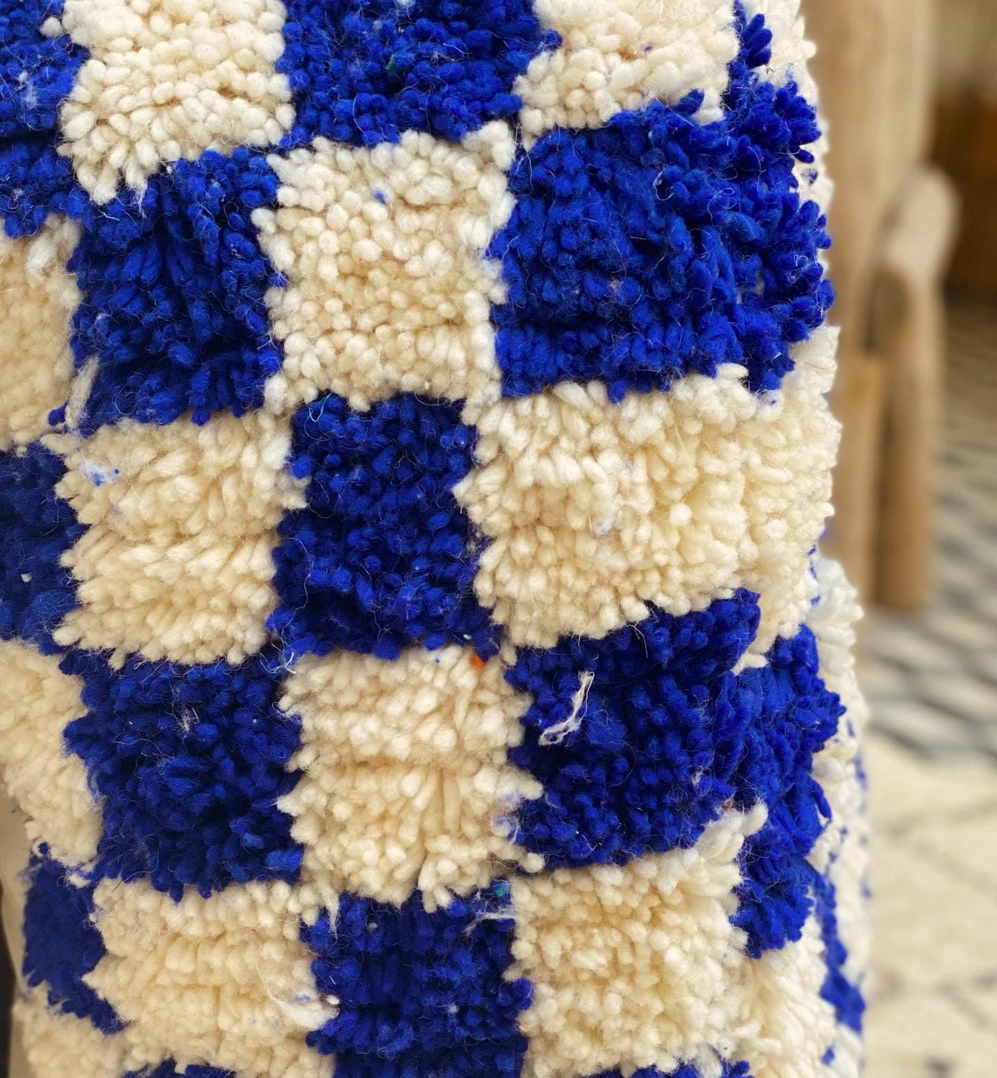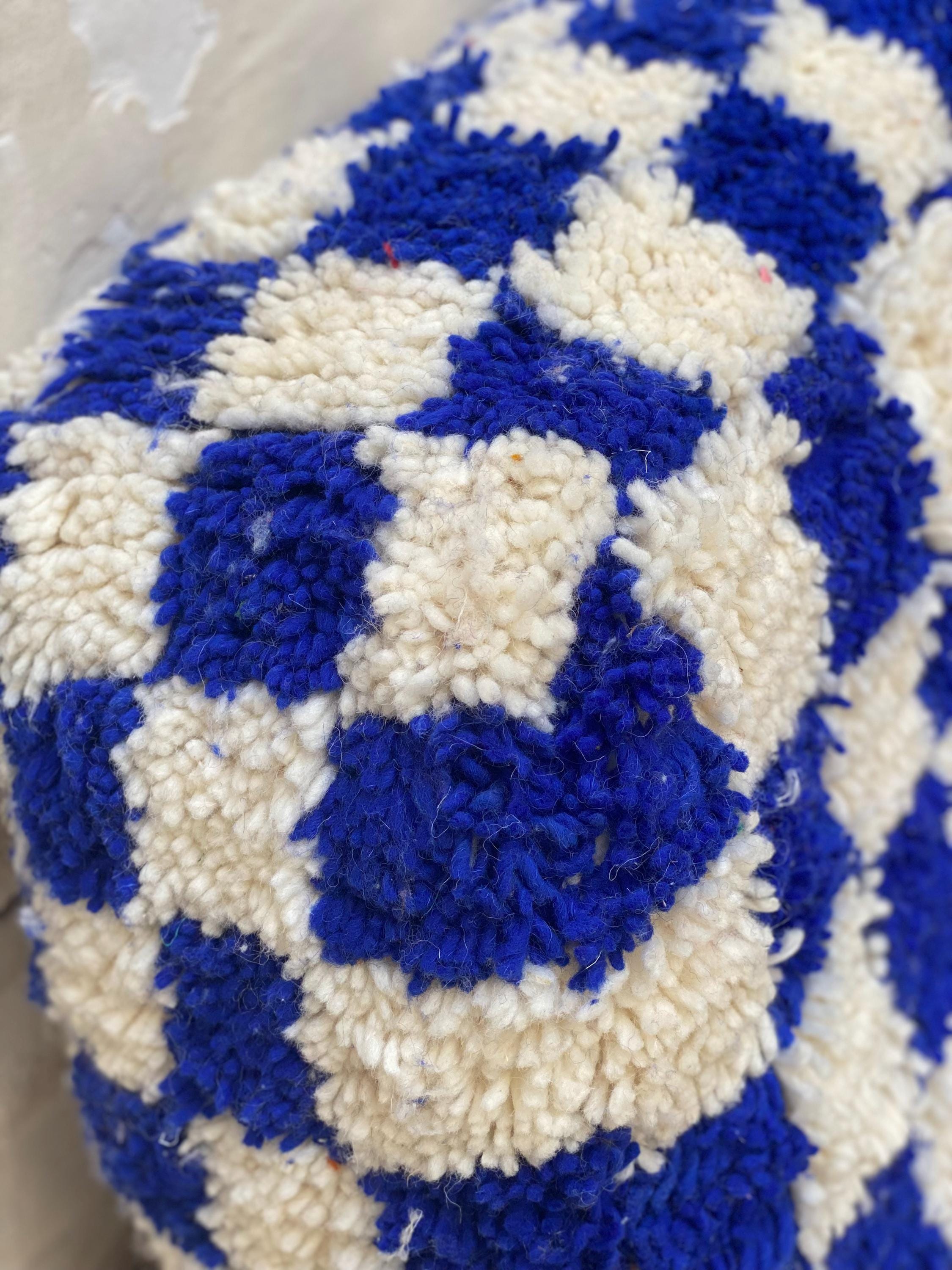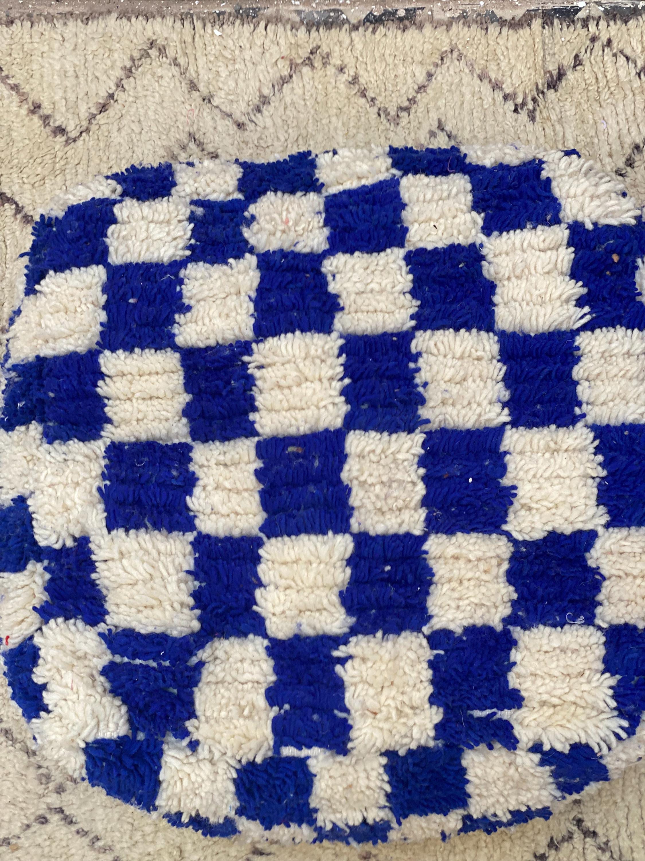 This gorgeous handwoven Moroccan pouf brings instant boho charm and cozy seating to any space. Featuring a stunning cobalt blue and cream checkered pattern with plush, cloud-like texture.