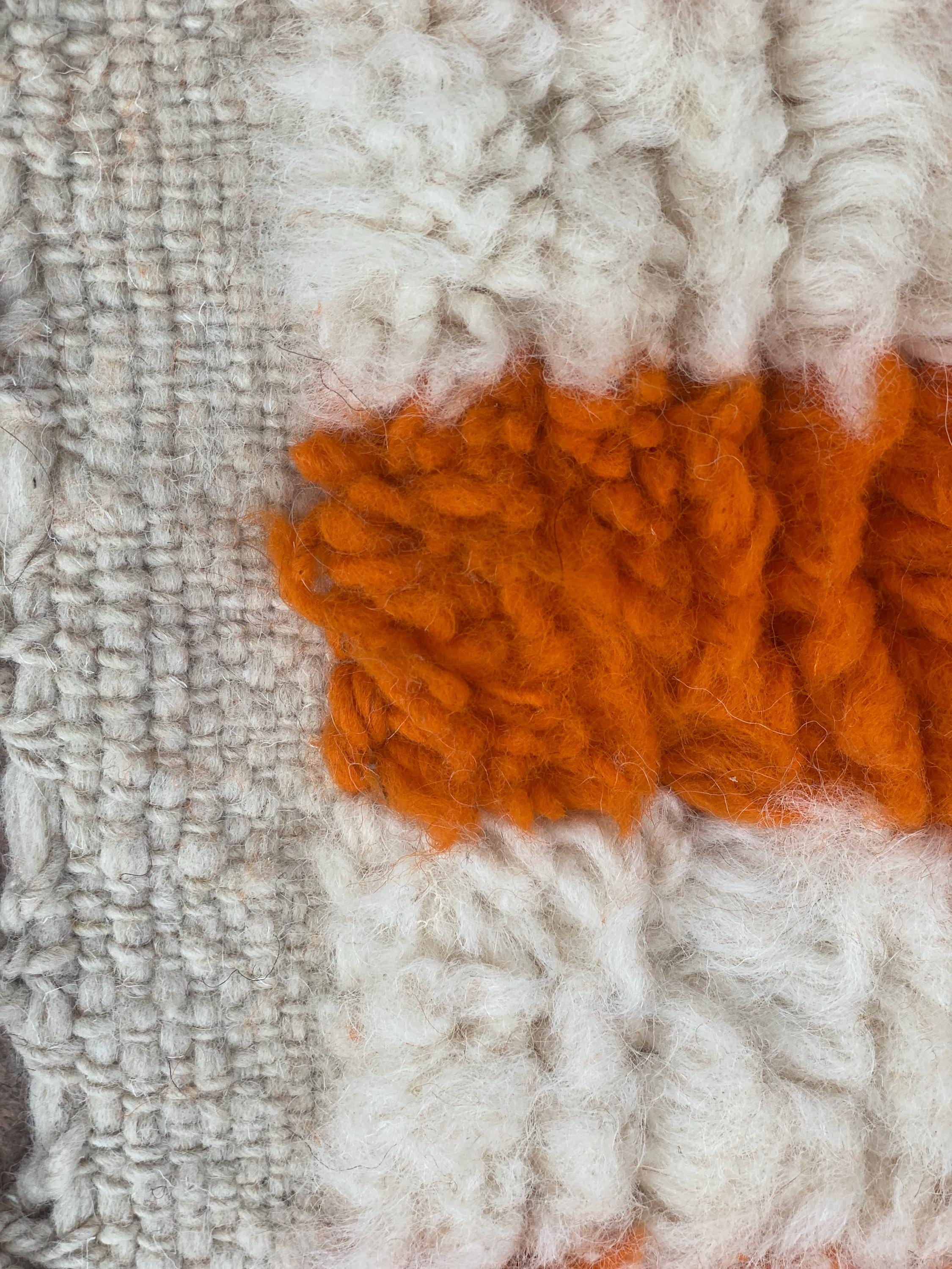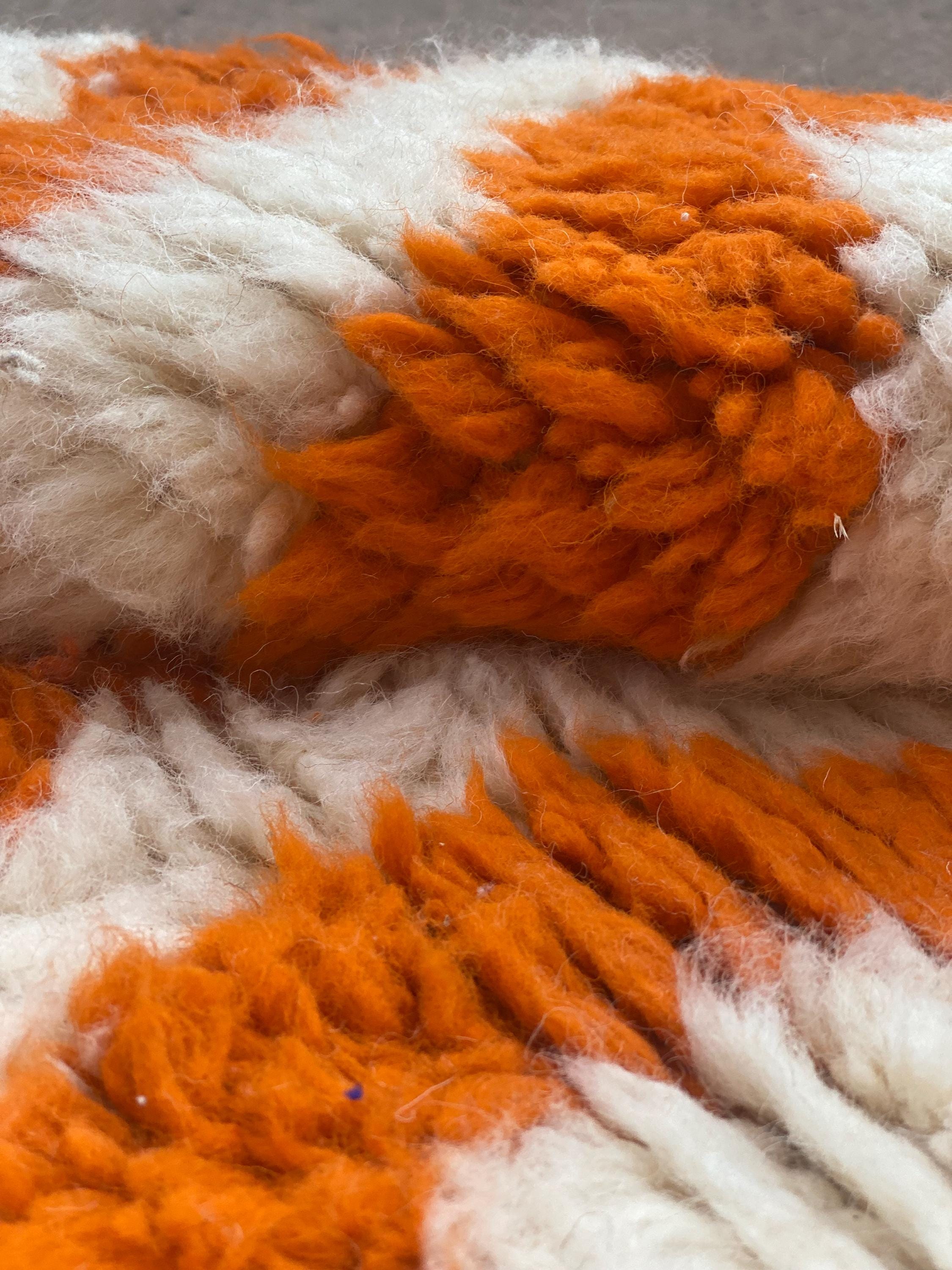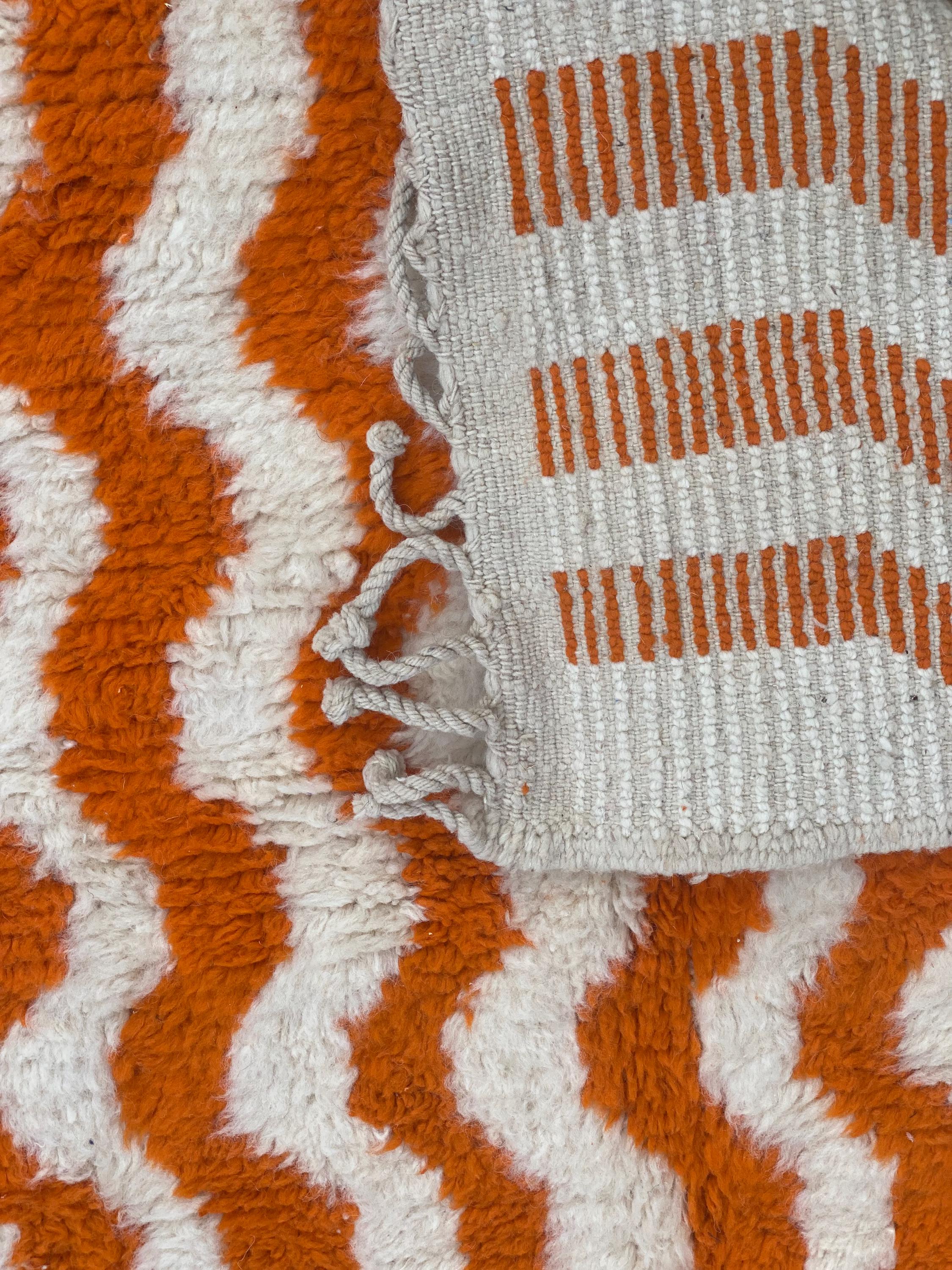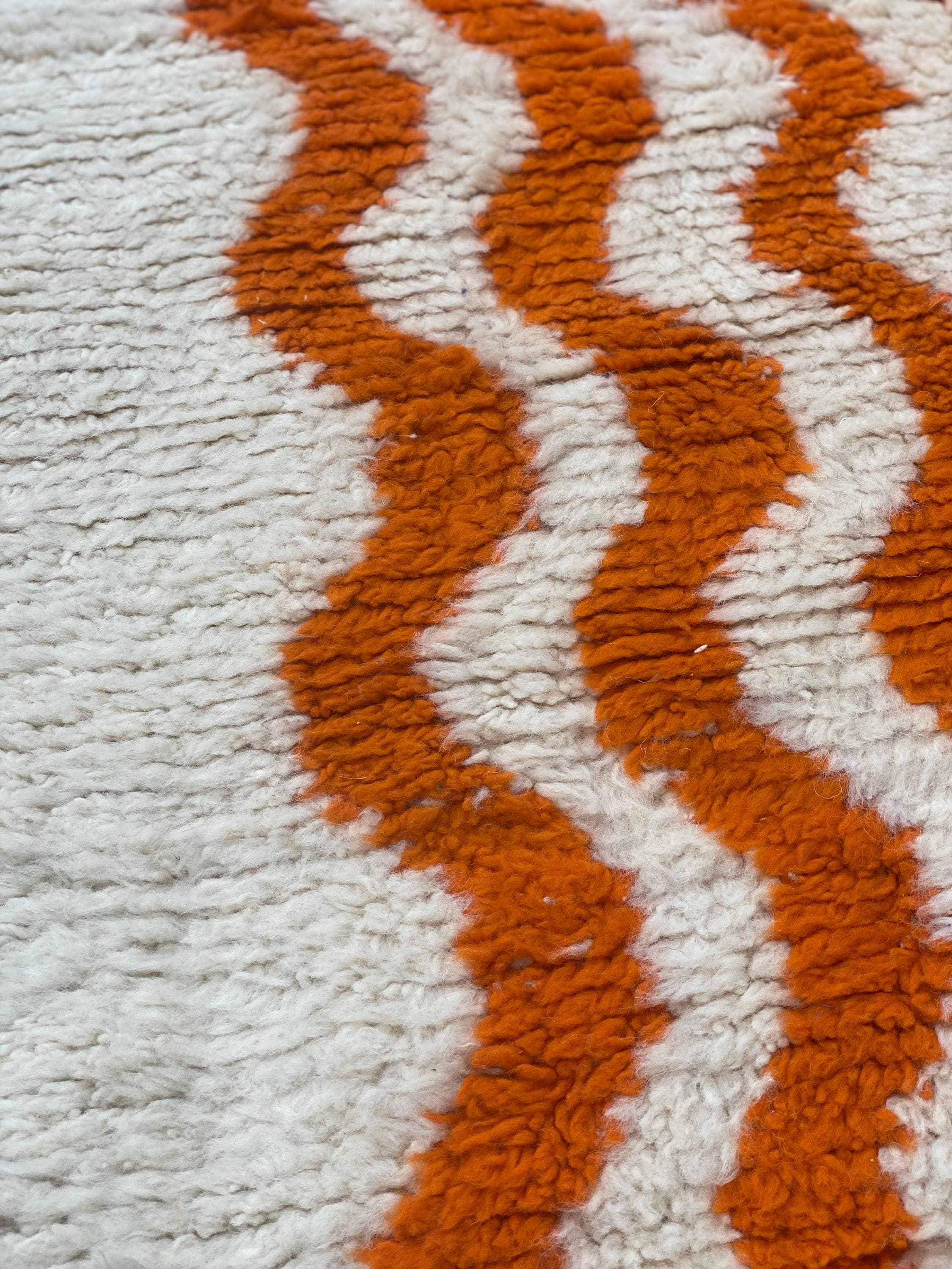 Transform your home with this stunning handwoven wavy rug featuring a mesmerizing orange and cream pattern. Each rug is meticulously crafted by hand using traditional weaving techniques, taking 3-4 weeks to complete.
