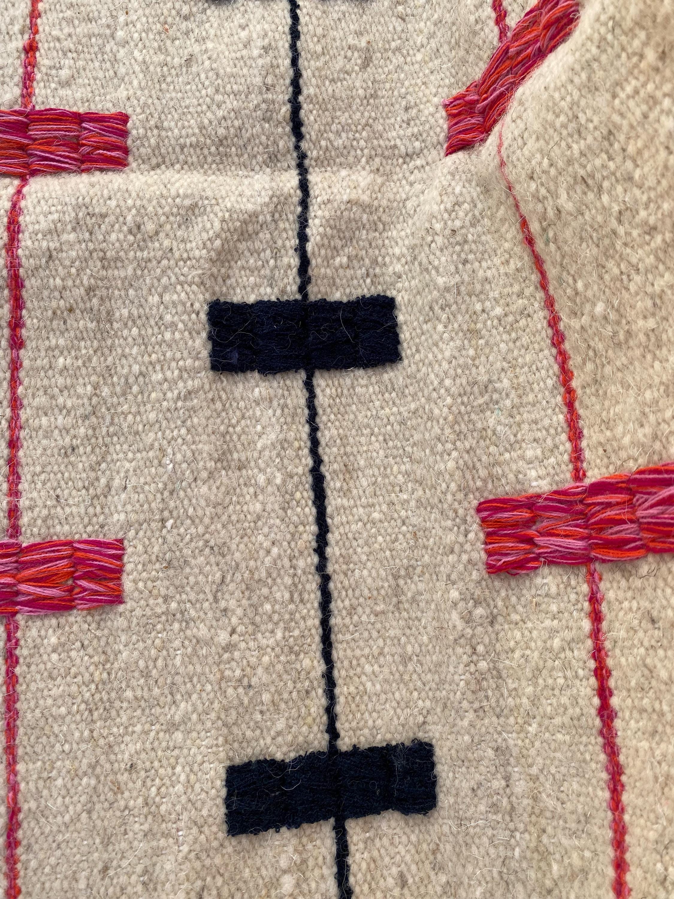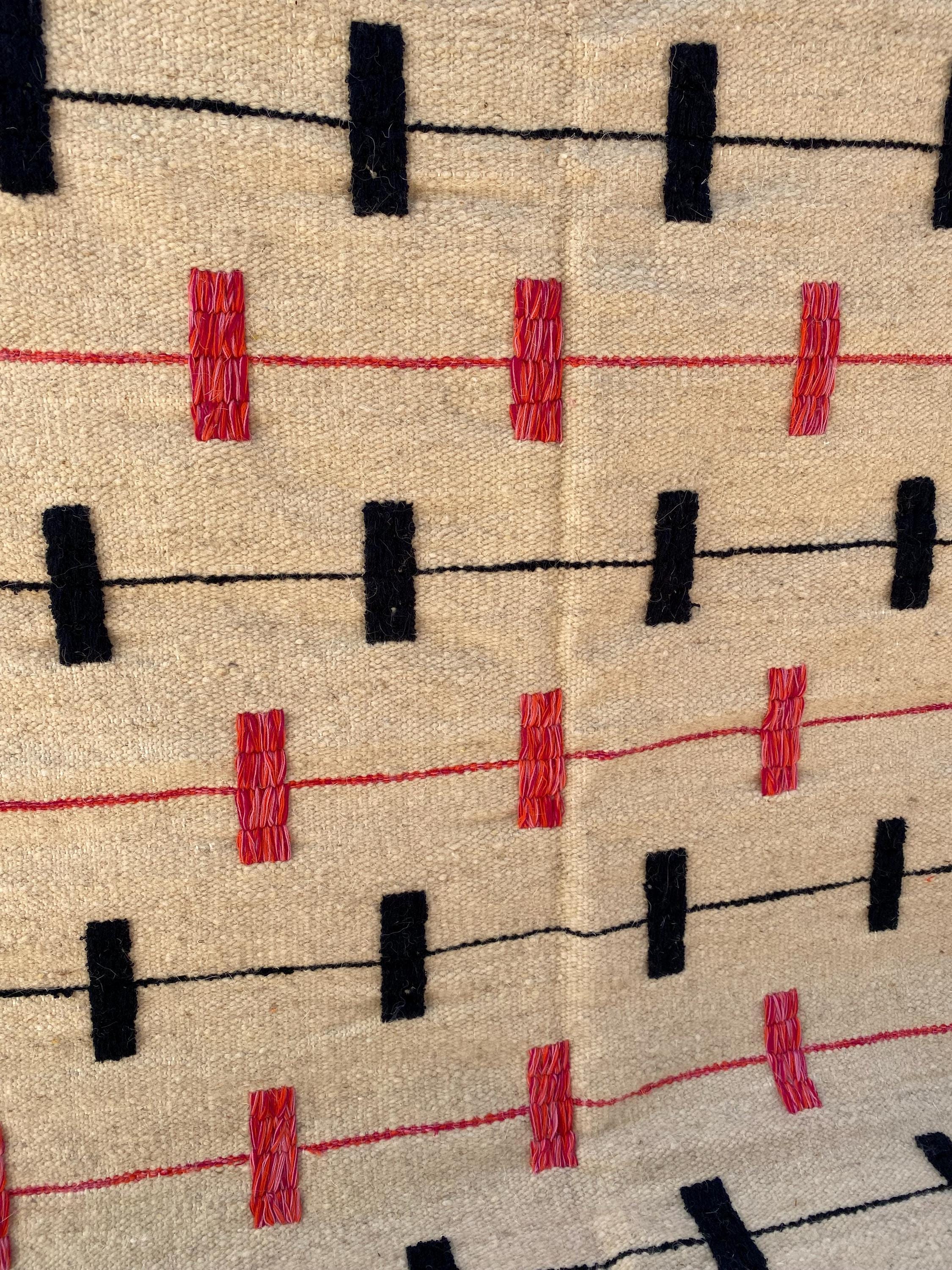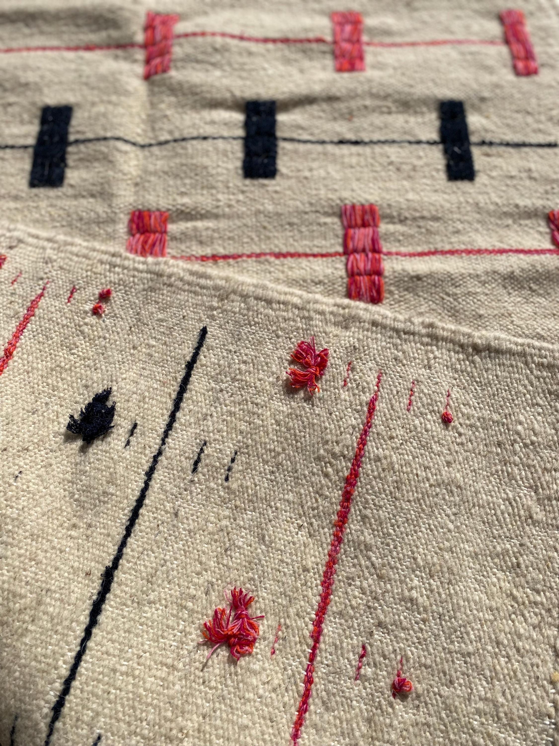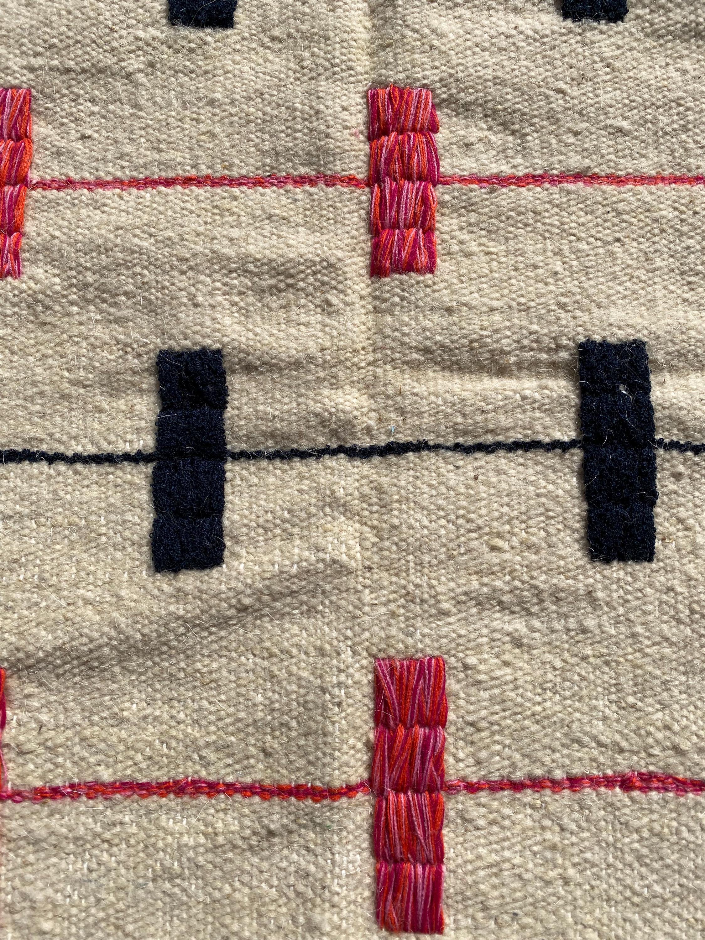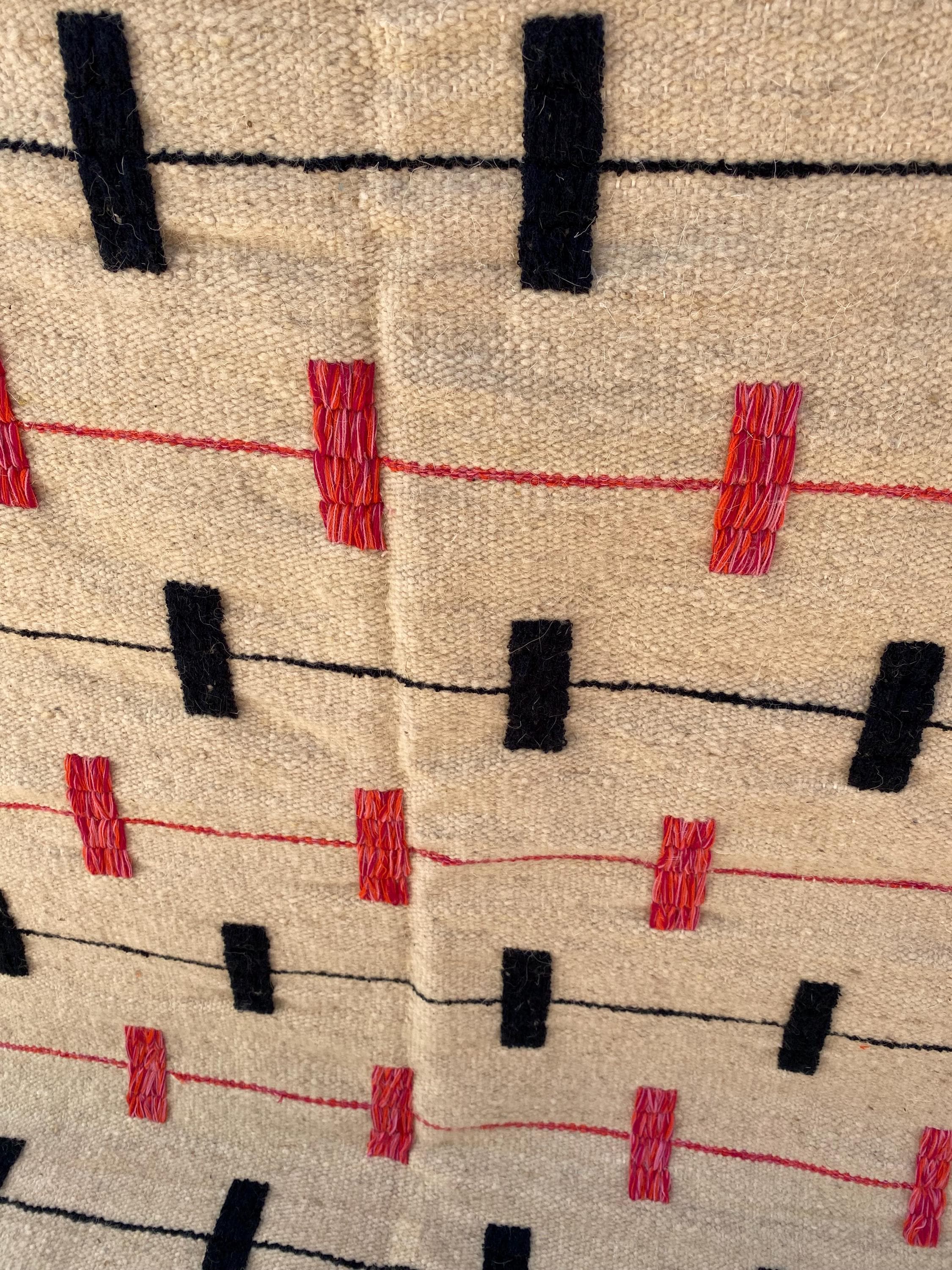 ✅ Weave: Flat weave with raised, knotted geometric accents (often referred to as a hybrid or embellished flat weave)