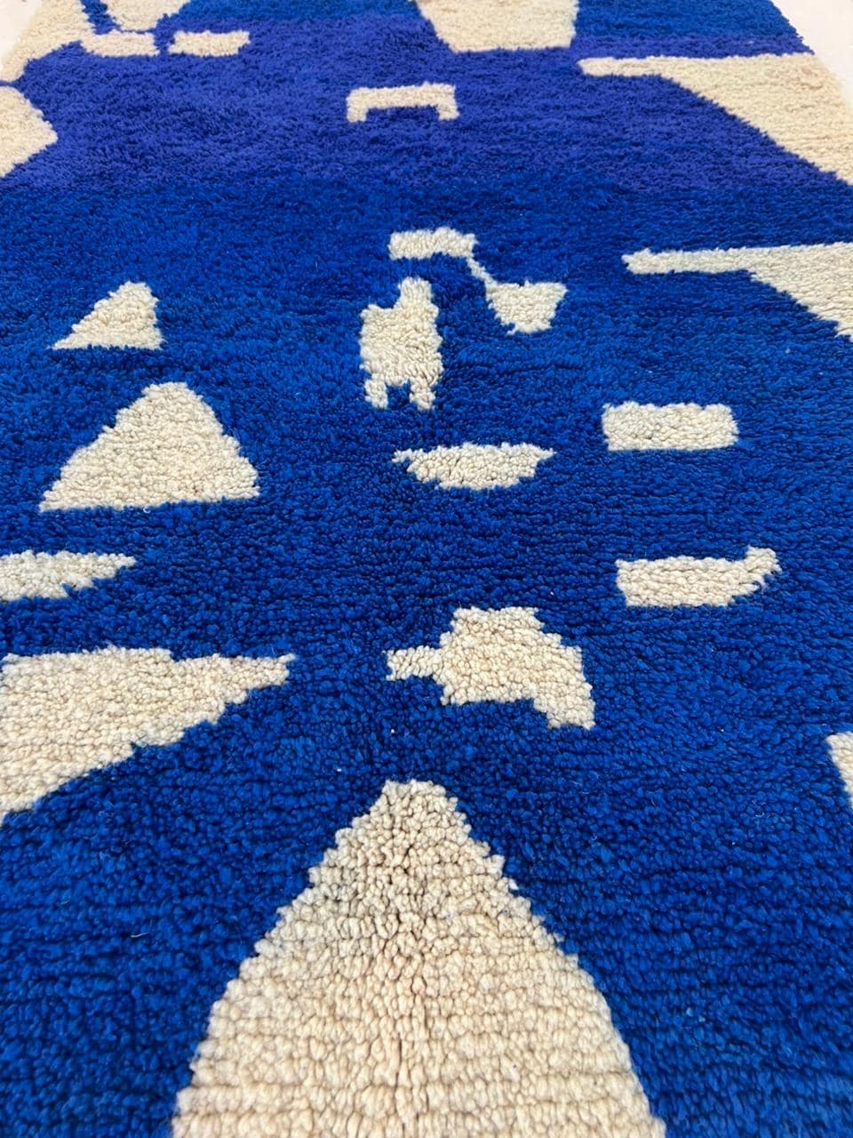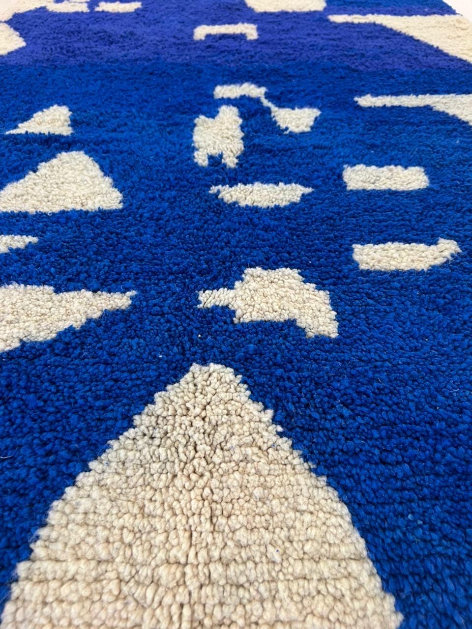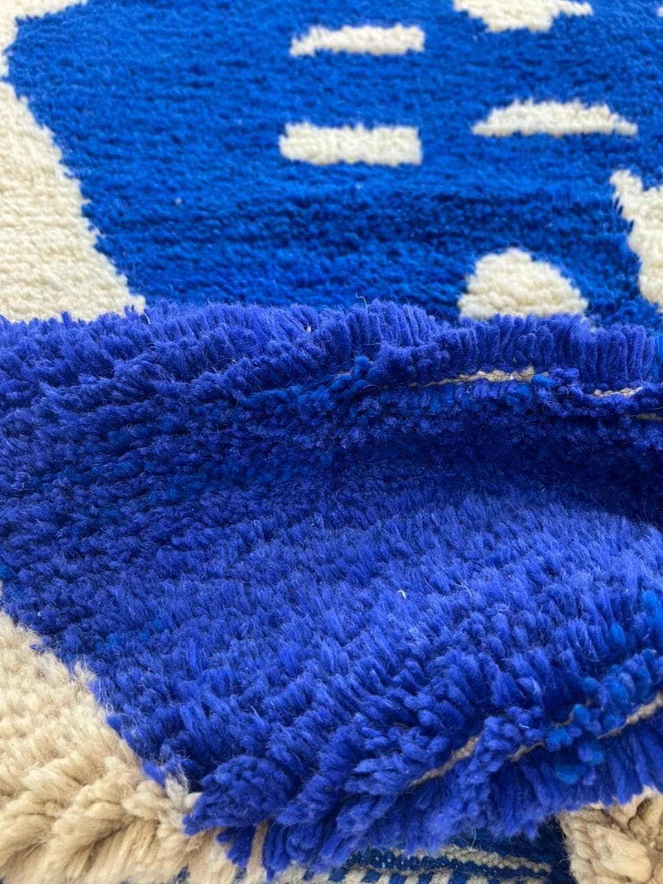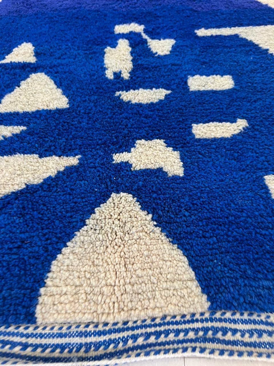 This stunning handmade Moroccan rug celebrates the vibrant spirit of Berber artistry. Woven by skilled artisans in the Atlas Mountains region, this rug features bold abstract motifs in striking cobalt blue and cream — a perfect balance of tradition and modern elegance.