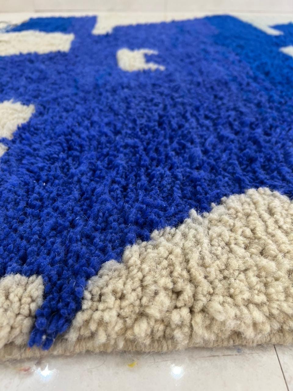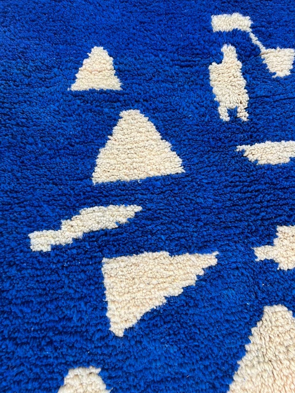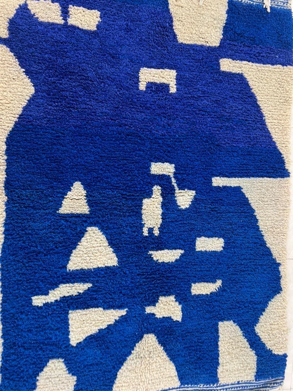 This stunning handmade Moroccan rug celebrates the vibrant spirit of Berber artistry. Woven by skilled artisans in the Atlas Mountains region, this rug features bold abstract motifs in striking cobalt blue and cream — a perfect balance of tradition and modern elegance.