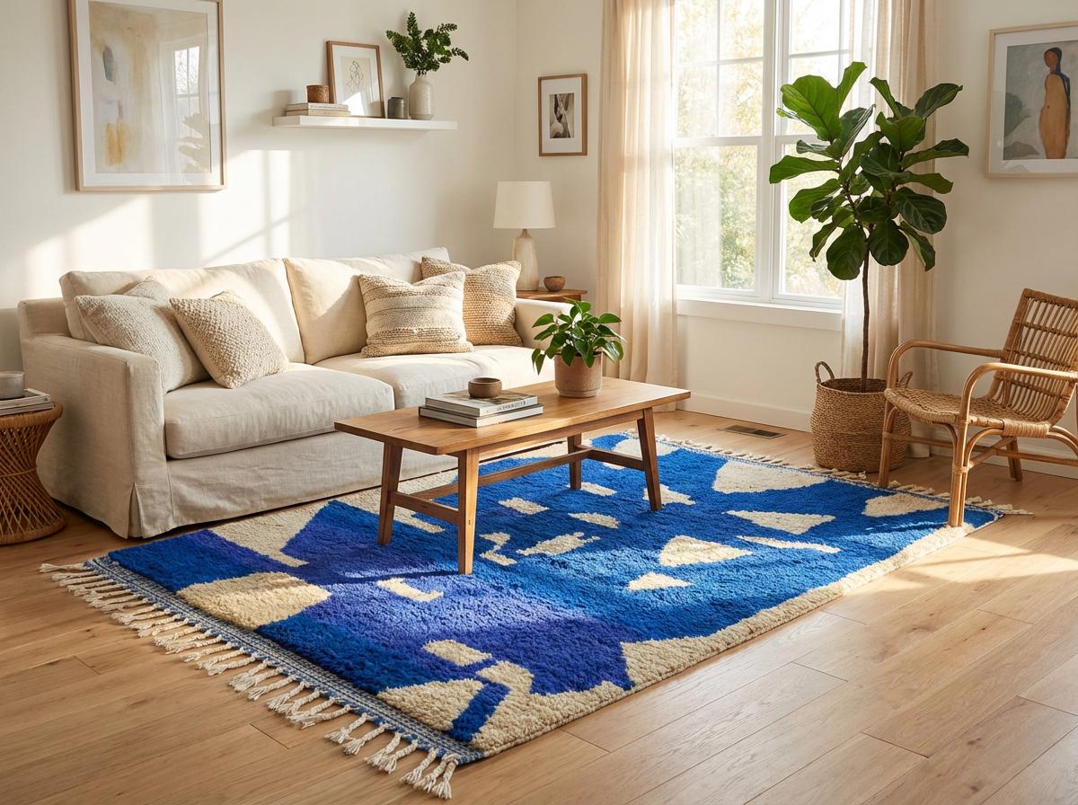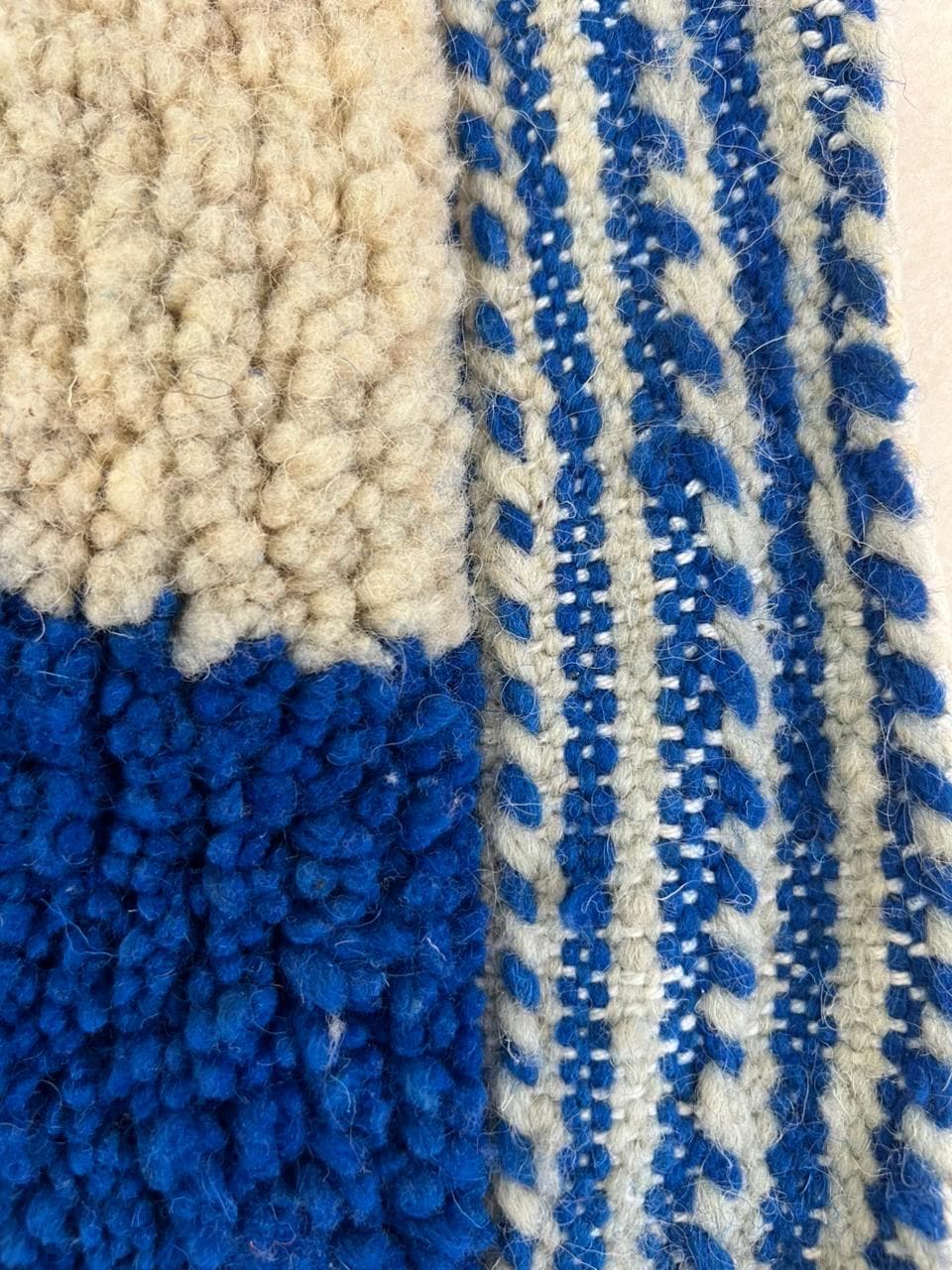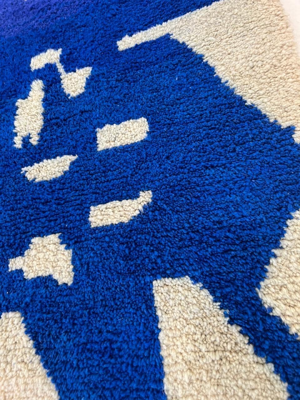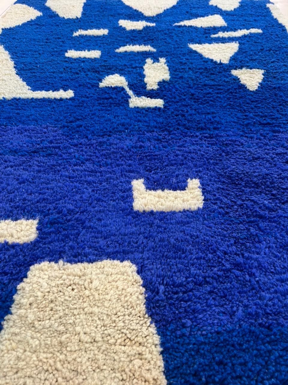 This stunning handmade Moroccan rug celebrates the vibrant spirit of Berber artistry. Woven by skilled artisans in the Atlas Mountains region, this rug features bold abstract motifs in striking cobalt blue and cream — a perfect balance of tradition and modern elegance.