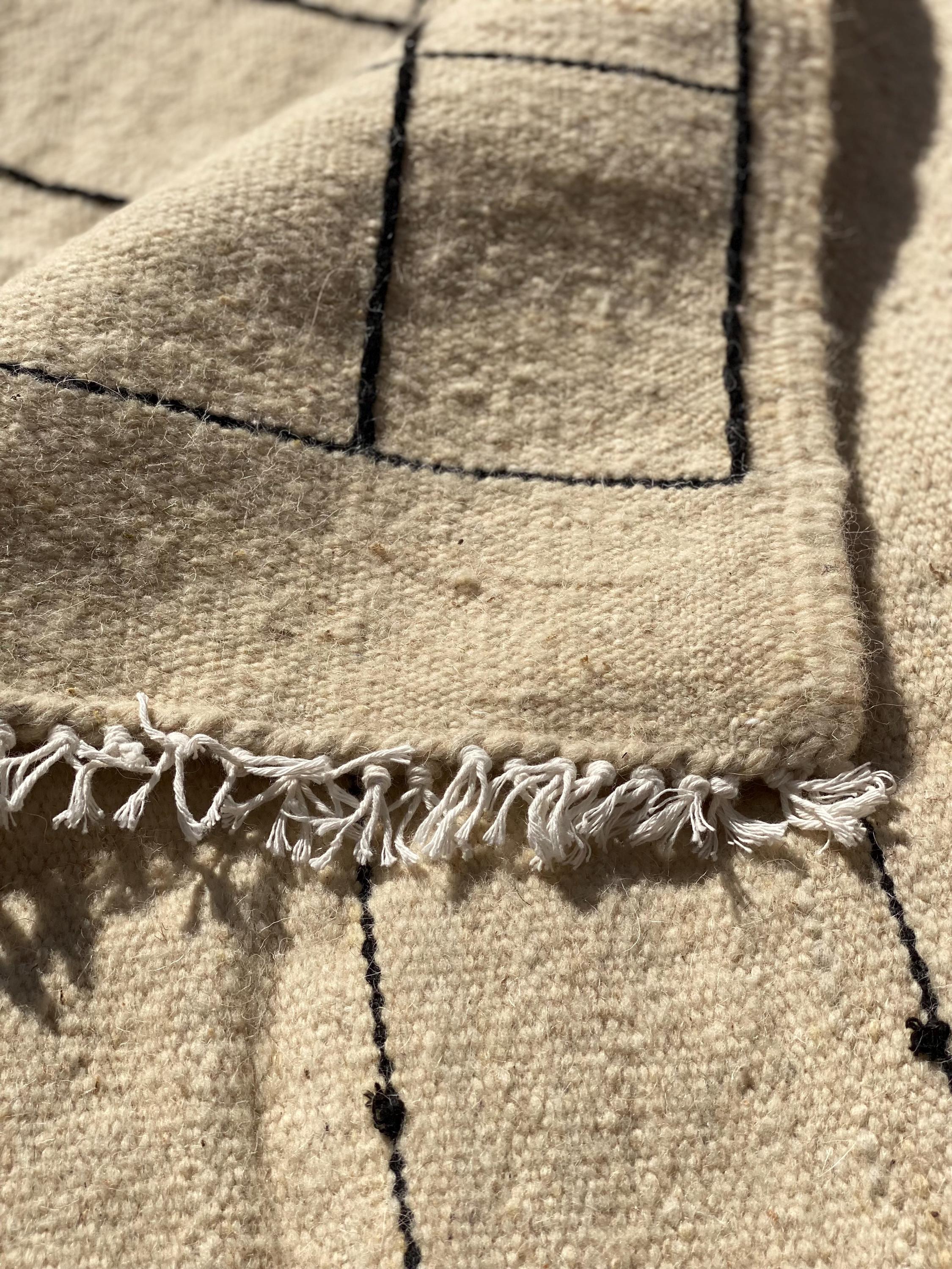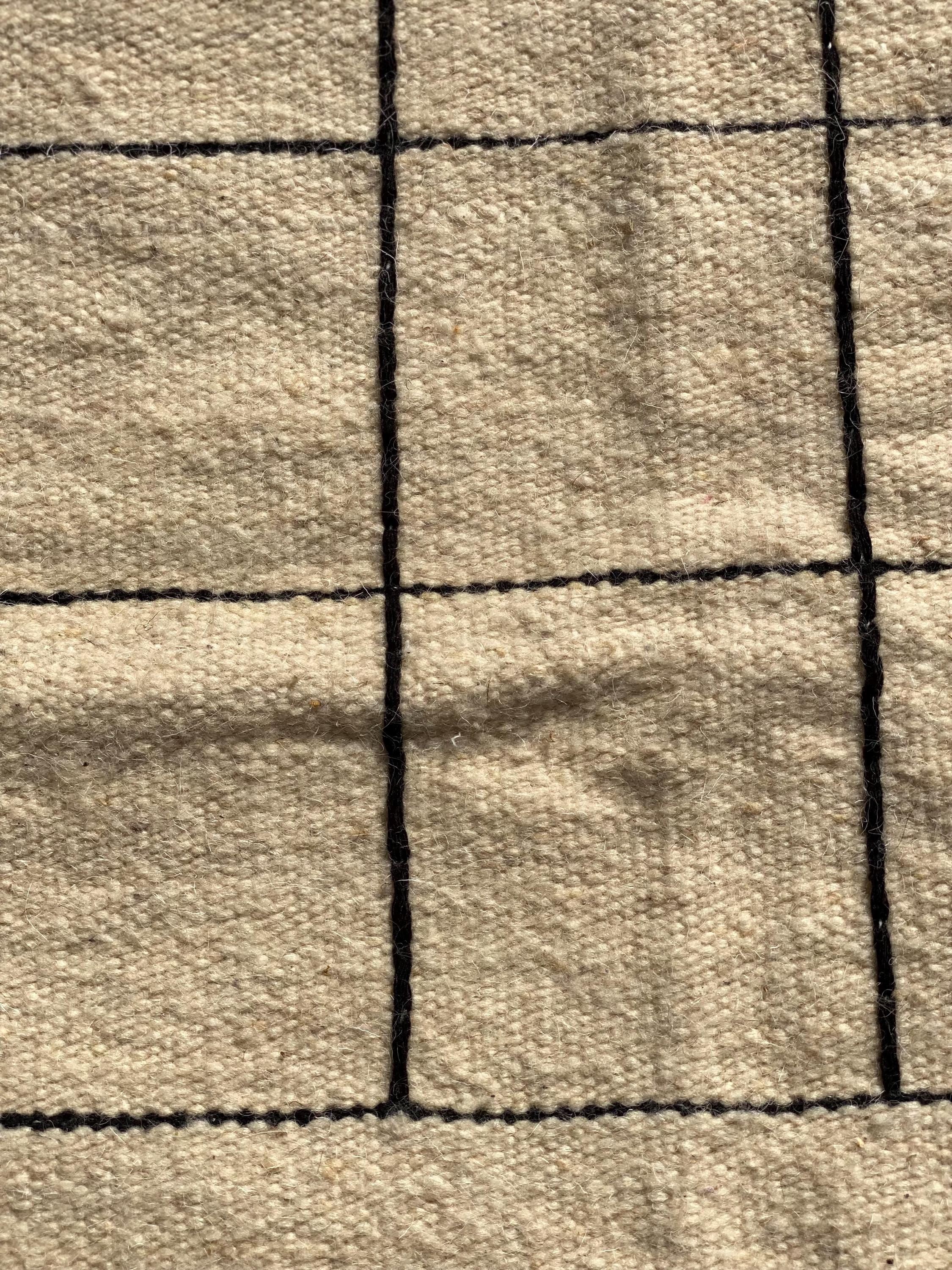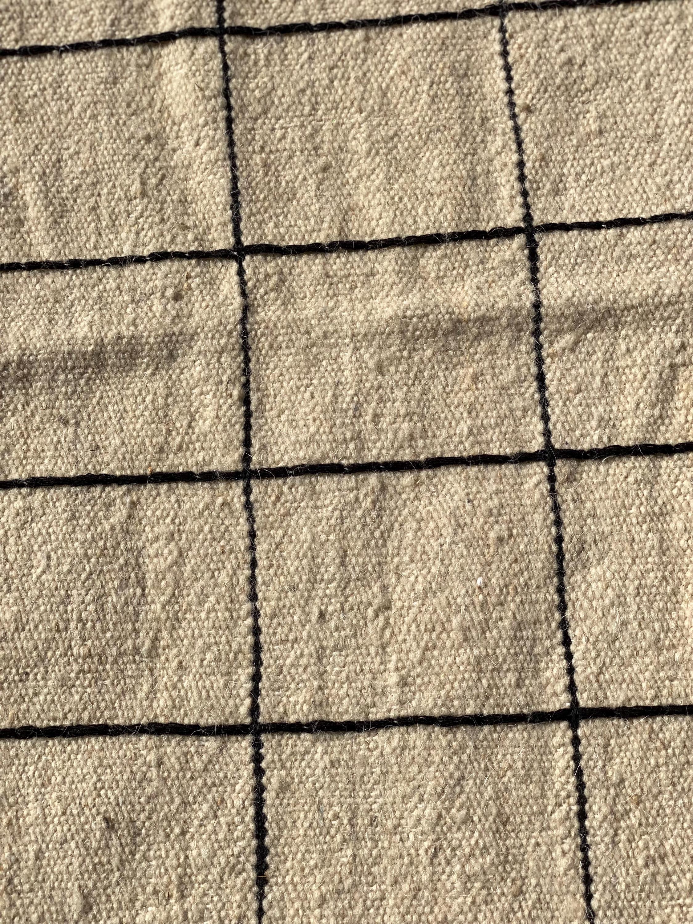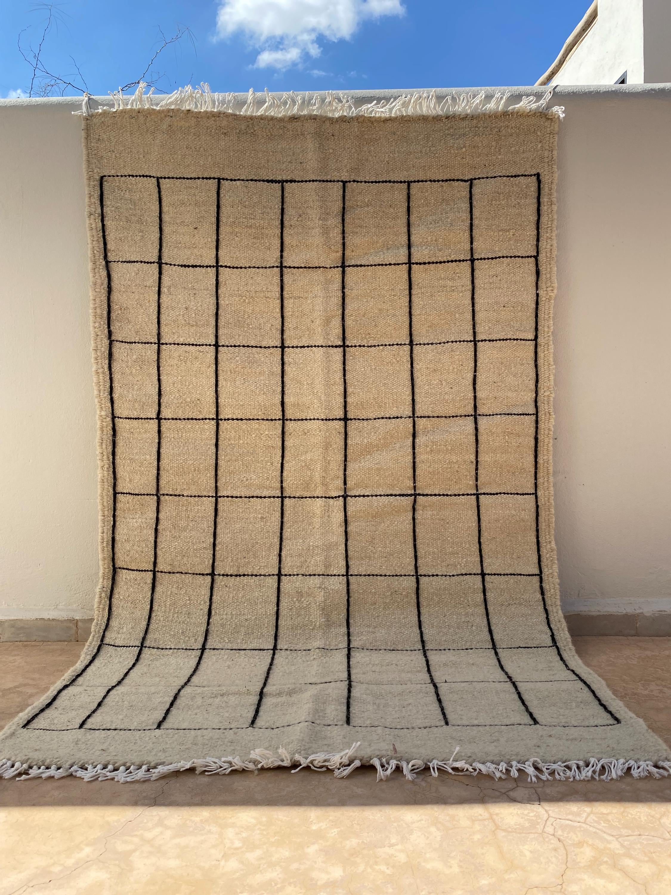 This stunning handwoven Moroccan carpet features a contemporary minimalist design with a classic grid pattern in black on natural undyed wool. Made by skilled Berber artisans in the Tiznit region of Morocco, this authentic piece brings warmth, texture, and timeless elegance to any space.