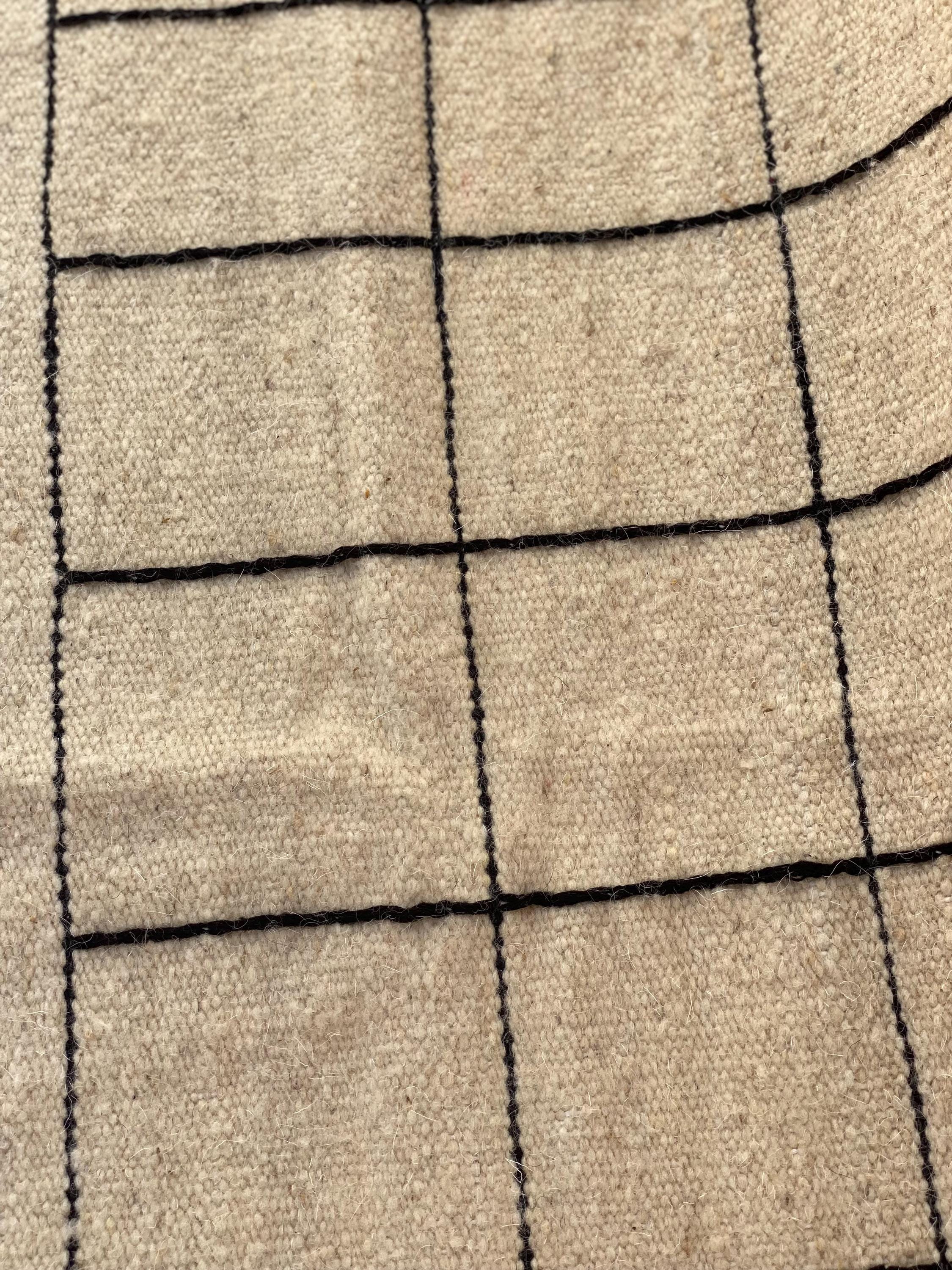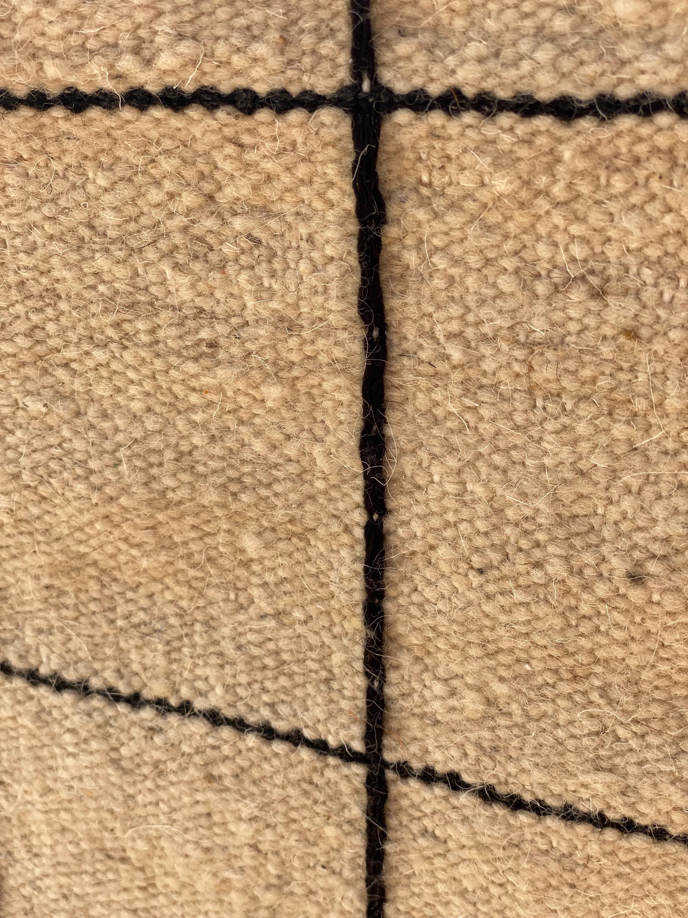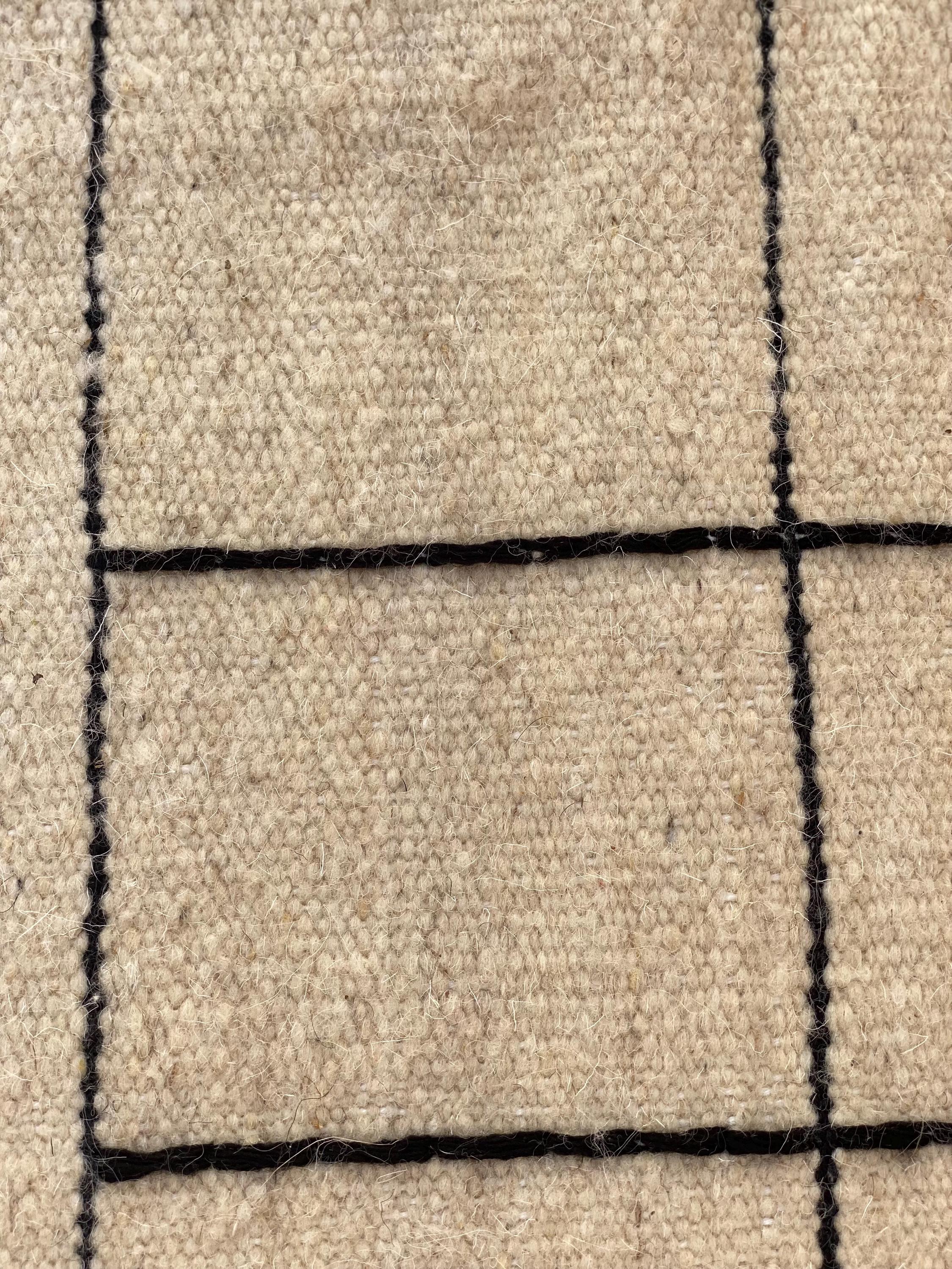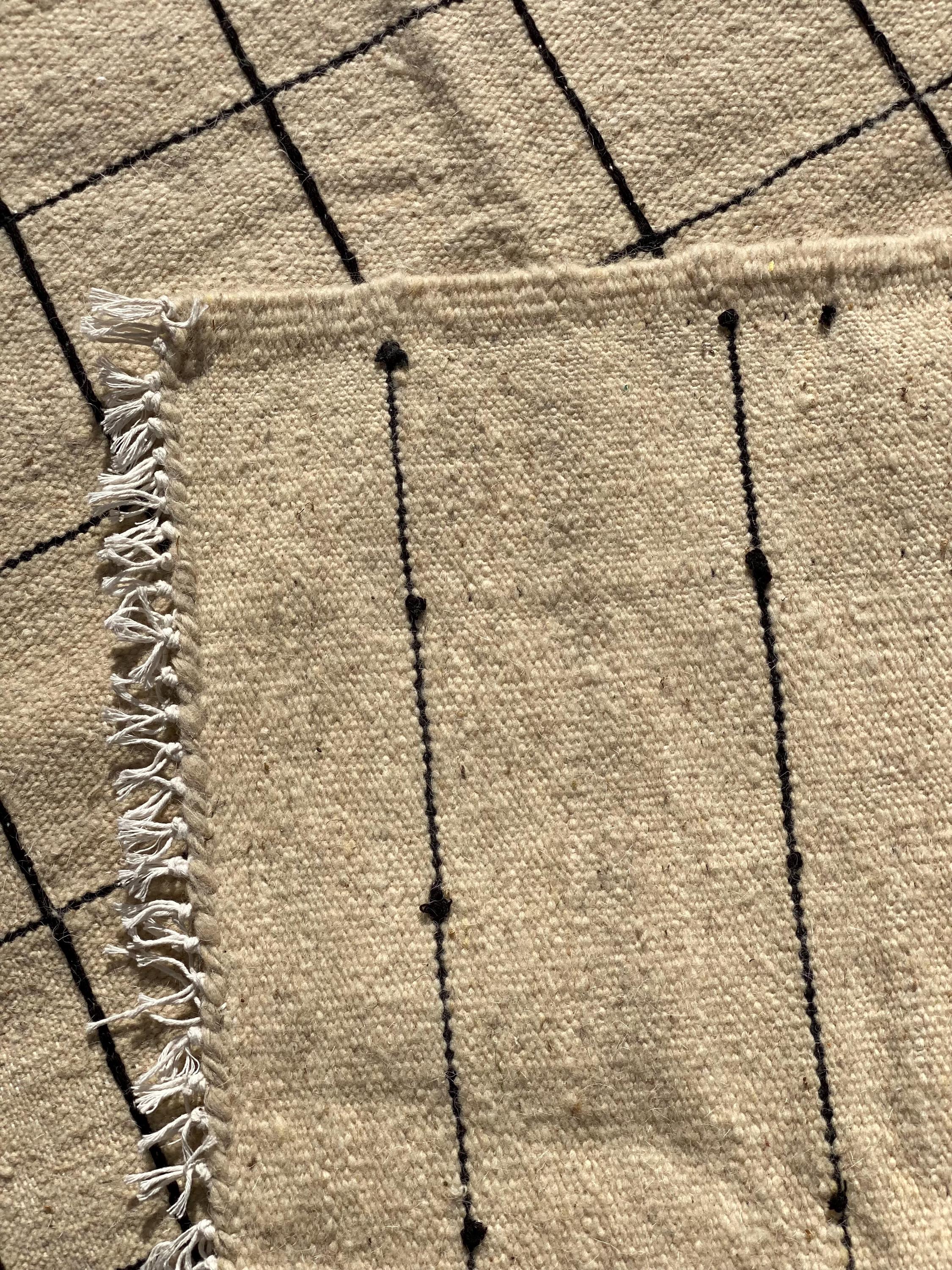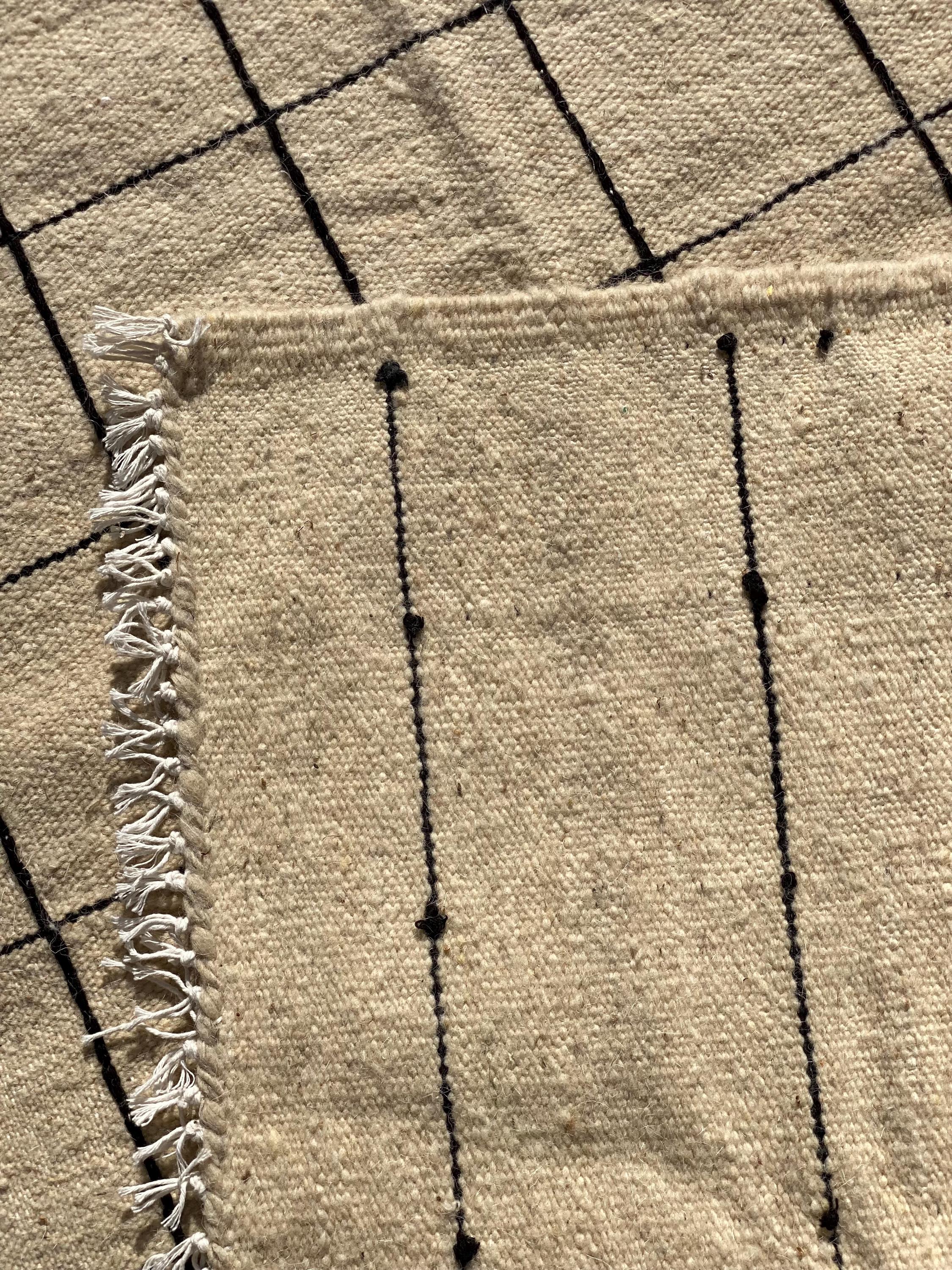 This stunning handwoven Moroccan carpet features a contemporary minimalist design with a classic grid pattern in black on natural undyed wool. Made by skilled Berber artisans in the Tiznit region of Morocco, this authentic piece brings warmth, texture, and timeless elegance to any space.