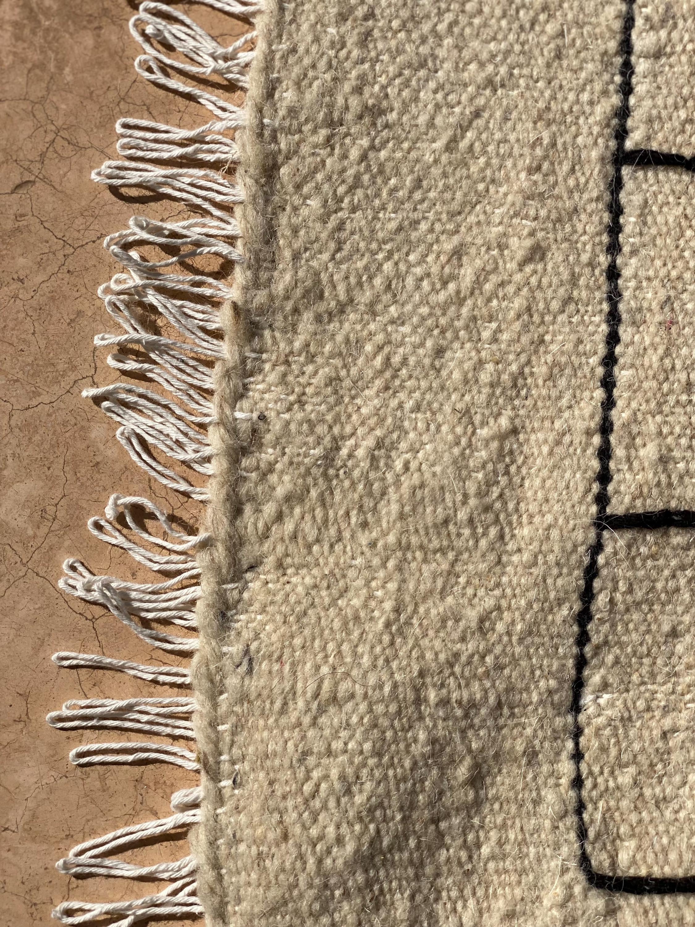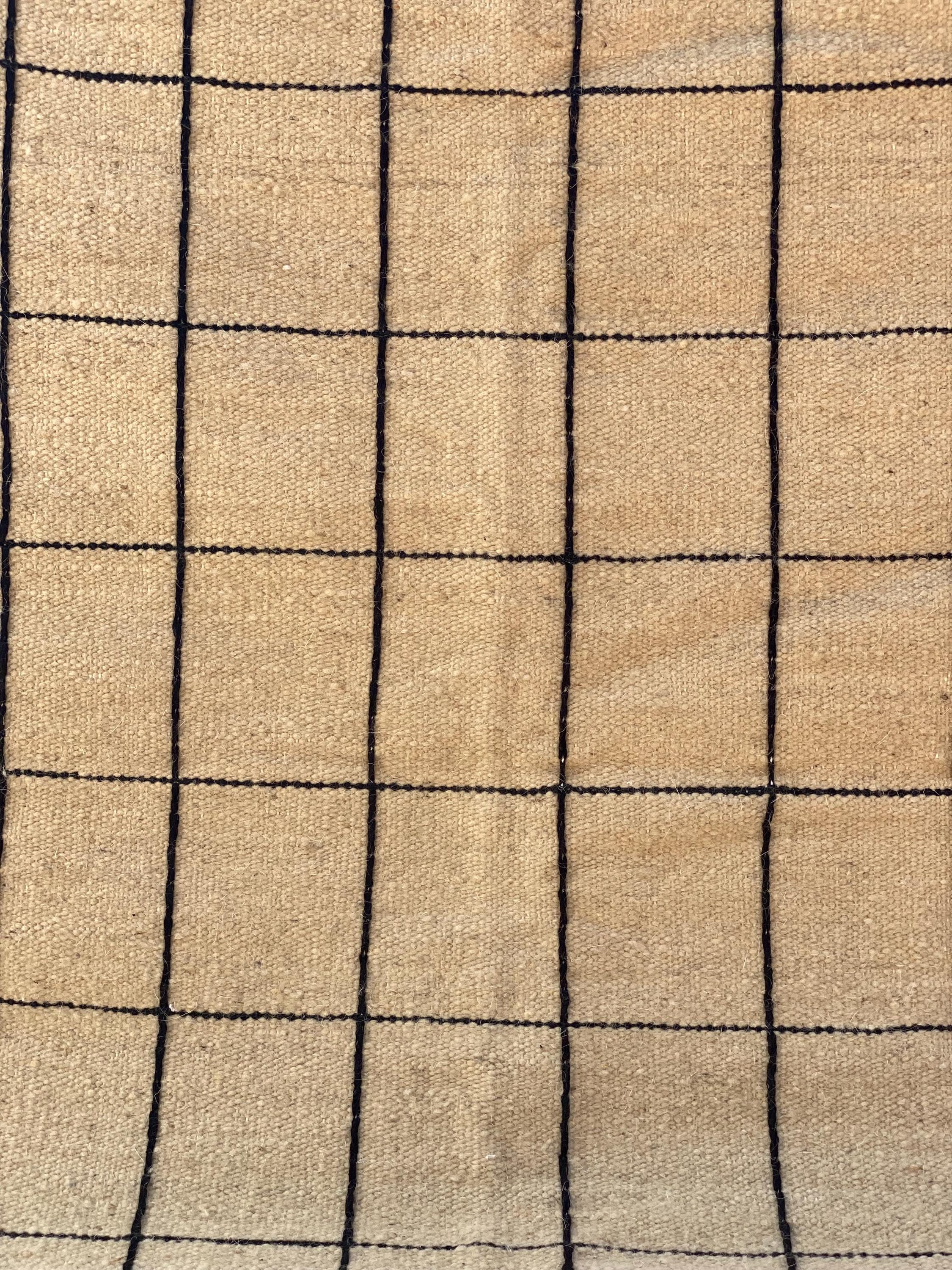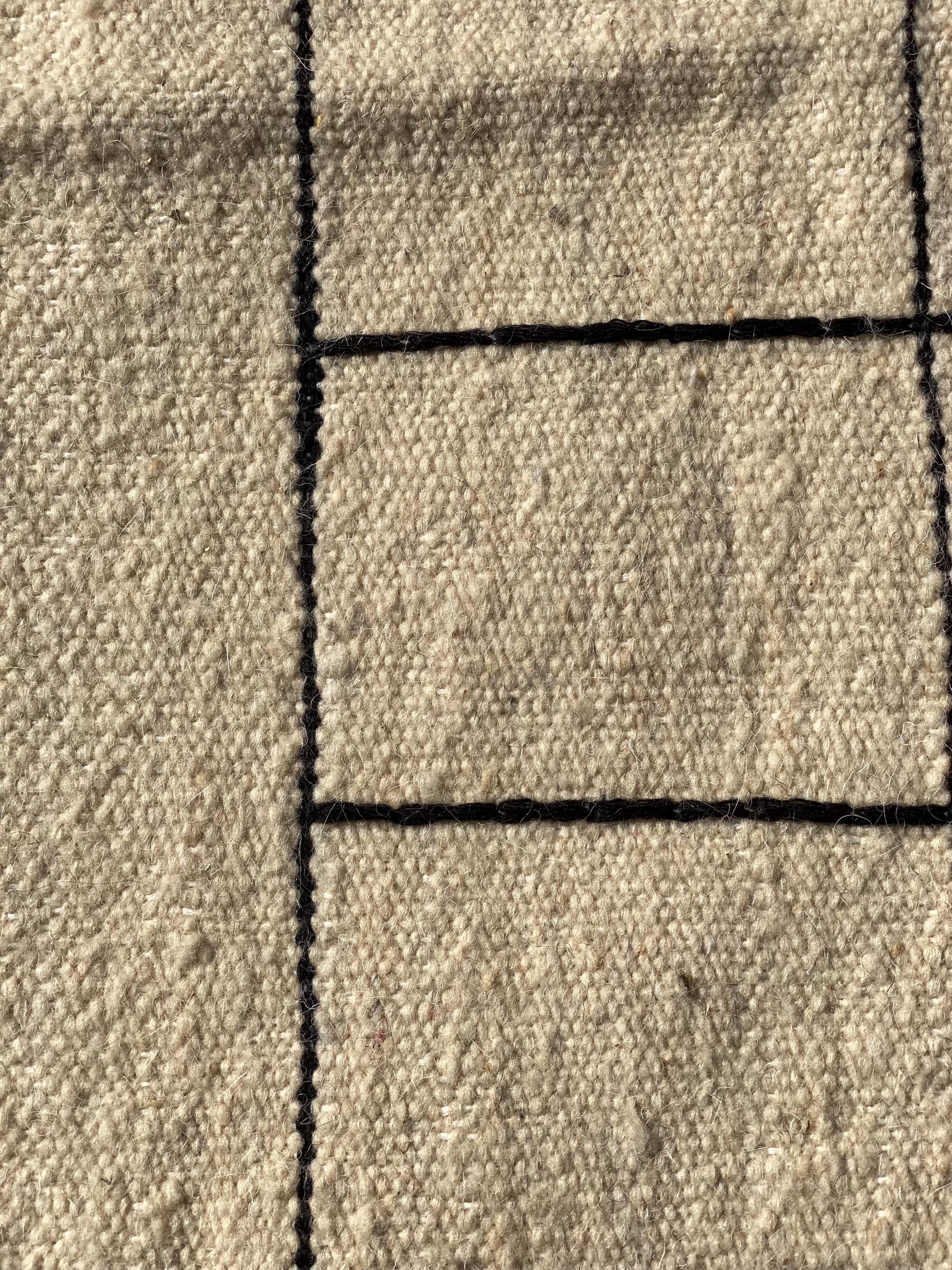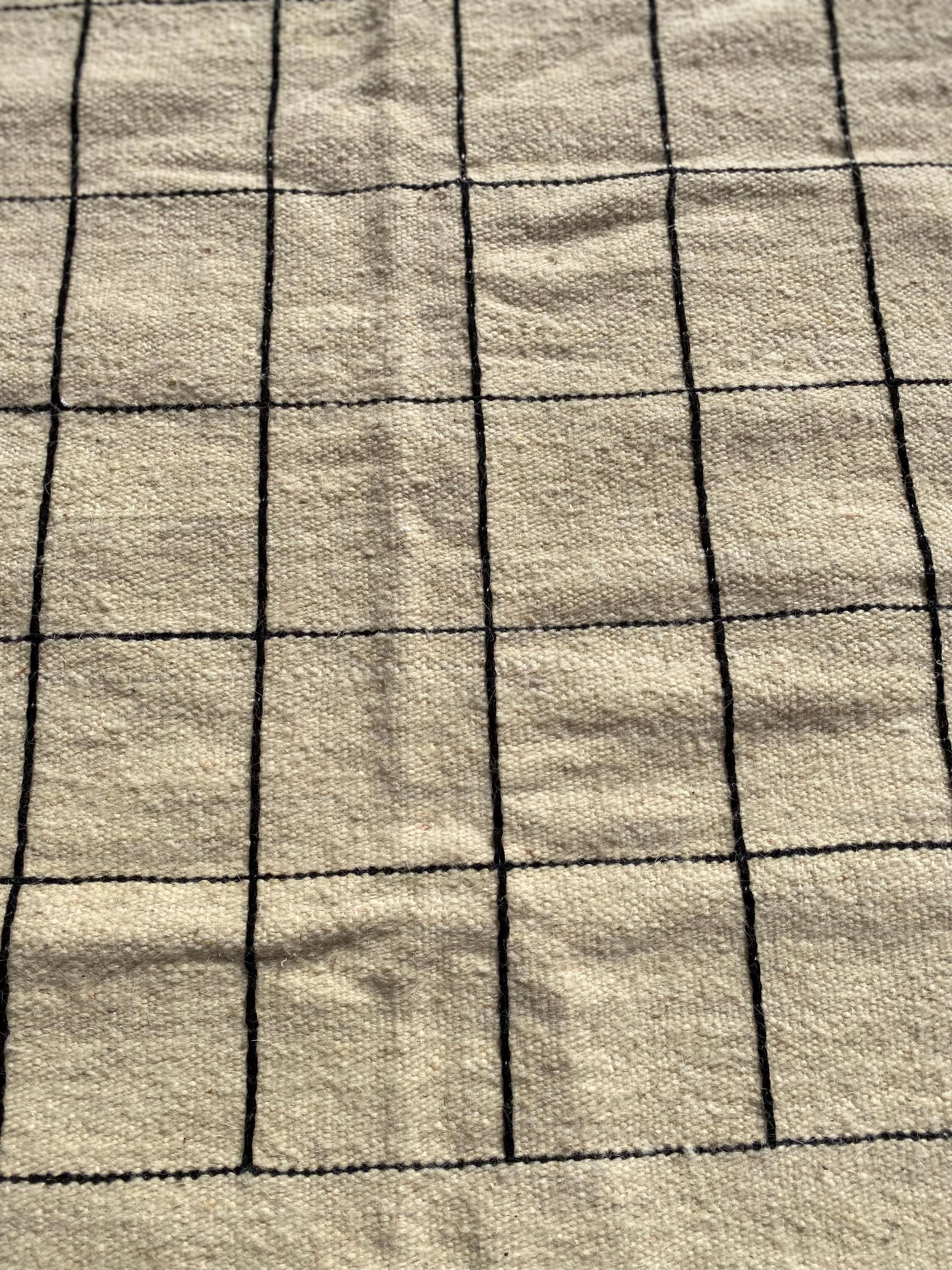 This stunning handwoven Moroccan carpet features a contemporary minimalist design with a classic grid pattern in black on natural undyed wool. Made by skilled Berber artisans in the Tiznit region of Morocco, this authentic piece brings warmth, texture, and timeless elegance to any space.