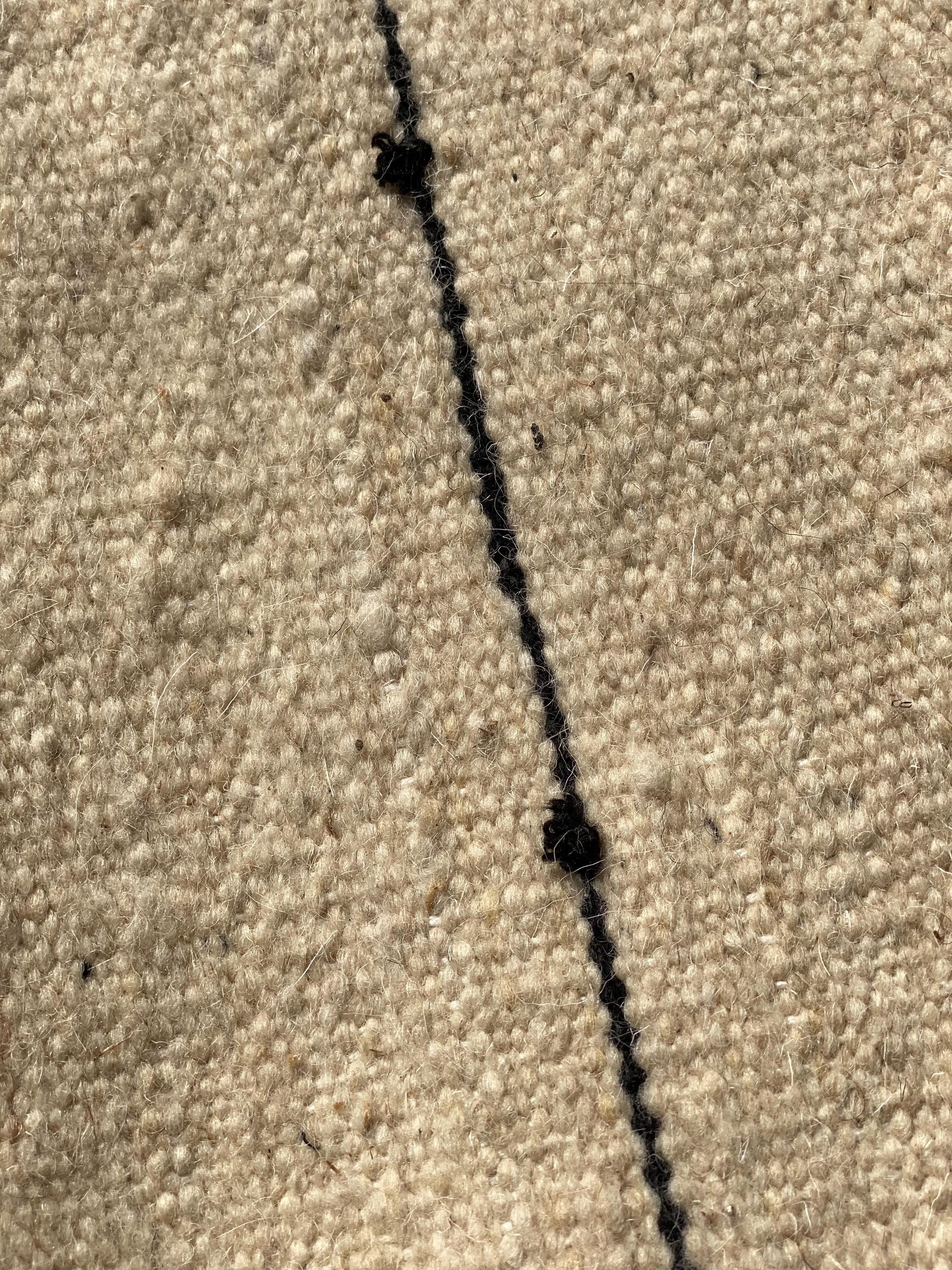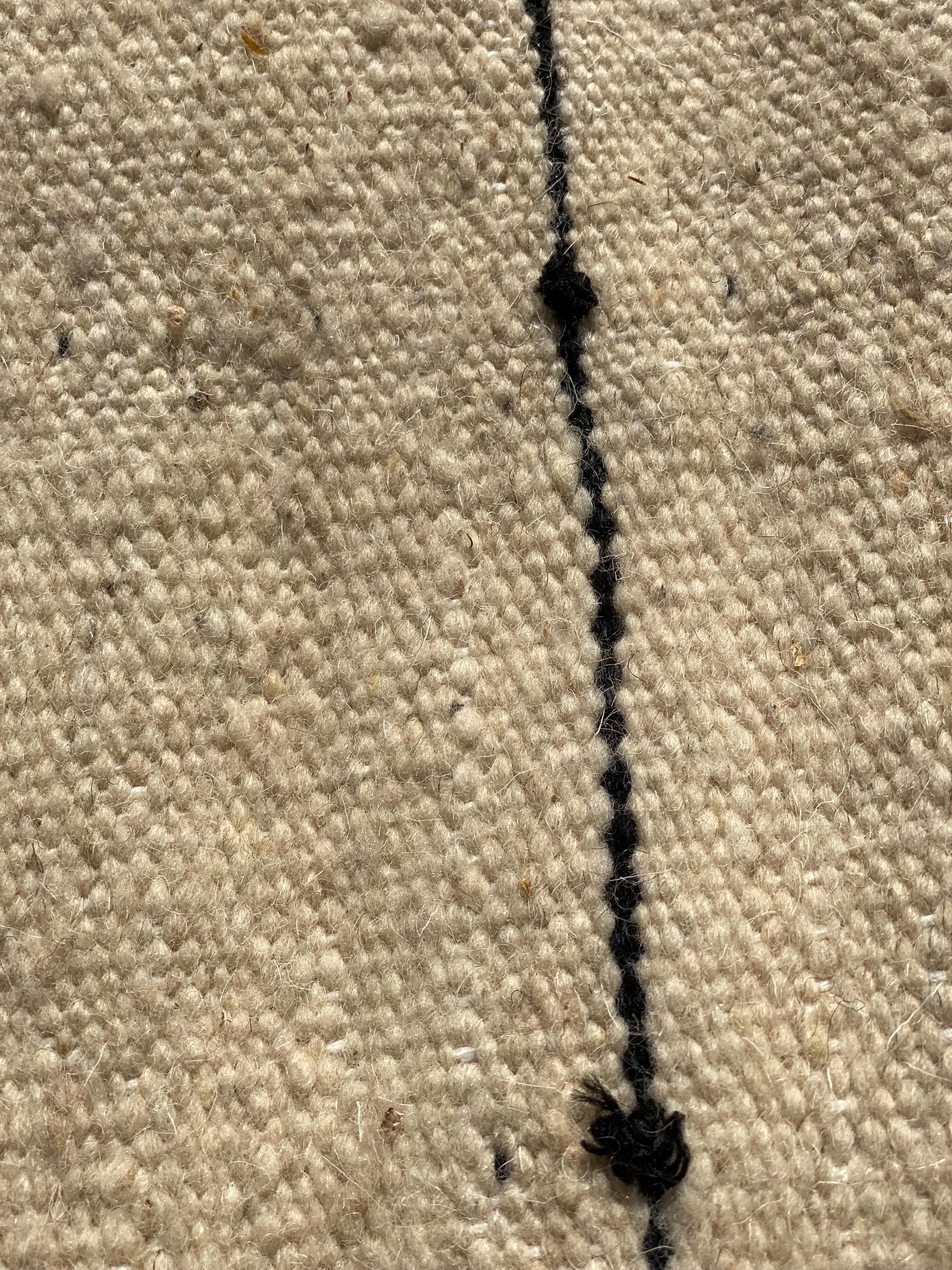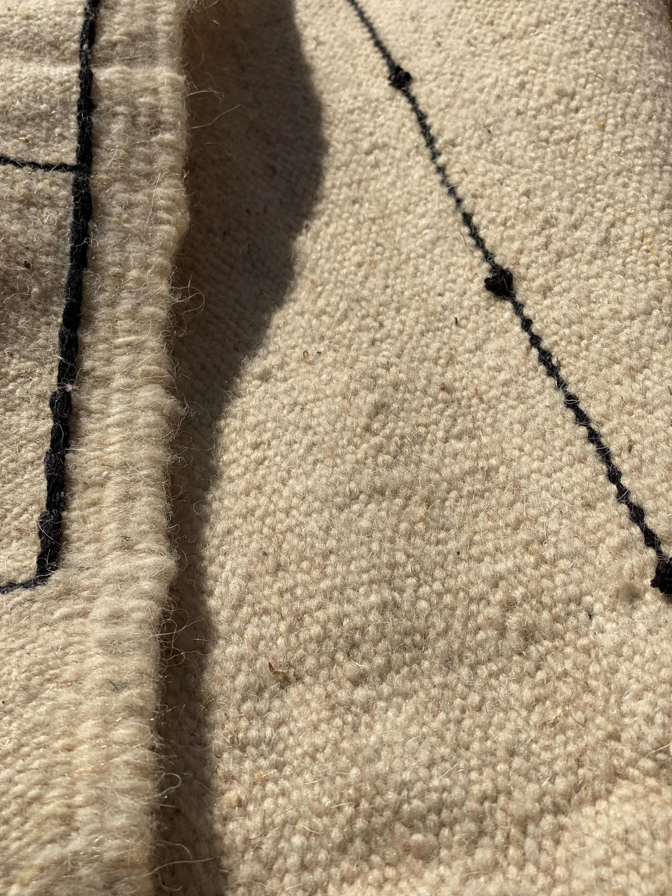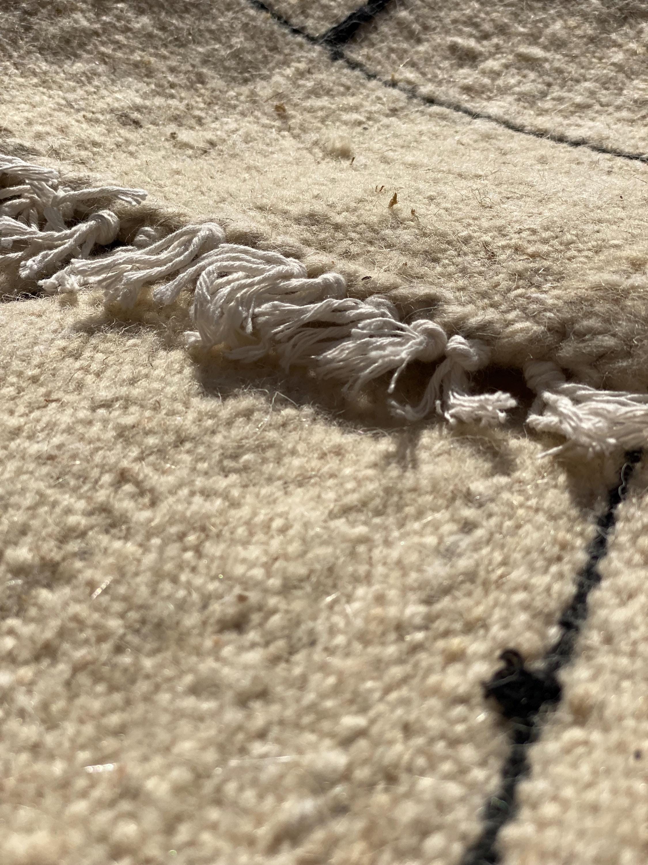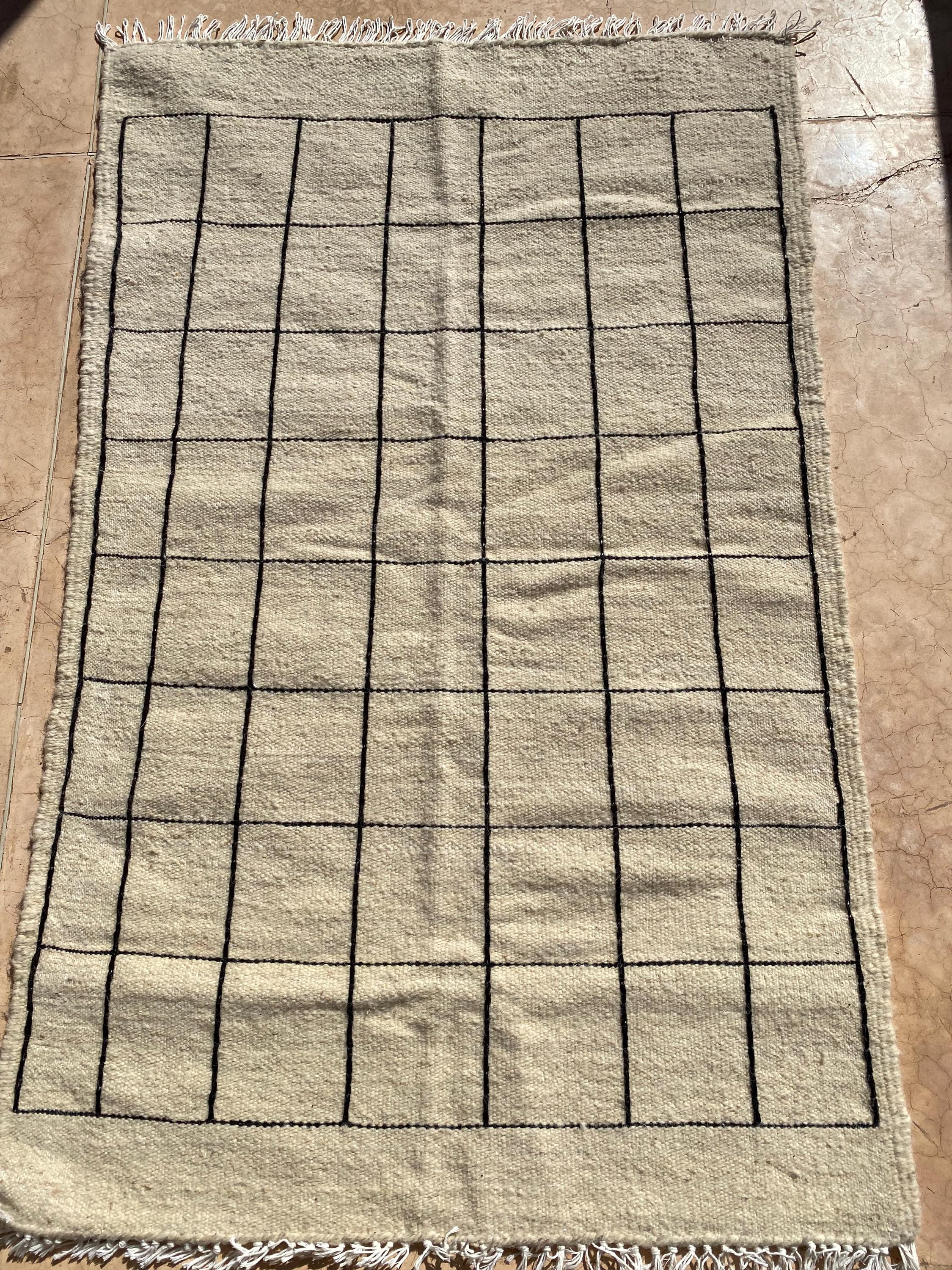 This stunning handwoven Moroccan carpet features a contemporary minimalist design with a classic grid pattern in black on natural undyed wool. Made by skilled Berber artisans in the Tiznit region of Morocco, this authentic piece brings warmth, texture, and timeless elegance to any space.