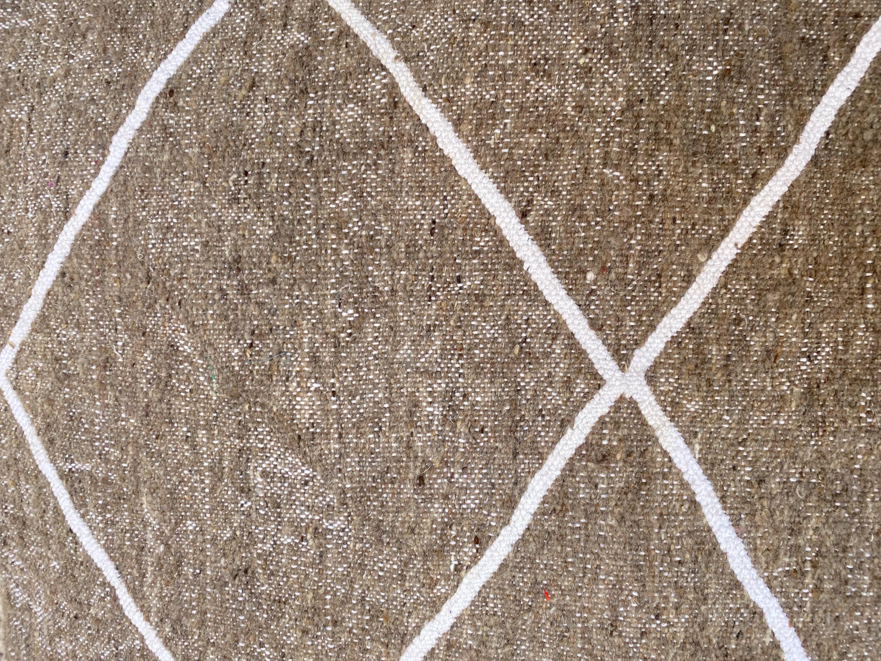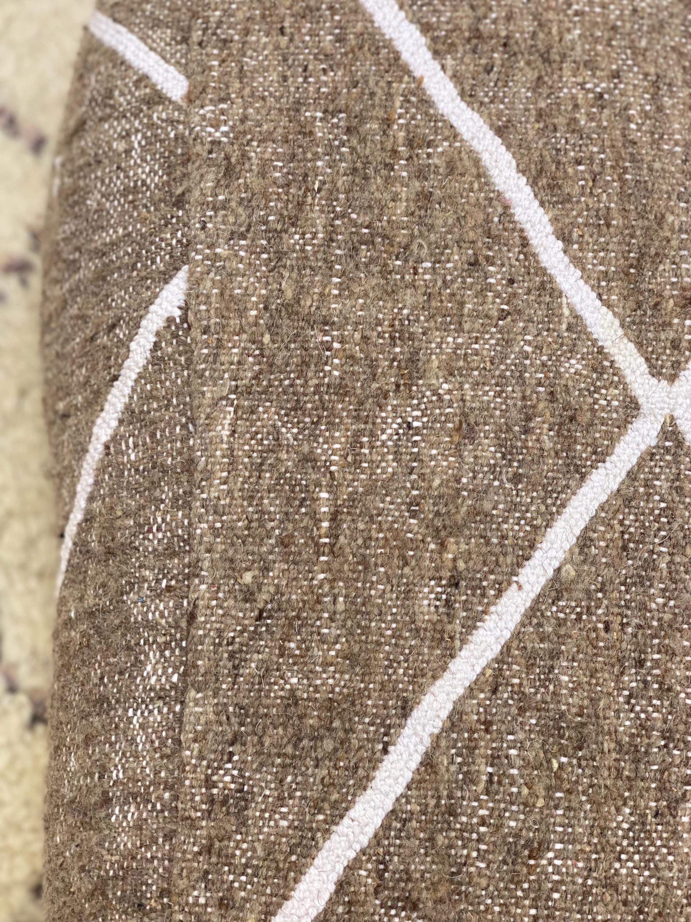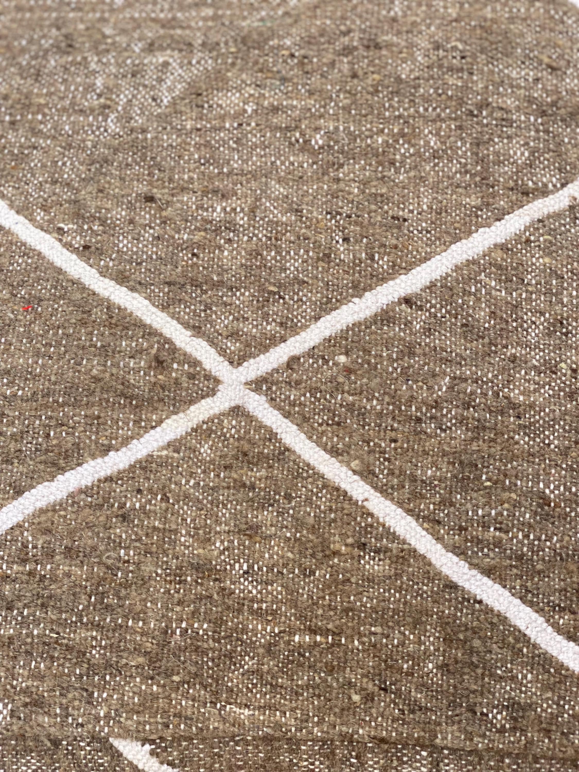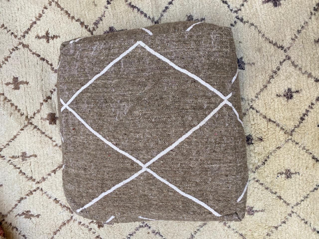Elevate your living space with this authentic Moroccan floor pouf, handcrafted by skilled Berber artisans. This versatile floor cushion features a sophisticated taupe base adorned with elegant white geometric diamond patterns, making it a perfect addition to any bohemian, minimalist, or eclectic interior.