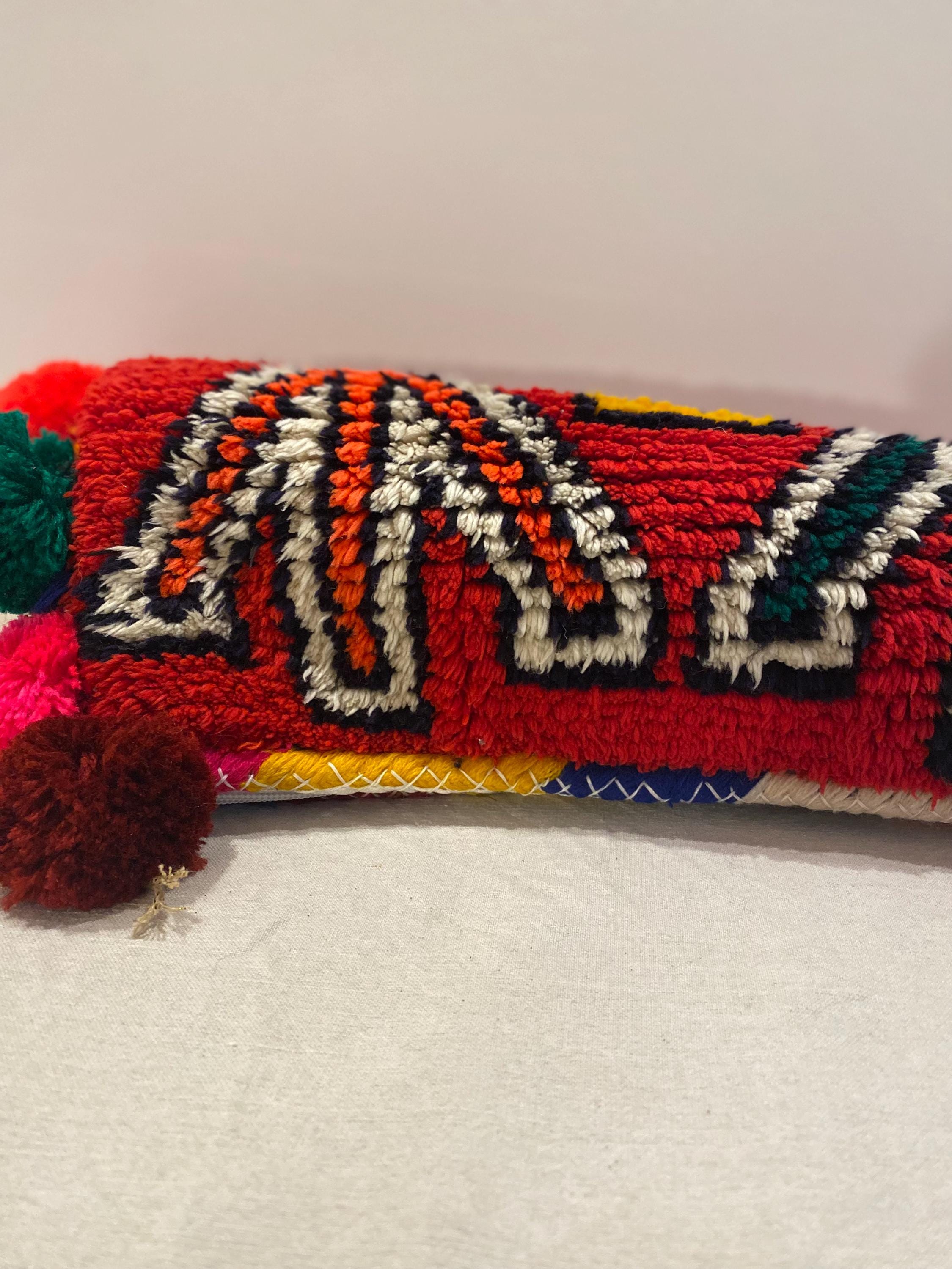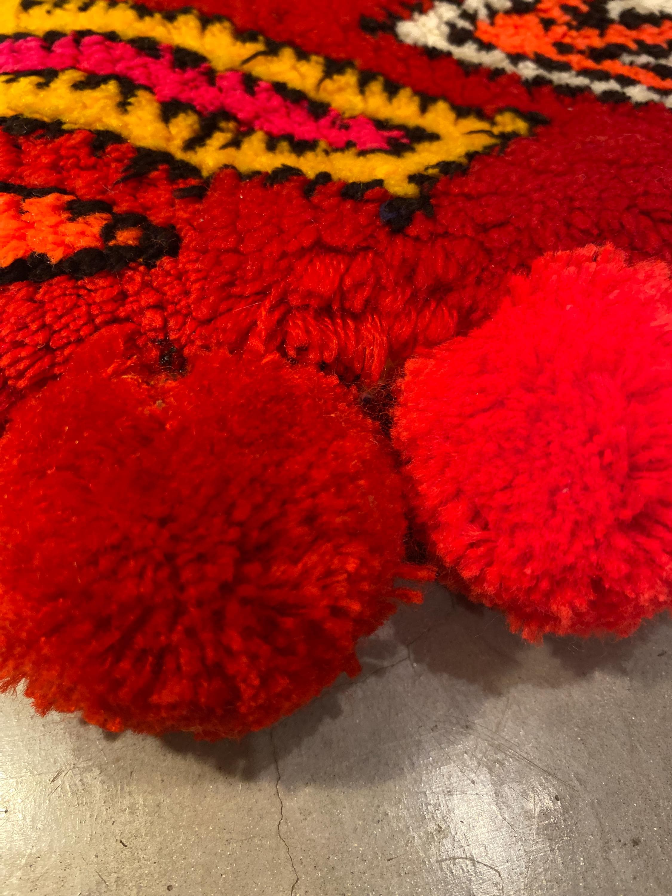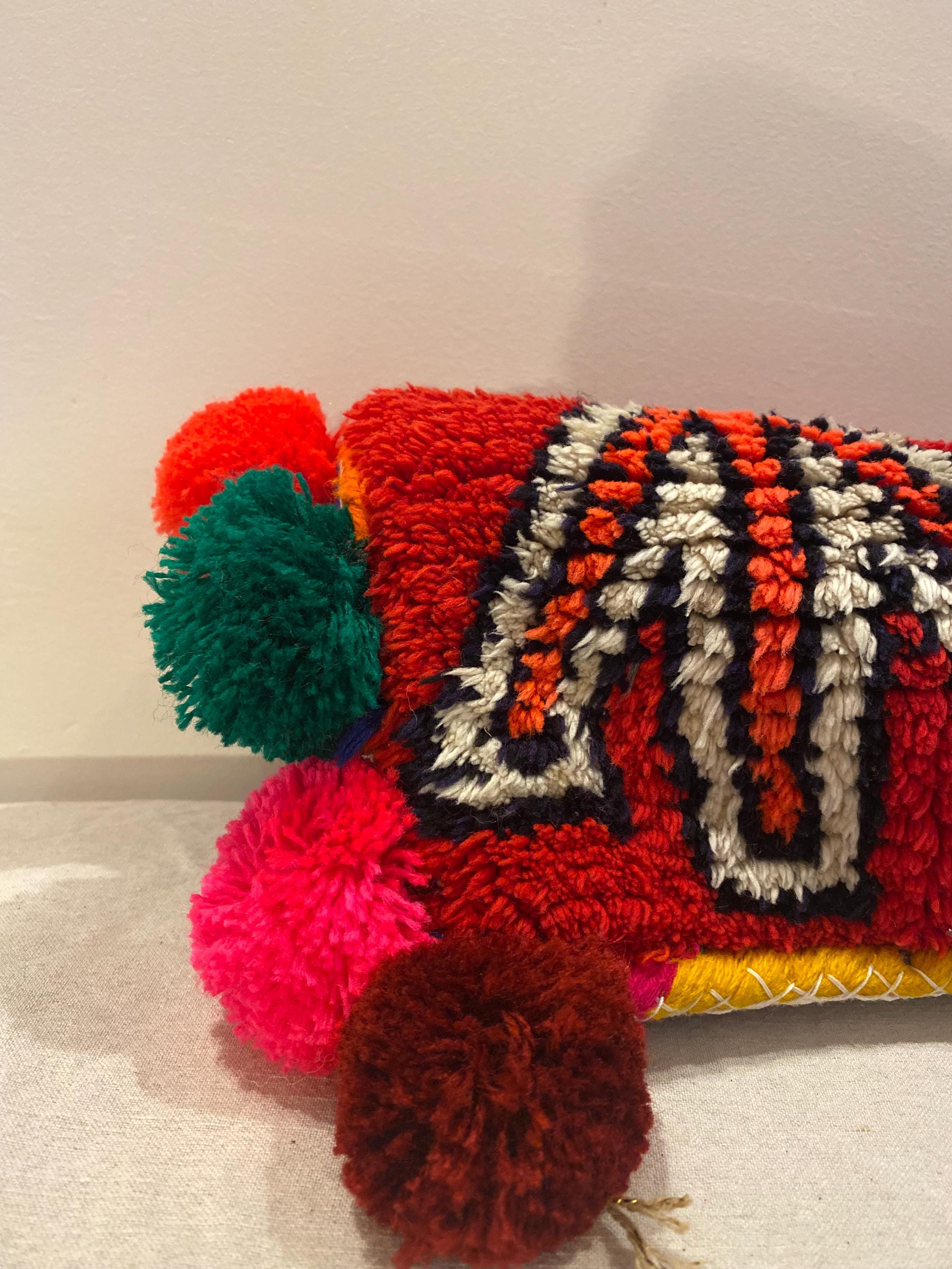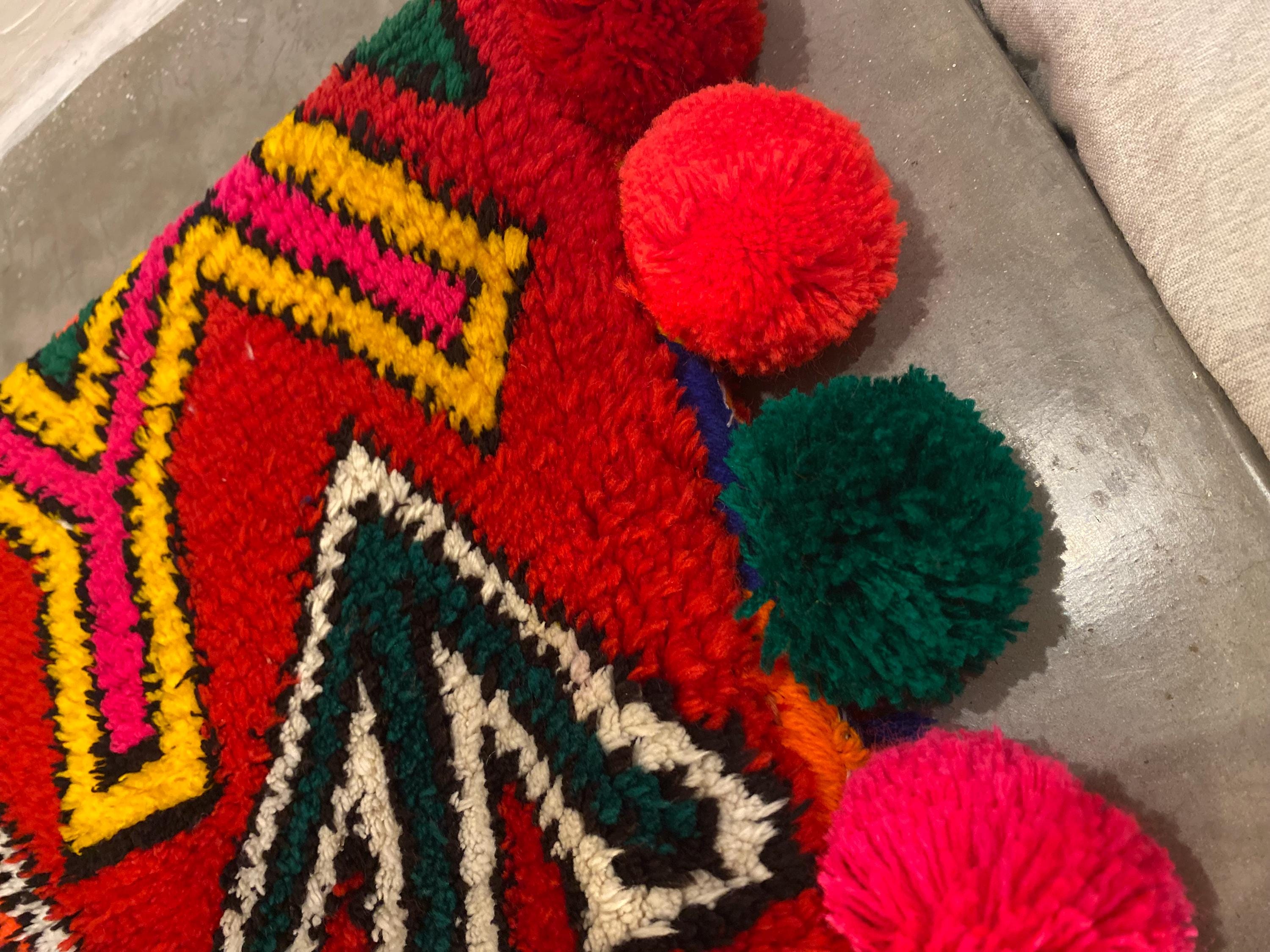 This bold statement piece features a beautiful red wool carpet exterior adorned with traditional Berber geometric patterns in vibrant colors—deep teal, golden yellow, hot pink, orange, cream, and black. The edges are embellished with cheerful handmade pom poms in coordinating colors (red, burgundy, hot pink, teal, and orange), adding playful texture and authentic Moroccan flair.