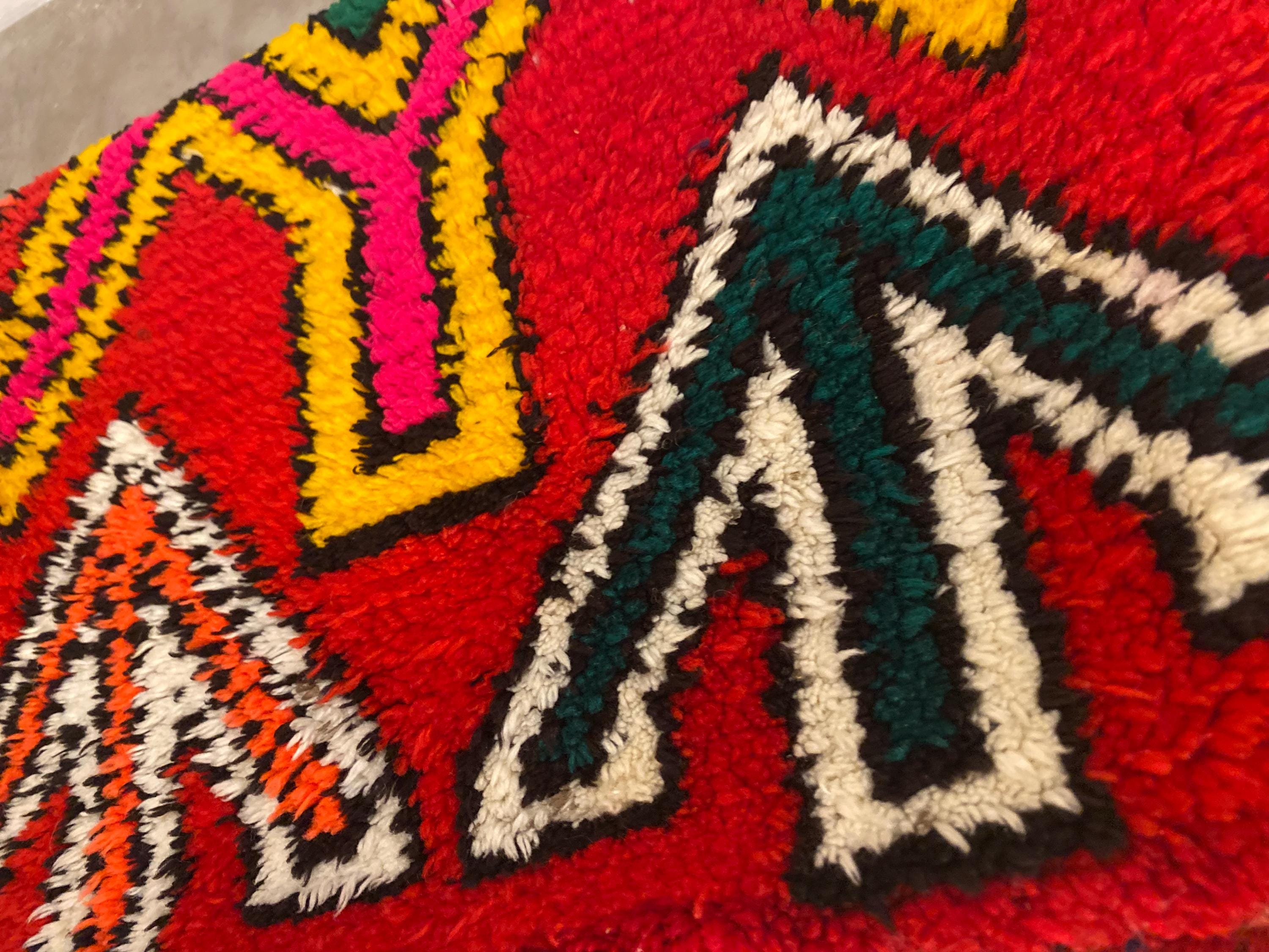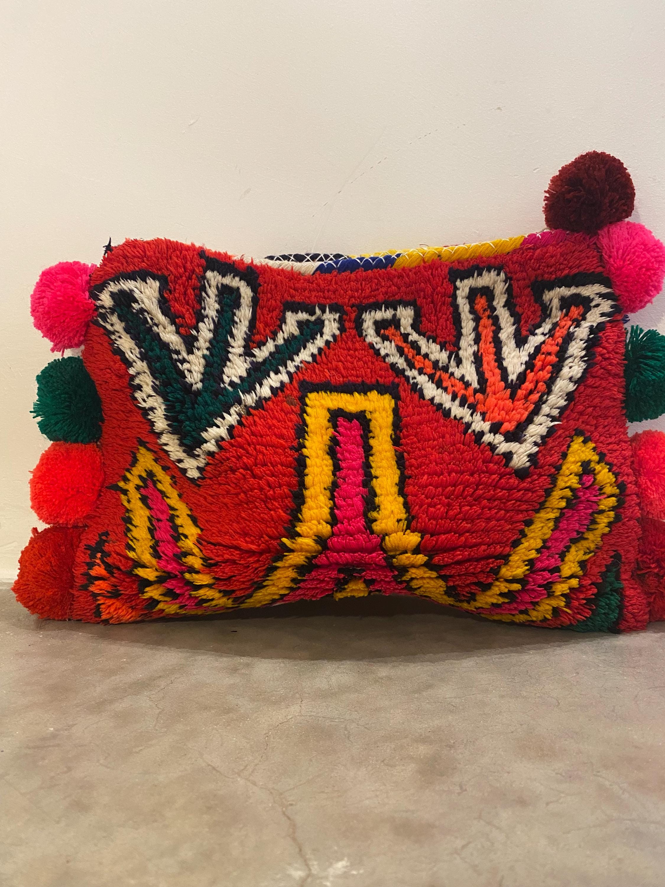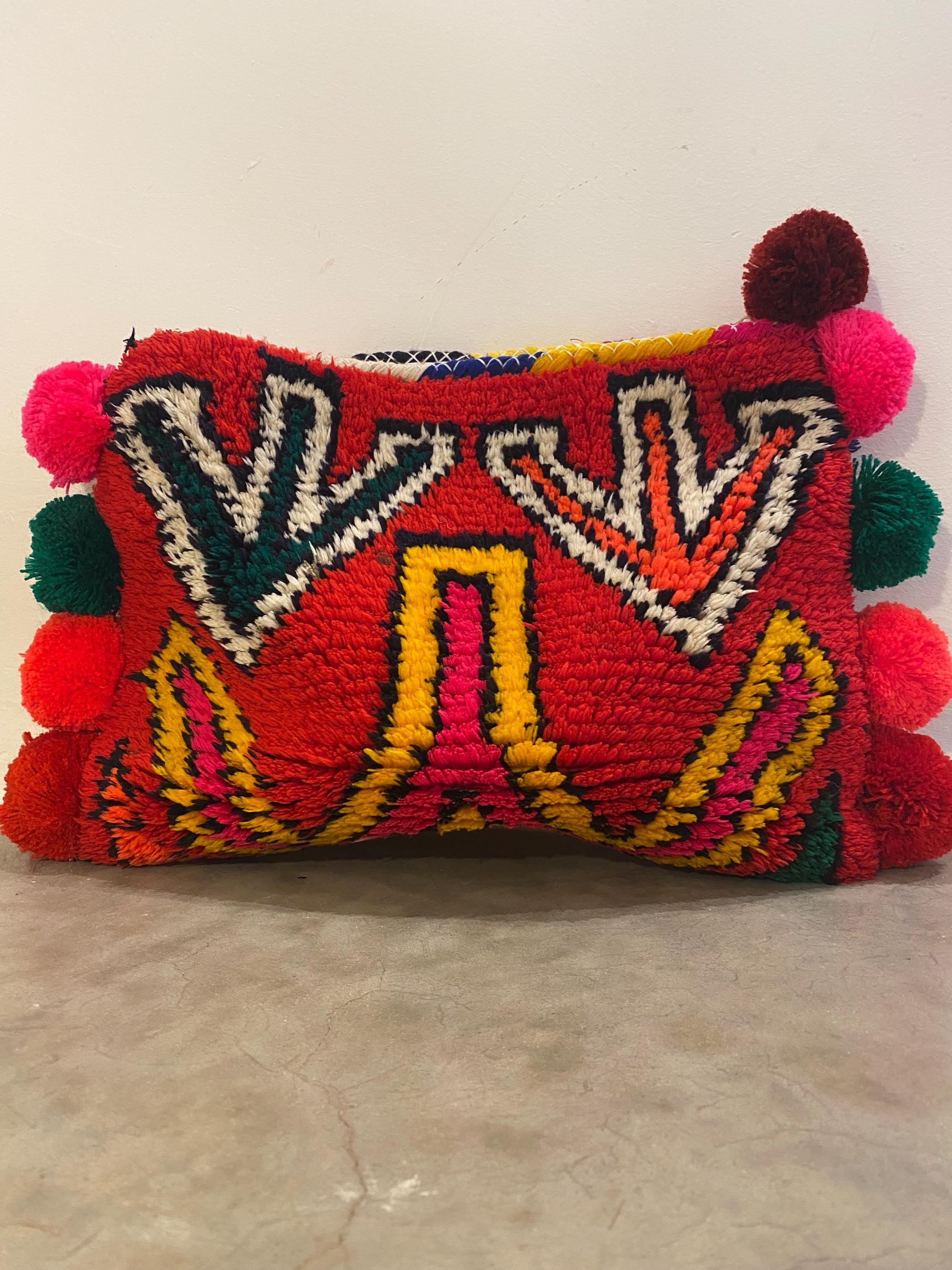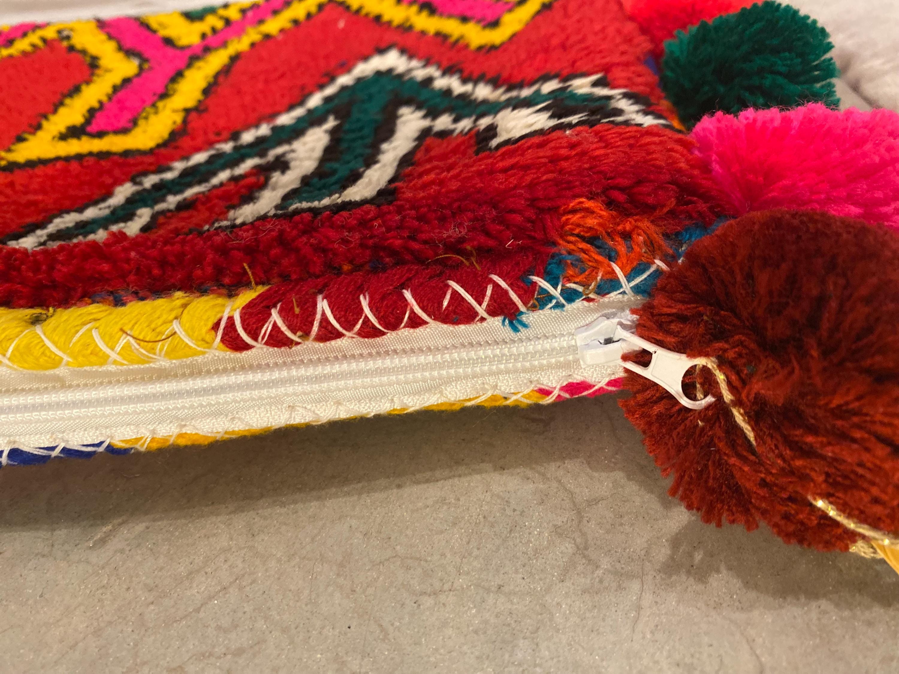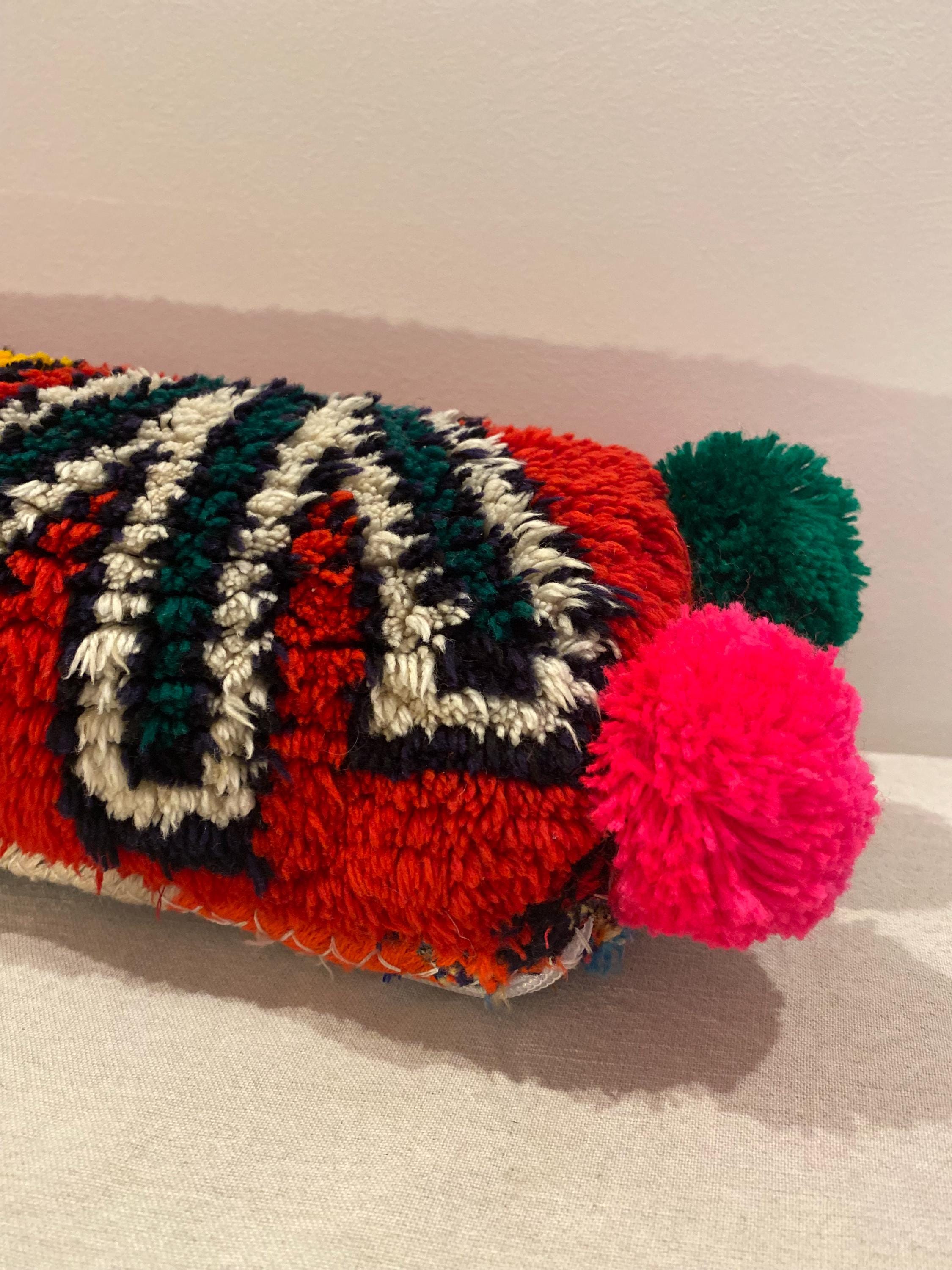 This bold statement piece features a beautiful red wool carpet exterior adorned with traditional Berber geometric patterns in vibrant colors—deep teal, golden yellow, hot pink, orange, cream, and black. The edges are embellished with cheerful handmade pom poms in coordinating colors (red, burgundy, hot pink, teal, and orange), adding playful texture and authentic Moroccan flair.