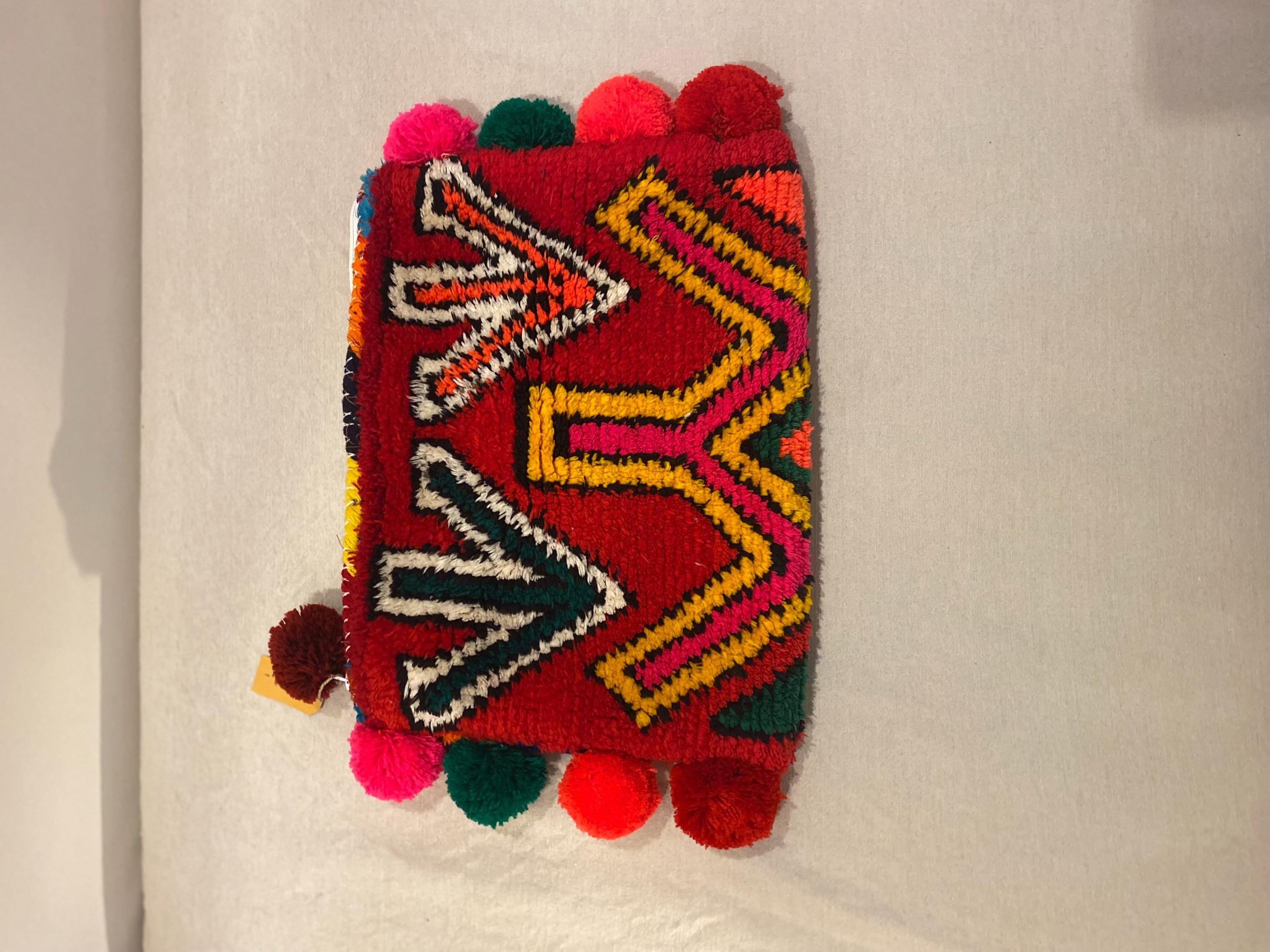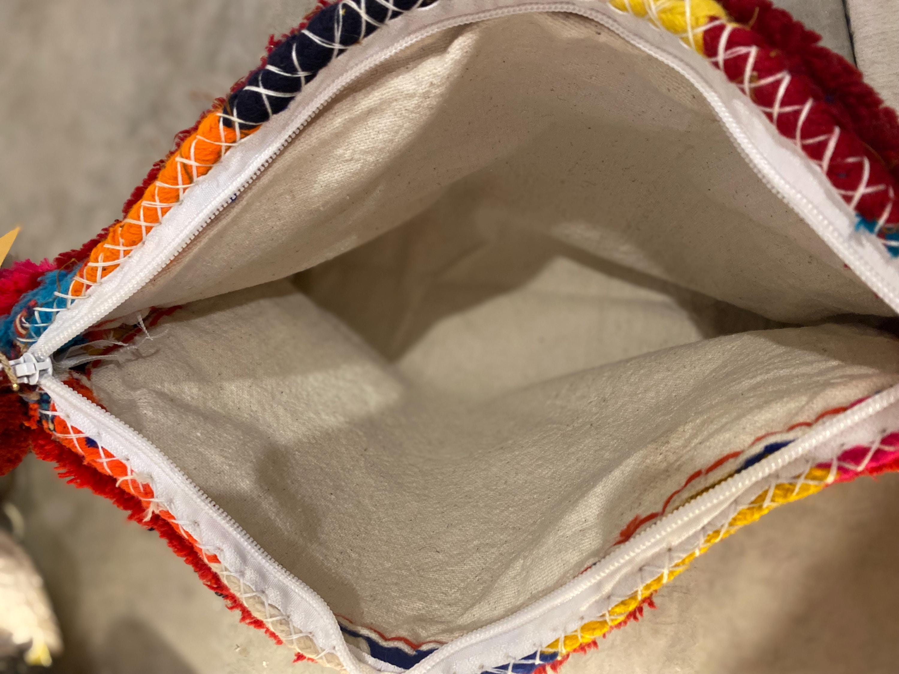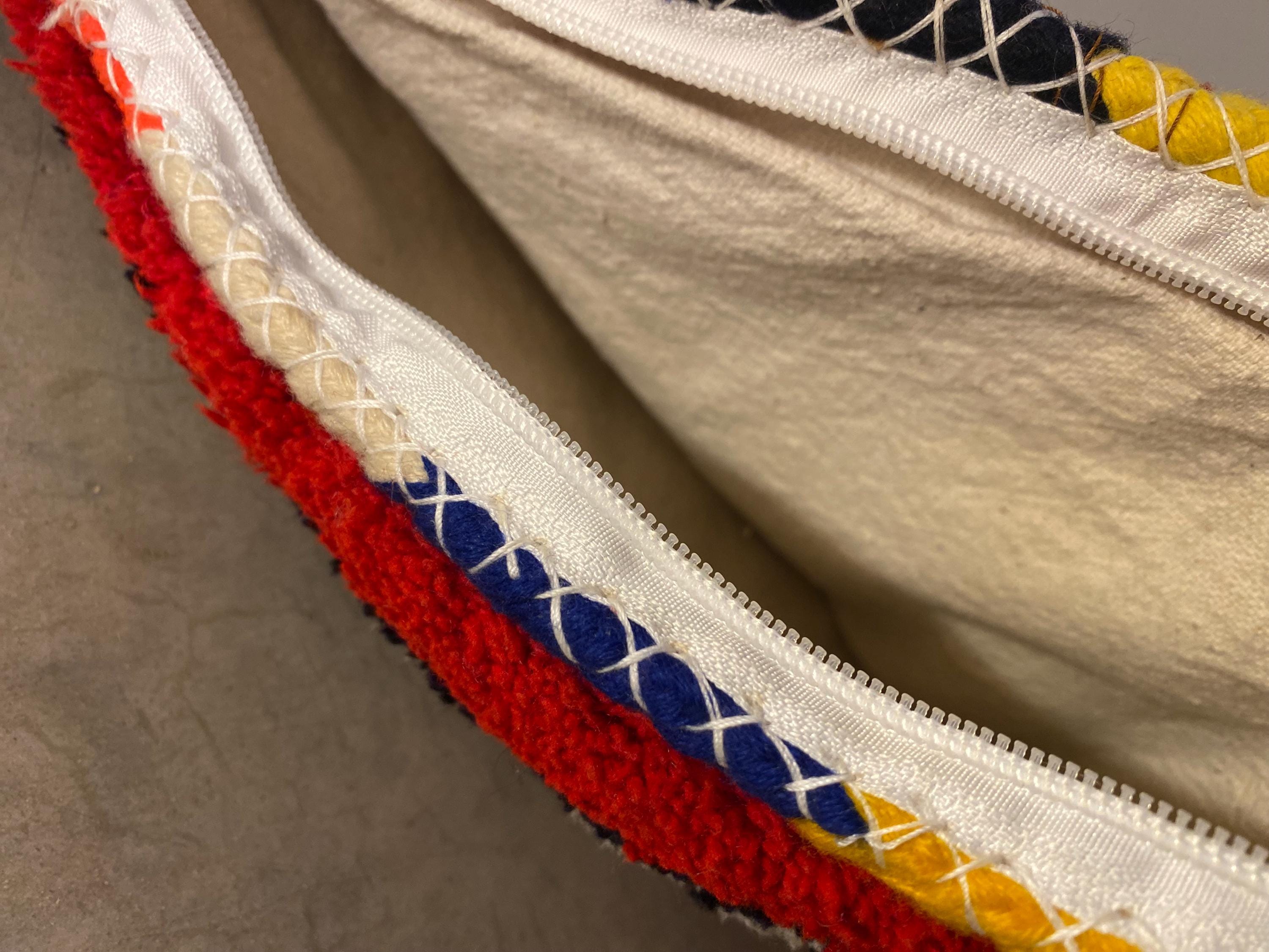 I carefully selected this section of carpet for its vibrant colors and bold geometric design. Each bag is hand-cut and sewn with attention to detail, ensuring the patterns are well-positioned and the construction is durable. The white lining is carefully fitted and sewn to provide a clean finish, and each pom pom is individually tied by hand. The result is a unique accessory that bridges traditional textile art and contemporary fashion.