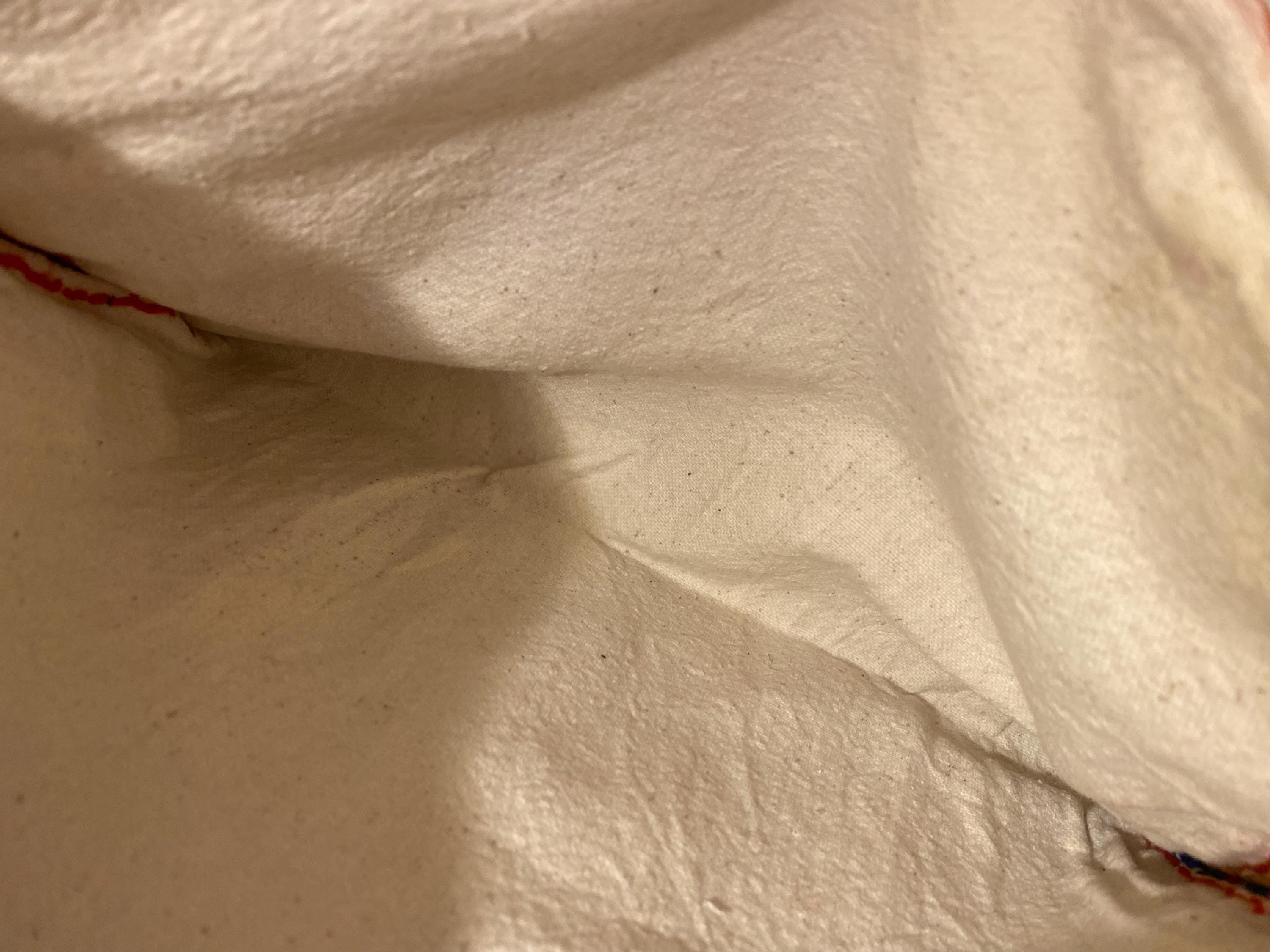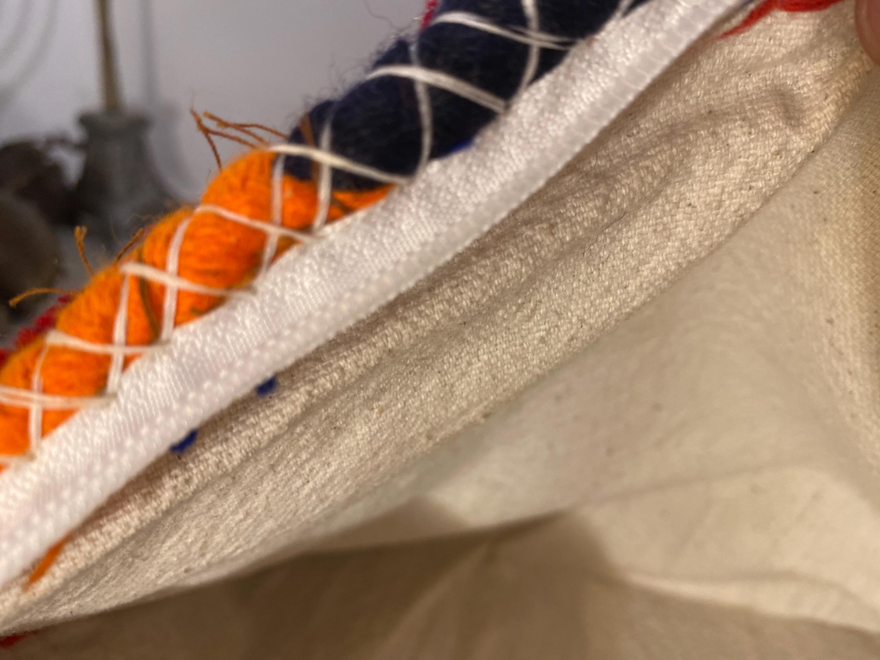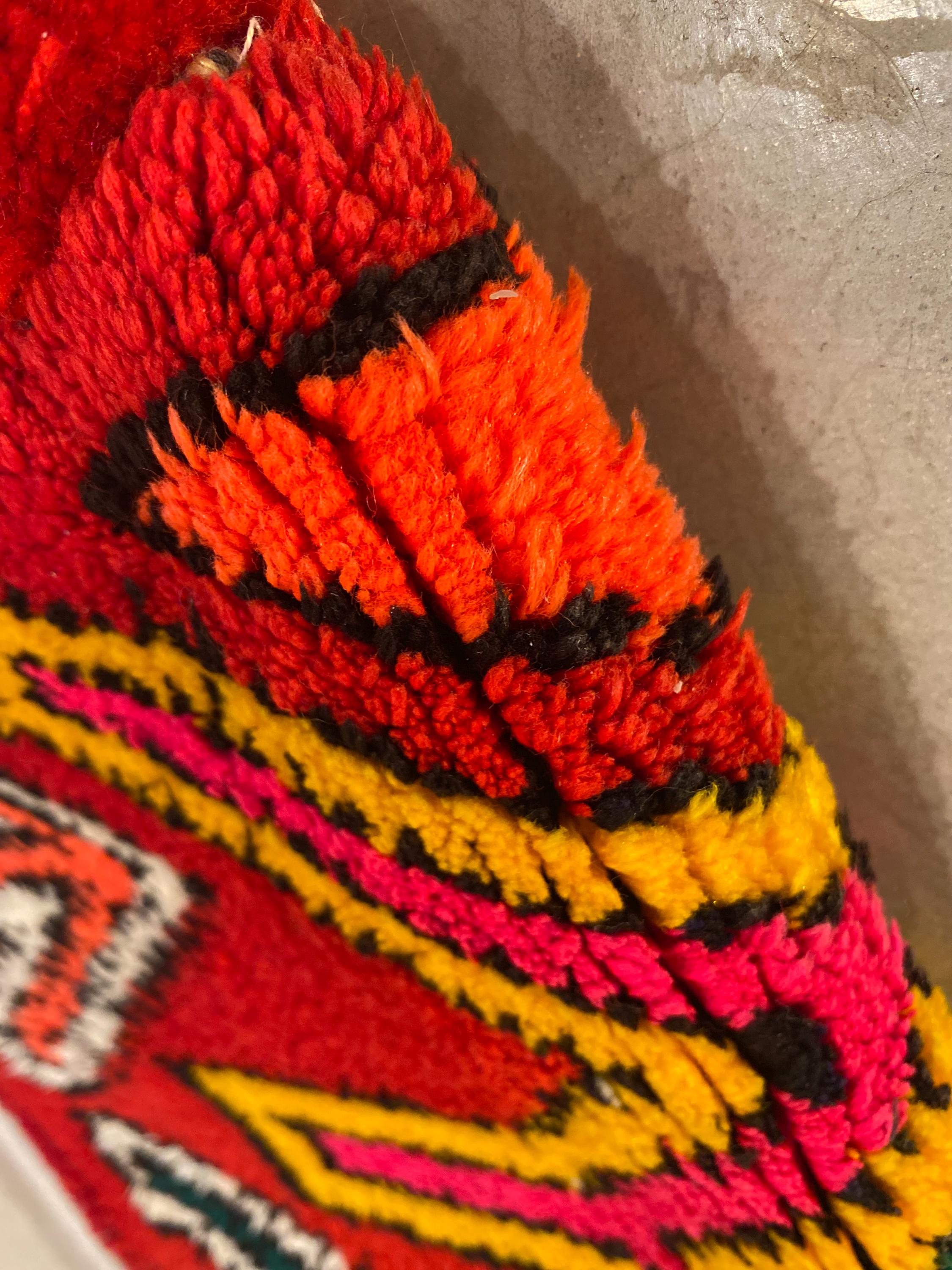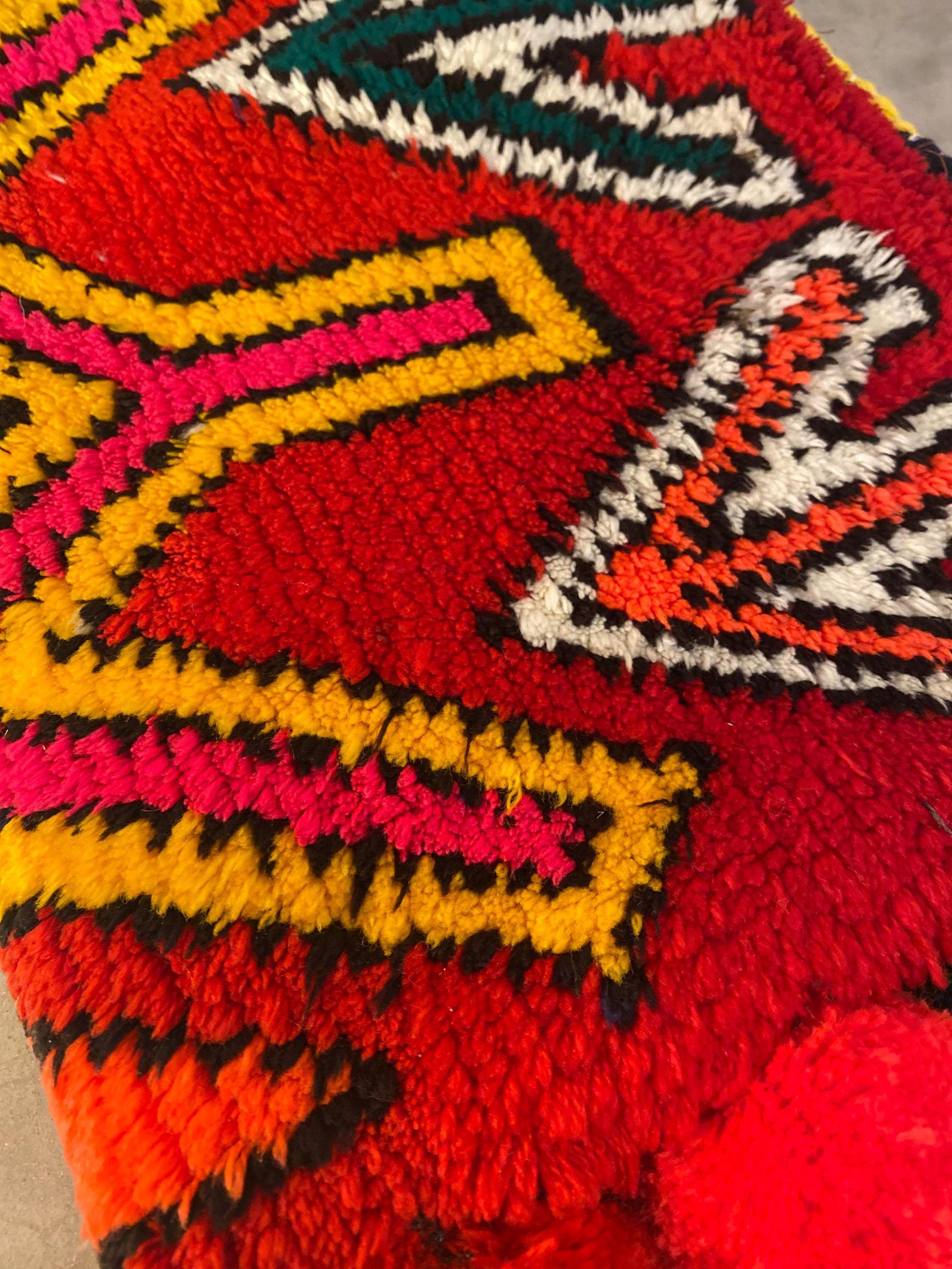 I carefully selected this section of carpet for its vibrant colors and bold geometric design. Each bag is hand-cut and sewn with attention to detail, ensuring the patterns are well-positioned and the construction is durable. The white lining is carefully fitted and sewn to provide a clean finish, and each pom pom is individually tied by hand. The result is a unique accessory that bridges traditional textile art and contemporary fashion.