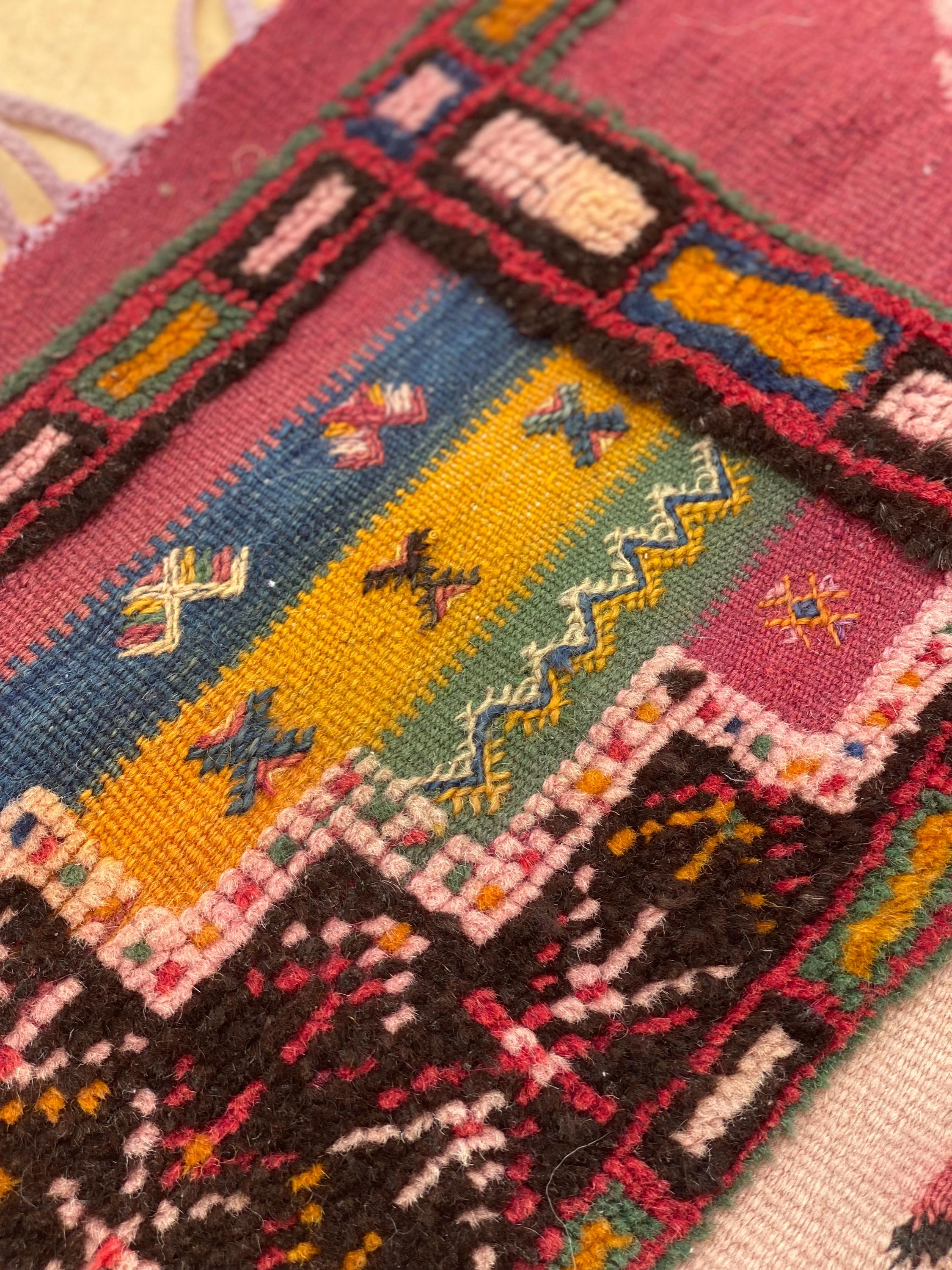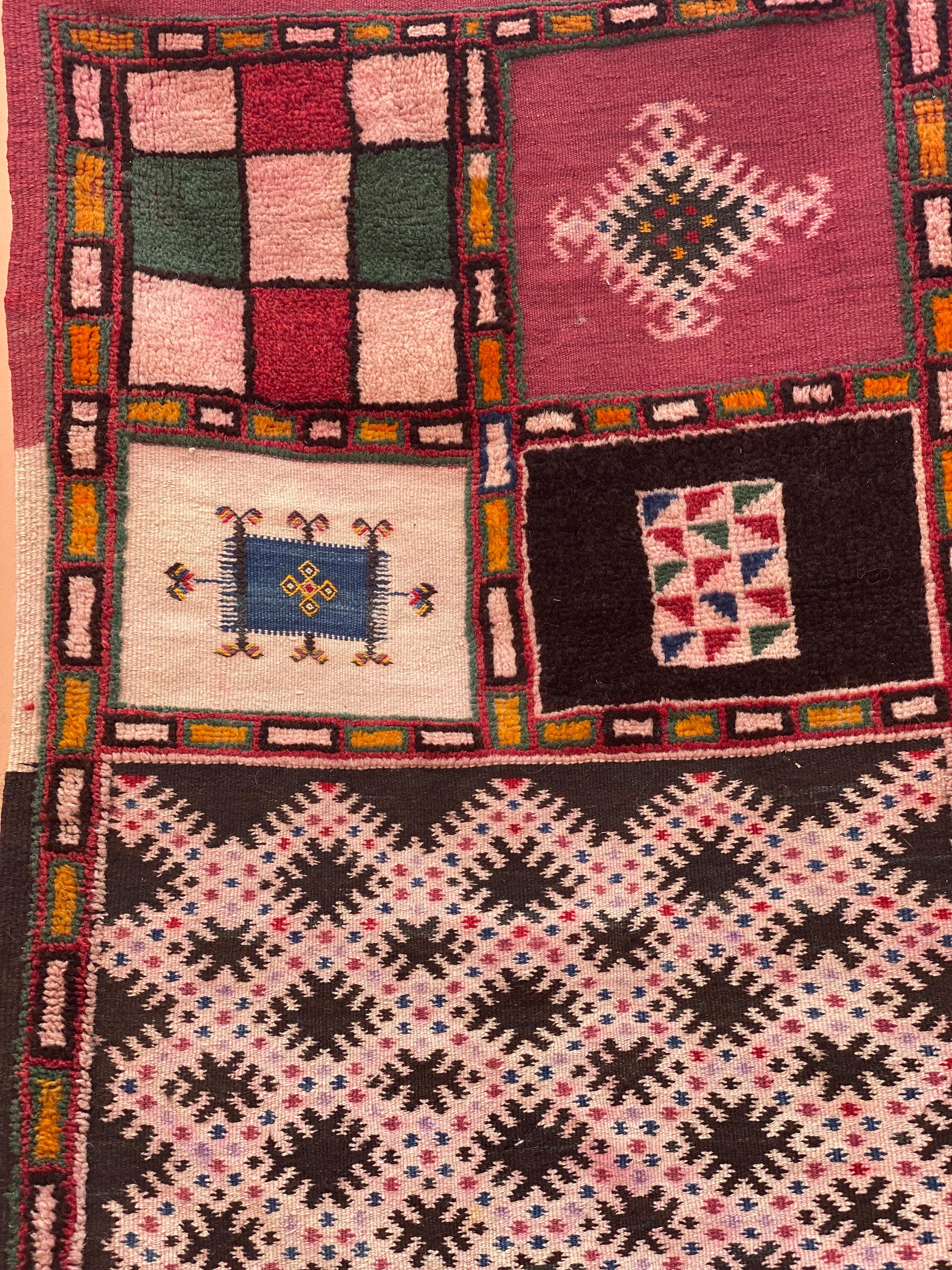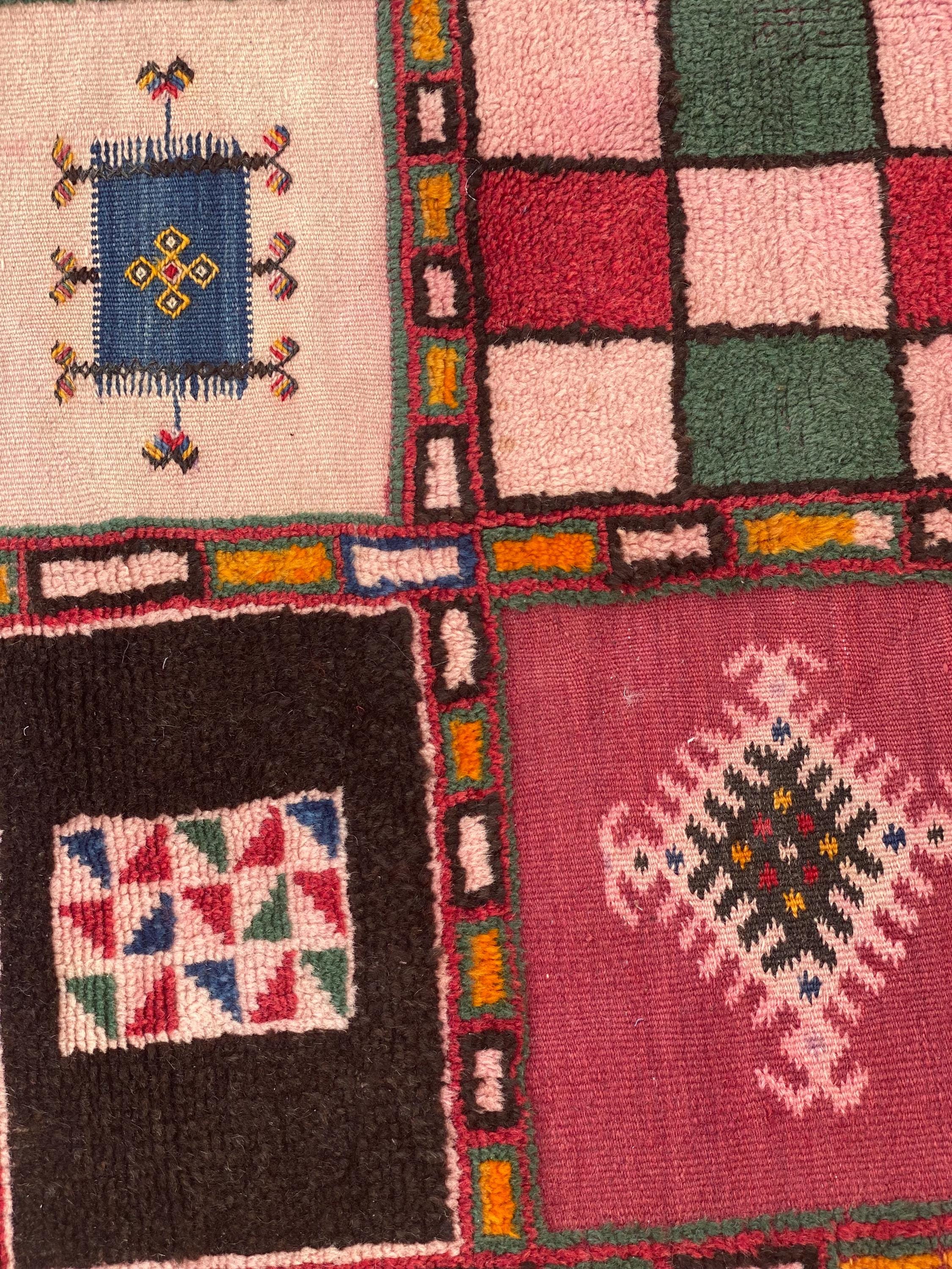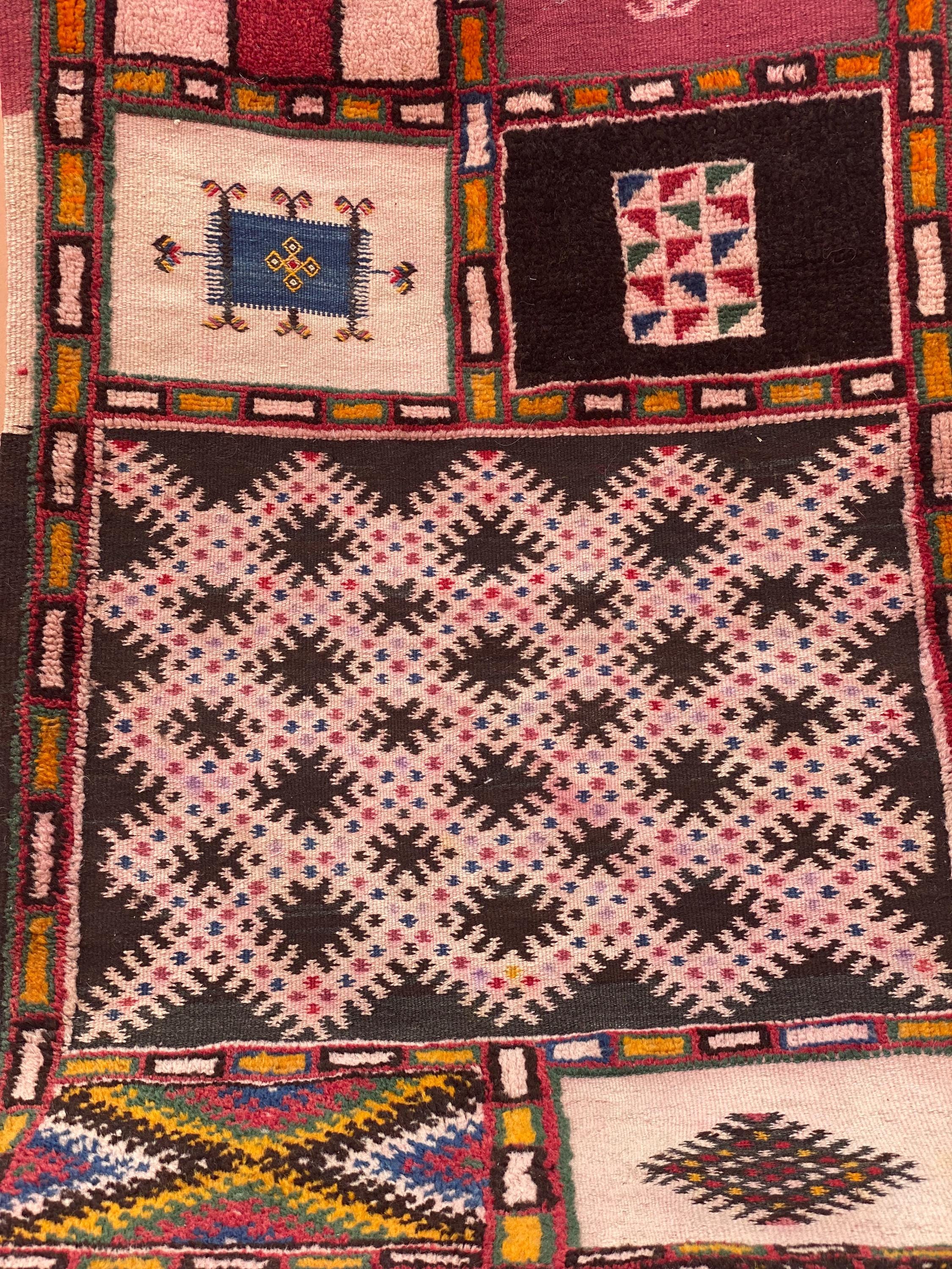 Discover authentic Moroccan craftsmanship with this beautiful vintage Berber rug, handwoven in the year 2000 in the Sirwa region. This stunning patchwork runner features multiple traditional geometric patterns including checkerboard motifs, diamond symbols, and intricate star designs in a rich palette of burgundy, pink, green, cream, navy, and orange.