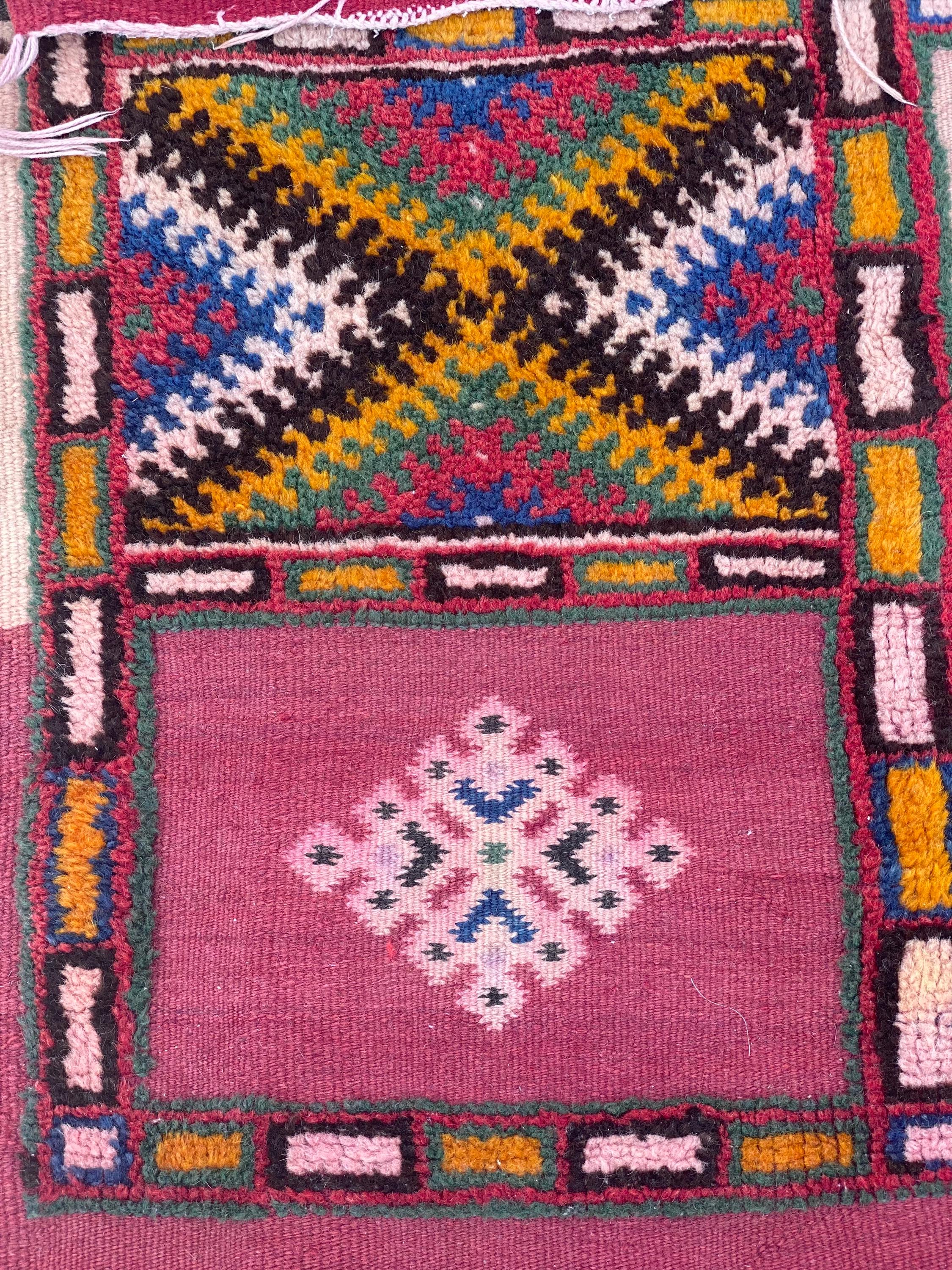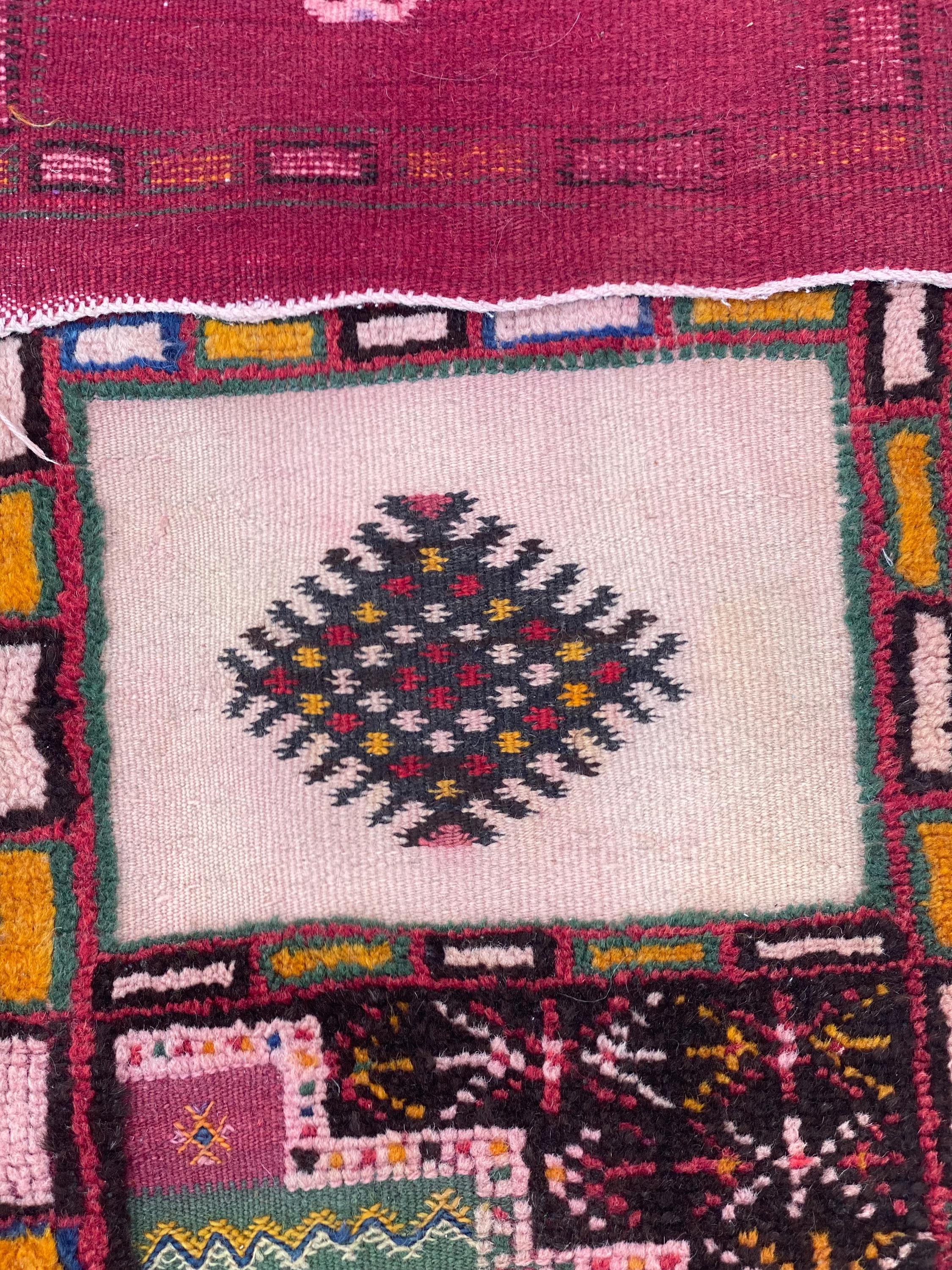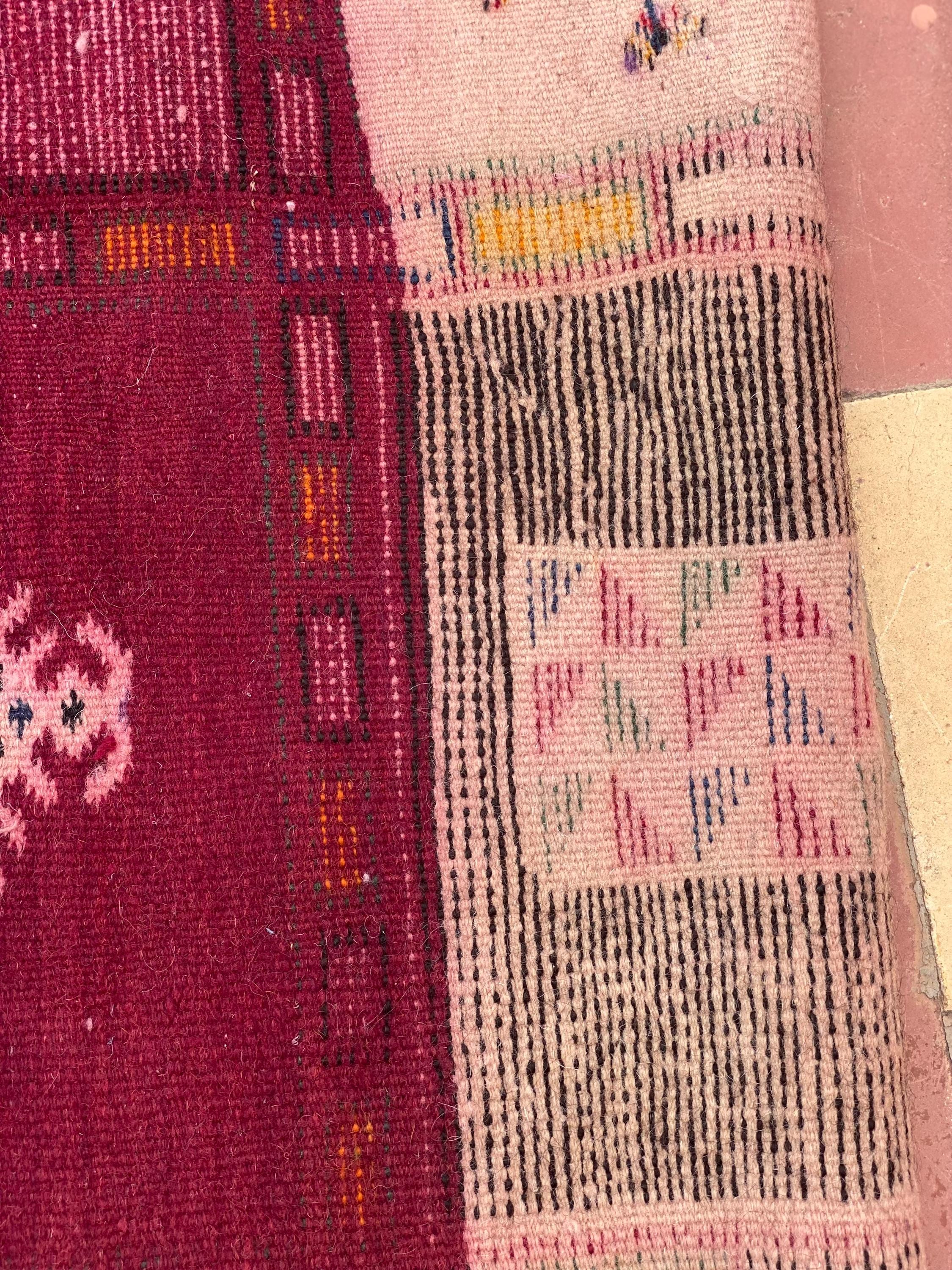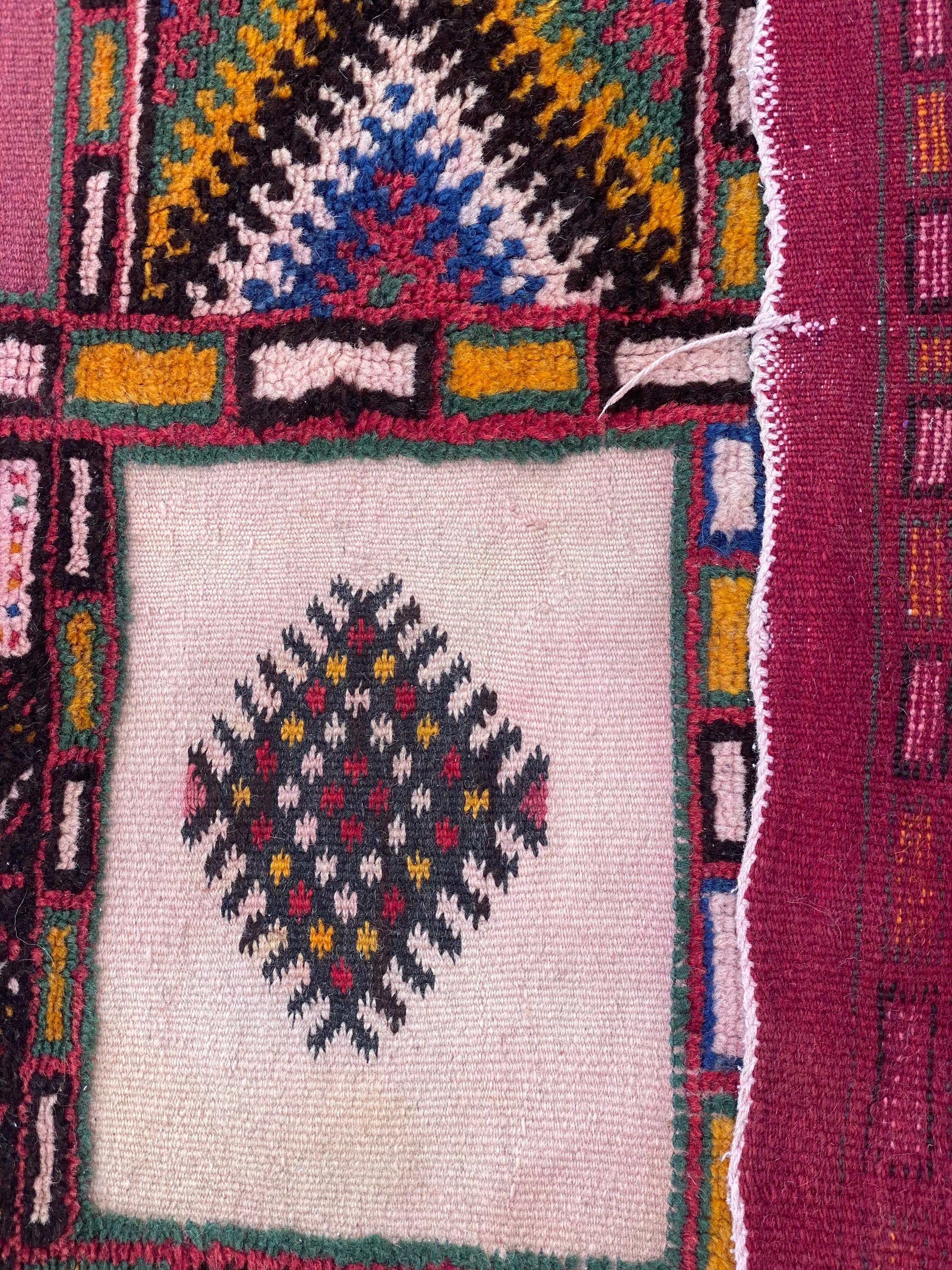Discover authentic Moroccan craftsmanship with this beautiful vintage Berber rug, handwoven in the year 2000 in the Sirwa region. This stunning patchwork runner features multiple traditional geometric patterns including checkerboard motifs, diamond symbols, and intricate star designs in a rich palette of burgundy, pink, green, cream, navy, and orange.