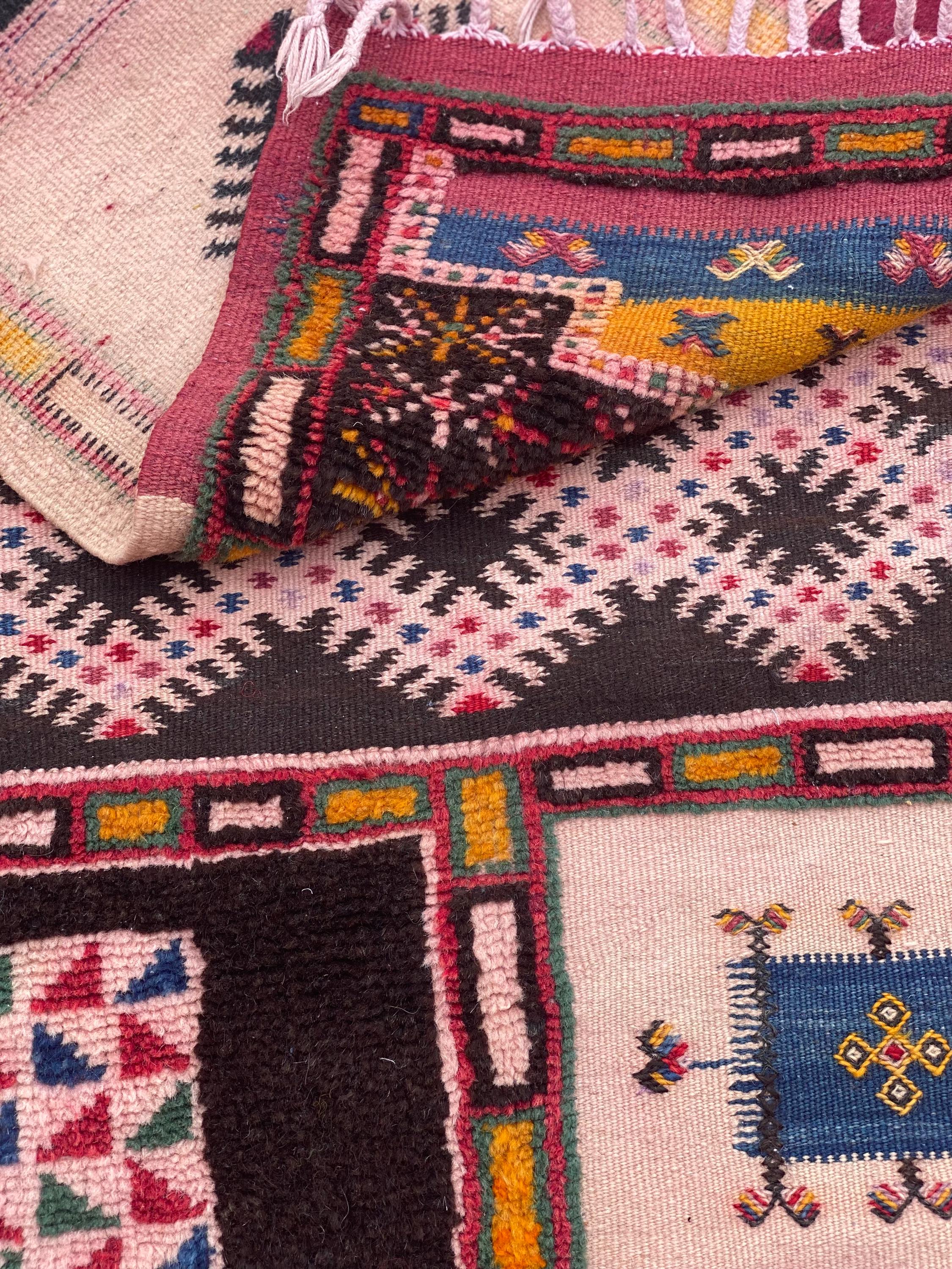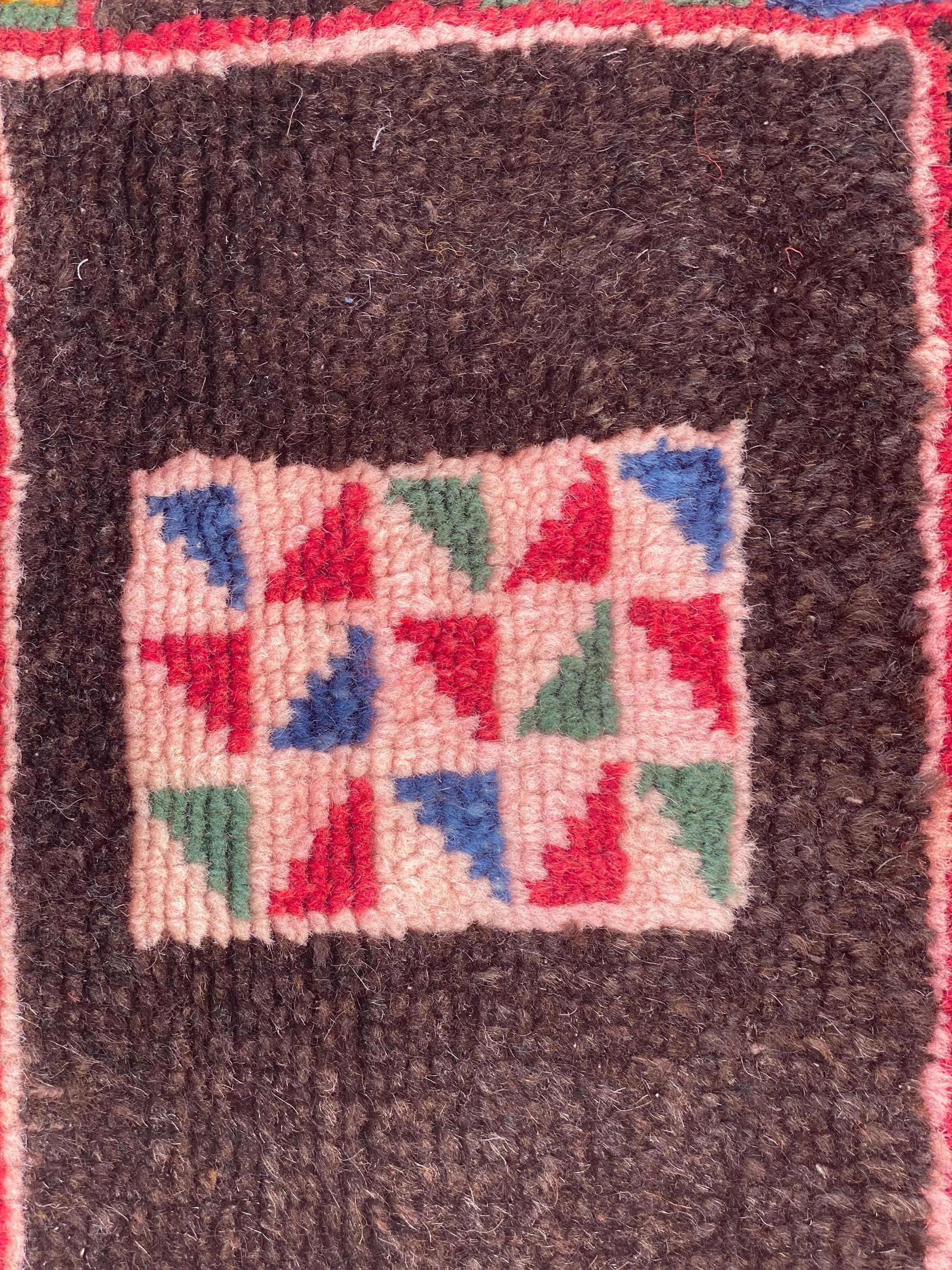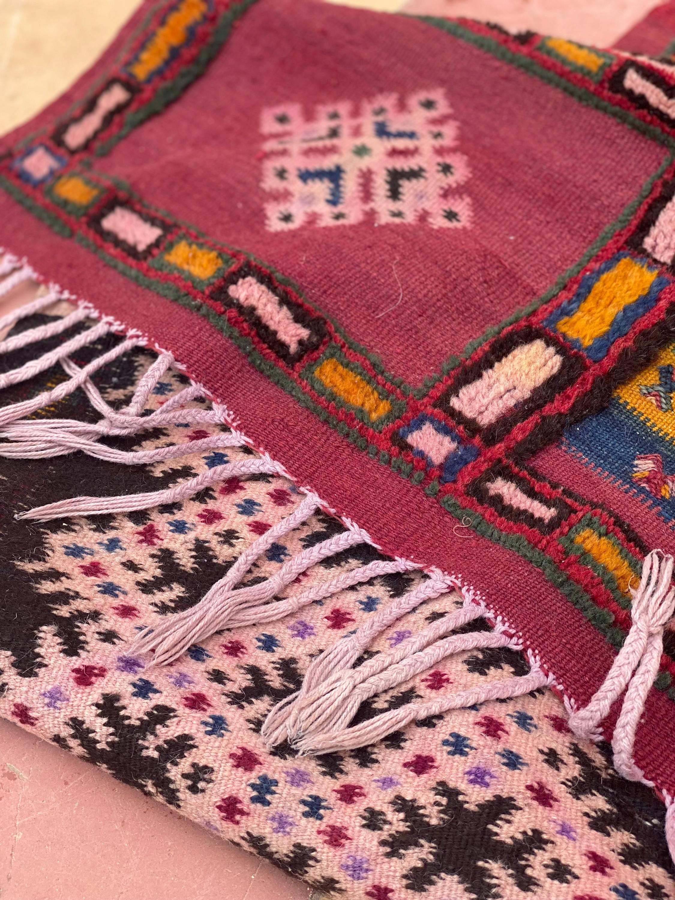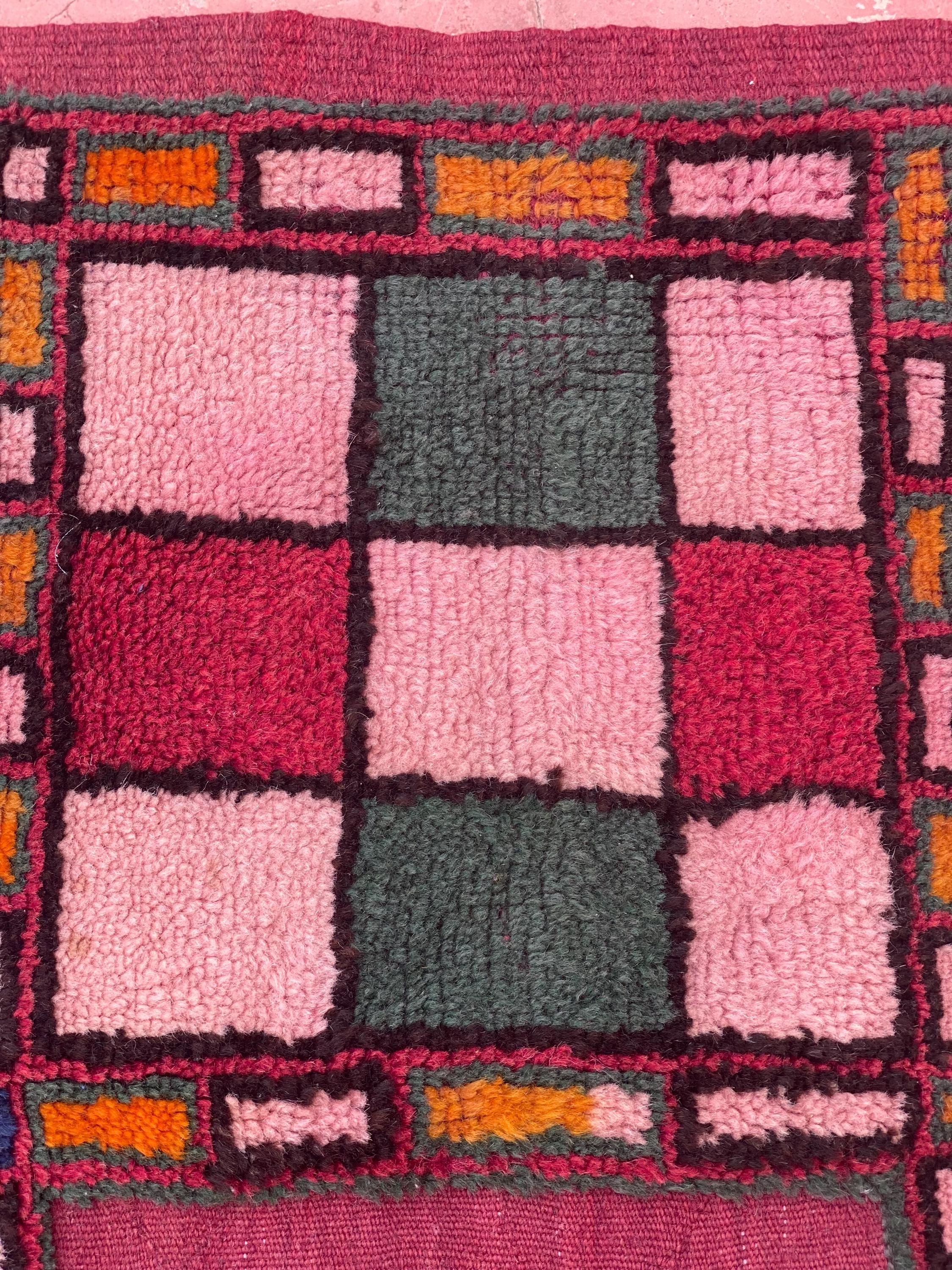Discover authentic Moroccan craftsmanship with this beautiful vintage Berber rug, handwoven in the year 2000 in the Sirwa region. This stunning patchwork runner features multiple traditional geometric patterns including checkerboard motifs, diamond symbols, and intricate star designs in a rich palette of burgundy, pink, green, cream, navy, and orange.