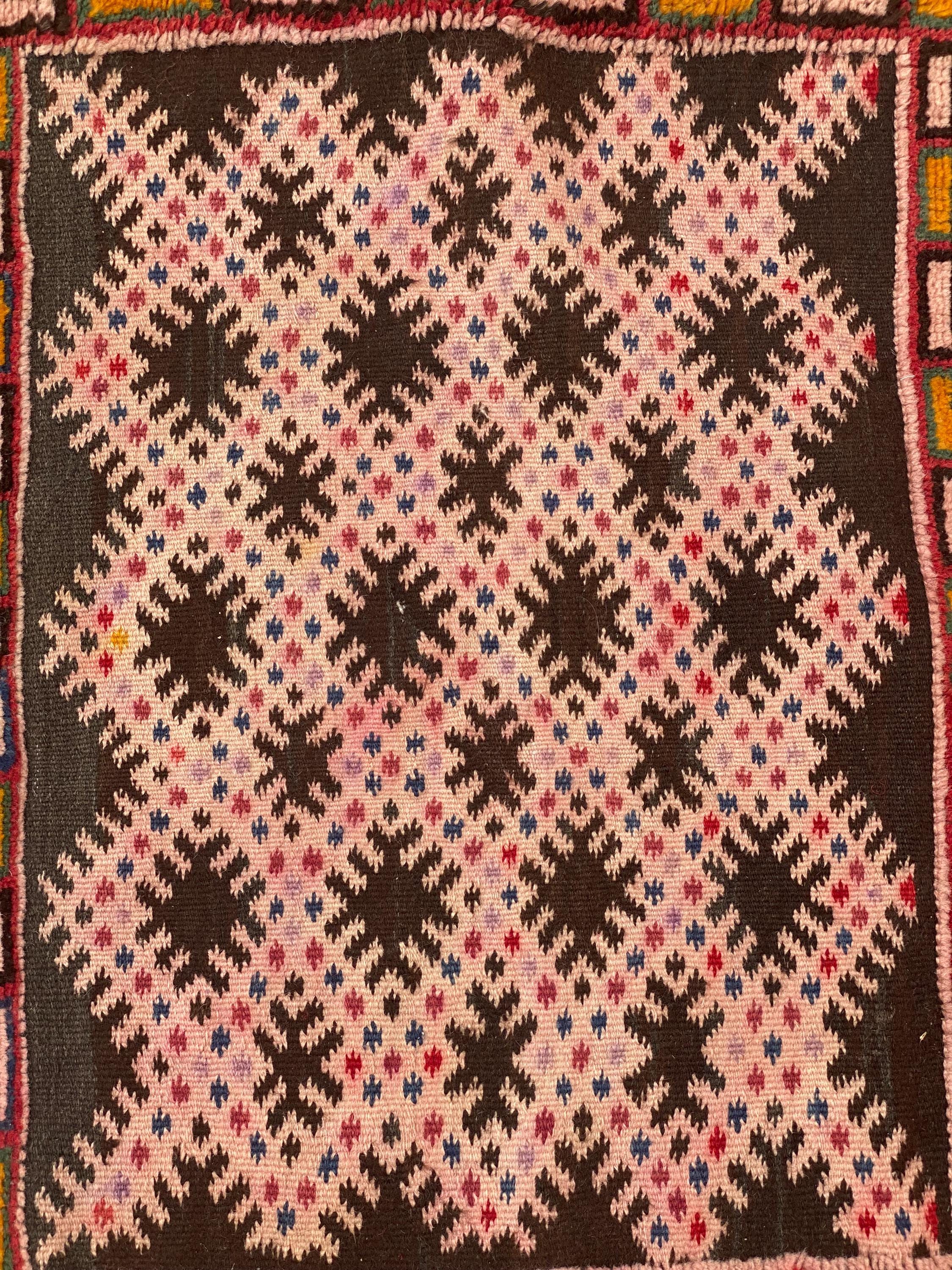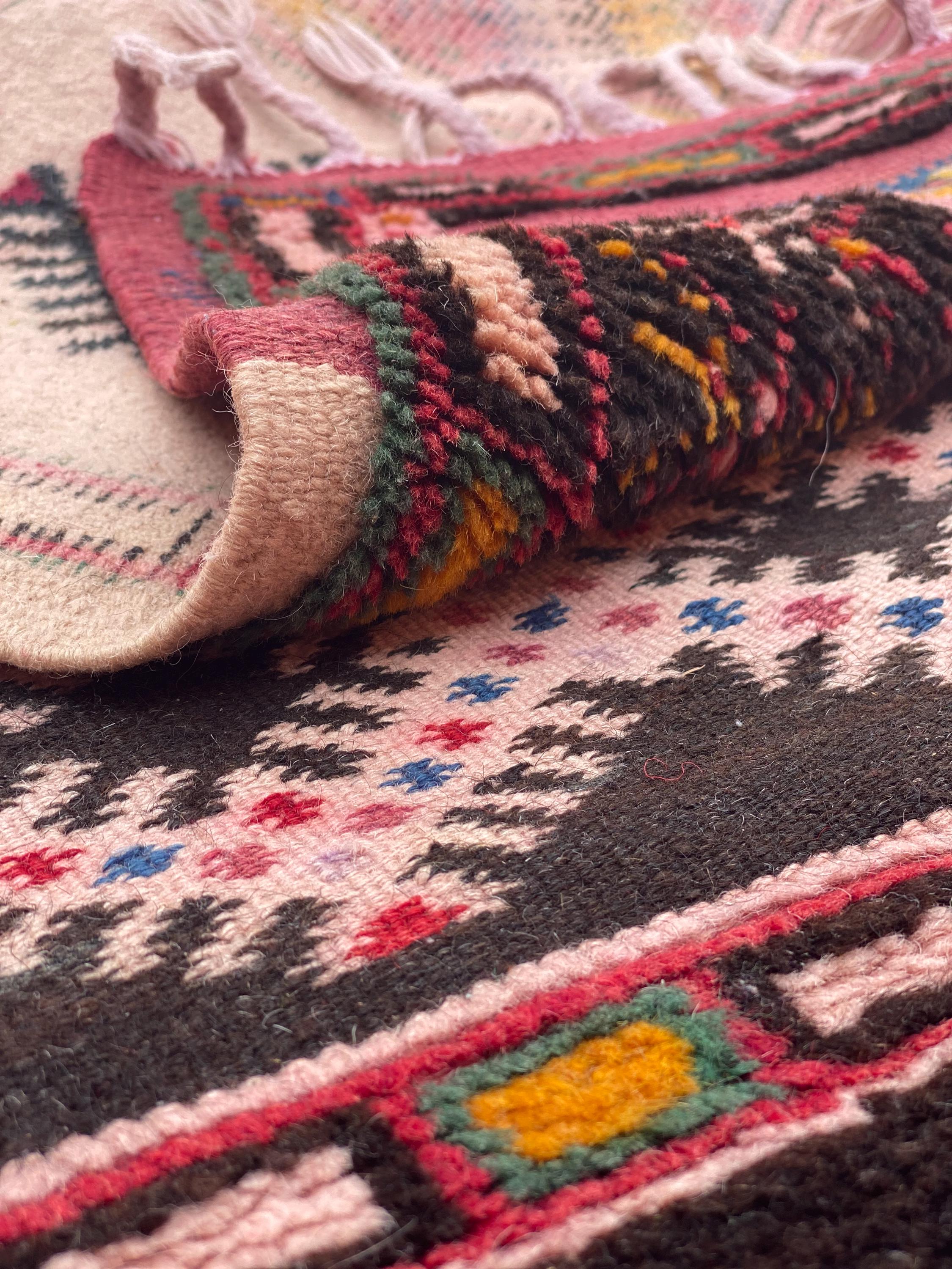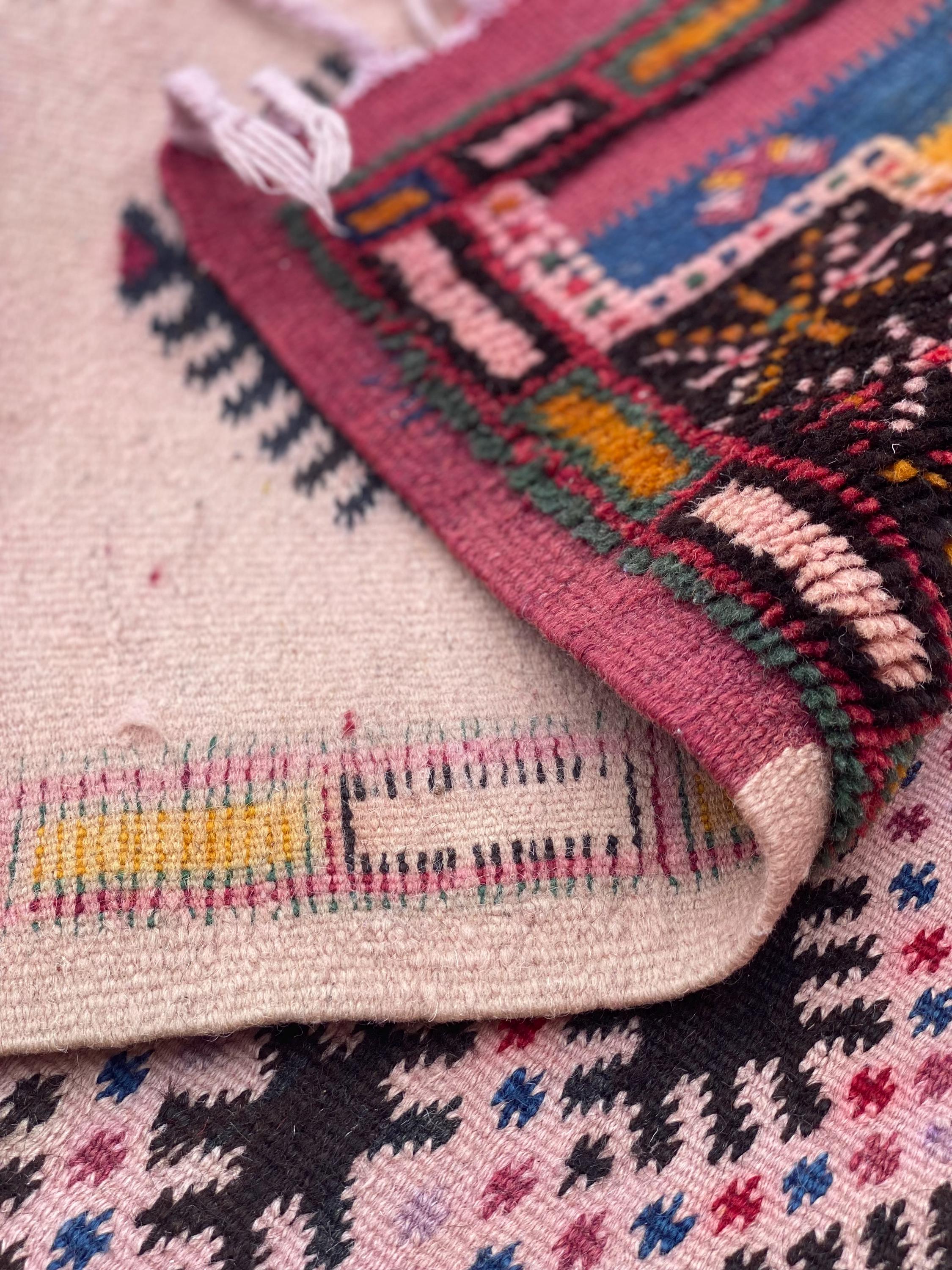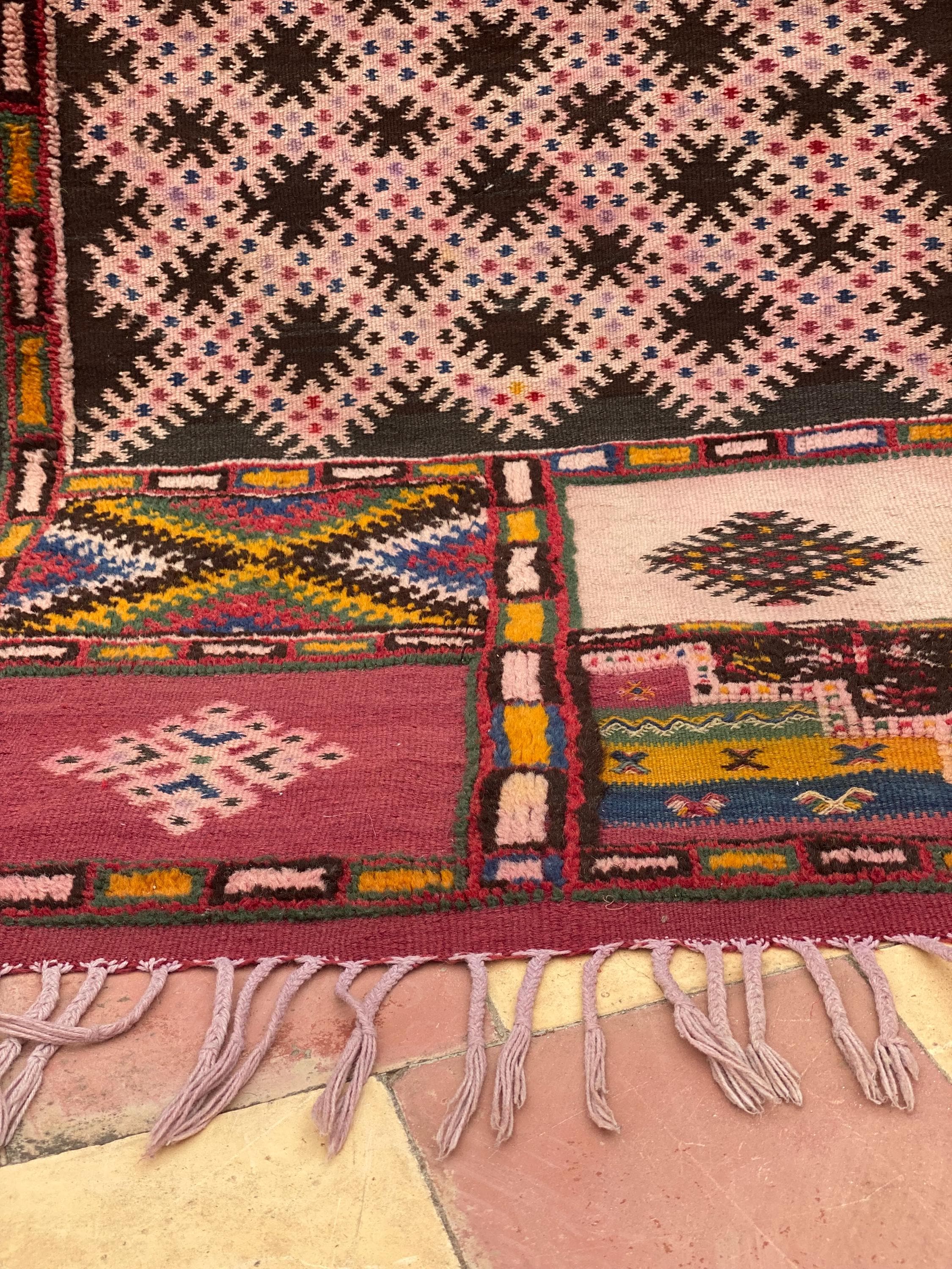 Discover authentic Moroccan craftsmanship with this beautiful vintage Berber rug, handwoven in the year 2000 in the Sirwa region. This stunning patchwork runner features multiple traditional geometric patterns including checkerboard motifs, diamond symbols, and intricate star designs in a rich palette of burgundy, pink, green, cream, navy, and orange.