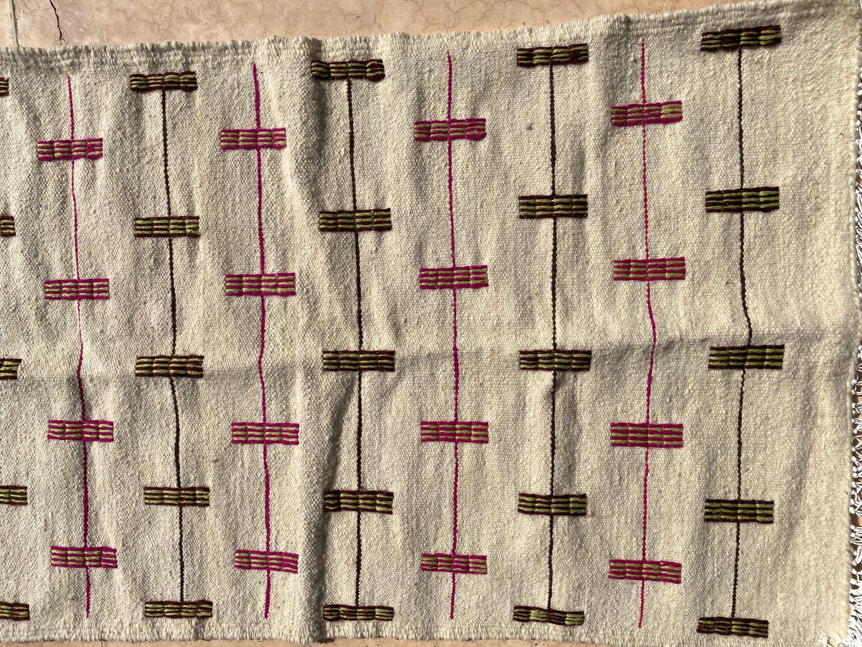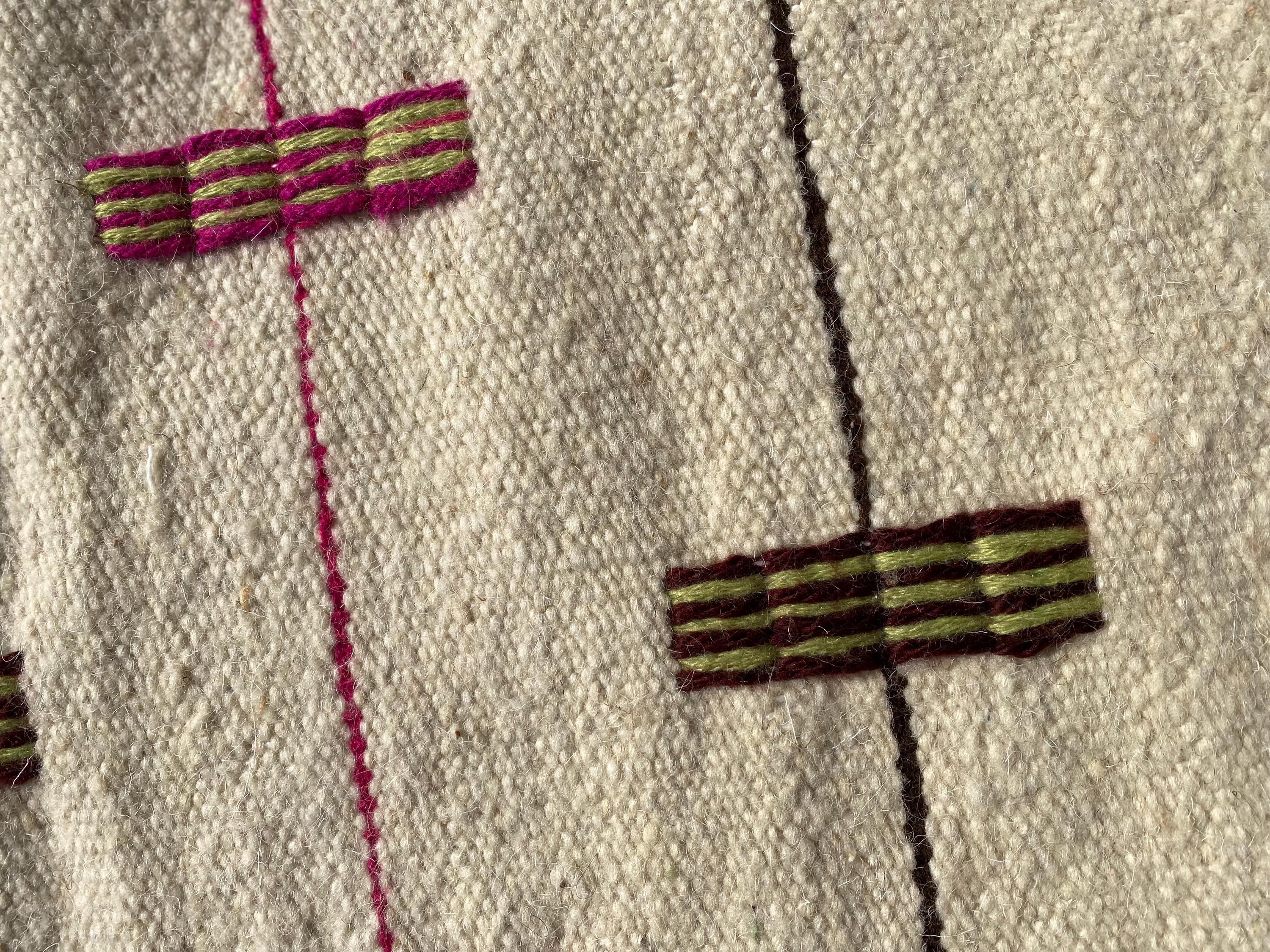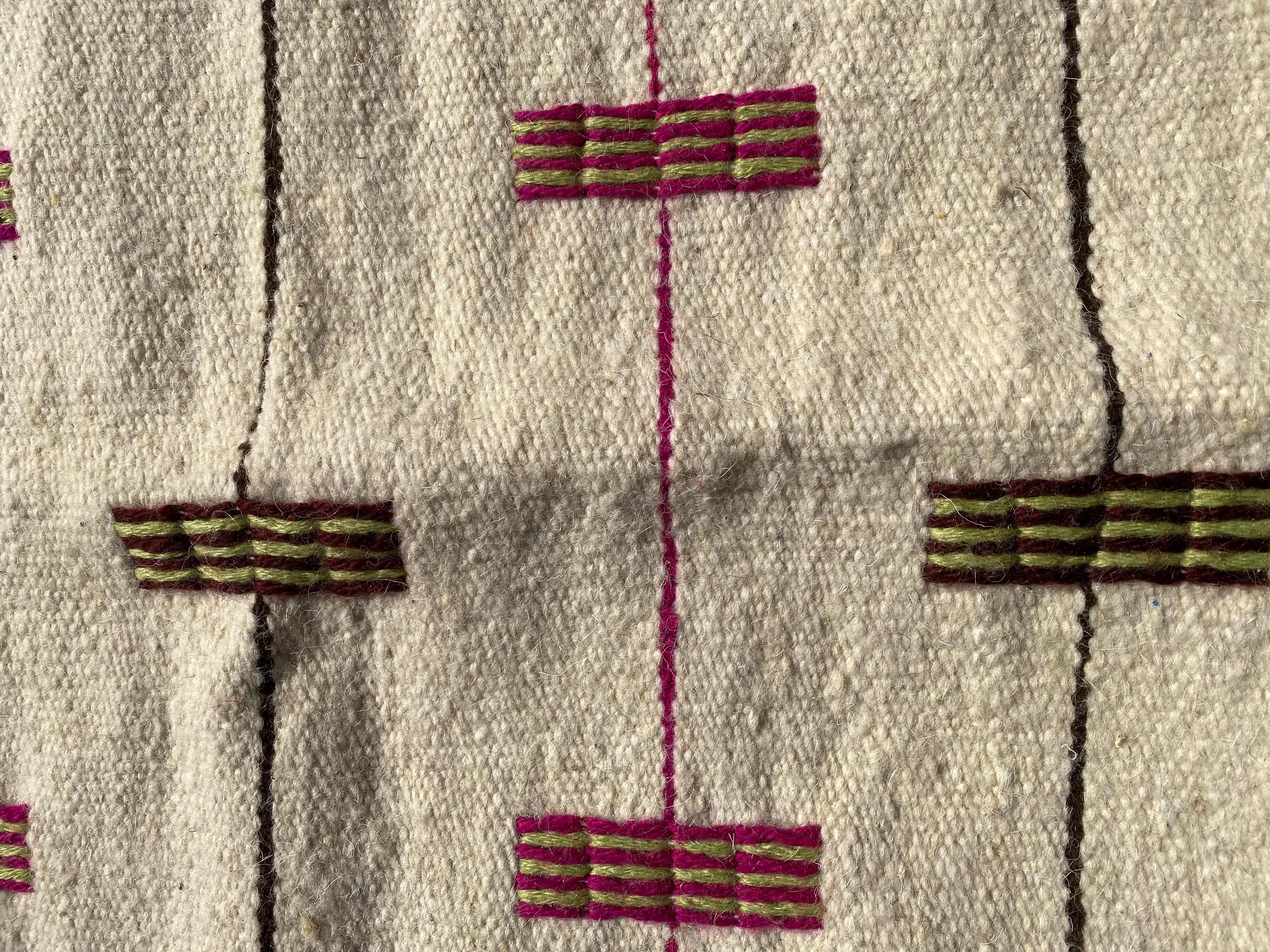 This authentic Berber flat-weave showcases alternating rows of pink/magenta and brown motifs with olive green accents on a natural cream background.