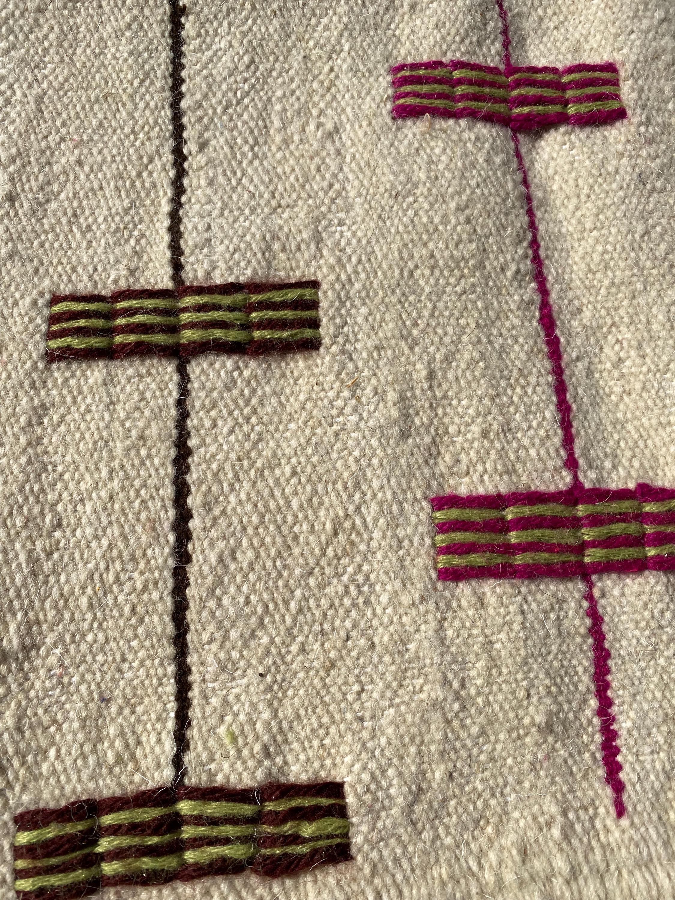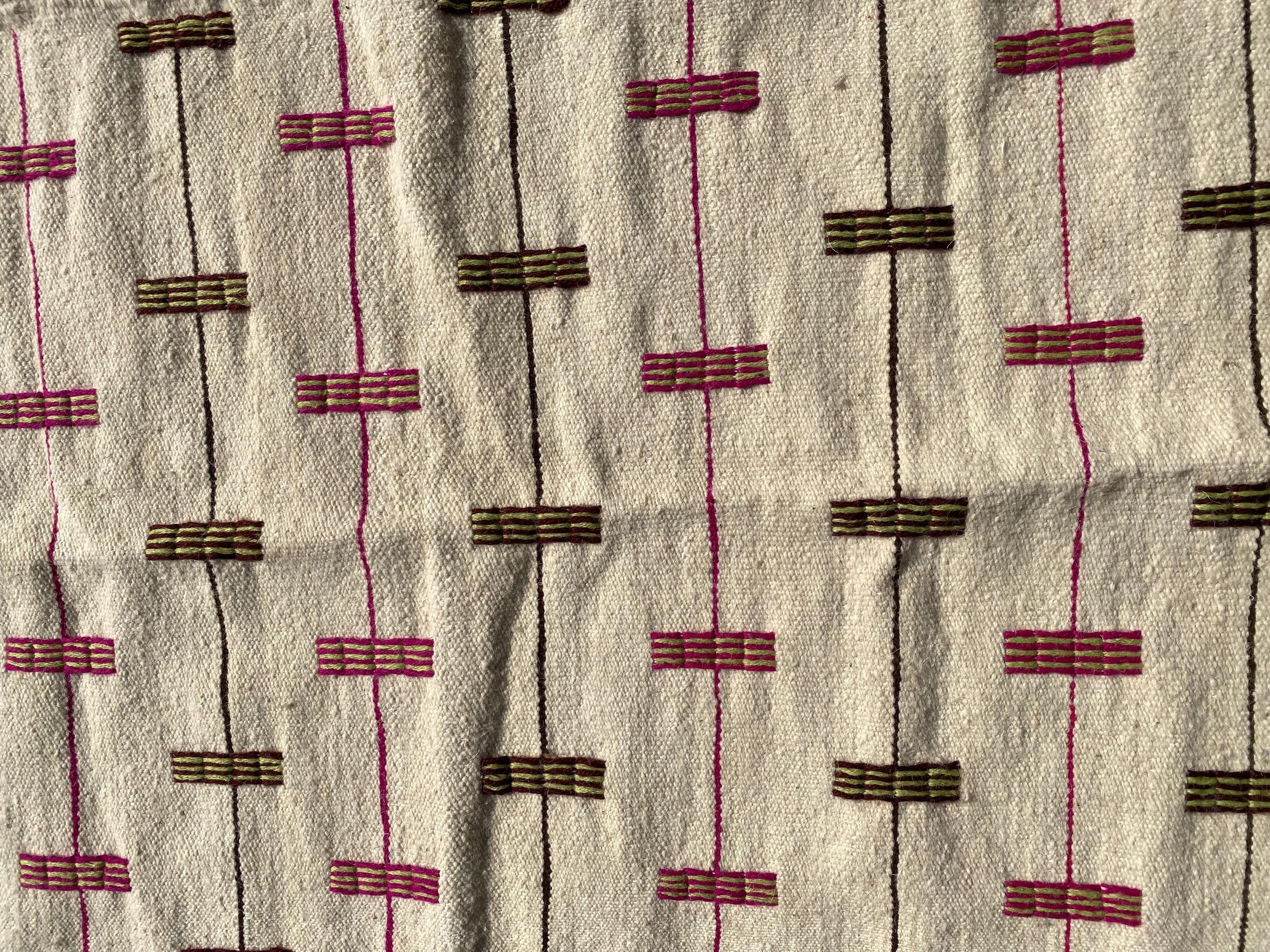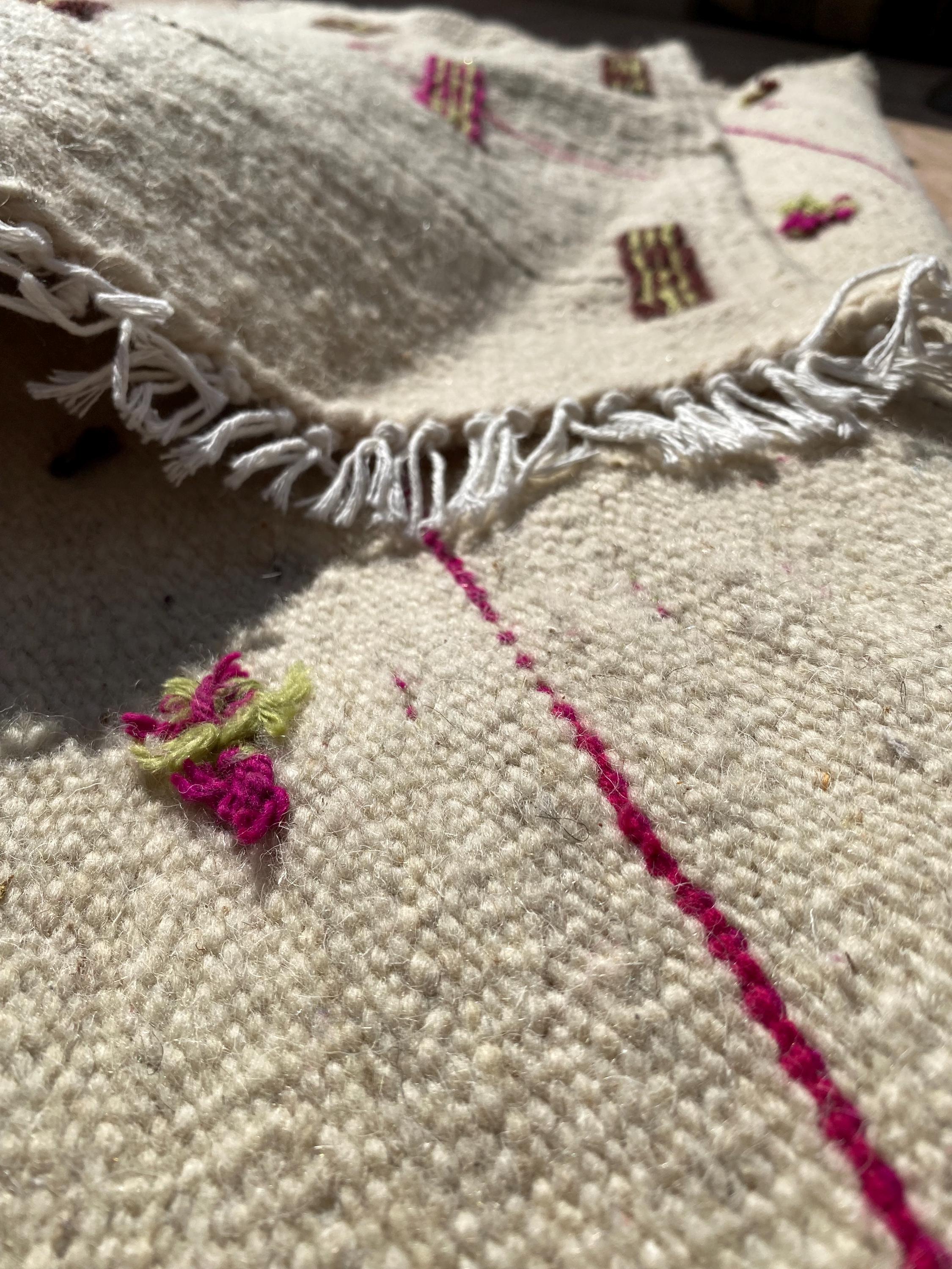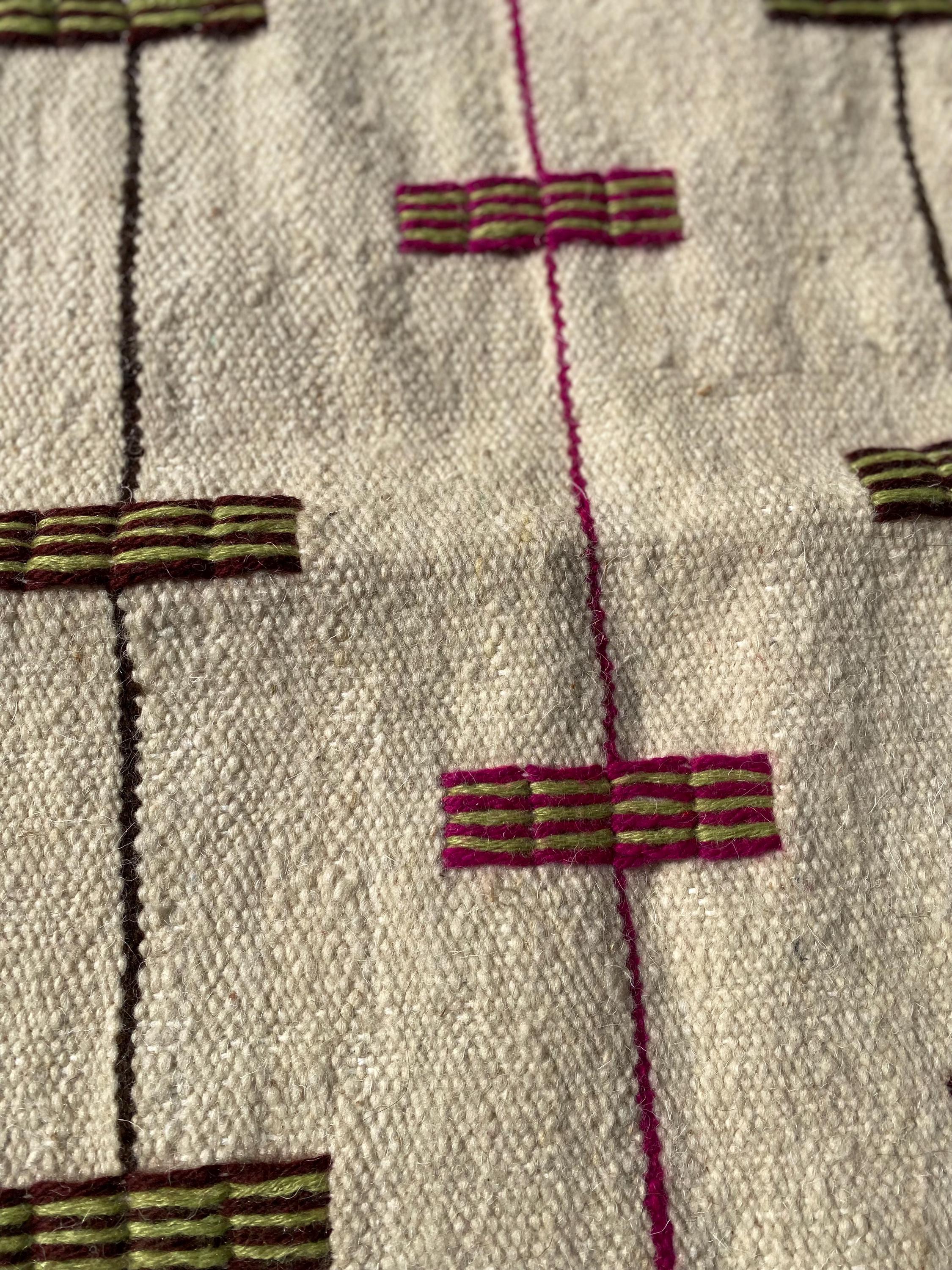 This authentic Berber flat-weave showcases alternating rows of pink/magenta and brown motifs with olive green accents on a natural cream background.