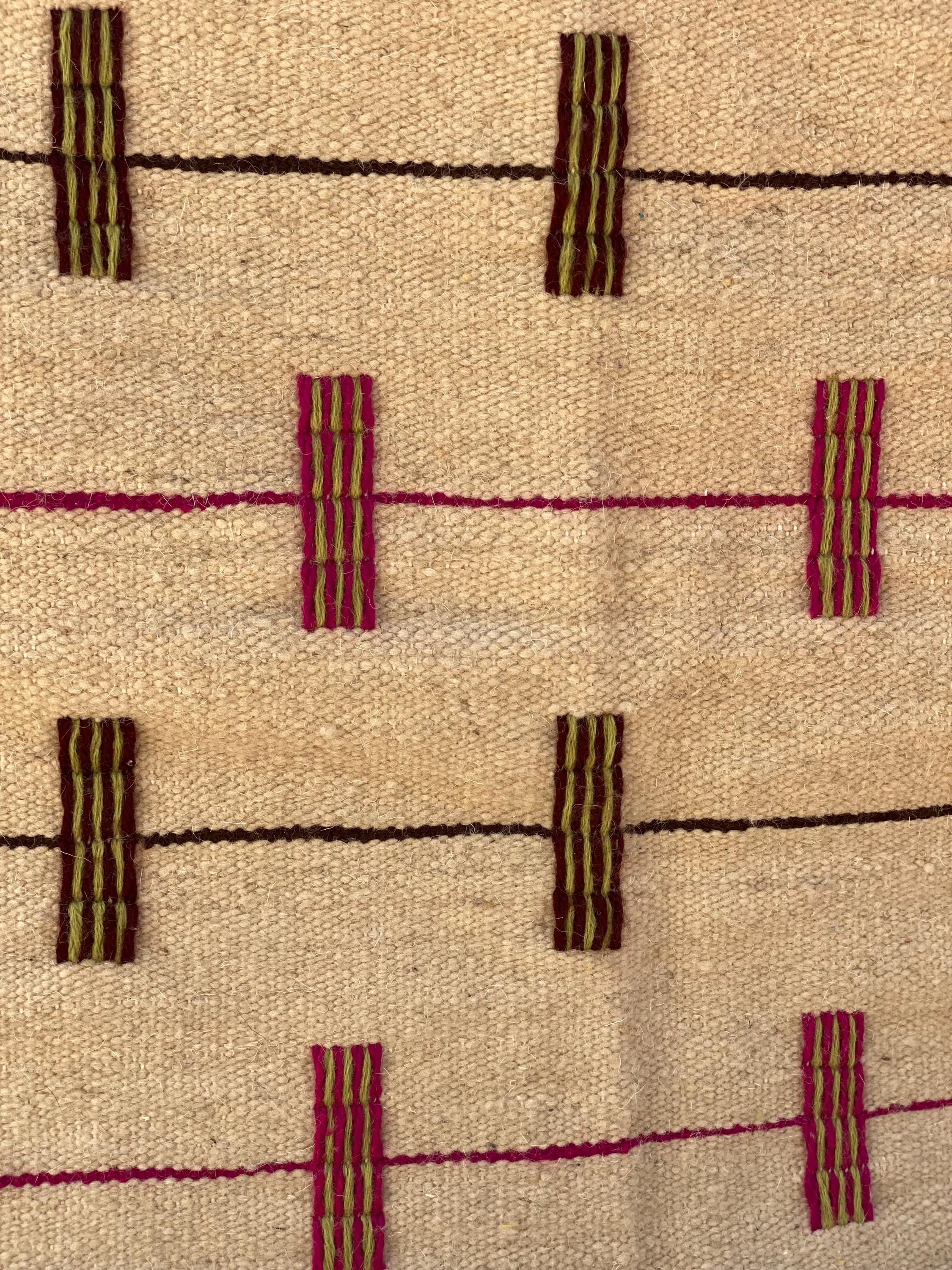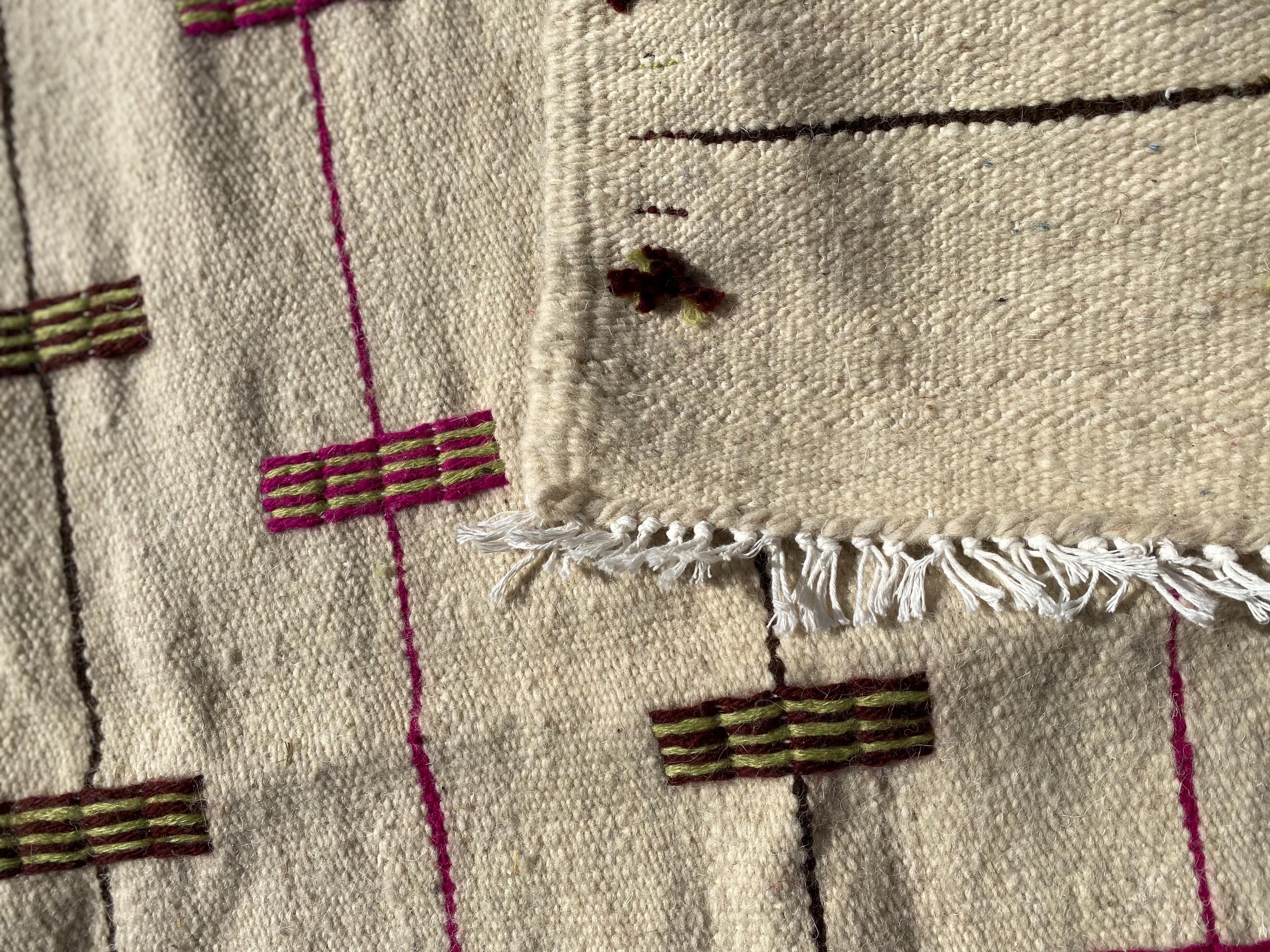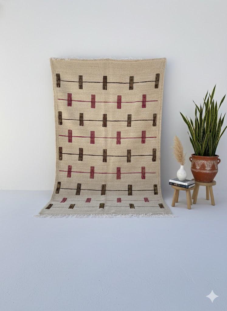 Elevate your space with this stunning handwoven Moroccan kilim rug featuring a minimalist geometric design.