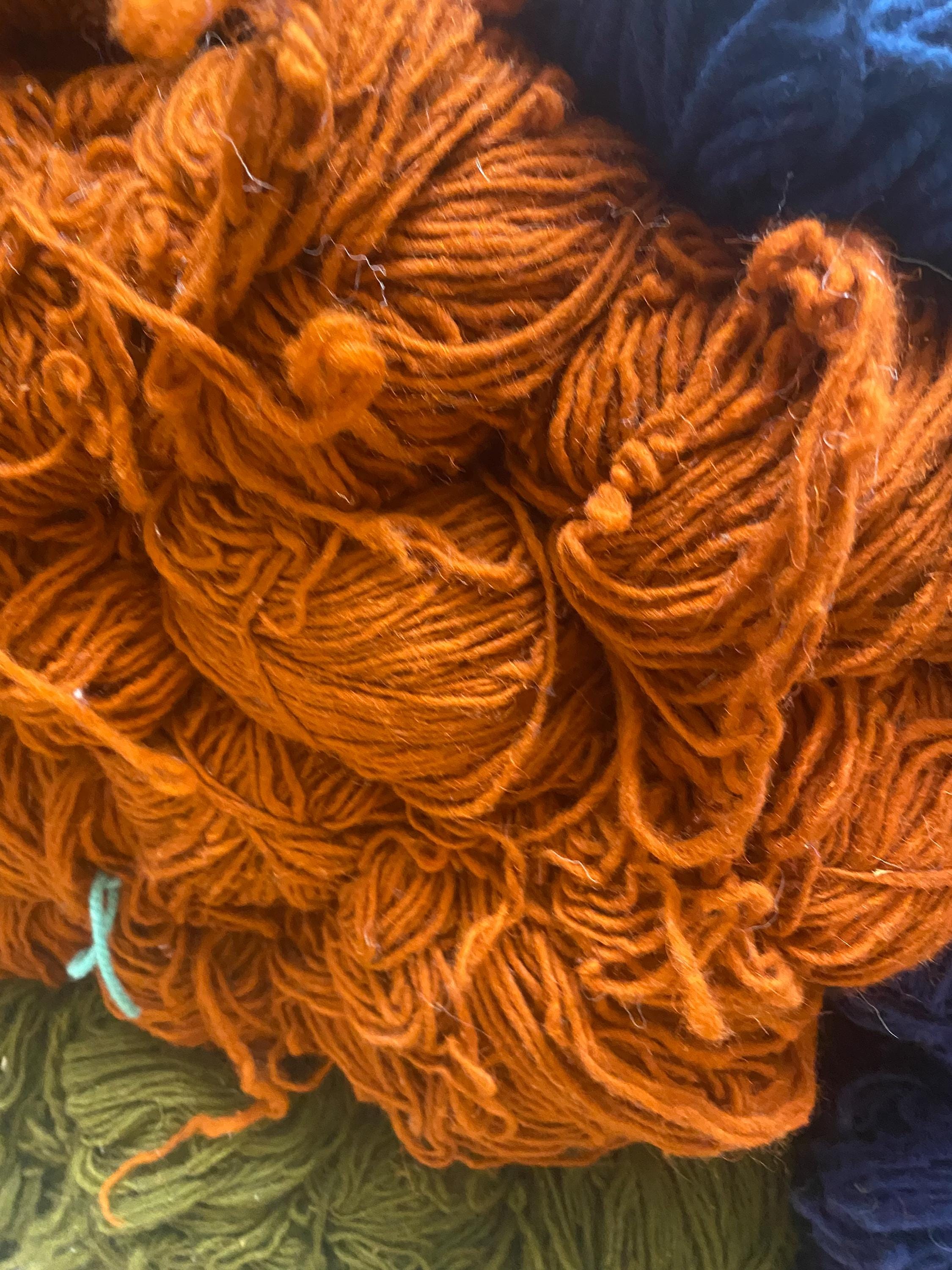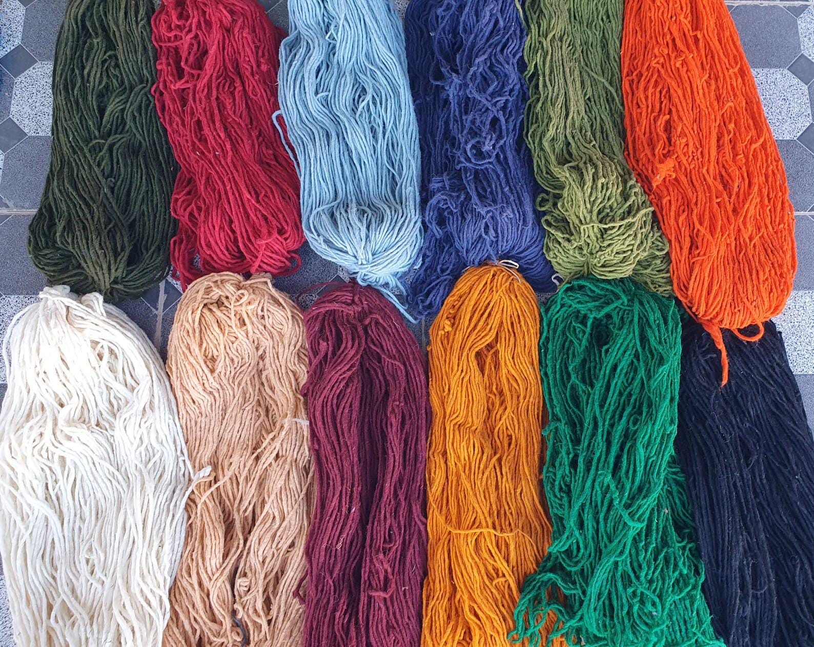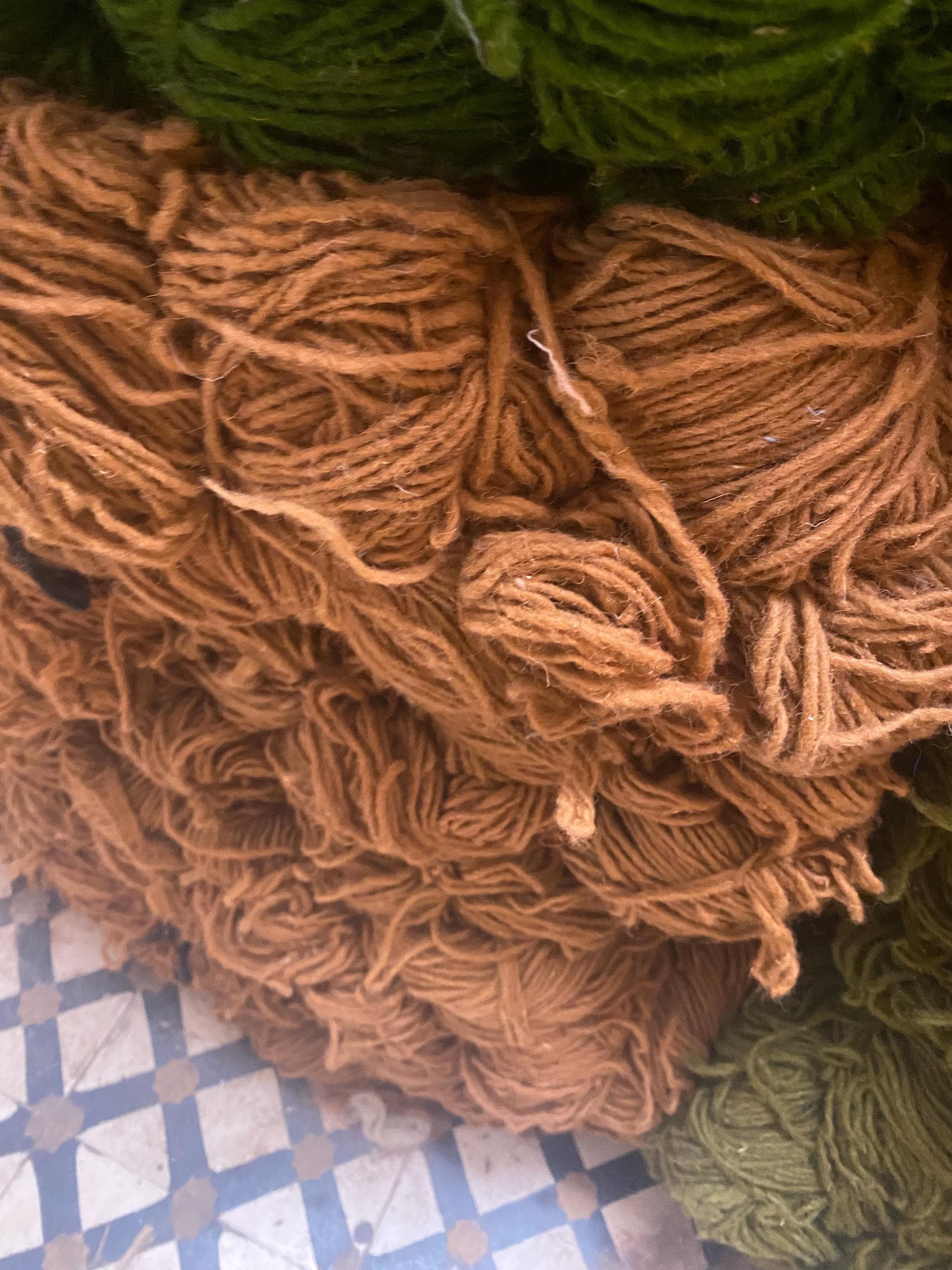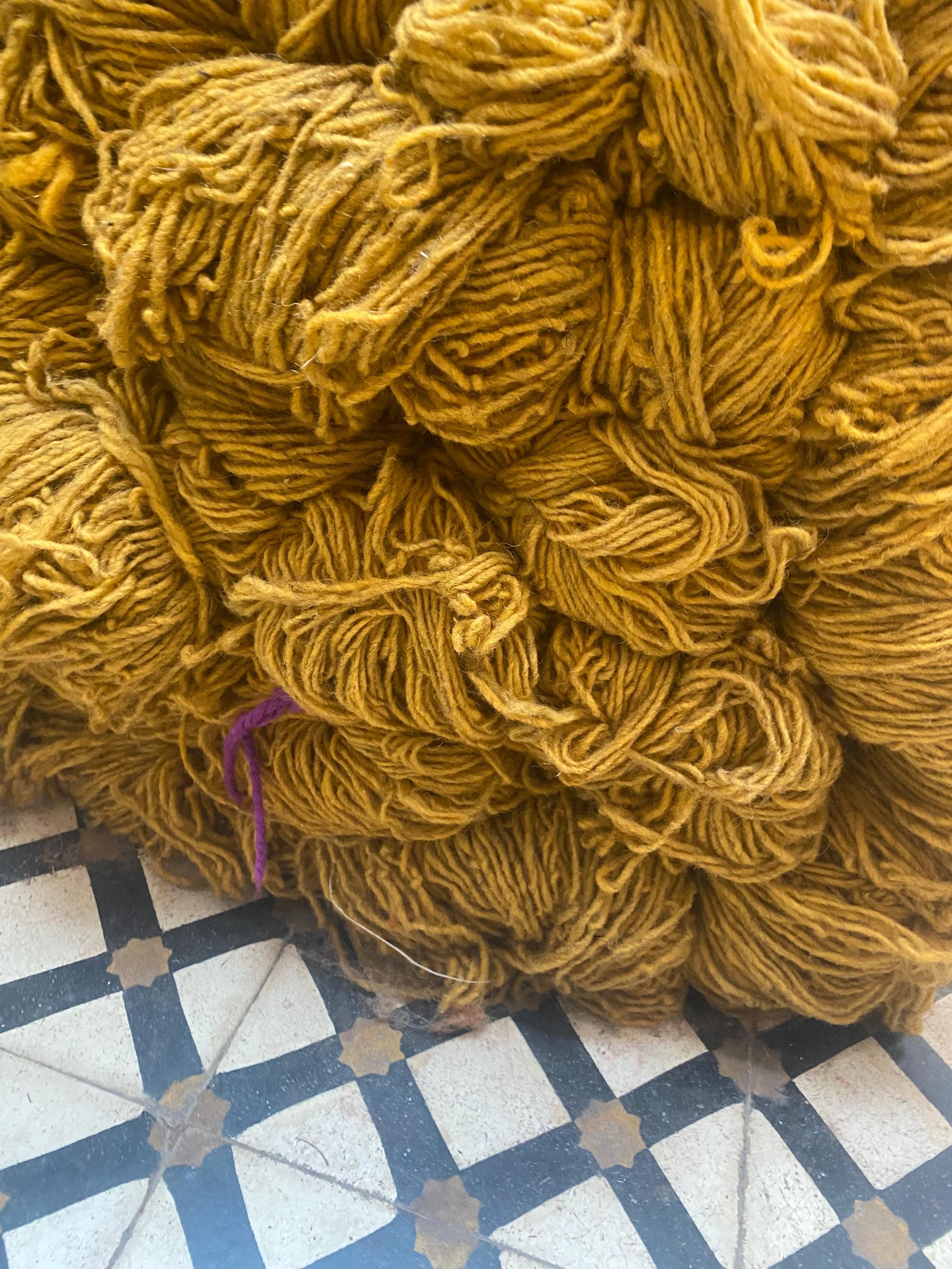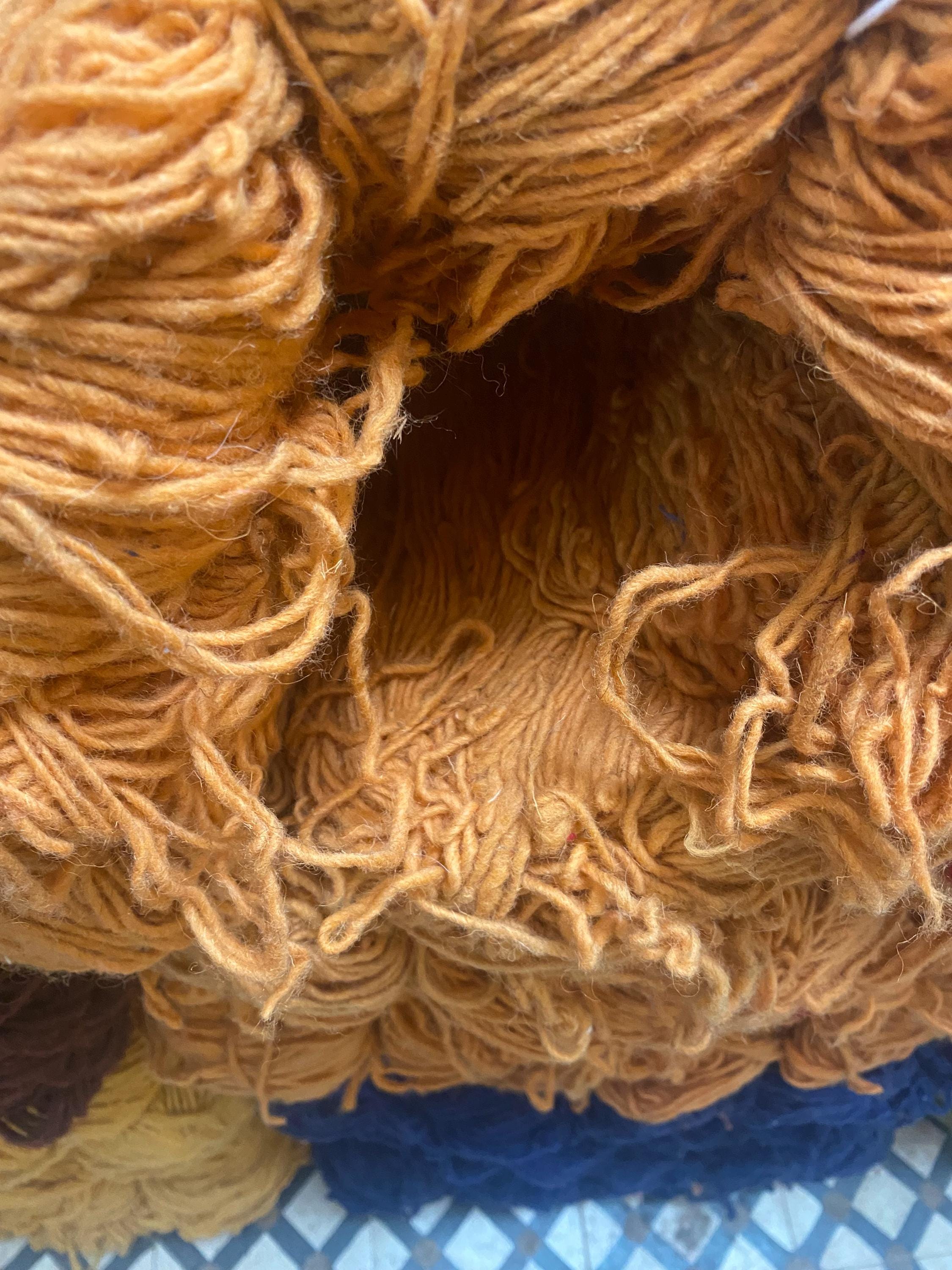 Natural Moroccan wool yarn prepared using traditional methods and suitable for rug weaving, tapestry and textile projects.