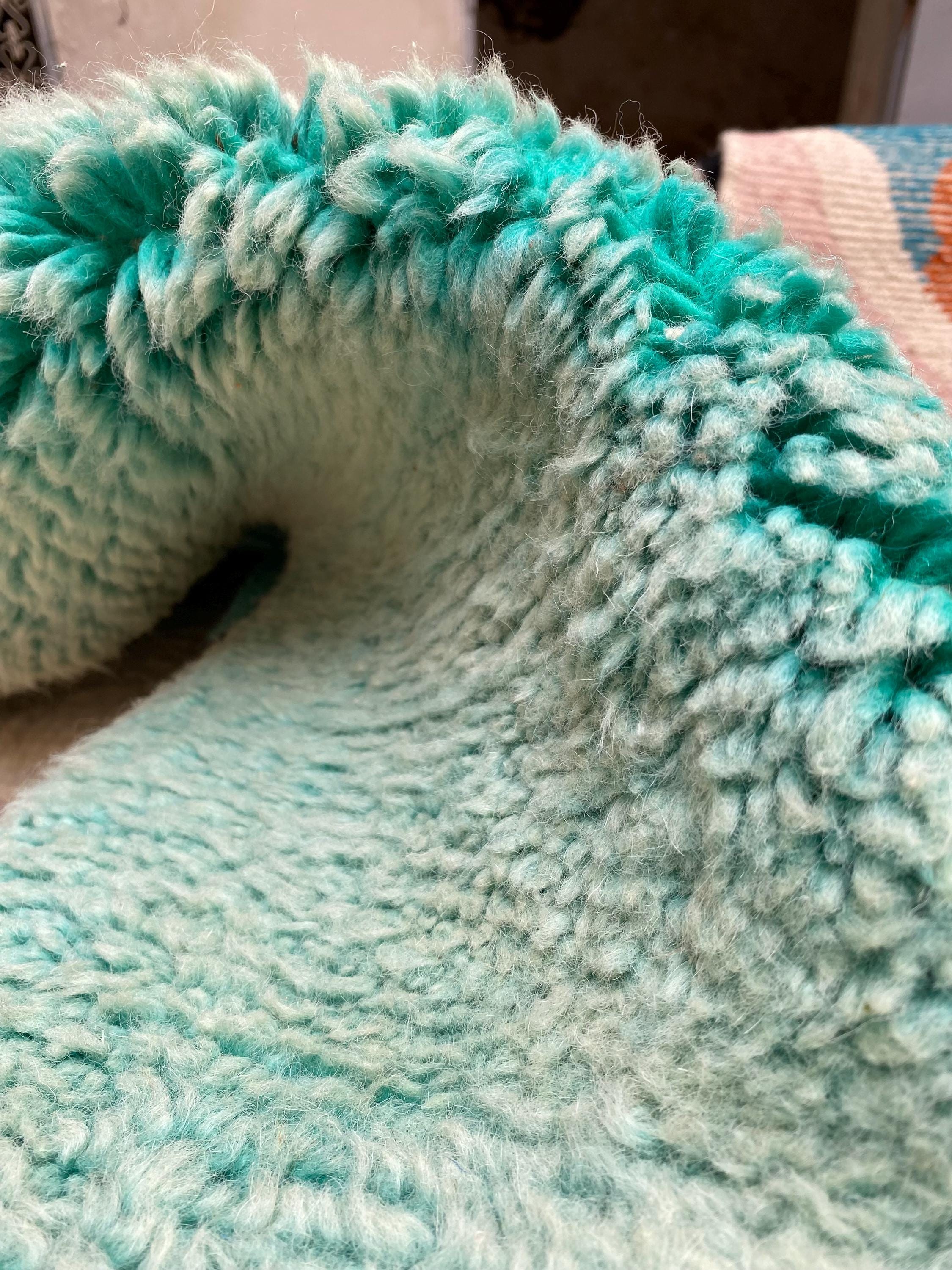 The high, plush pile is pure soft wool, sheared by hand and tied knot by knot on a traditional loom. No two rugs are ever identical — slight variations in the wool and dye are not flaws, they are the fingerprint of the maker.
