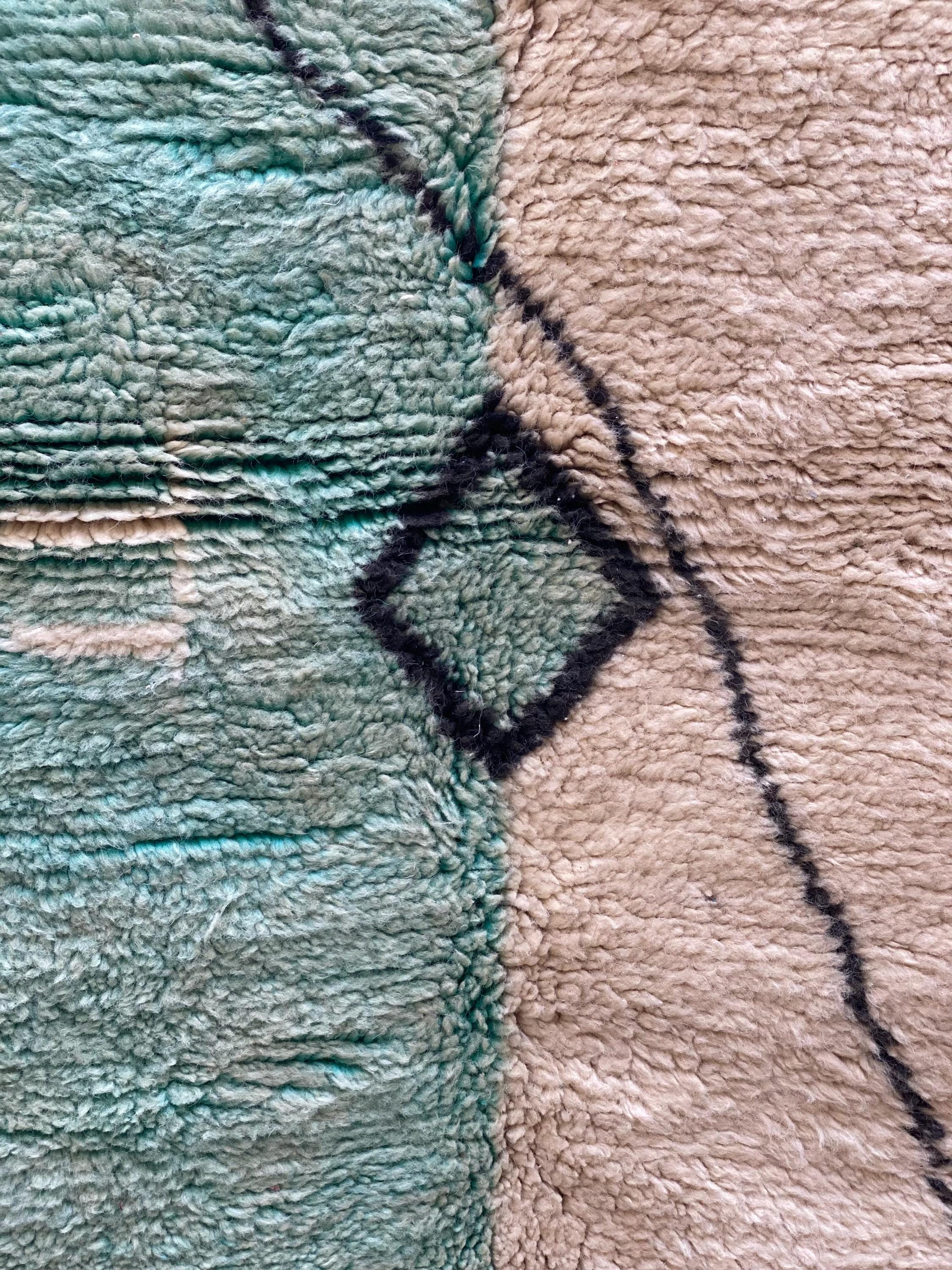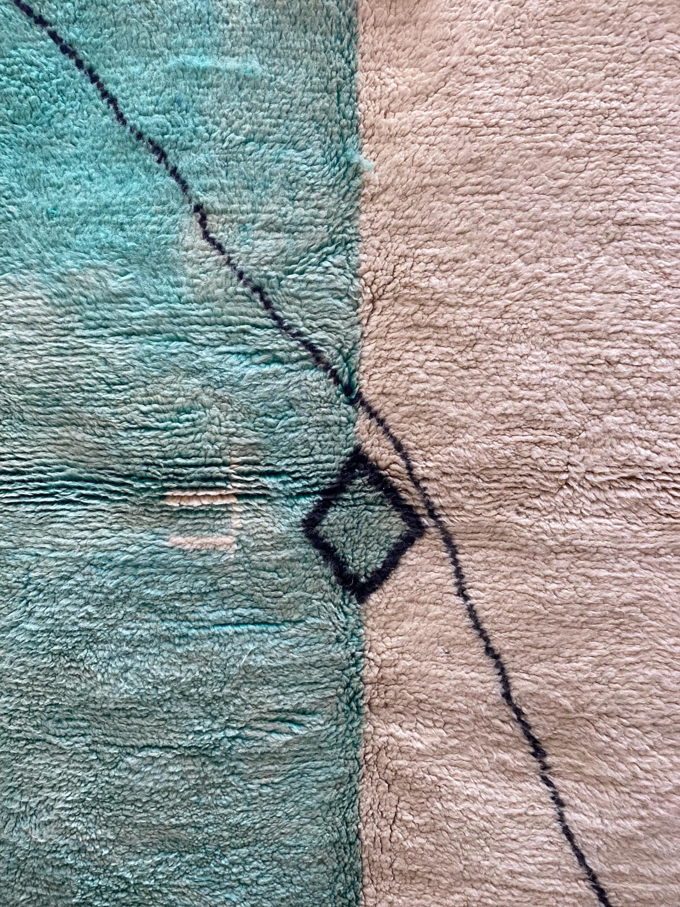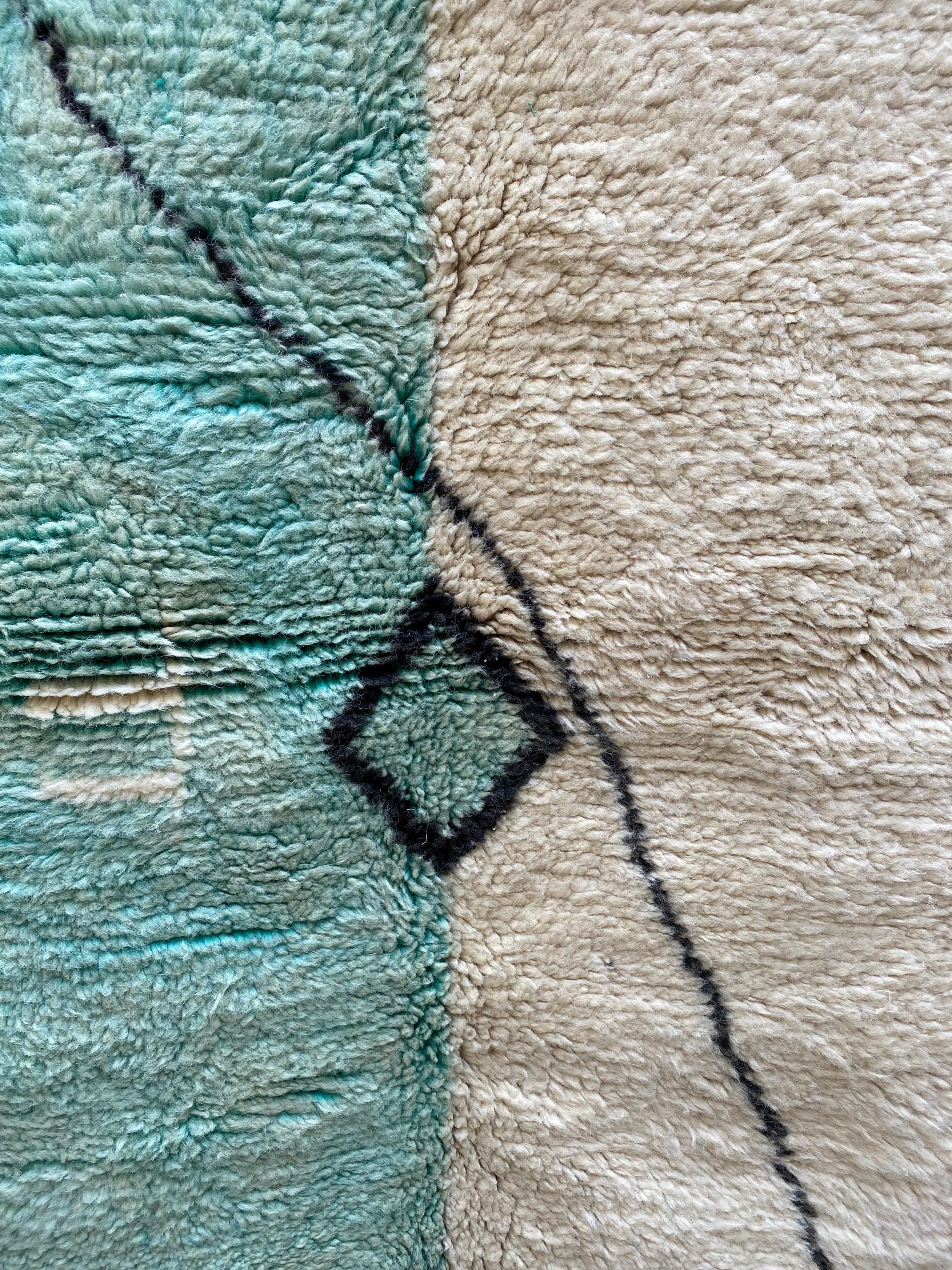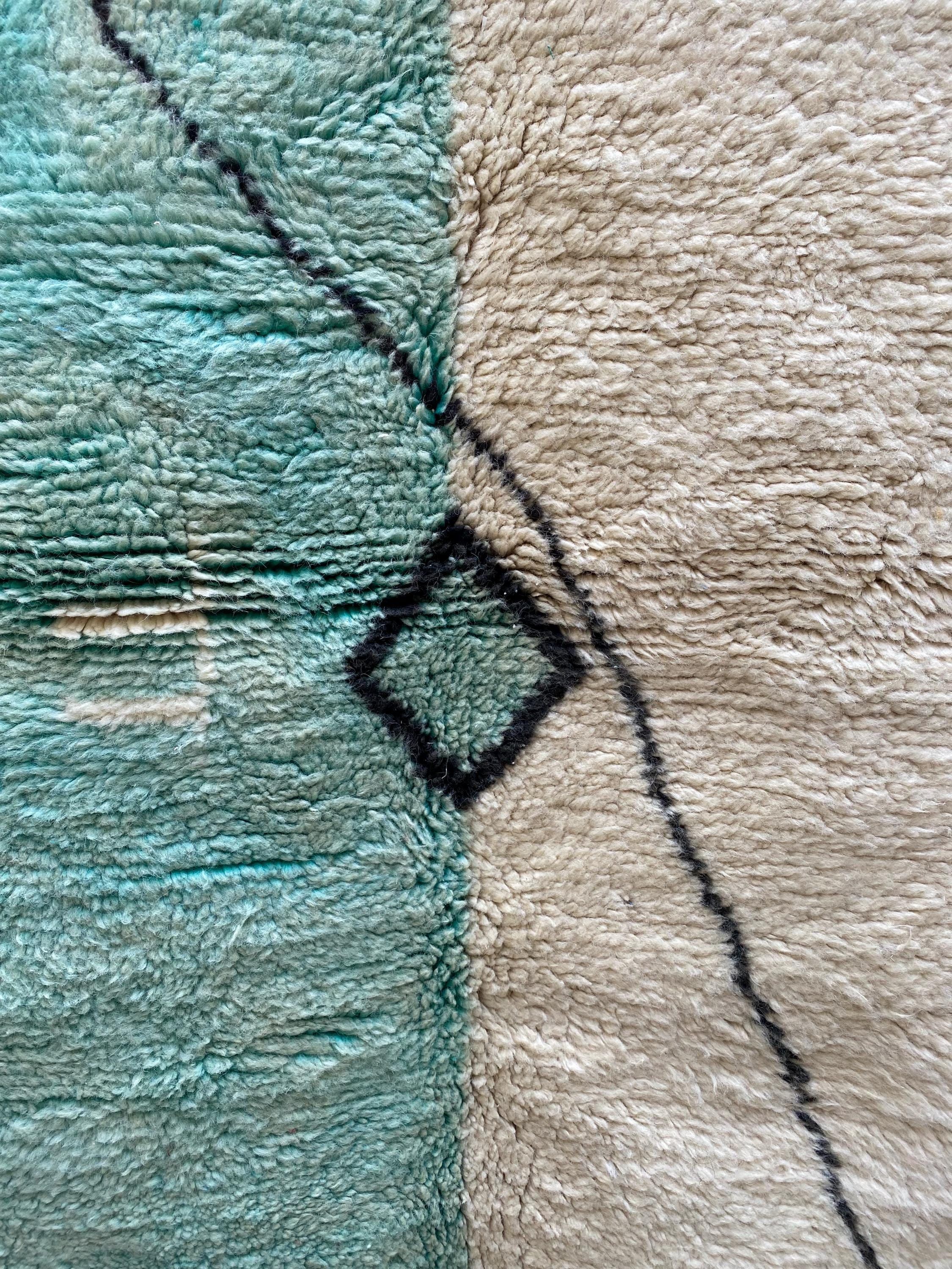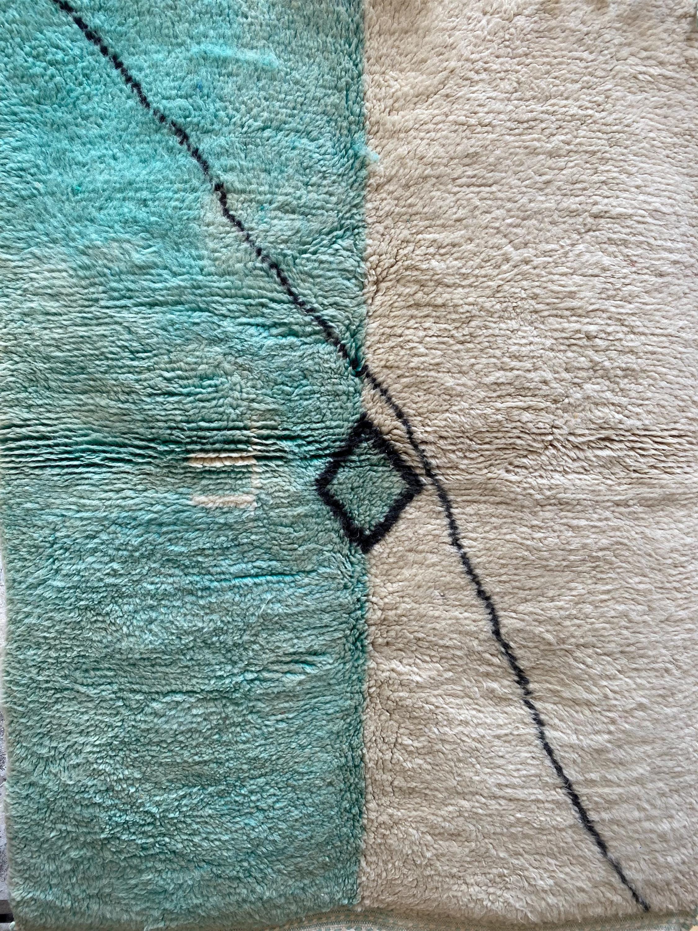 Crafted by Berber artisans in the highlands of Morocco, this stunning hand-knotted rug brings the soul of the Atlas Mountains directly into your home. Split in two equal fields — a dreamy minty teal on one side and a warm natural ivory on the other — the design is anchored by a single bold diamond motif and two sweeping diagonal lines in deep charcoal. Simple, graphic, unforgettable.
