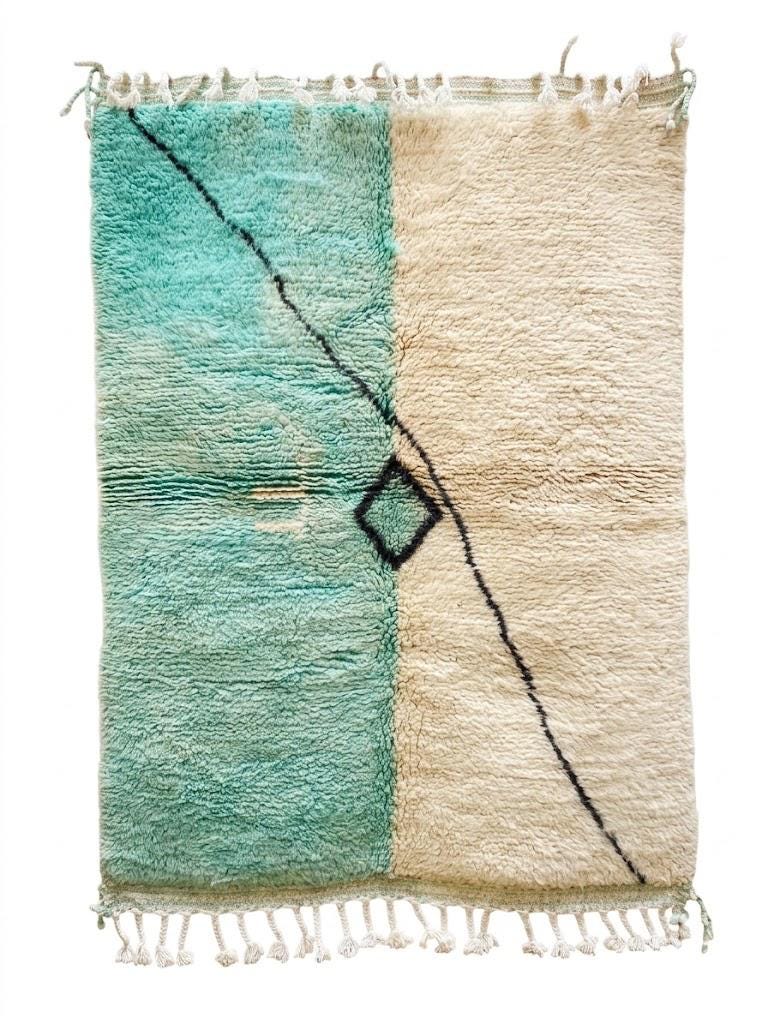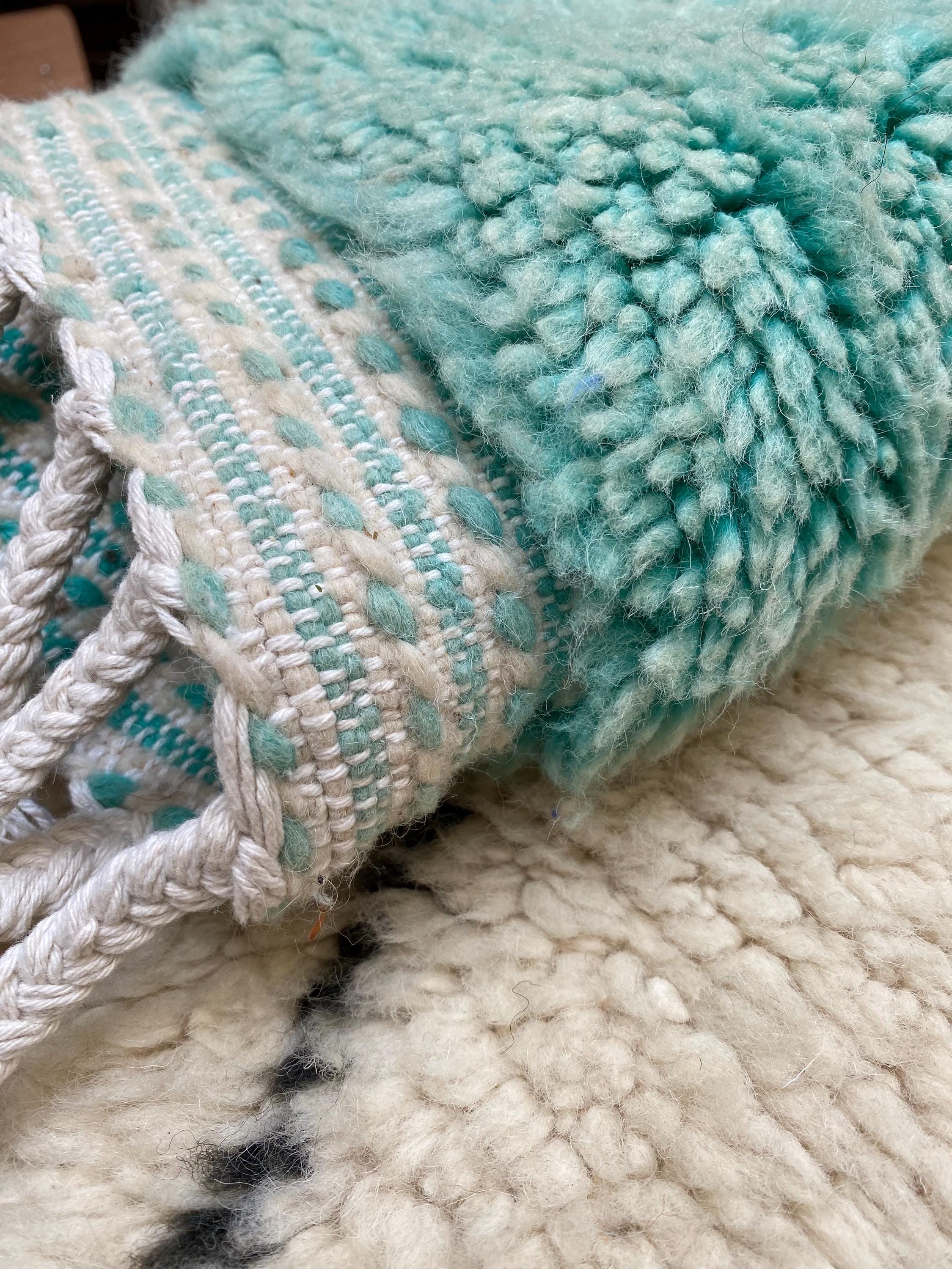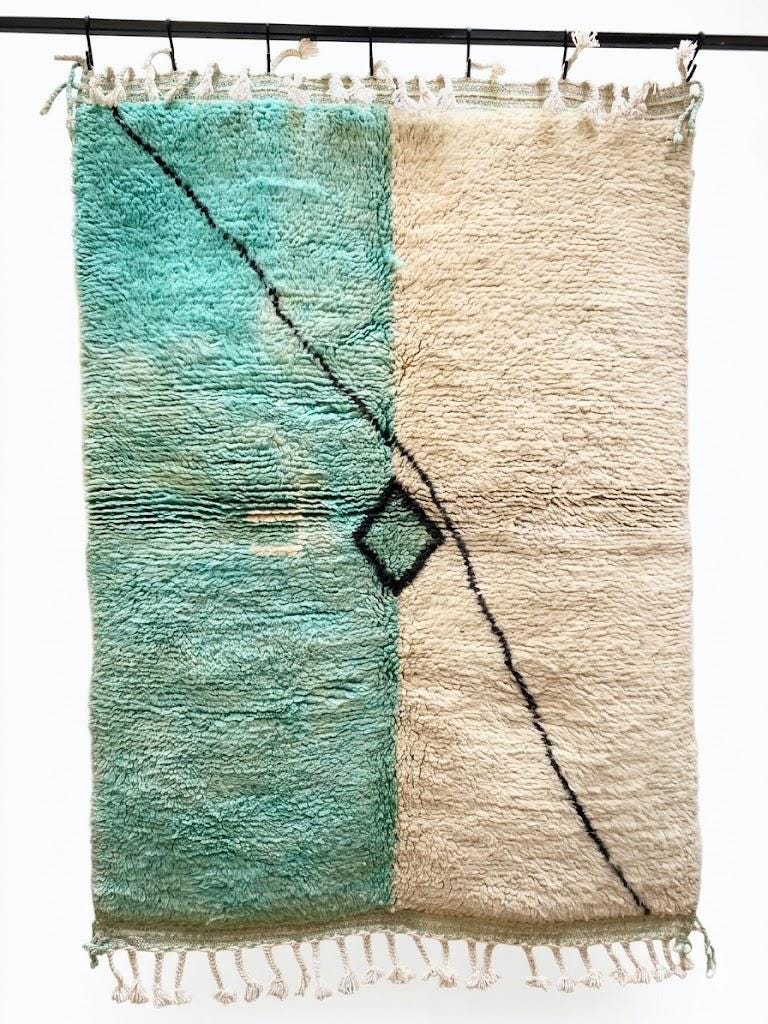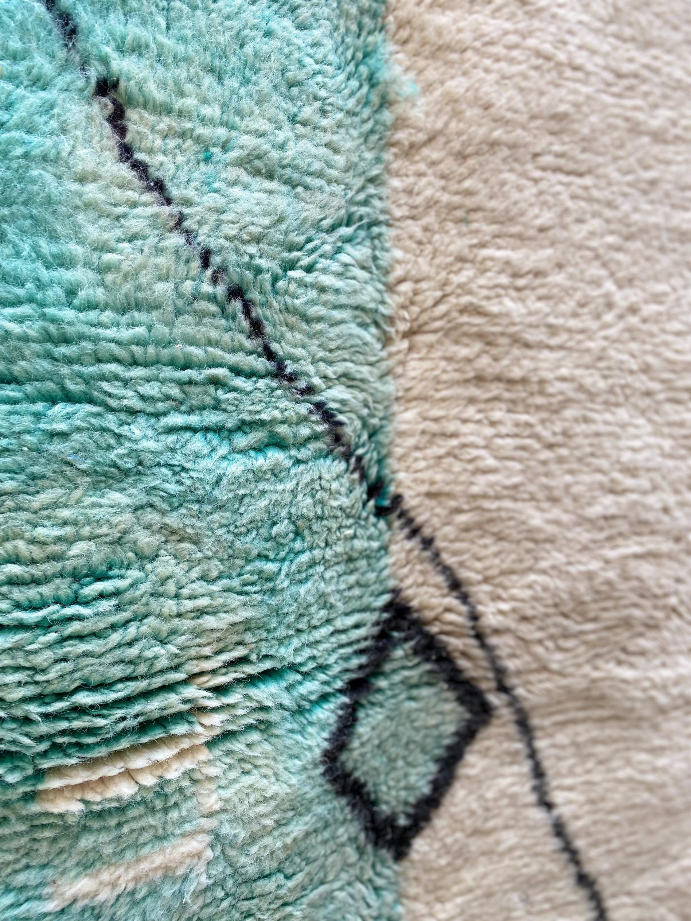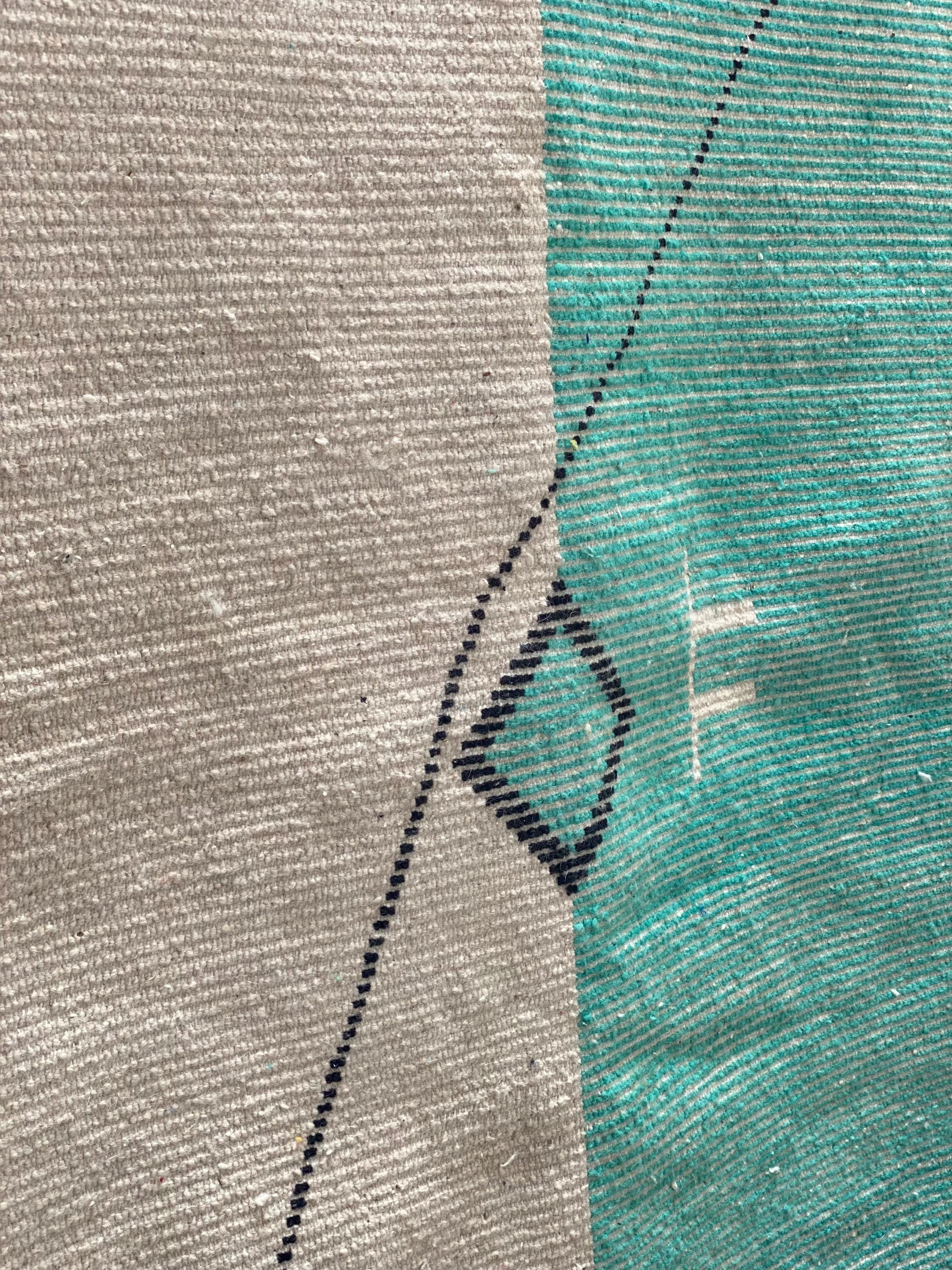 Crafted by Berber artisans in the highlands of Morocco, this stunning hand-knotted rug brings the soul of the Atlas Mountains directly into your home. Split in two equal fields — a dreamy minty teal on one side and a warm natural ivory on the other — the design is anchored by a single bold diamond motif and two sweeping diagonal lines in deep charcoal. Simple, graphic, unforgettable.