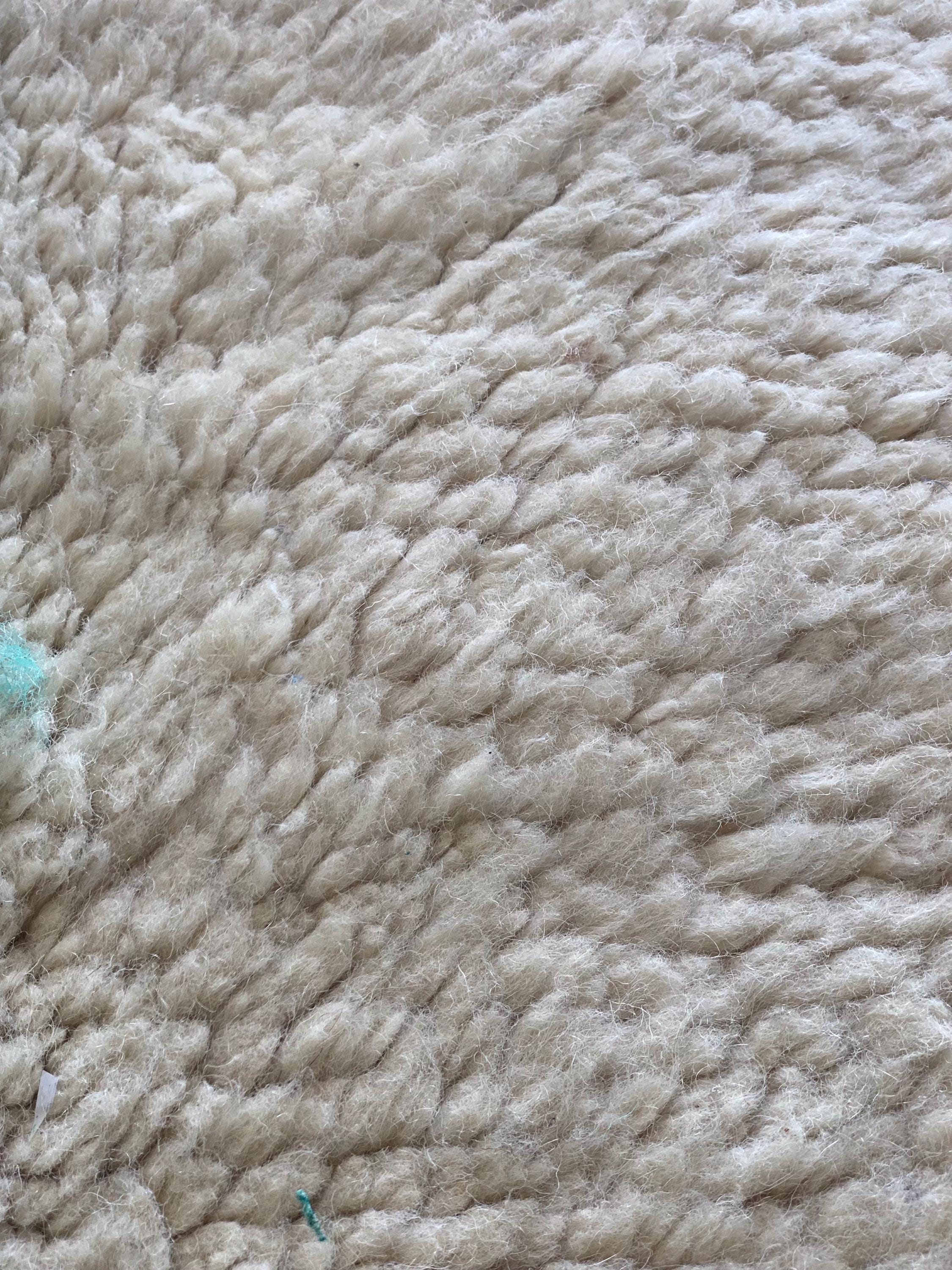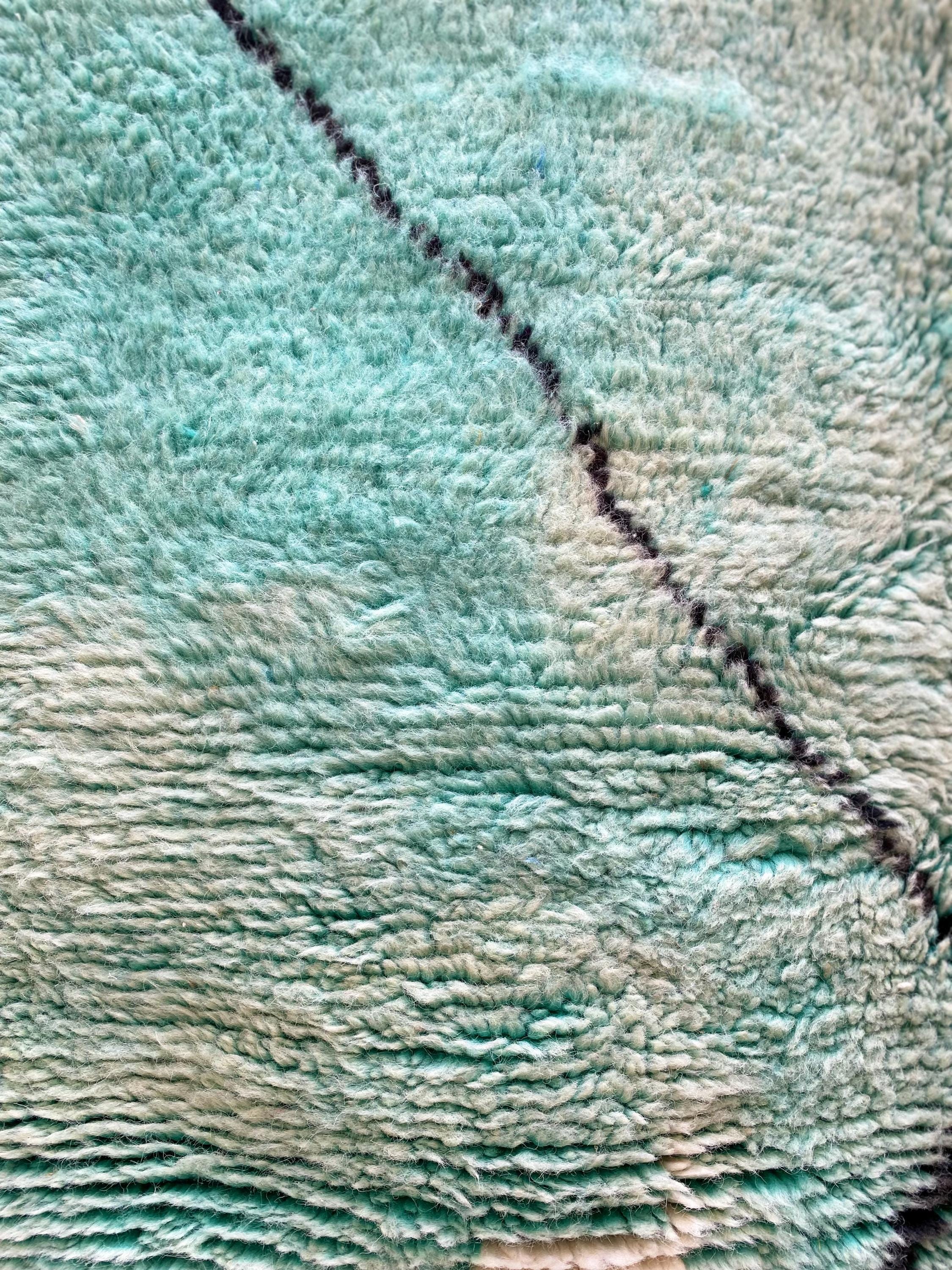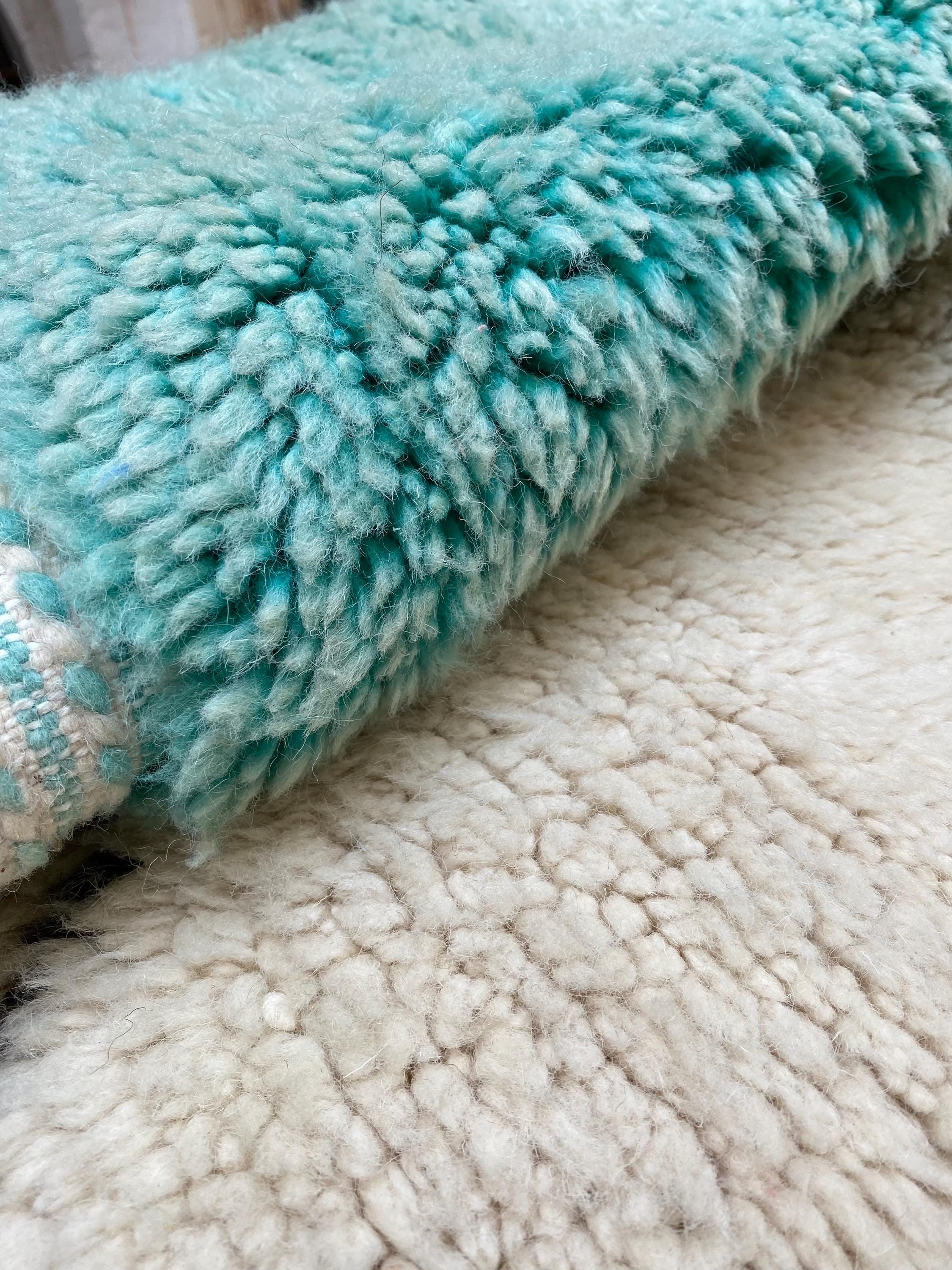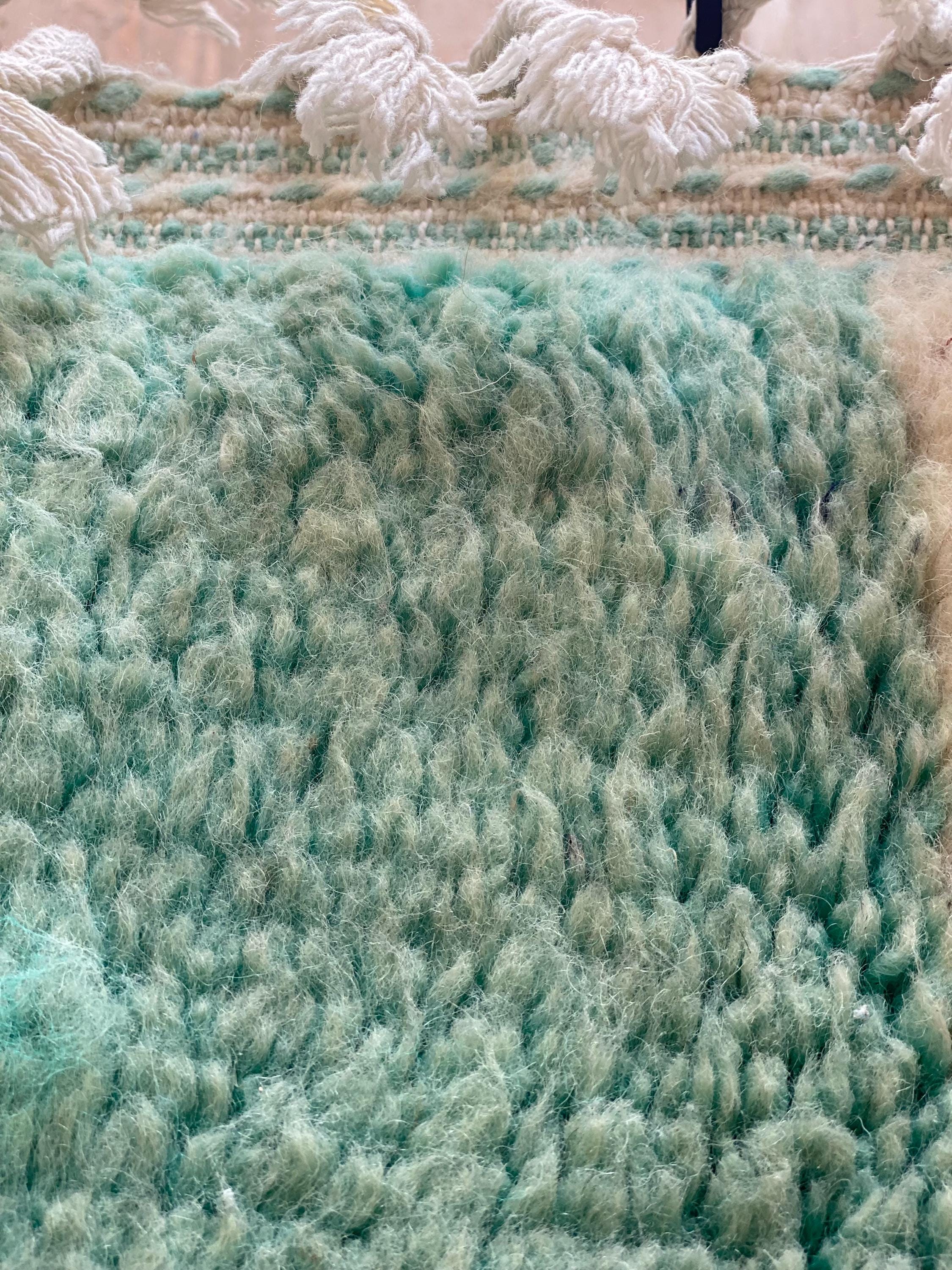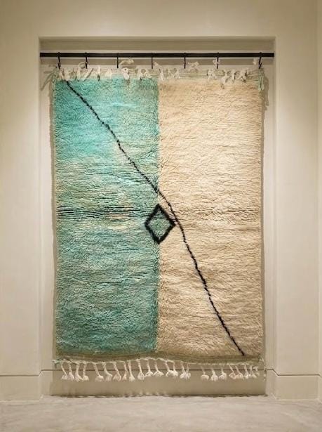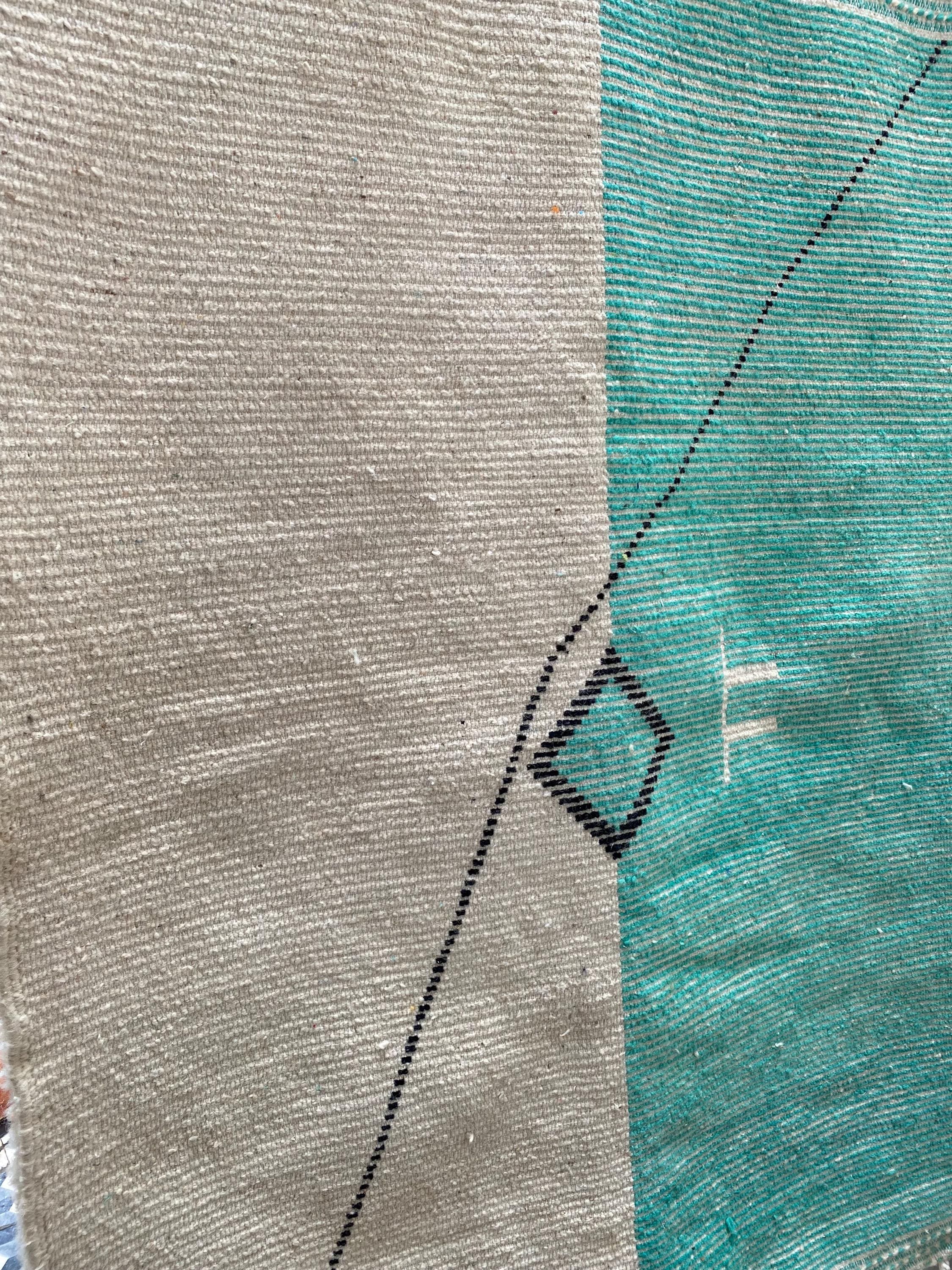 Crafted by Berber artisans in the highlands of Morocco, this stunning hand-knotted rug brings the soul of the Atlas Mountains directly into your home. Split in two equal fields — a dreamy minty teal on one side and a warm natural ivory on the other — the design is anchored by a single bold diamond motif and two sweeping diagonal lines in deep charcoal. Simple, graphic, unforgettable.