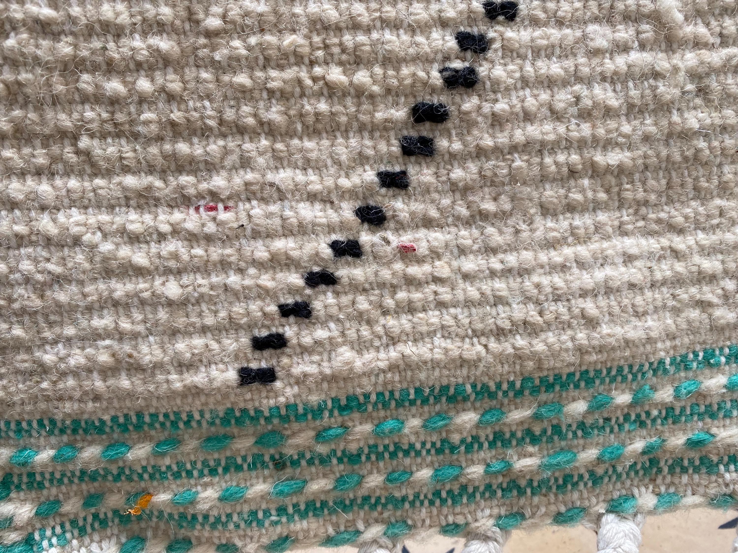 · Backing: Flat-woven kilim weave with teal & ivory dot stripe