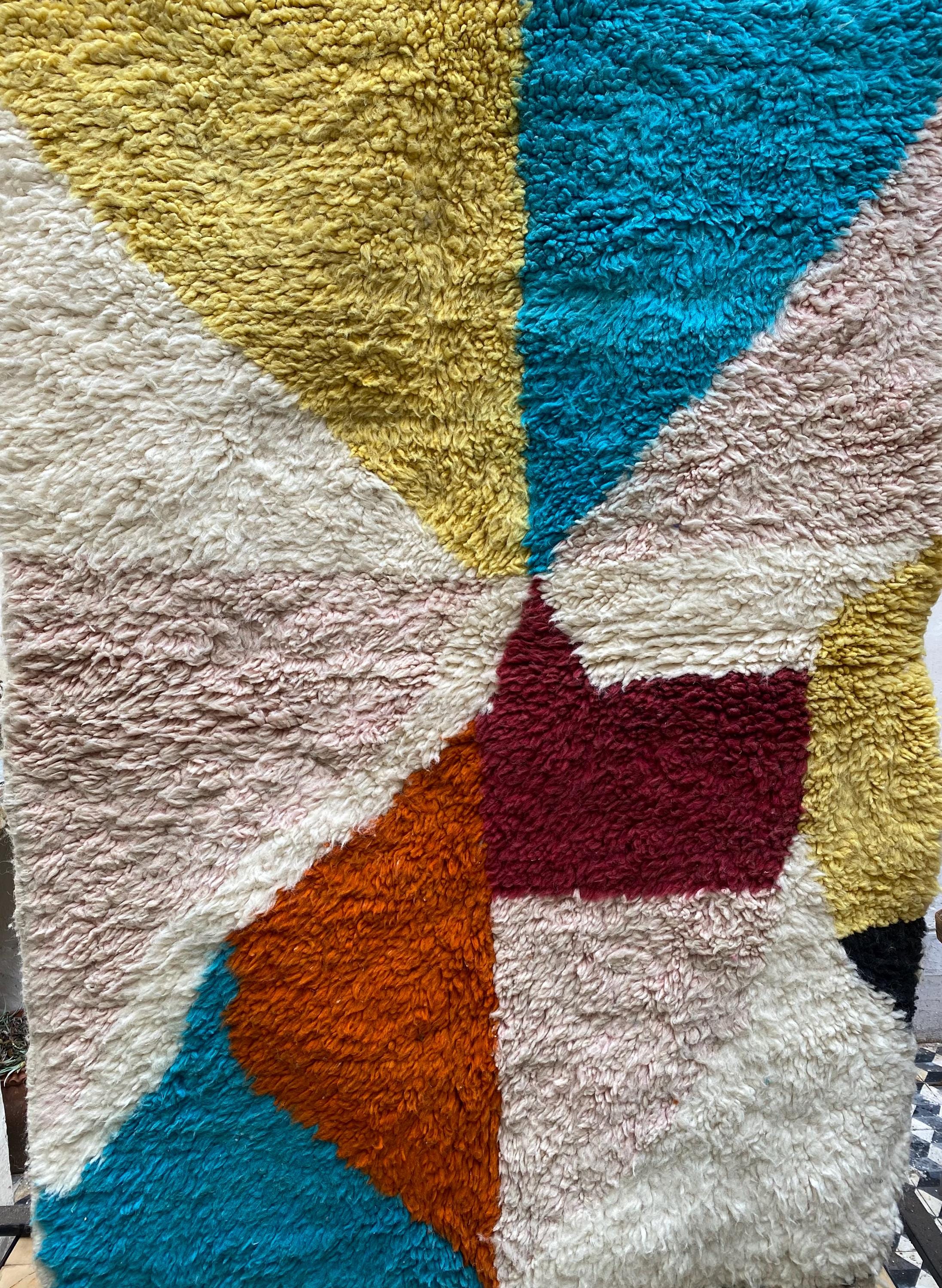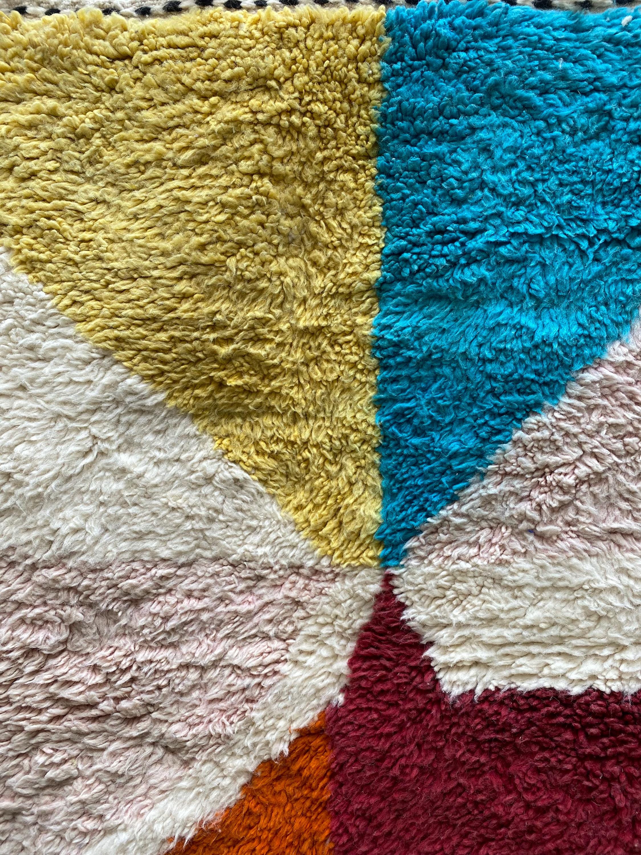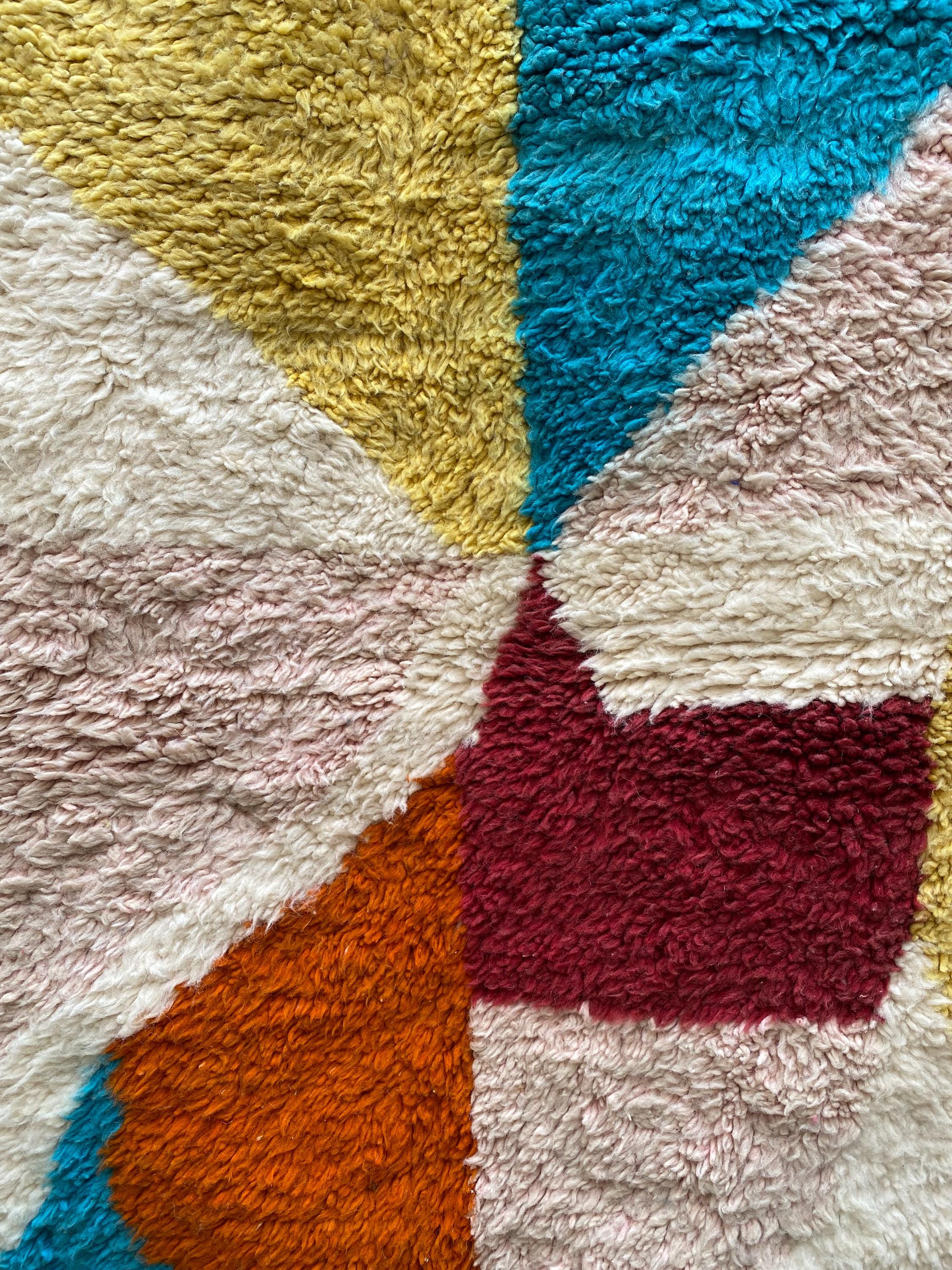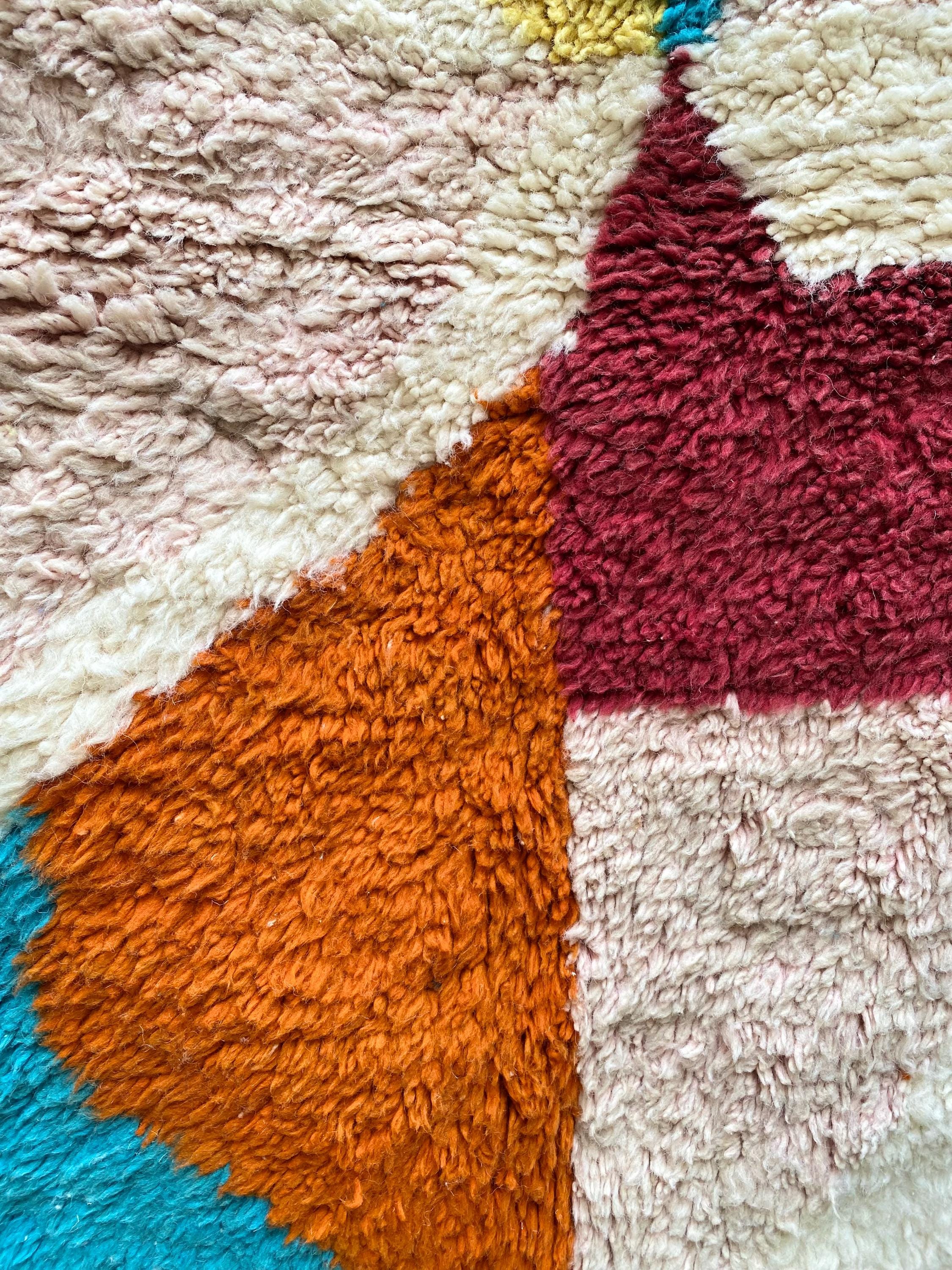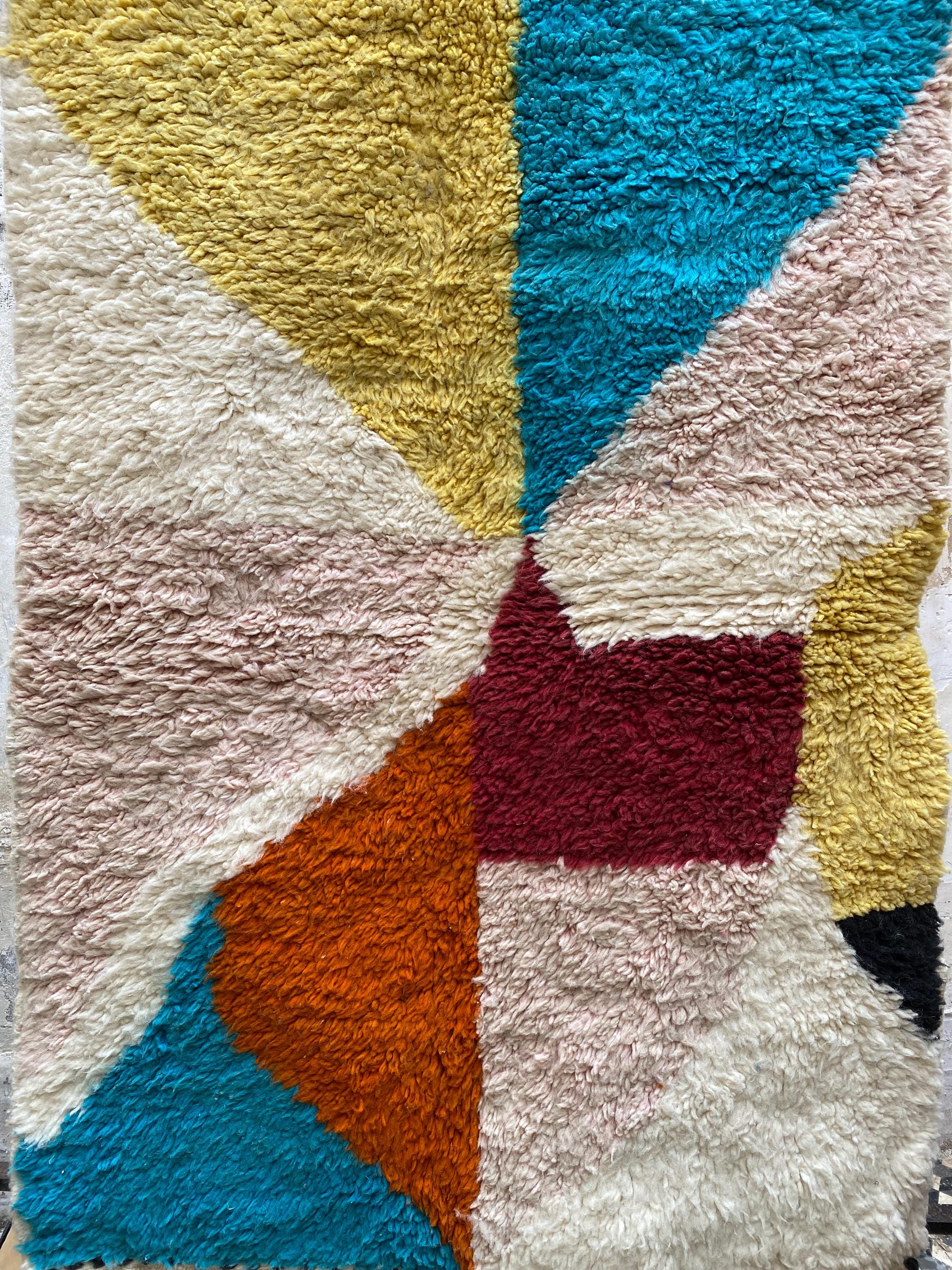 This is not a quiet rug. Hand-knotted by Berber weavers in the heart of Morocco, it arrives with the energy of a painting — bold sweeping shapes in burnt orange, cerulean teal, mustard yellow, dusty rose, deep burgundy and ivory, all colliding in a joyful abstract composition that feels as contemporary as it does timeless.