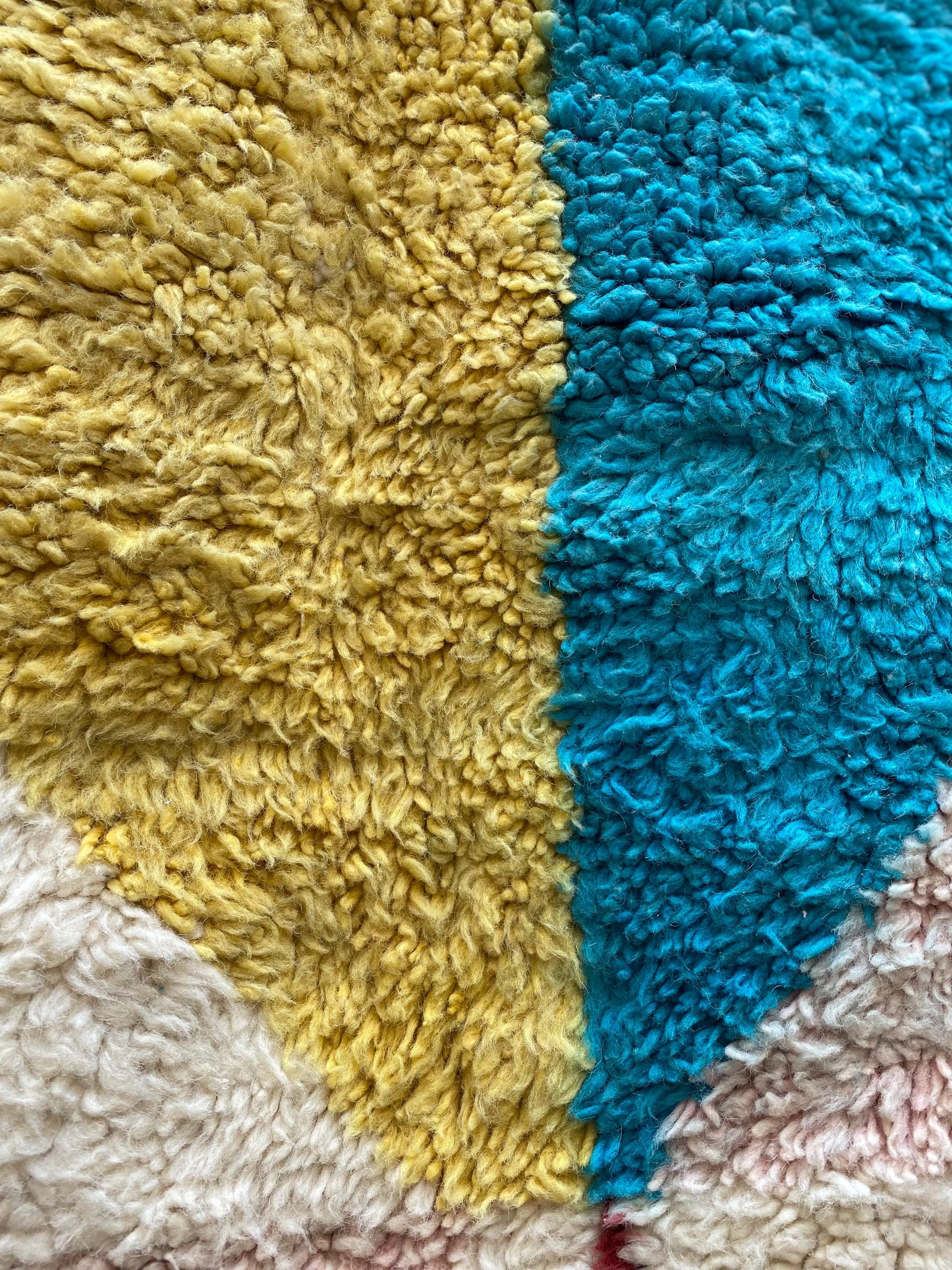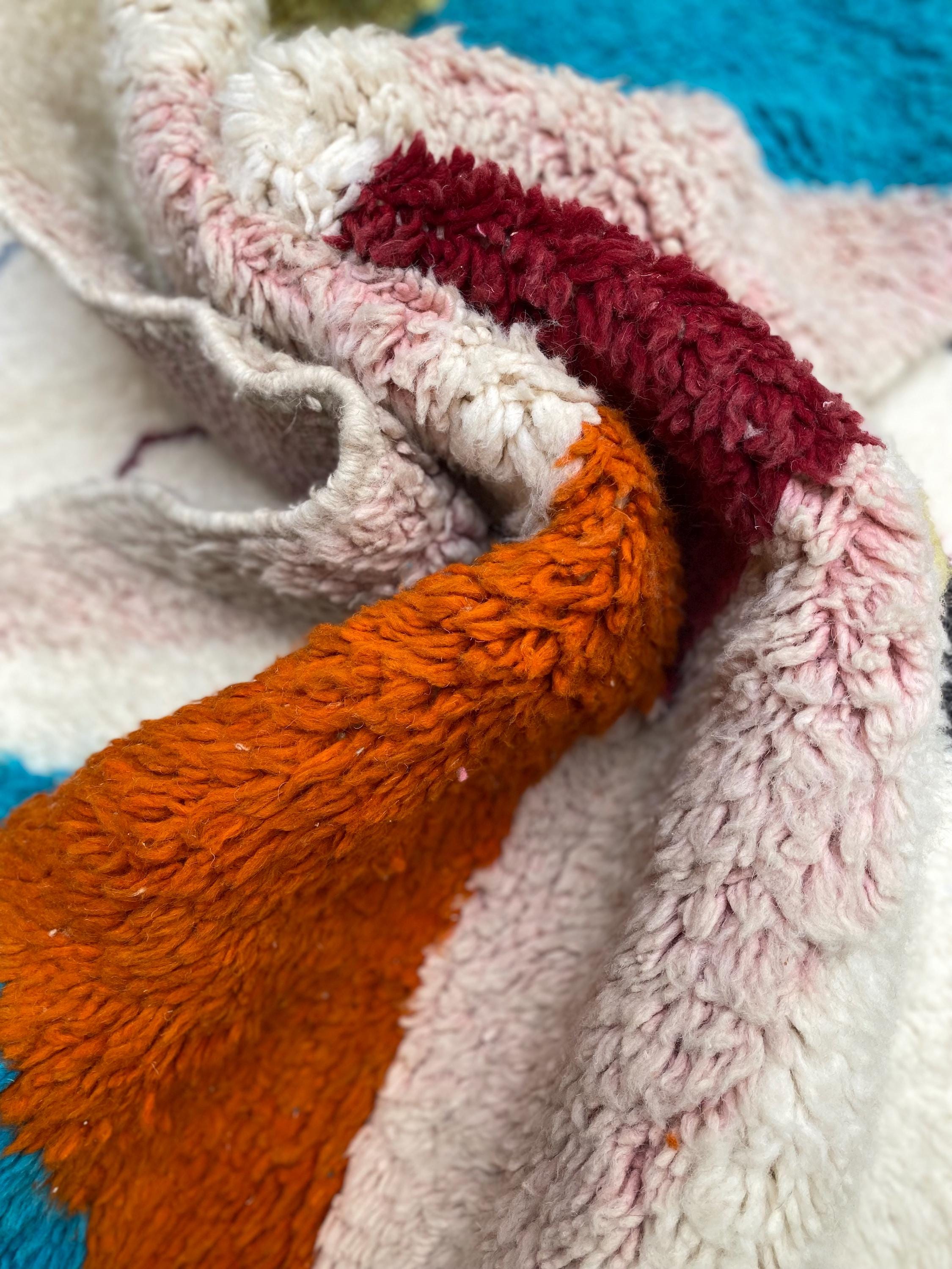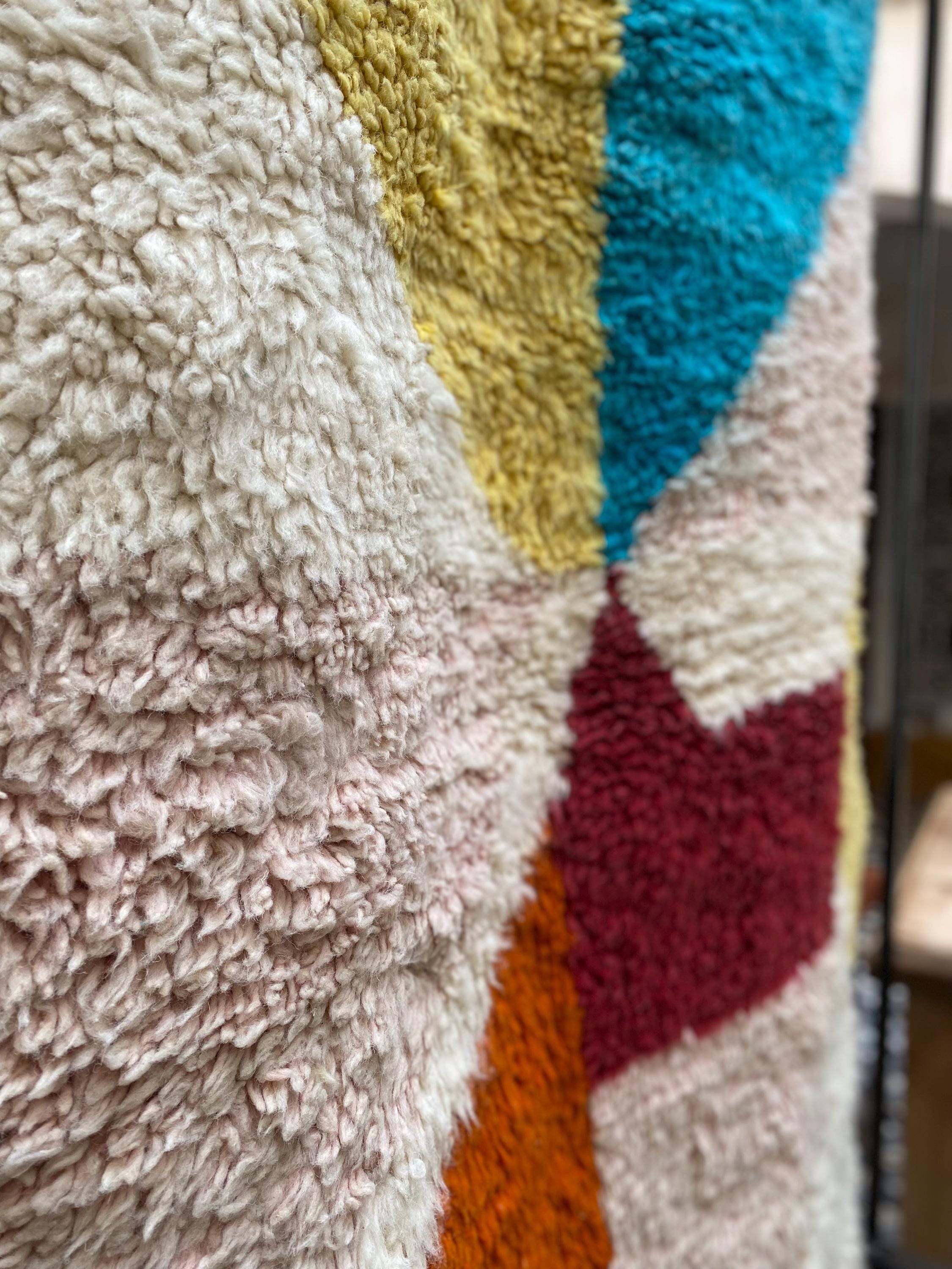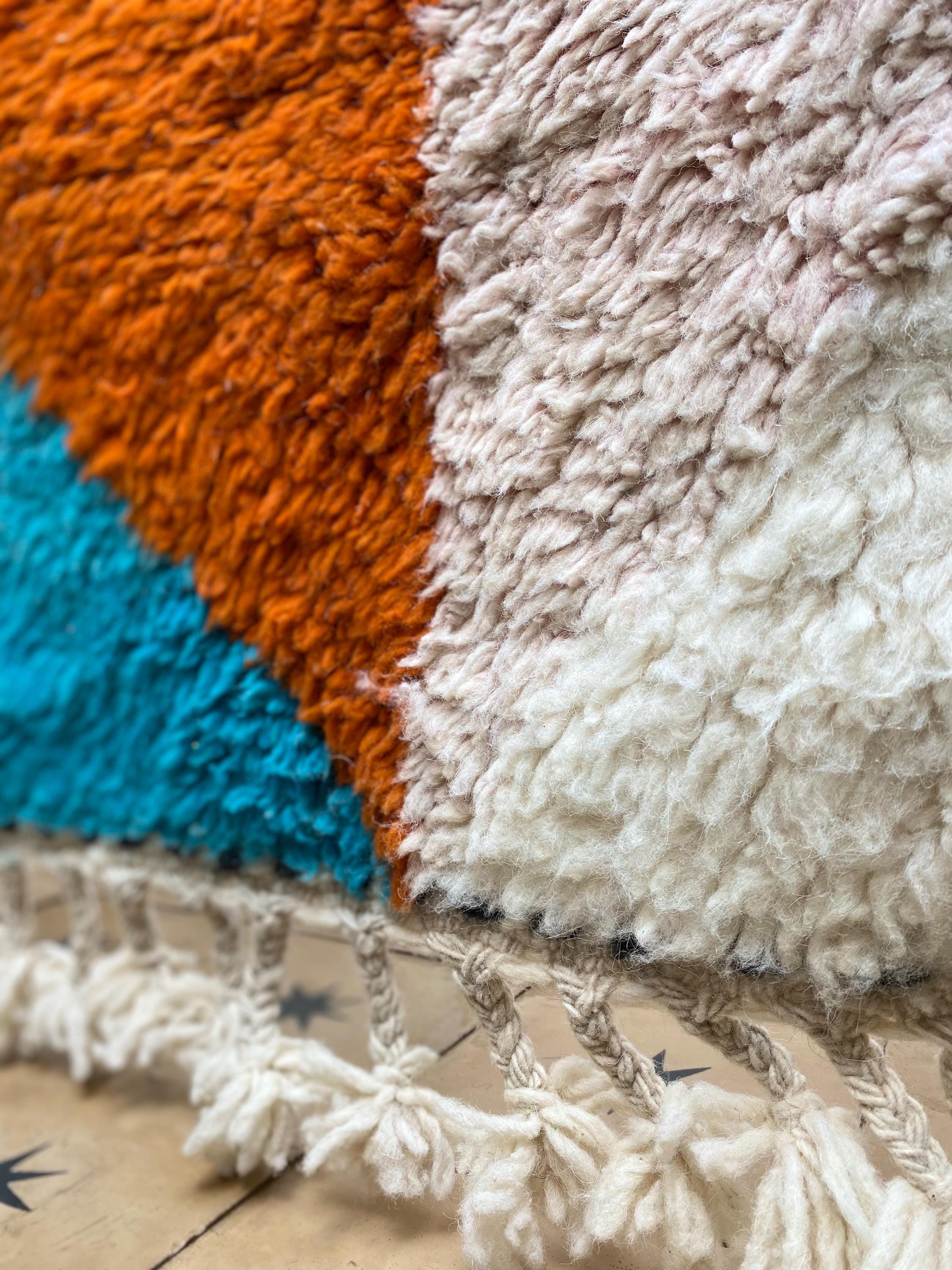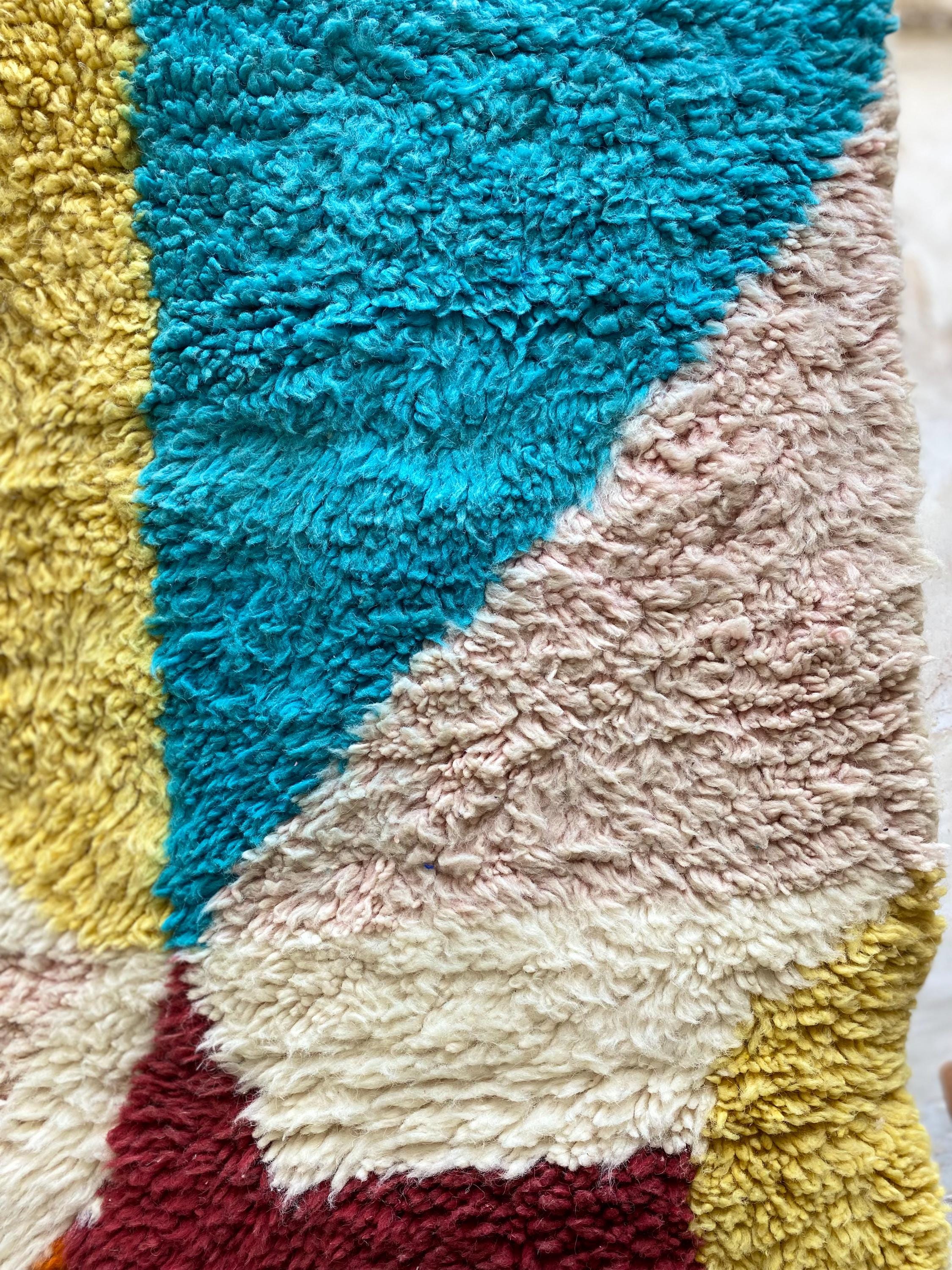 This is not a quiet rug. Hand-knotted by Berber weavers in the heart of Morocco, it arrives with the energy of a painting — bold sweeping shapes in burnt orange, cerulean teal, mustard yellow, dusty rose, deep burgundy and ivory, all colliding in a joyful abstract composition that feels as contemporary as it does timeless.