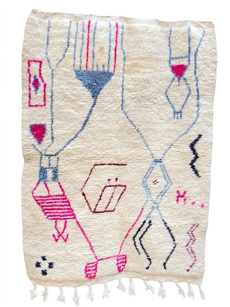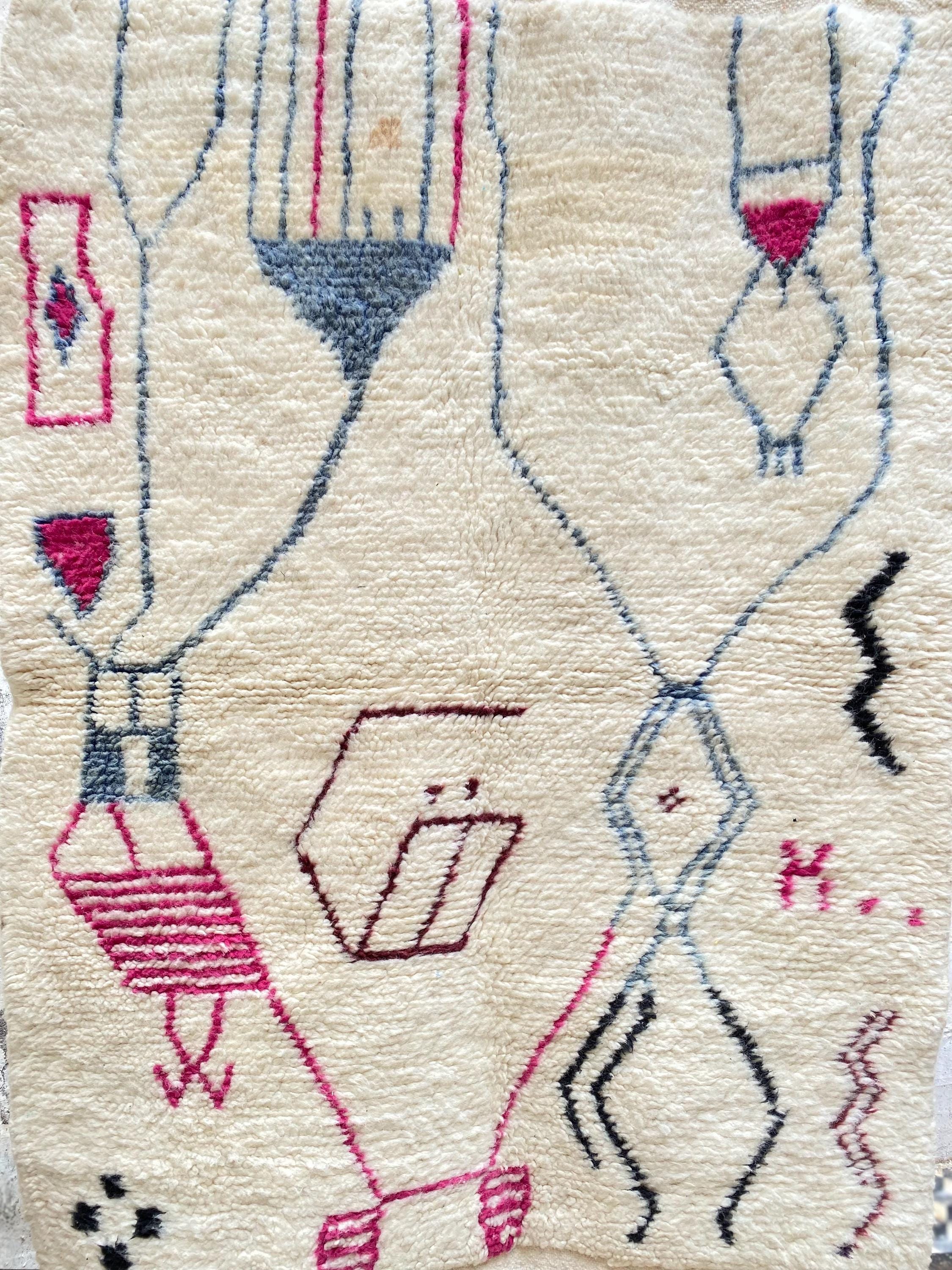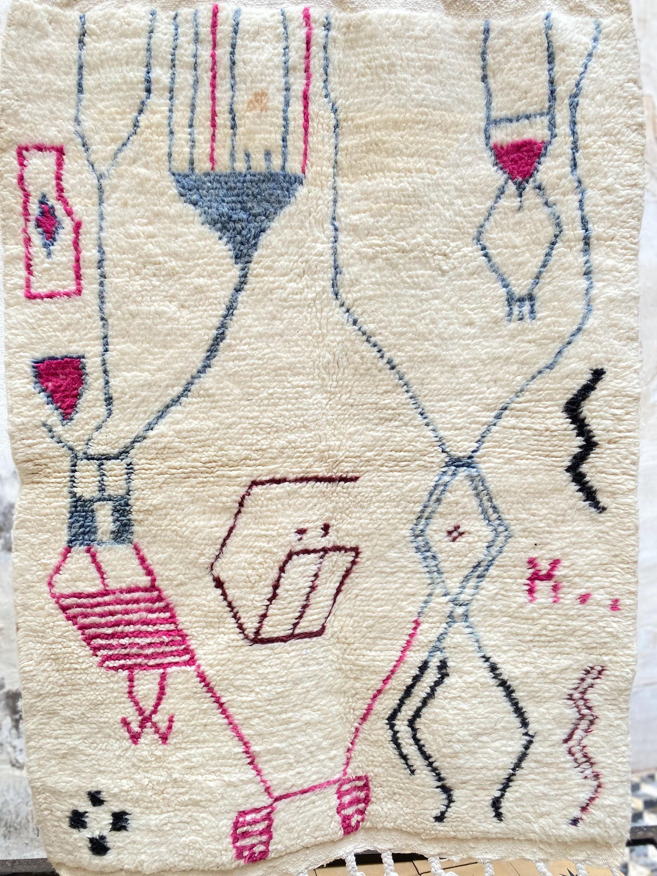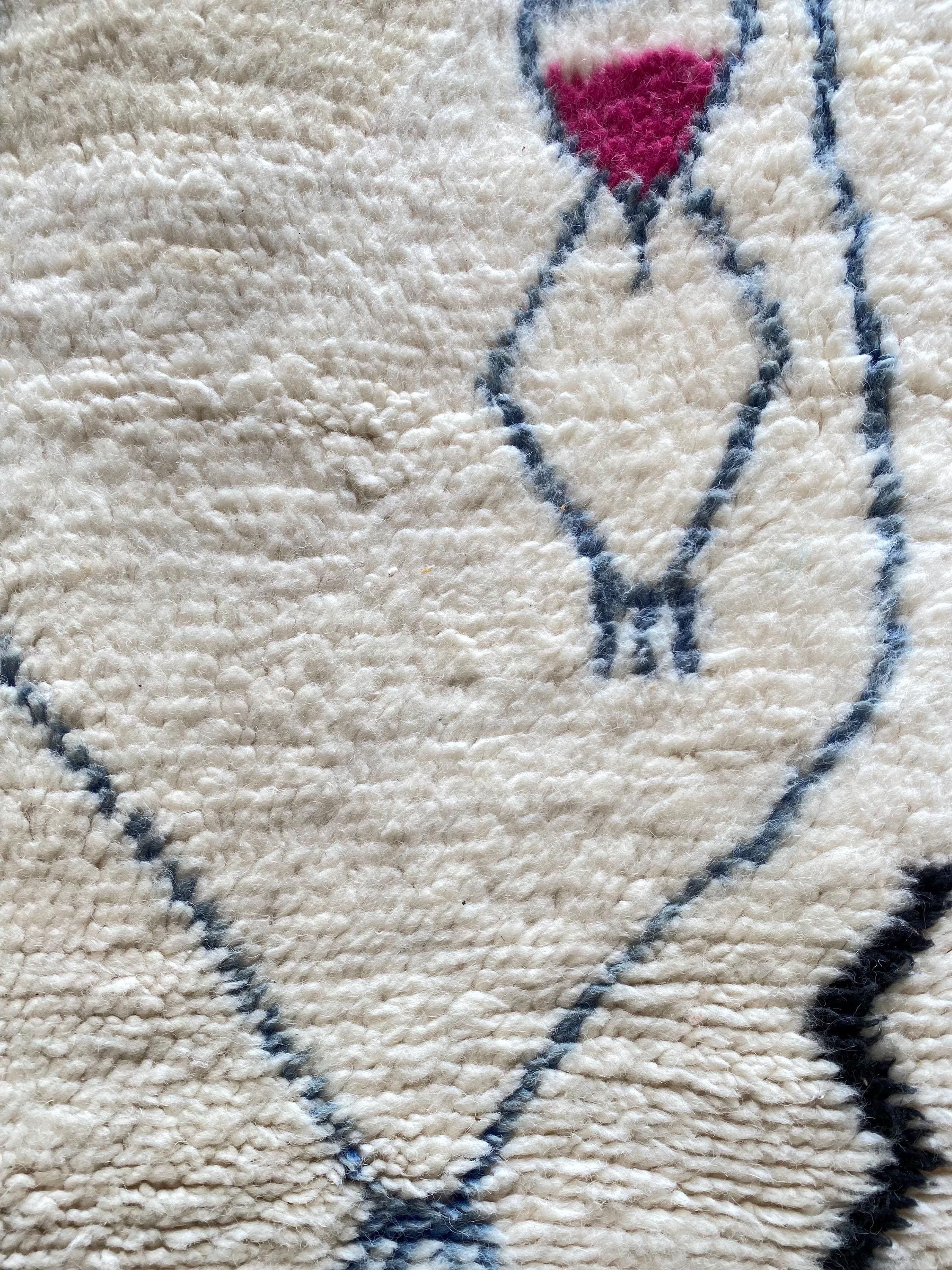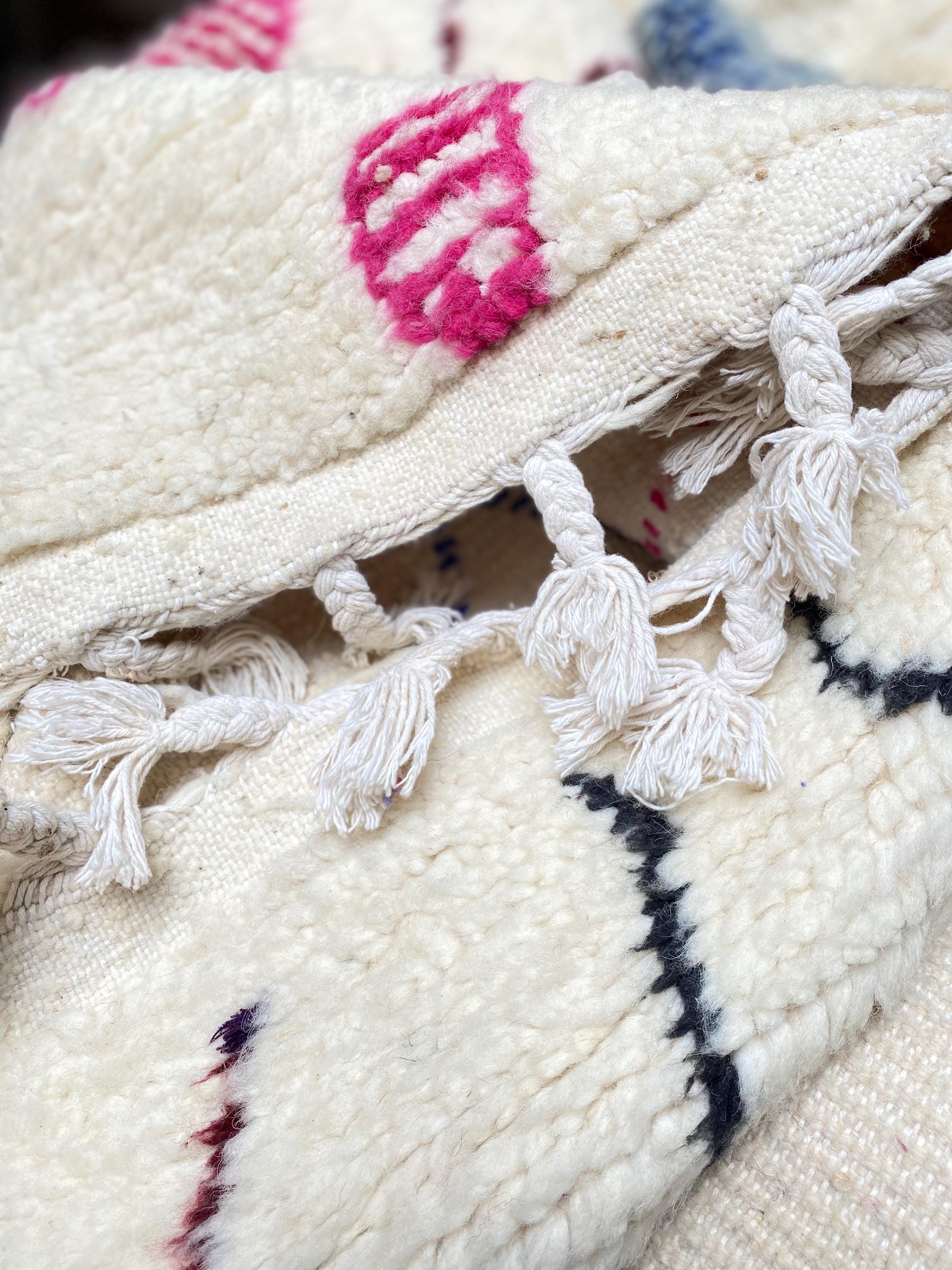 ✨ Handmade Moroccan Beni Ourain Rug — Abstract Berber Wool Carpet | 150 x 100 cm (4′11″ × 3′3″) Bring warmth, texture, and authentic Moroccan craftsmanship into your home with this stunning handwoven Beni Ourain-style rug. Hand-knotted by skilled Berber artisans in Morocco using 100% natural wool, this piece features playful abstract symbols in pink, blue, and charcoal on a luxuriously soft ivory white ground — a perfect blend of boho, modern, and Scandinavian aesthetics. ▸ SIZE: 150 cm × 100 cm | 4′11″ × 3′3″ ▸ STYLE: Beni Ourain / Azilal inspired | Boho | Tribal | Modern ▸ MATERIAL: 100% natural wool pile on a cotton flatweave backing ▸ PILE: High and plush on the front; flat kilim-style reverse ▸ FRINGE: Hand-knotted white cotton tassels 🏠 PERFECT FOR: • Entryway / hallway rug • Kitchen accent rug • Wall hanging / boho wall décor • Living room area rug • Bedroom rug beside the bed • Nursery or kids' room Each rug is one-of-a-kind — the symbols, colors, and layout are unique to a single weaver's hand and carry centuries of Berber tradition and meaning. 📦 SHIPPING — WORLDWIDE | DOOR TO DOOR | 4–6 BUSINESS DAYS We ship globally via FedEx, DHL, or Aramex. Every order includes: ✔ Full tracking number sent to your inbox ✔ Secure, professional packaging to protect your rug ✔ Door-to-door delivery in 4 to 6 business days 🔍 SEO TAGS: moroccan rug, beni ourain rug, berber rug, wool rug handmade, boho rug, abstract rug, white wool rug, tribal rug, azilal rug, small area rug, entryway rug, bedroom rug, wall rug, moroccan carpet, handknotted rug, pink blue rug, authentic moroccan rug, rug 5x3, accent rug, bohemian home decor
