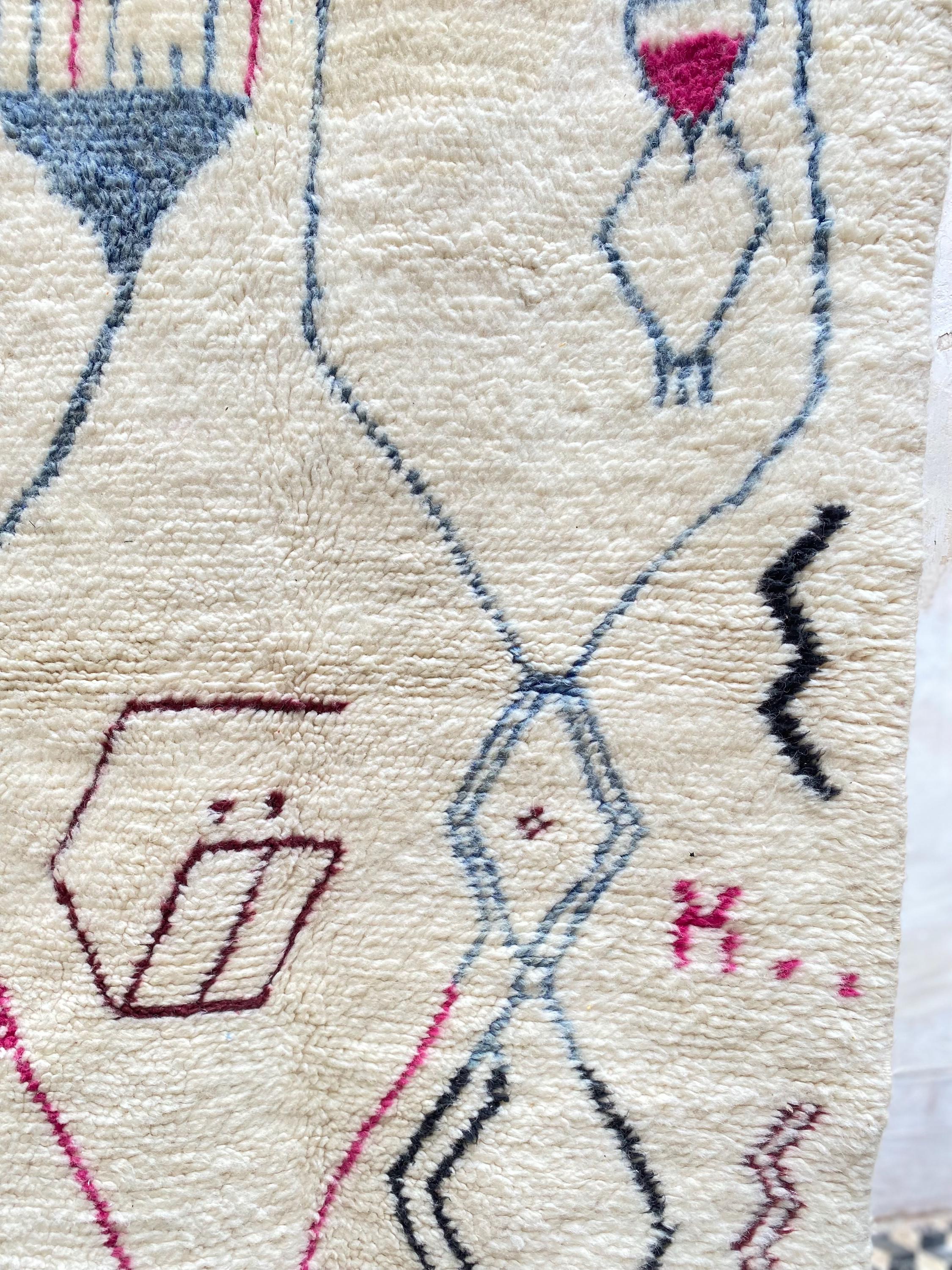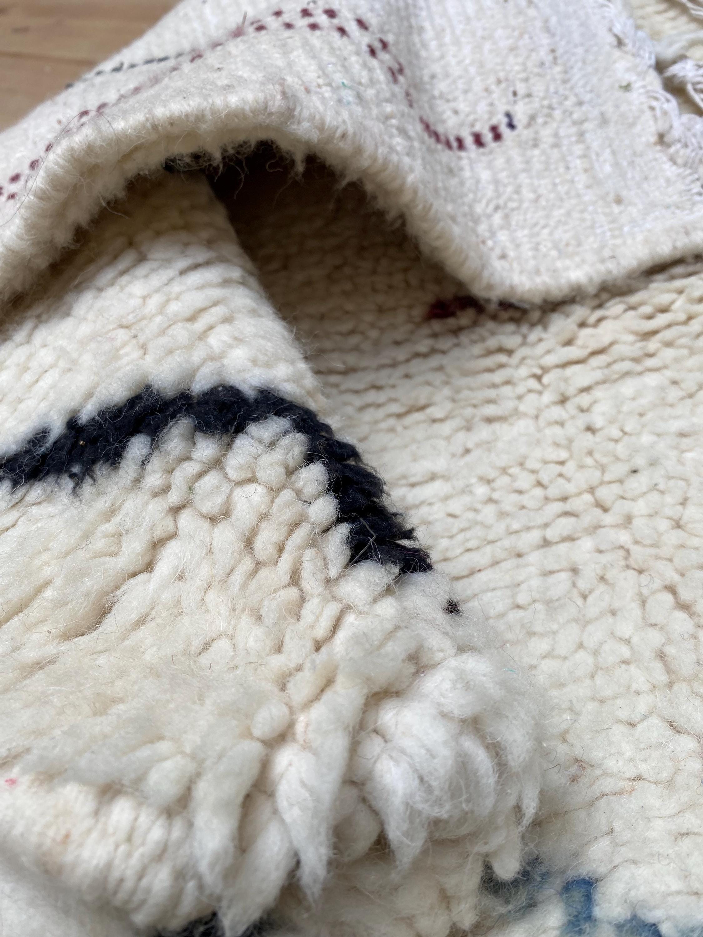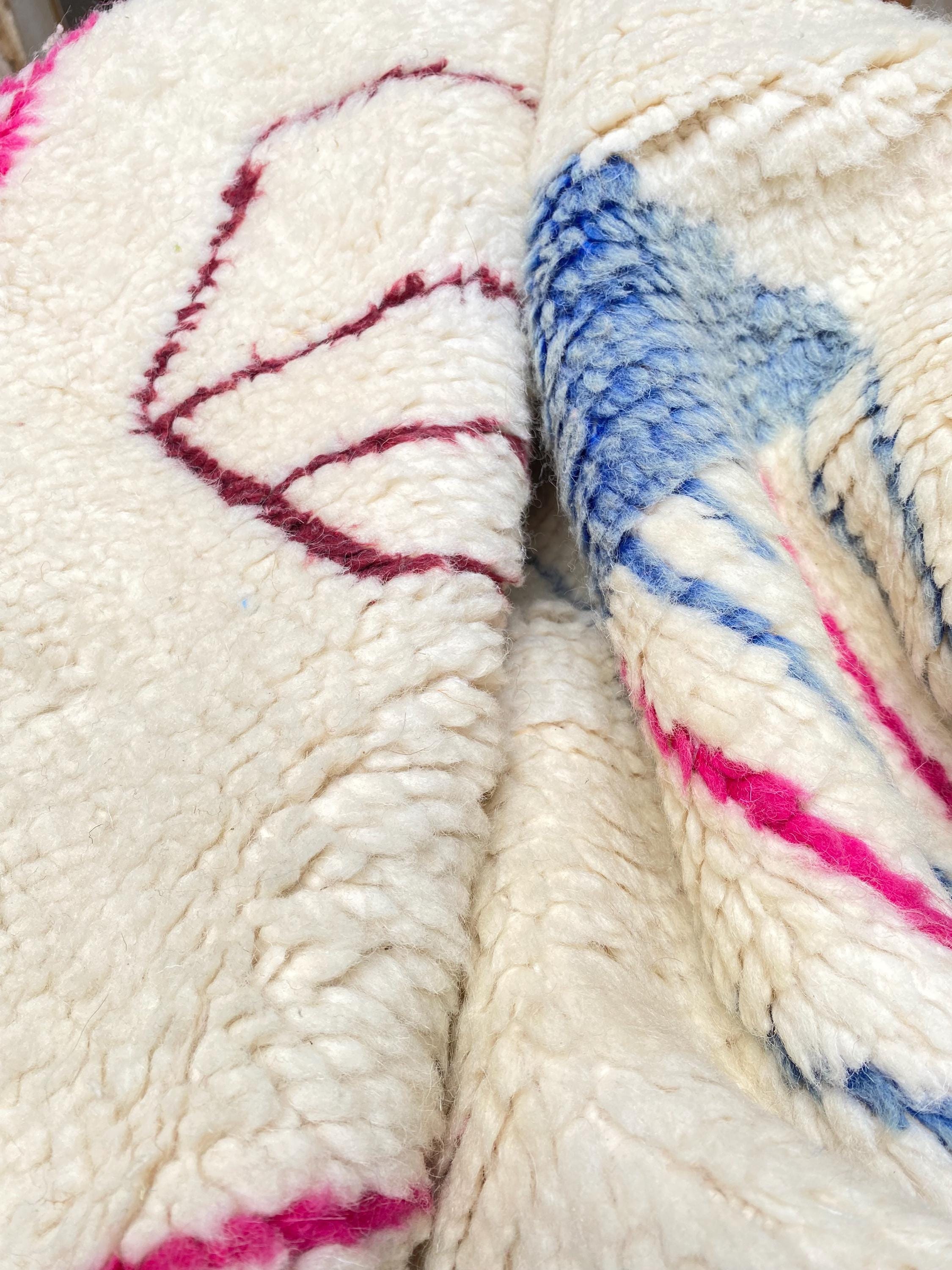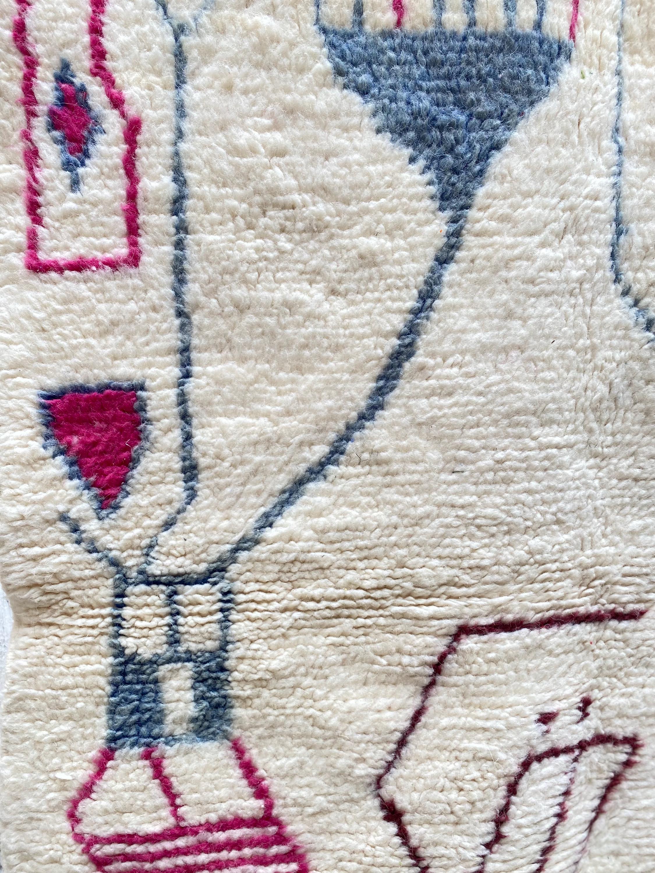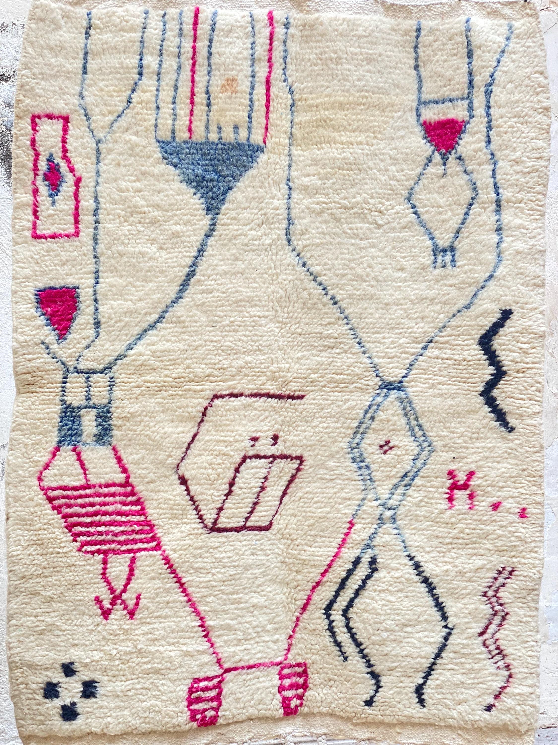 ✨ Handmade Moroccan Beni Ourain Rug — Abstract Berber Wool Carpet | 150 x 100 cm (4′11″ × 3′3″) Bring warmth, texture, and authentic Moroccan craftsmanship into your home with this stunning handwoven Beni Ourain-style rug. Hand-knotted by skilled Berber artisans in Morocco using 100% natural wool, this piece features playful abstract symbols in pink, blue, and charcoal on a luxuriously soft ivory white ground — a perfect blend of boho, modern, and Scandinavian aesthetics. ▸ SIZE: 150 cm × 100 cm | 4′11″ × 3′3″ ▸ STYLE: Beni Ourain / Azilal inspired | Boho | Tribal | Modern ▸ MATERIAL: 100% natural wool pile on a cotton flatweave backing ▸ PILE: High and plush on the front; flat kilim-style reverse ▸ FRINGE: Hand-knotted white cotton tassels 🏠 PERFECT FOR: • Entryway / hallway rug • Kitchen accent rug • Wall hanging / boho wall décor • Living room area rug • Bedroom rug beside the bed • Nursery or kids' room Each rug is one-of-a-kind — the symbols, colors, and layout are unique to a single weaver's hand and carry centuries of Berber tradition and meaning. 📦 SHIPPING — WORLDWIDE | DOOR TO DOOR | 4–6 BUSINESS DAYS We ship globally via FedEx, DHL, or Aramex. Every order includes: ✔ Full tracking number sent to your inbox ✔ Secure, professional packaging to protect your rug ✔ Door-to-door delivery in 4 to 6 business days 🔍 SEO TAGS: moroccan rug, beni ourain rug, berber rug, wool rug handmade, boho rug, abstract rug, white wool rug, tribal rug, azilal rug, small area rug, entryway rug, bedroom rug, wall rug, moroccan carpet, handknotted rug, pink blue rug, authentic moroccan rug, rug 5x3, accent rug, bohemian home decor