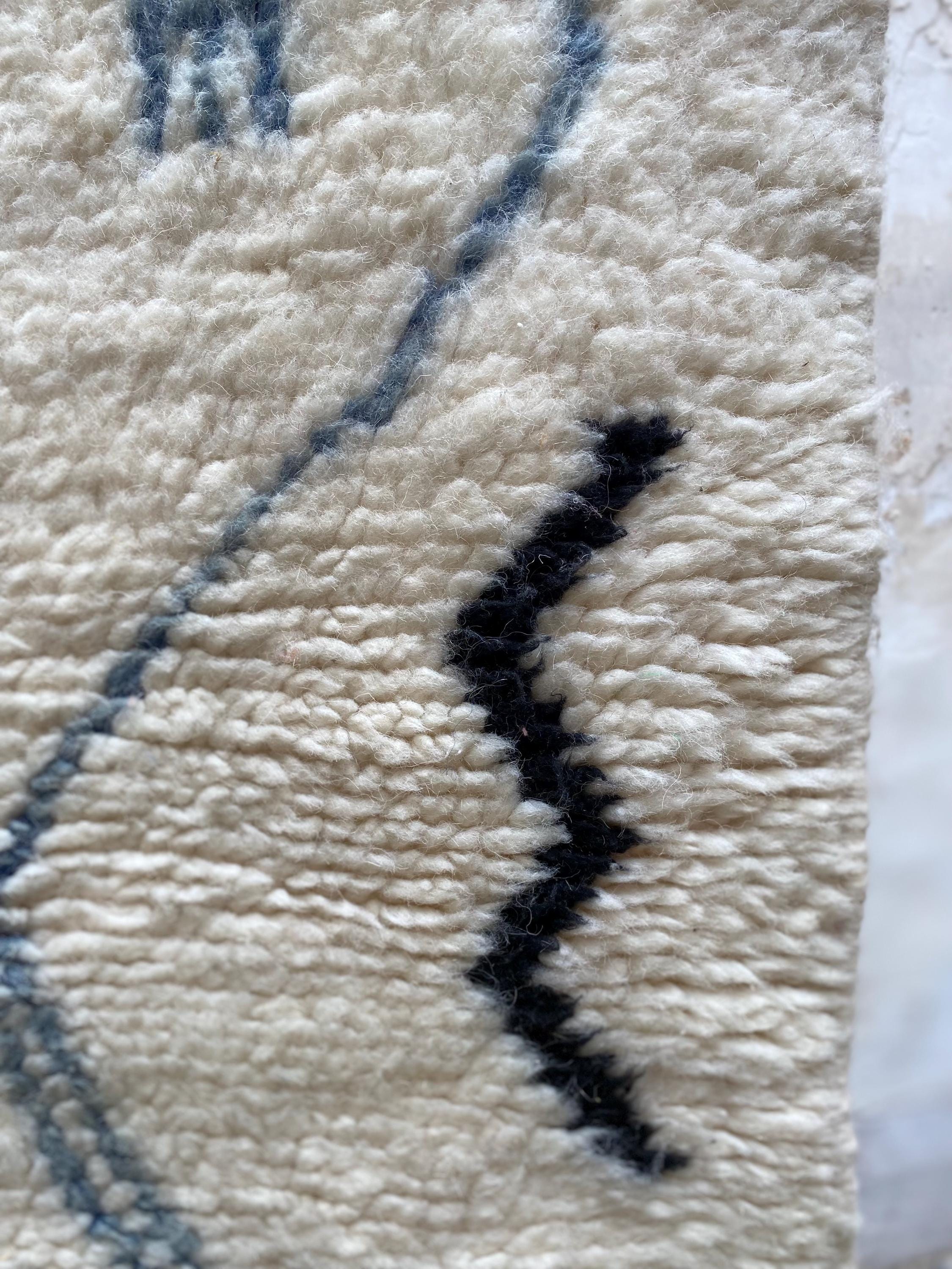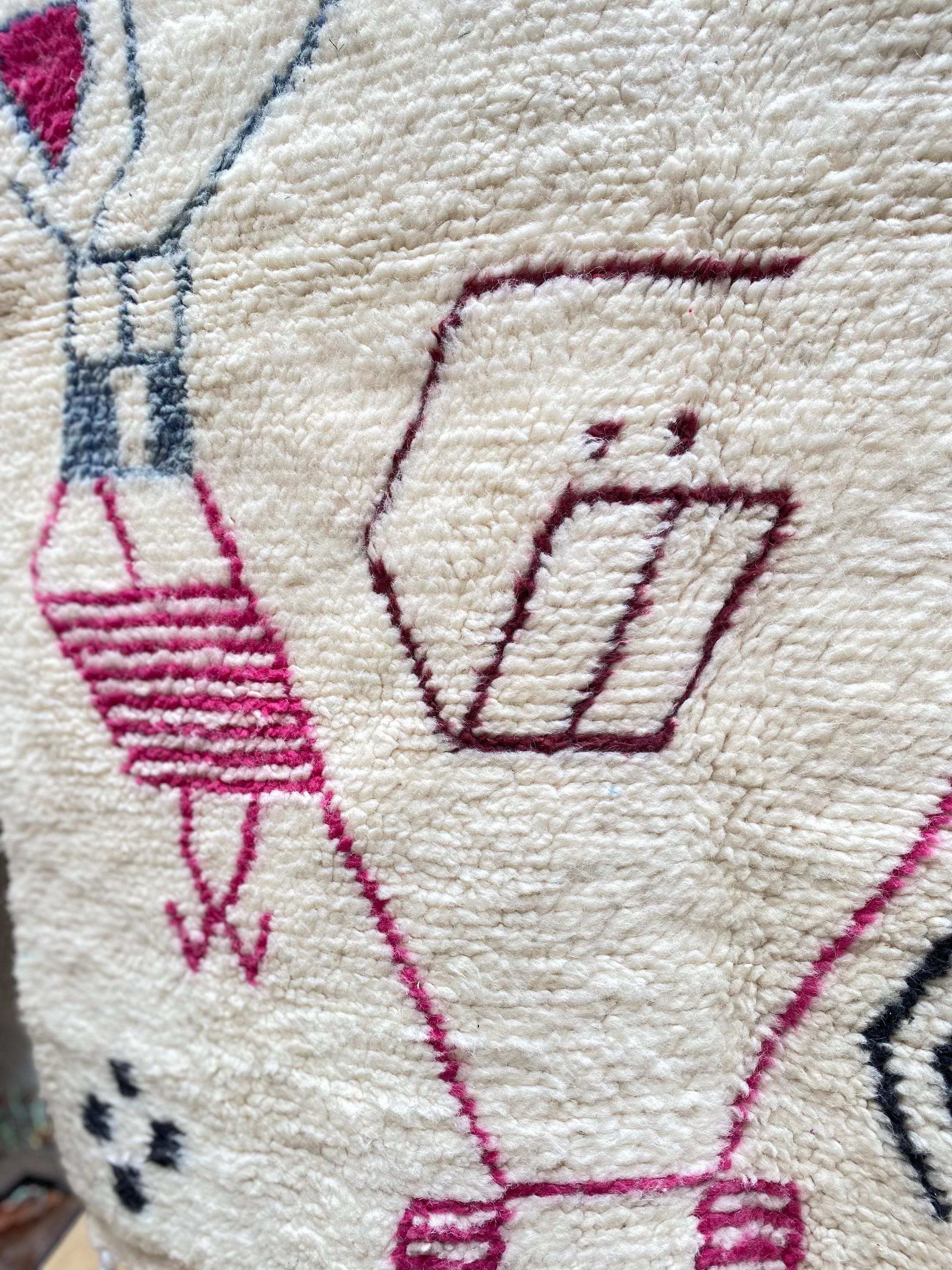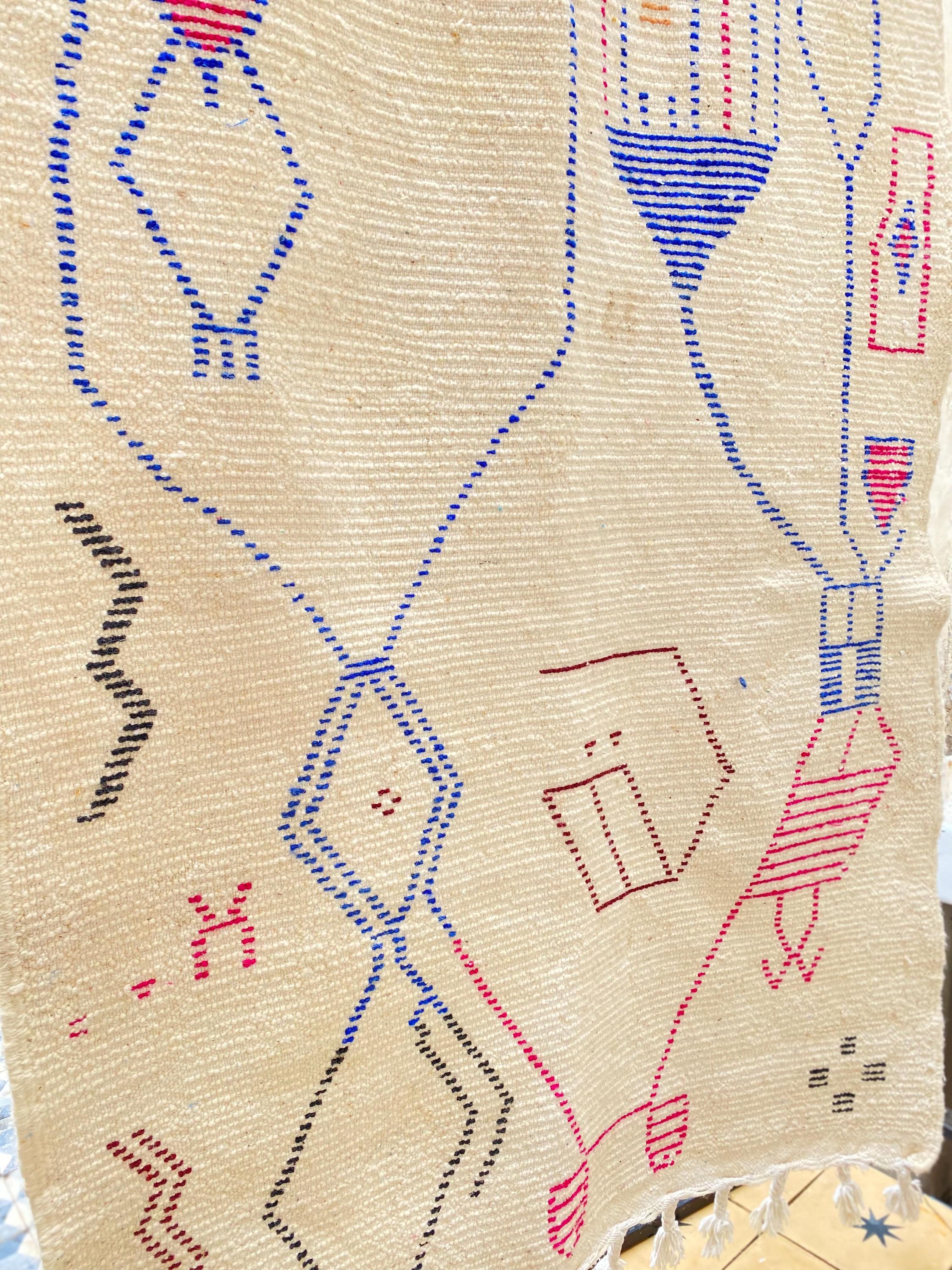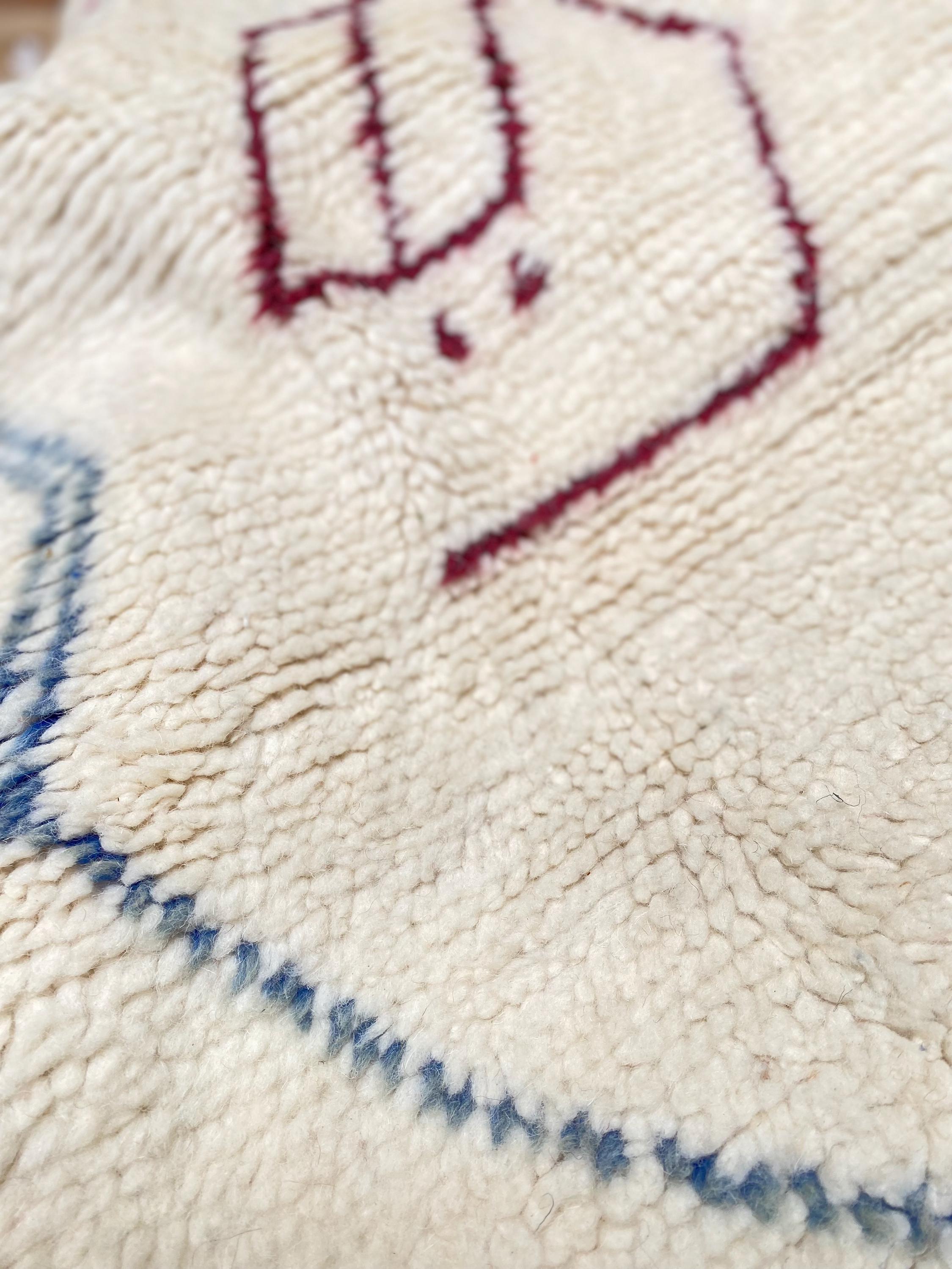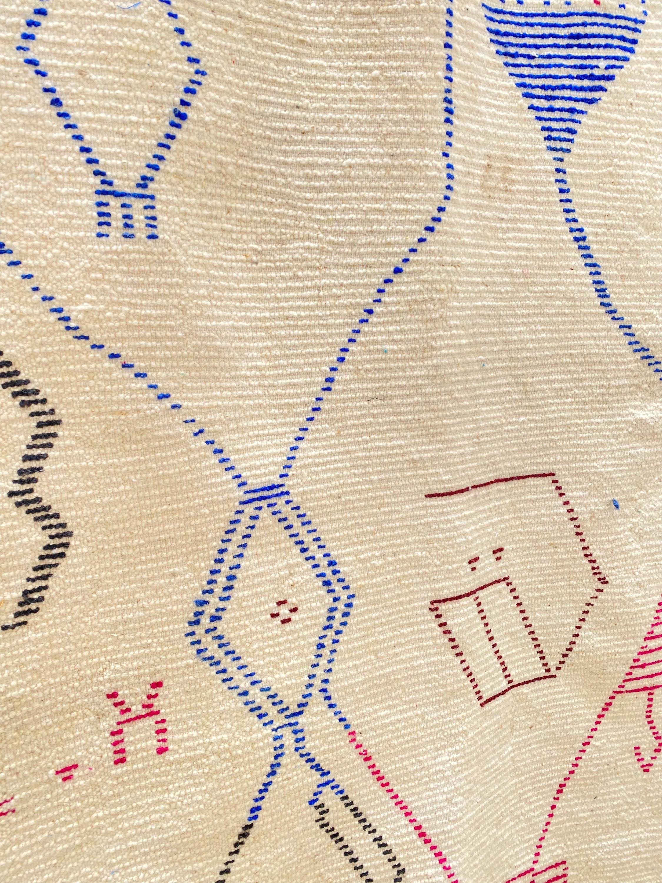 ✨ Handmade Moroccan Beni Ourain Rug — Abstract Berber Wool Carpet | 150 x 100 cm (4′11″ × 3′3″) Bring warmth, texture, and authentic Moroccan craftsmanship into your home with this stunning handwoven Beni Ourain-style rug. Hand-knotted by skilled Berber artisans in Morocco using 100% natural wool, this piece features playful abstract symbols in pink, blue, and charcoal on a luxuriously soft ivory white ground — a perfect blend of boho, modern, and Scandinavian aesthetics. ▸ SIZE: 150 cm × 100 cm | 4′11″ × 3′3″ ▸ STYLE: Beni Ourain / Azilal inspired | Boho | Tribal | Modern ▸ MATERIAL: 100% natural wool pile on a cotton flatweave backing ▸ PILE: High and plush on the front; flat kilim-style reverse ▸ FRINGE: Hand-knotted white cotton tassels 🏠 PERFECT FOR: • Entryway / hallway rug • Kitchen accent rug • Wall hanging / boho wall décor • Living room area rug • Bedroom rug beside the bed • Nursery or kids' room Each rug is one-of-a-kind — the symbols, colors, and layout are unique to a single weaver's hand and carry centuries of Berber tradition and meaning. 📦 SHIPPING — WORLDWIDE | DOOR TO DOOR | 4–6 BUSINESS DAYS We ship globally via FedEx, DHL, or Aramex. Every order includes: ✔ Full tracking number sent to your inbox ✔ Secure, professional packaging to protect your rug ✔ Door-to-door delivery in 4 to 6 business days 🔍 SEO TAGS: moroccan rug, beni ourain rug, berber rug, wool rug handmade, boho rug, abstract rug, white wool rug, tribal rug, azilal rug, small area rug, entryway rug, bedroom rug, wall rug, moroccan carpet, handknotted rug, pink blue rug, authentic moroccan rug, rug 5x3, accent rug, bohemian home decor