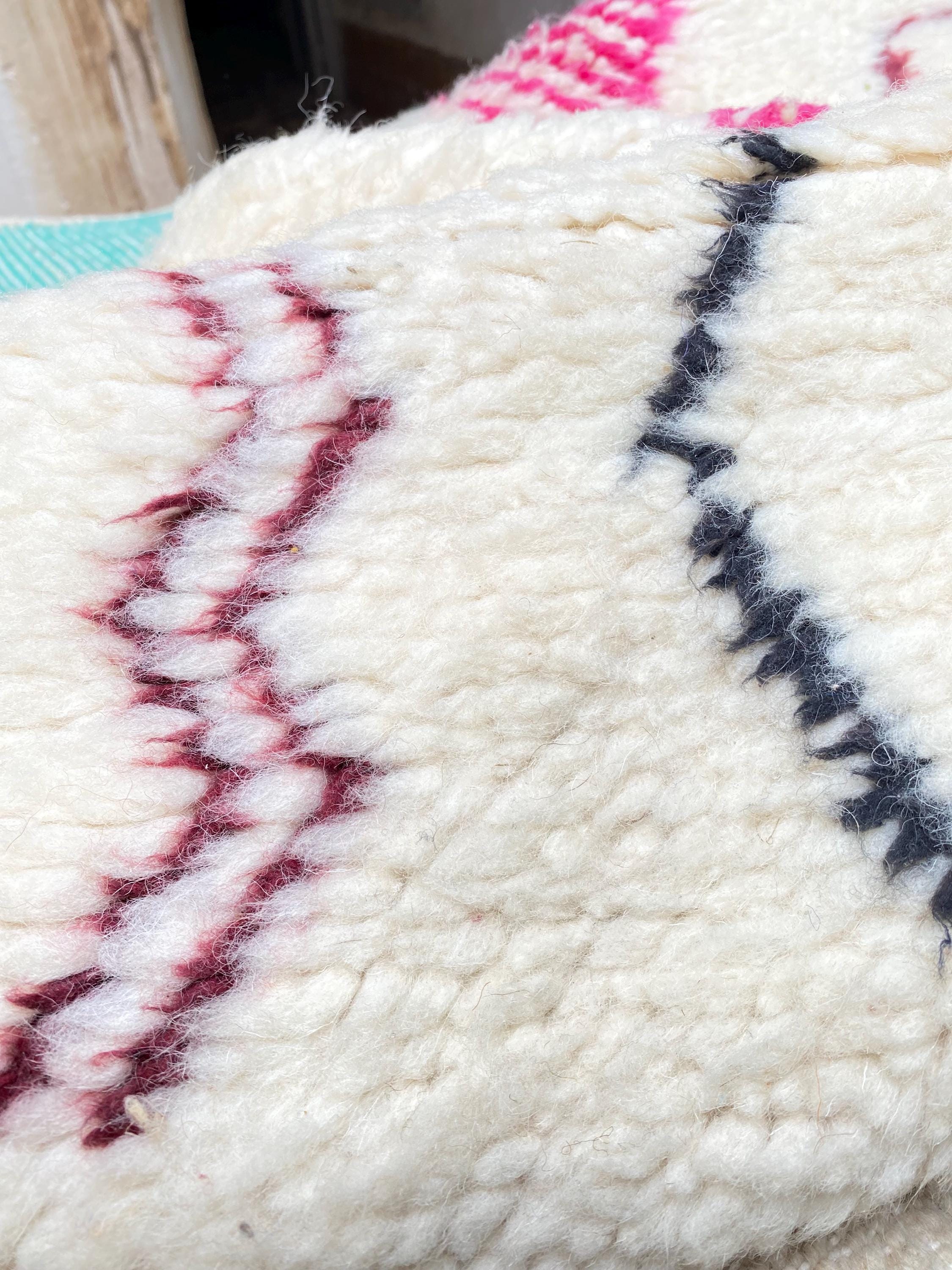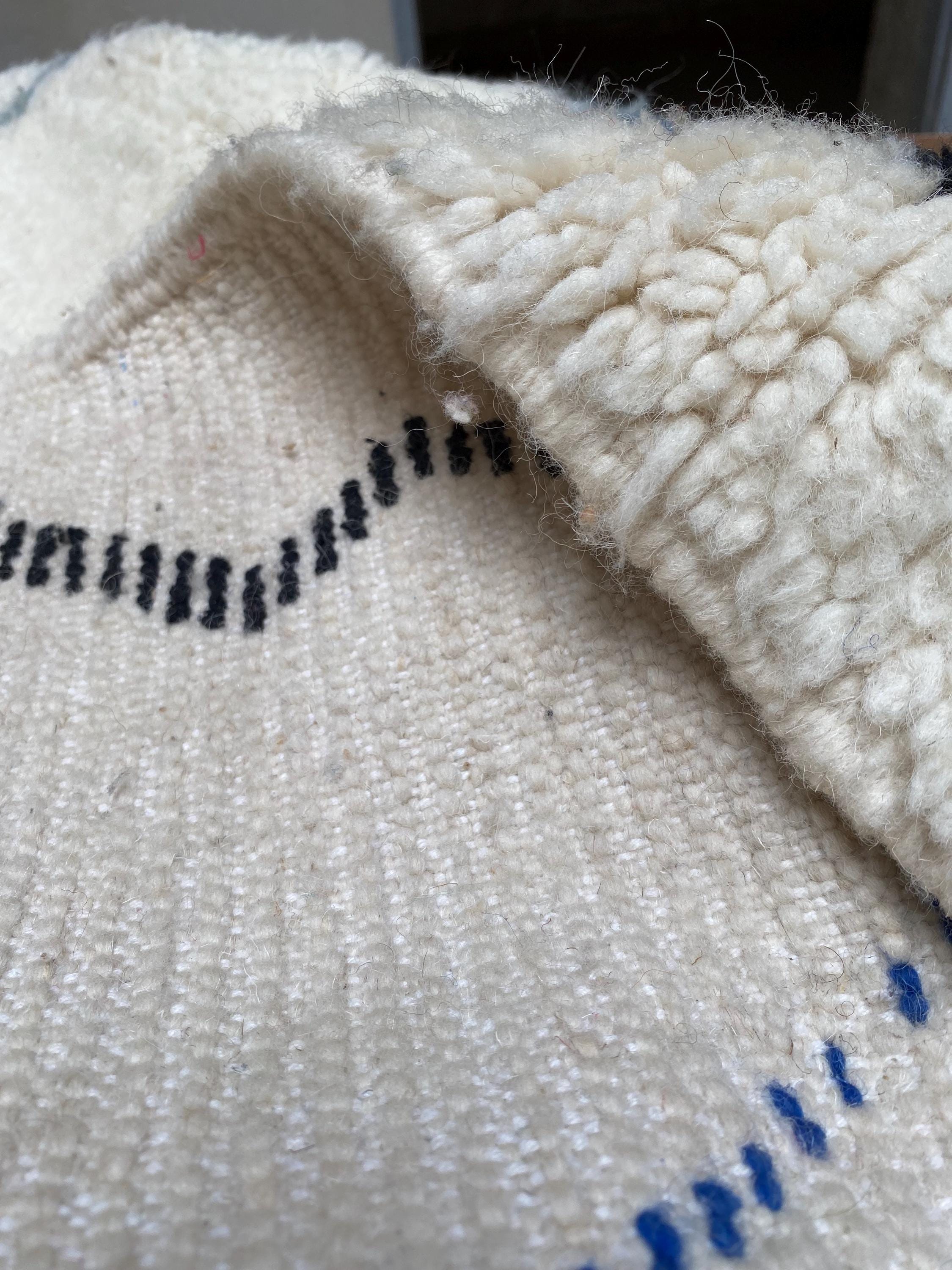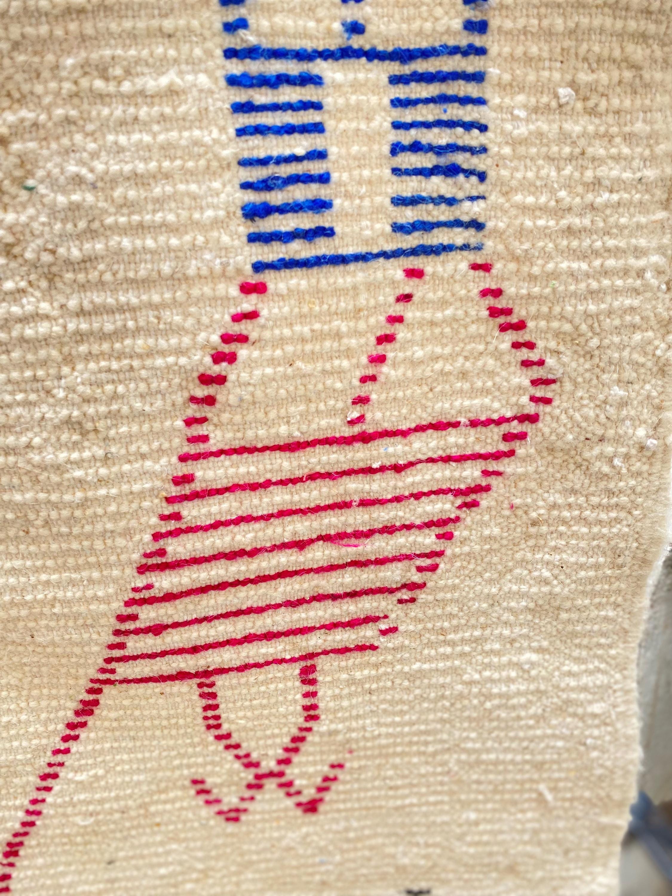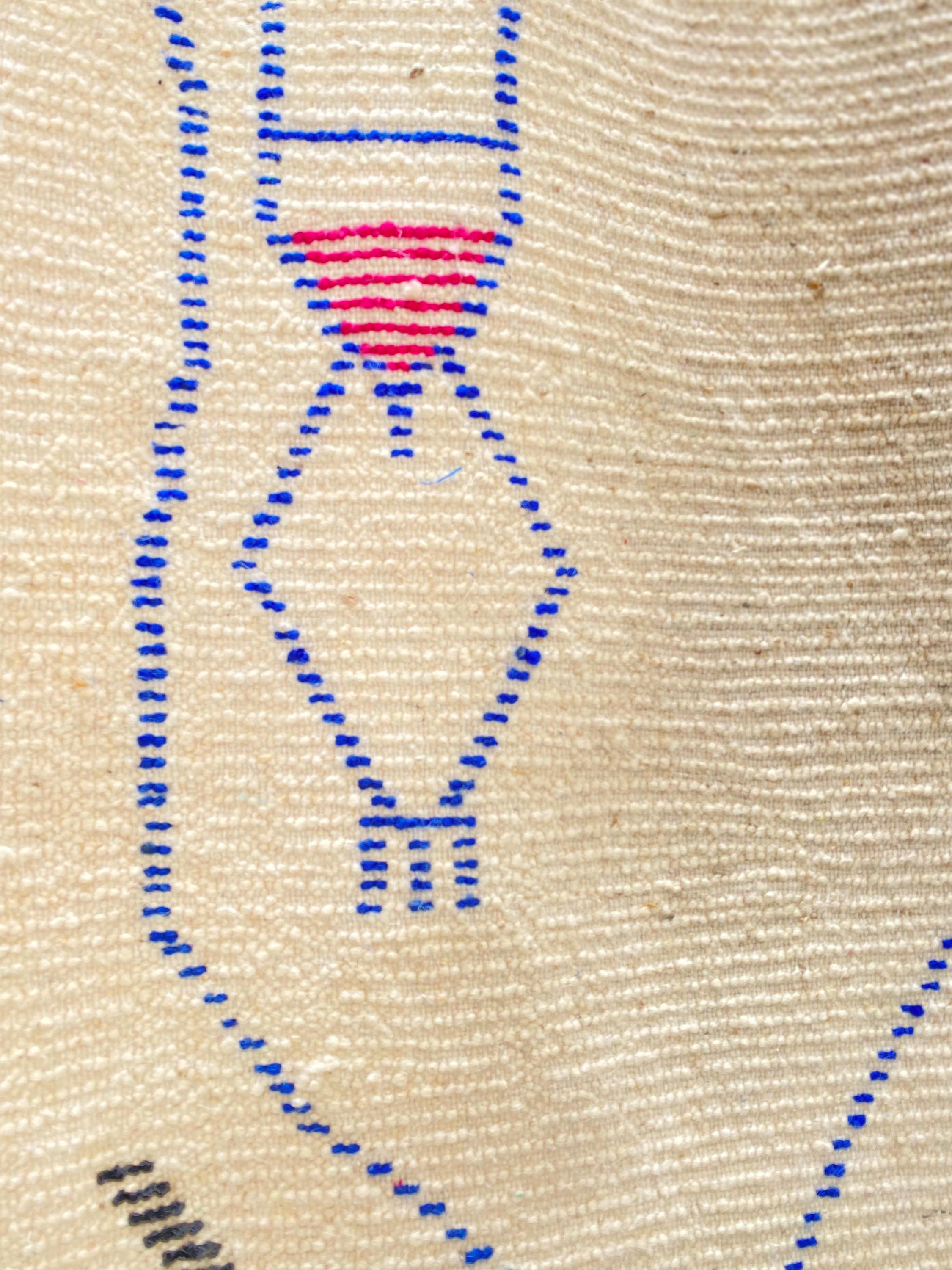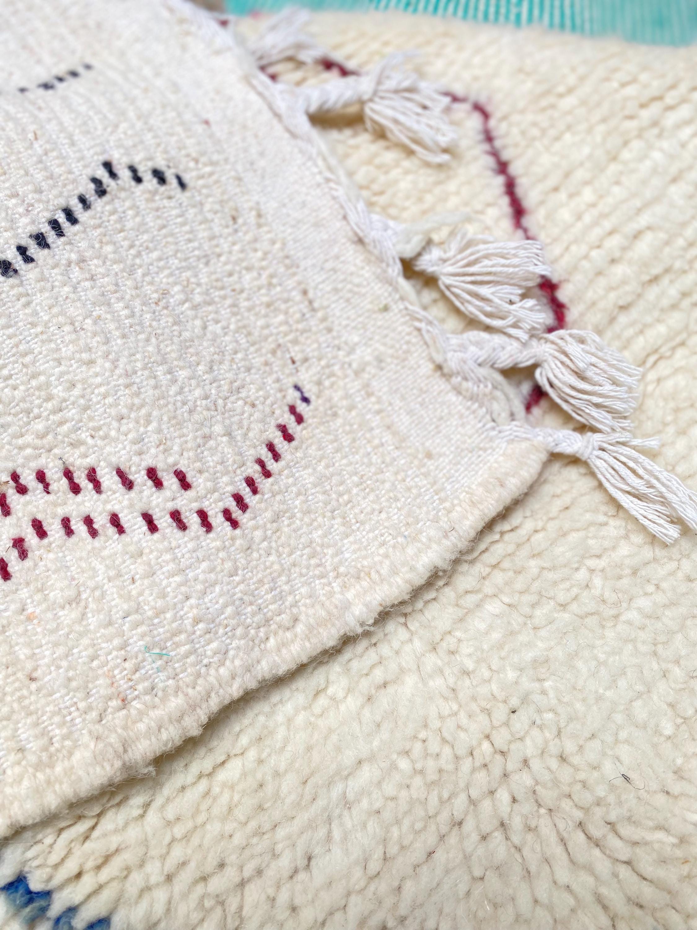 ✨ Handmade Moroccan Beni Ourain Rug — Abstract Berber Wool Carpet | 150 x 100 cm (4′11″ × 3′3″) Bring warmth, texture, and authentic Moroccan craftsmanship into your home with this stunning handwoven Beni Ourain-style rug. Hand-knotted by skilled Berber artisans in Morocco using 100% natural wool, this piece features playful abstract symbols in pink, blue, and charcoal on a luxuriously soft ivory white ground — a perfect blend of boho, modern, and Scandinavian aesthetics. ▸ SIZE: 150 cm × 100 cm | 4′11″ × 3′3″ ▸ STYLE: Beni Ourain / Azilal inspired | Boho | Tribal | Modern ▸ MATERIAL: 100% natural wool pile on a cotton flatweave backing ▸ PILE: High and plush on the front; flat kilim-style reverse ▸ FRINGE: Hand-knotted white cotton tassels 🏠 PERFECT FOR: • Entryway / hallway rug • Kitchen accent rug • Wall hanging / boho wall décor • Living room area rug • Bedroom rug beside the bed • Nursery or kids' room Each rug is one-of-a-kind — the symbols, colors, and layout are unique to a single weaver's hand and carry centuries of Berber tradition and meaning. 📦 SHIPPING — WORLDWIDE | DOOR TO DOOR | 4–6 BUSINESS DAYS We ship globally via FedEx, DHL, or Aramex. Every order includes: ✔ Full tracking number sent to your inbox ✔ Secure, professional packaging to protect your rug ✔ Door-to-door delivery in 4 to 6 business days 🔍 SEO TAGS: moroccan rug, beni ourain rug, berber rug, wool rug handmade, boho rug, abstract rug, white wool rug, tribal rug, azilal rug, small area rug, entryway rug, bedroom rug, wall rug, moroccan carpet, handknotted rug, pink blue rug, authentic moroccan rug, rug 5x3, accent rug, bohemian home decor