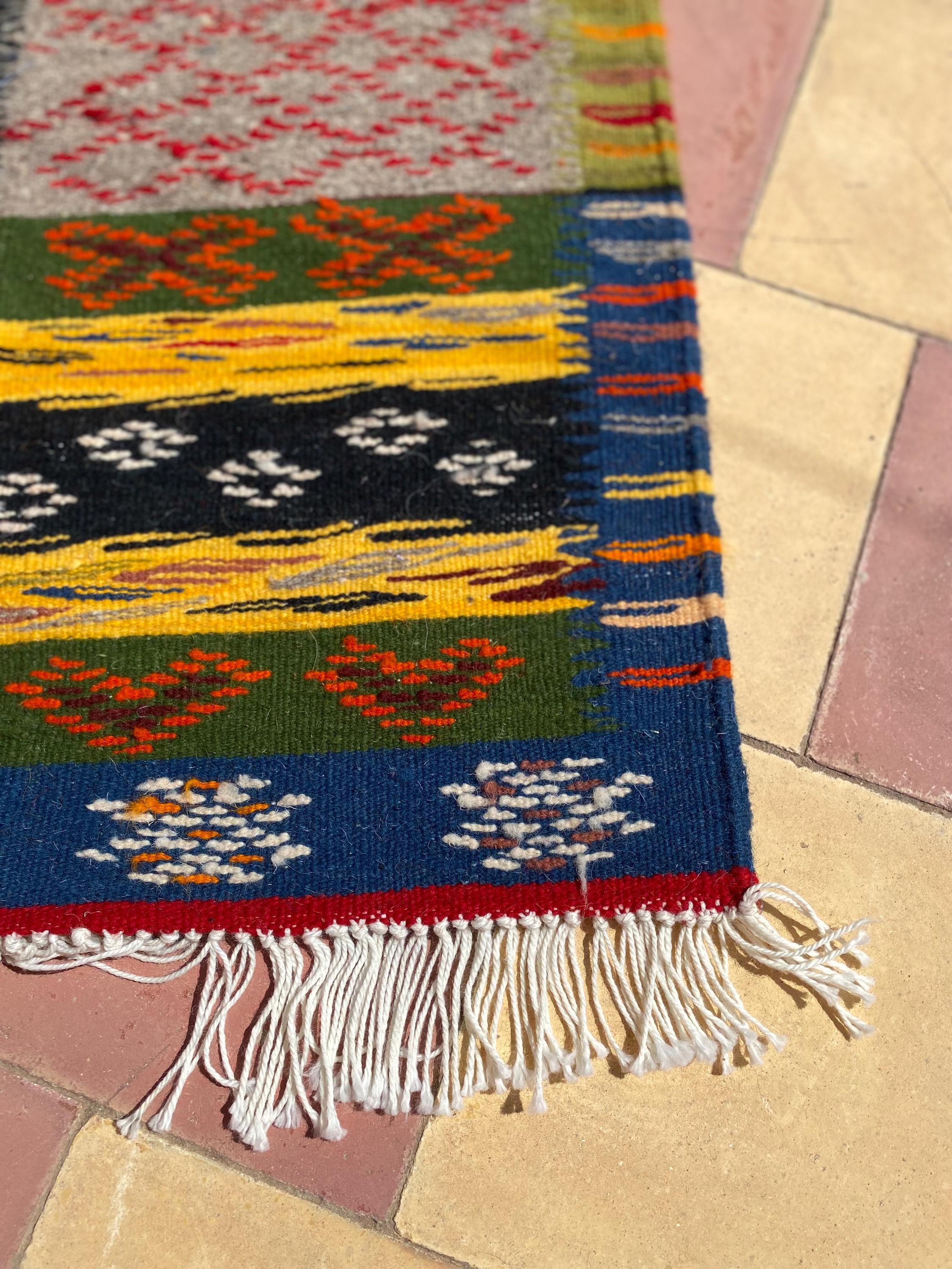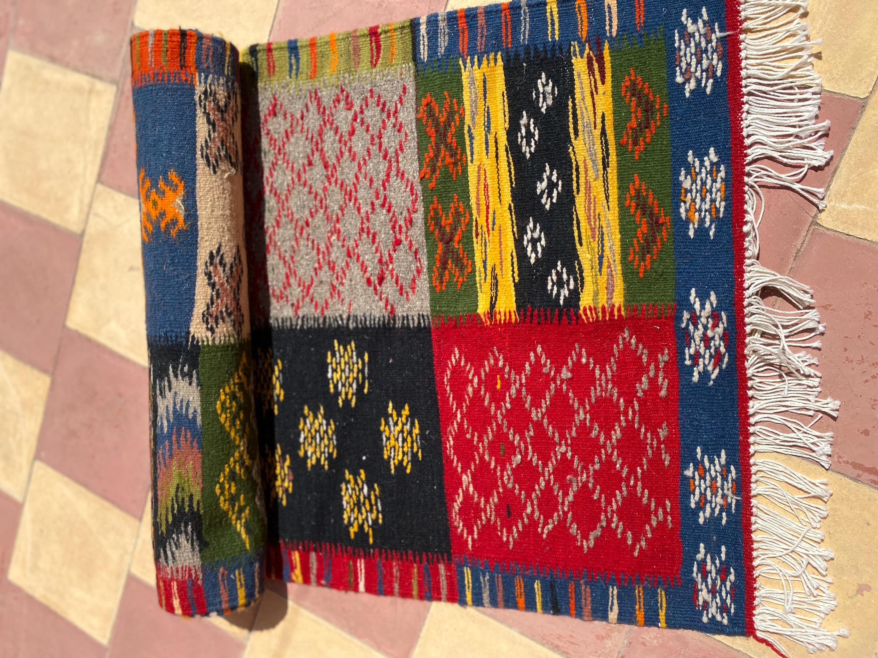 Flat-woven (kilim style) on a traditional loom using 100% natural sheep wool β hand-spun and dyed in rich, earthy tones of cobalt blue, saffron orange, forest green, crimson red, mustard yellow, charcoal, and ivory. The geometric symbols woven into each panel are ancient Berber motifs β protective signs, fertility symbols, and prayers for abundance.