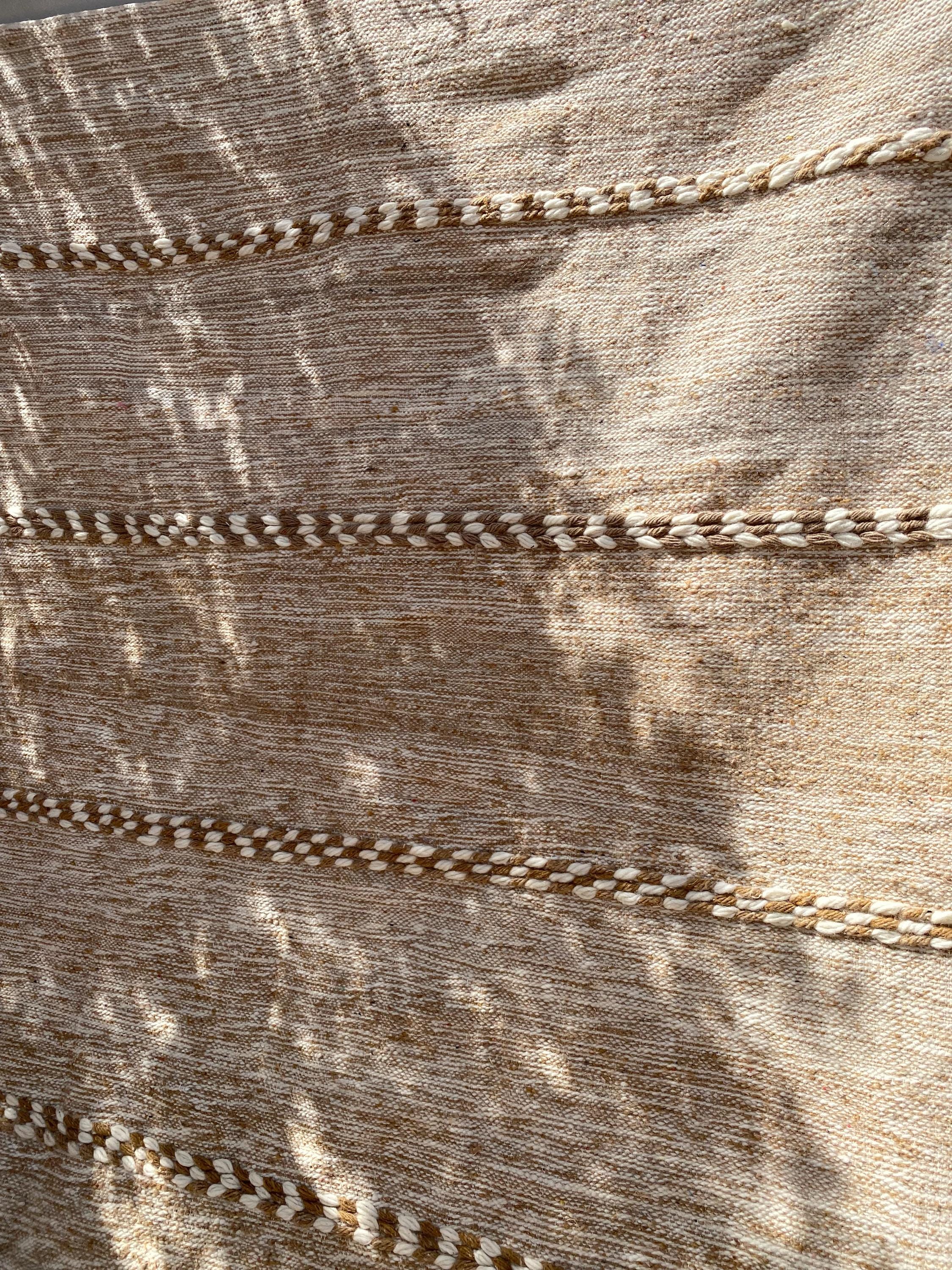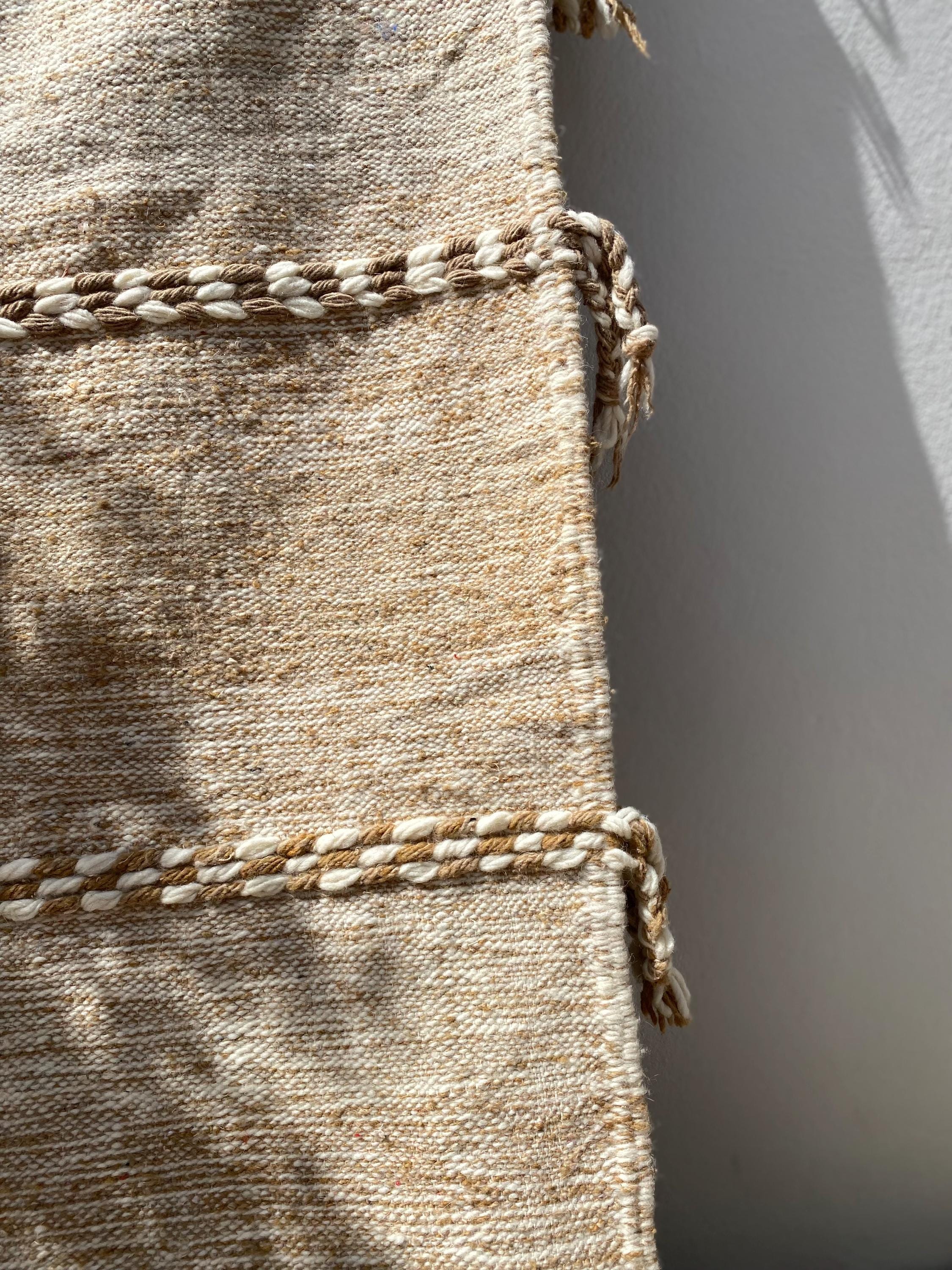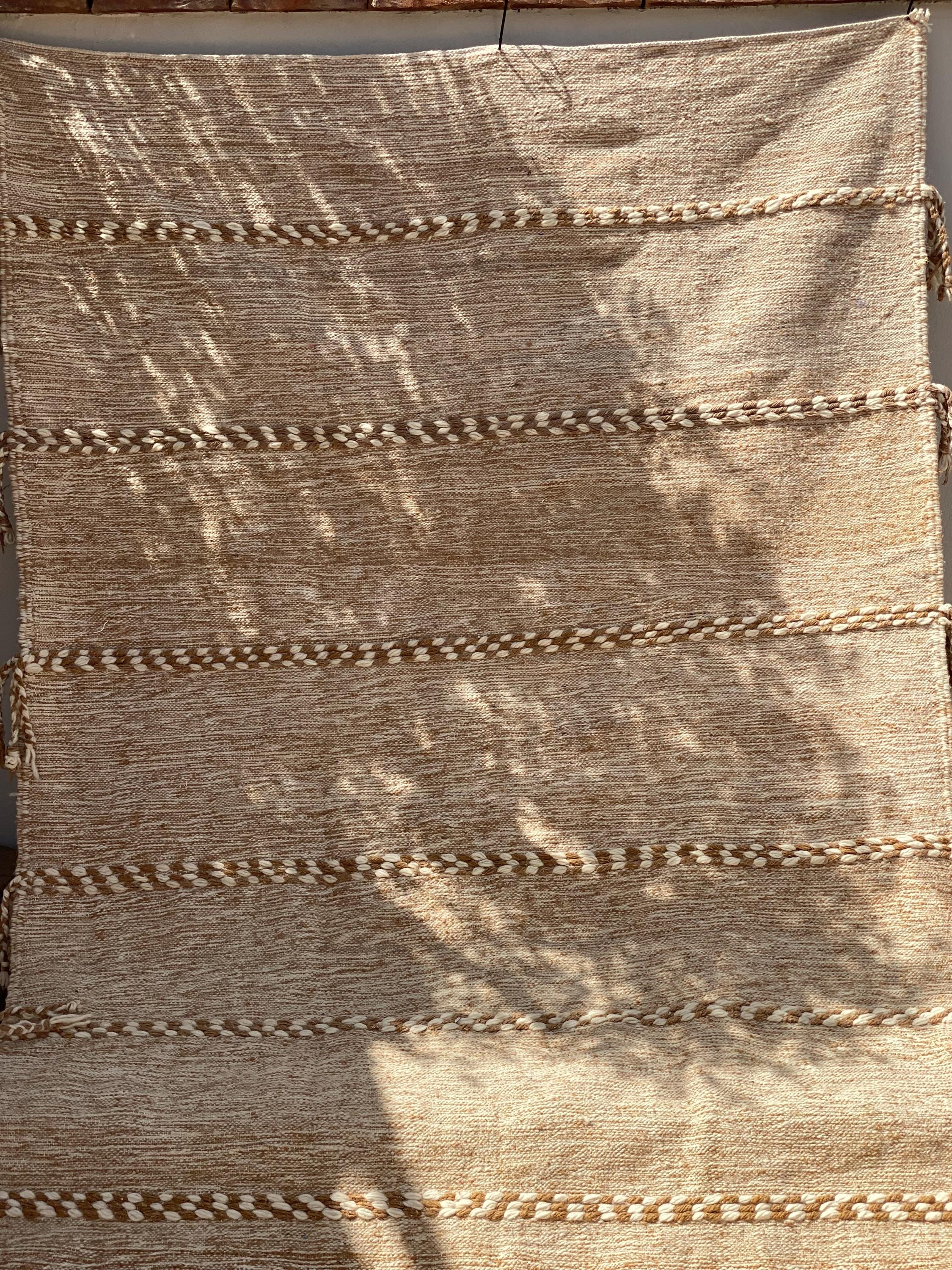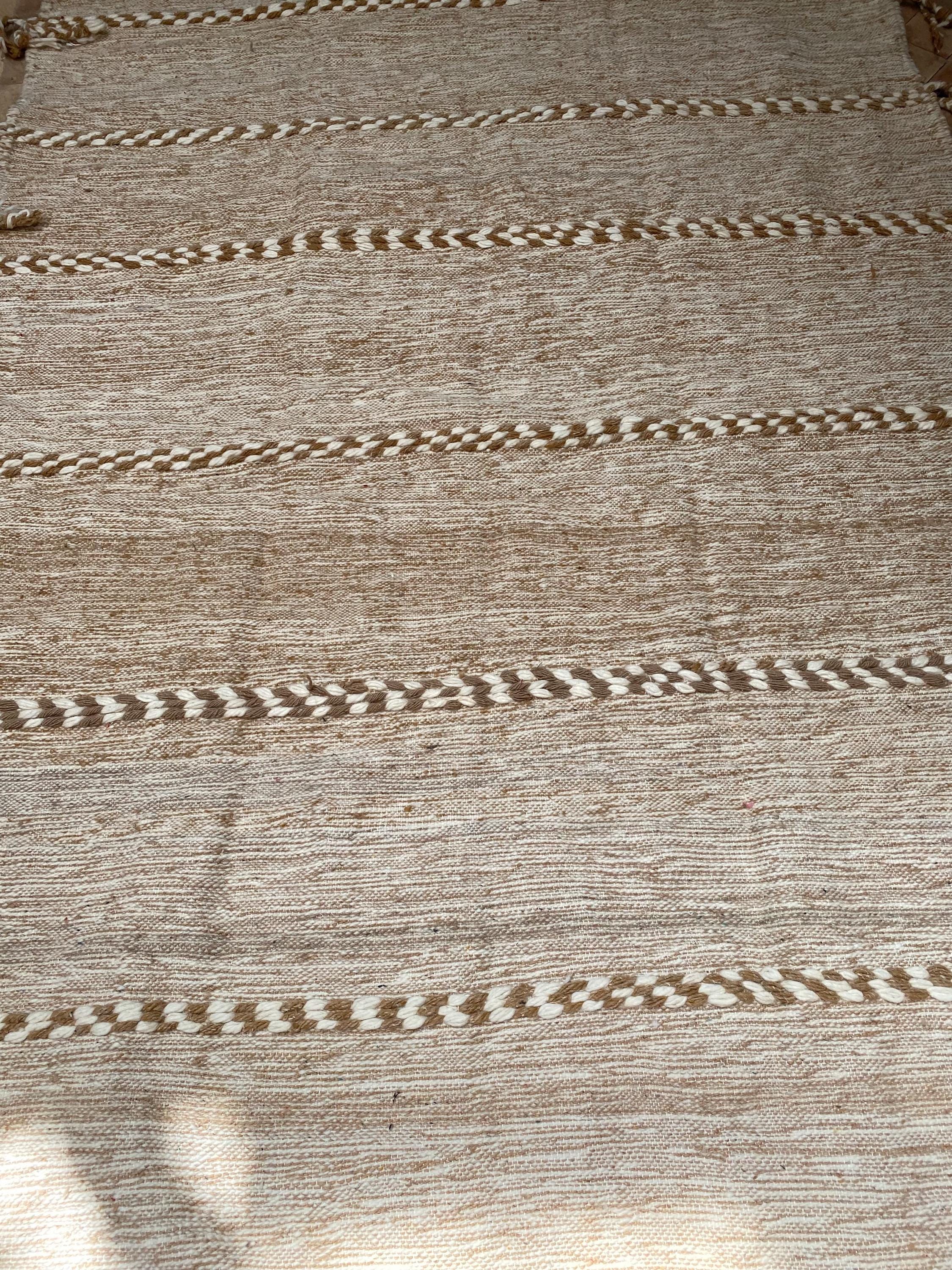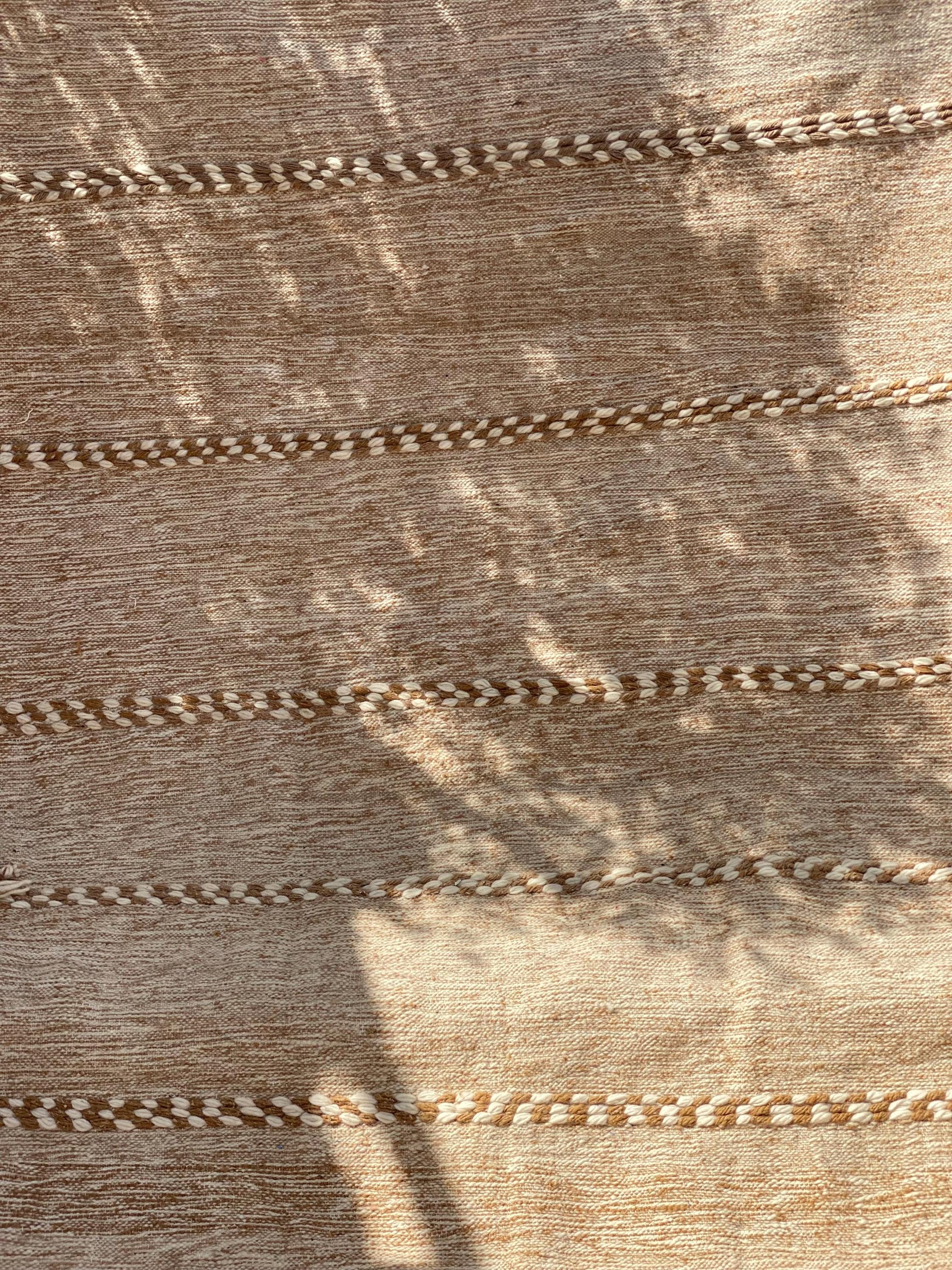 Unlike thick pile rugs, this flatweave Berber kilim is crafted from 100% natural sheep wool — naturally cool underfoot, making it ideal for hot climates, sun-filled rooms, and breezy summer interiors. The airy braided stripe design in soft ivory and sand tones brings a fresh, clean energy to any space.