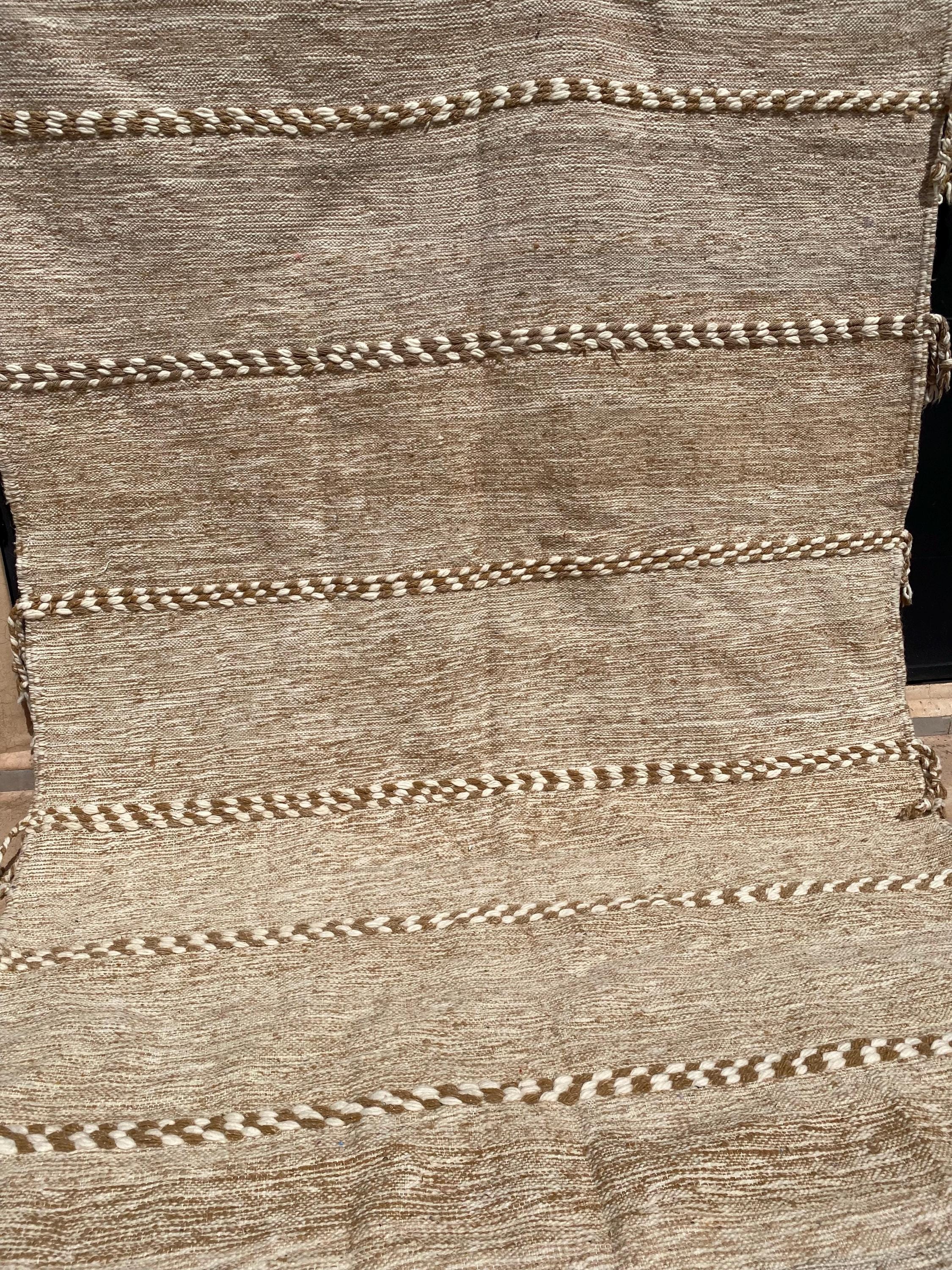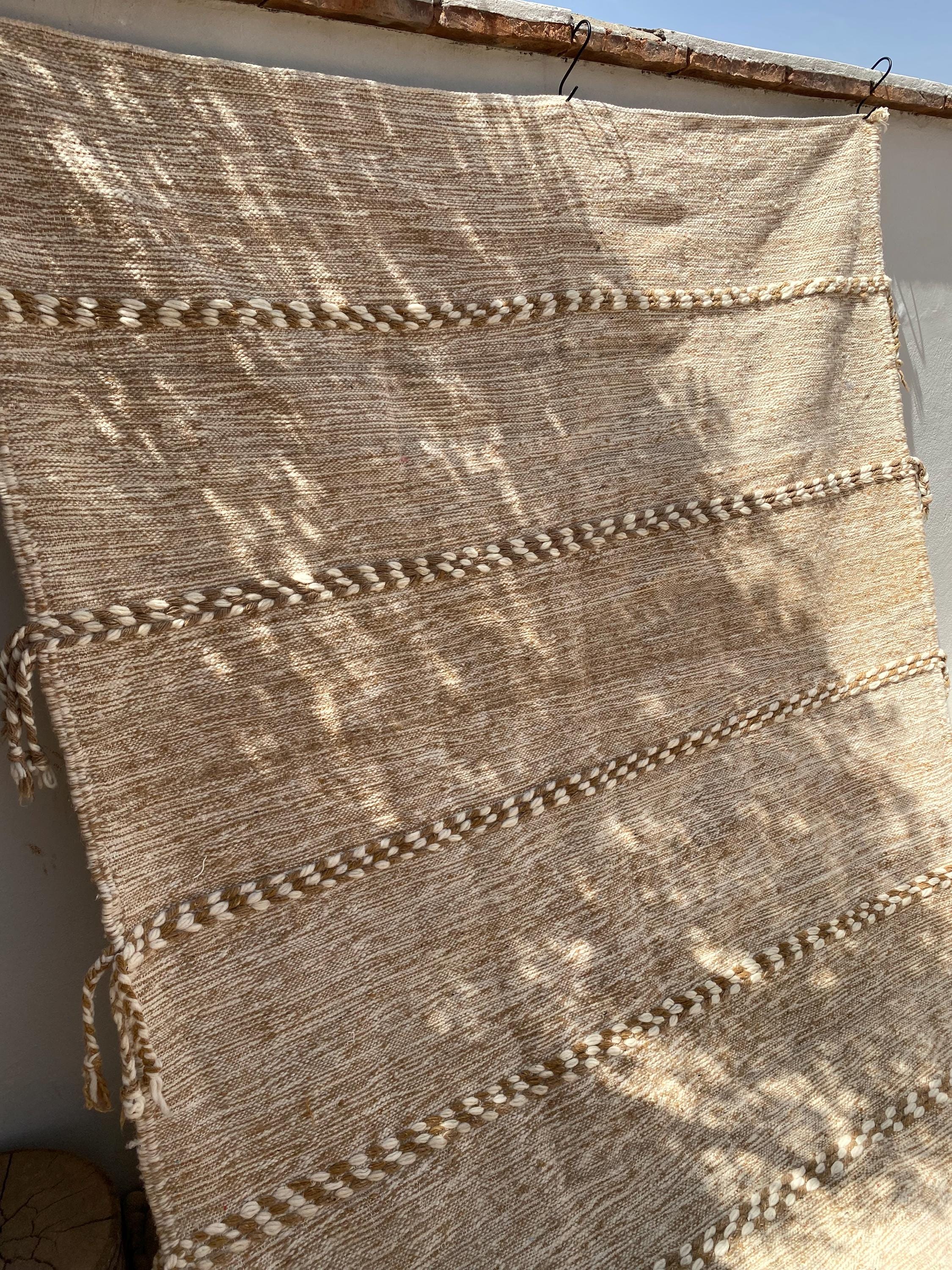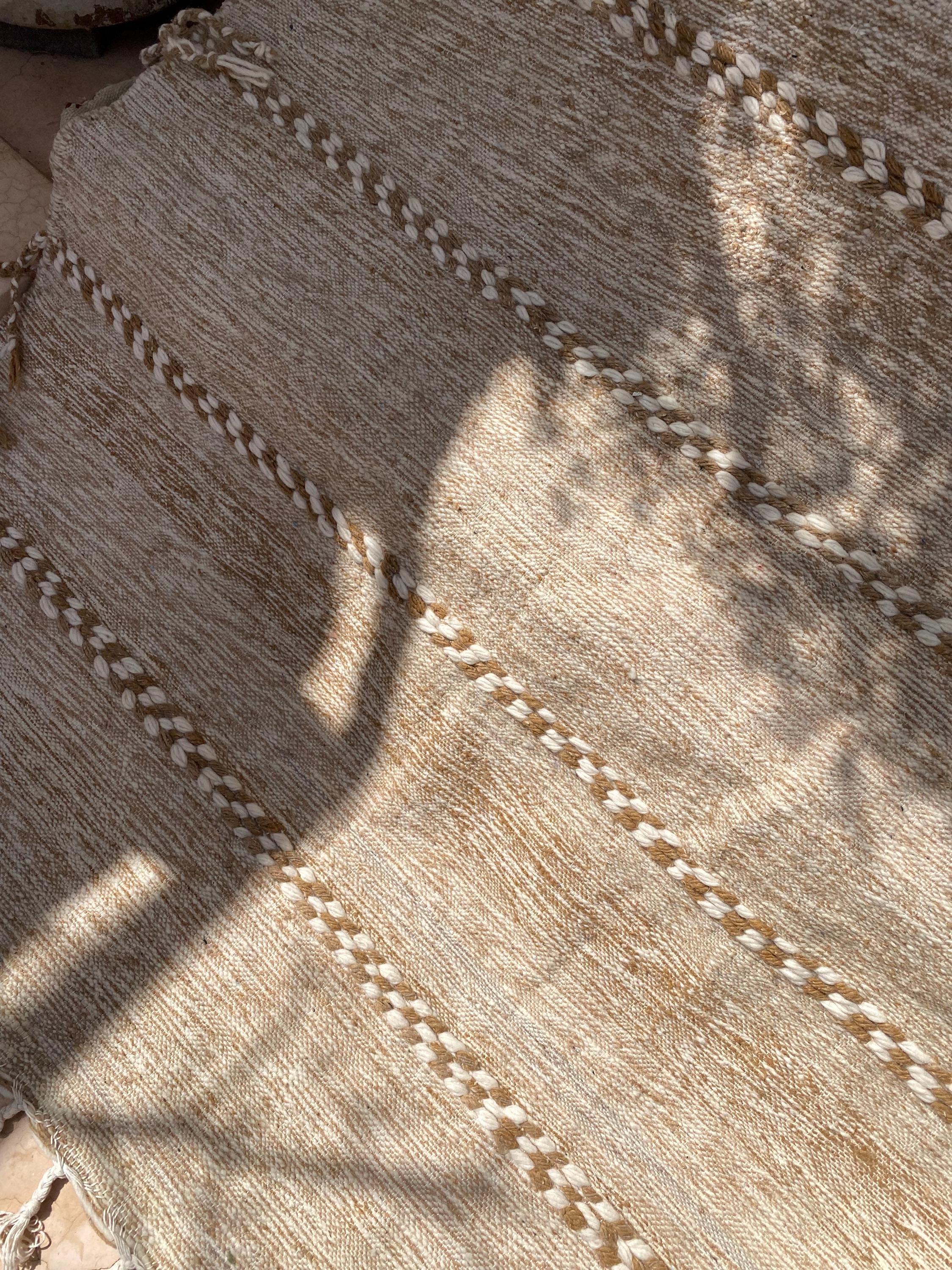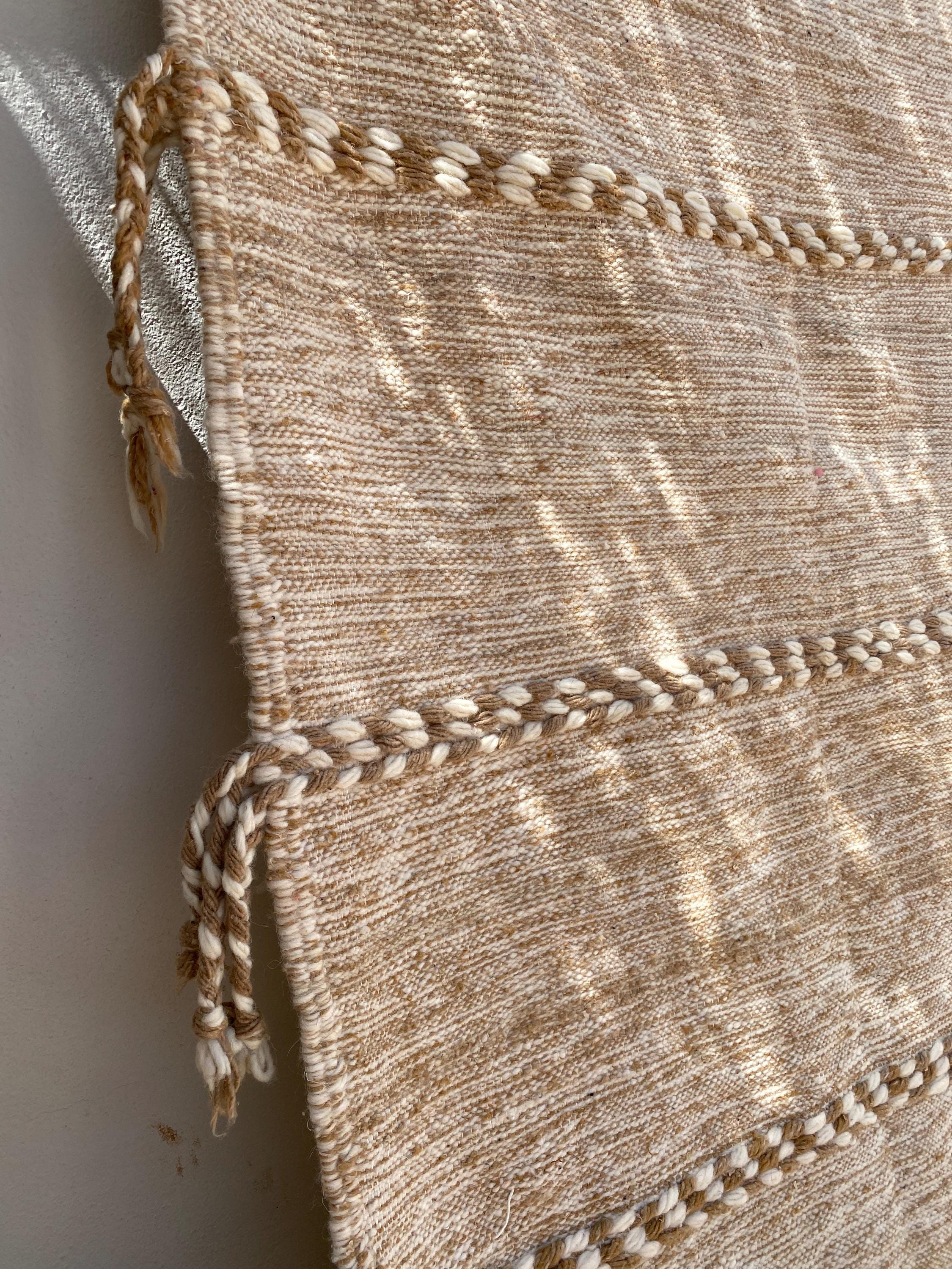 Unlike thick pile rugs, this flatweave Berber kilim is crafted from 100% natural sheep wool — naturally cool underfoot, making it ideal for hot climates, sun-filled rooms, and breezy summer interiors. The airy braided stripe design in soft ivory and sand tones brings a fresh, clean energy to any space.