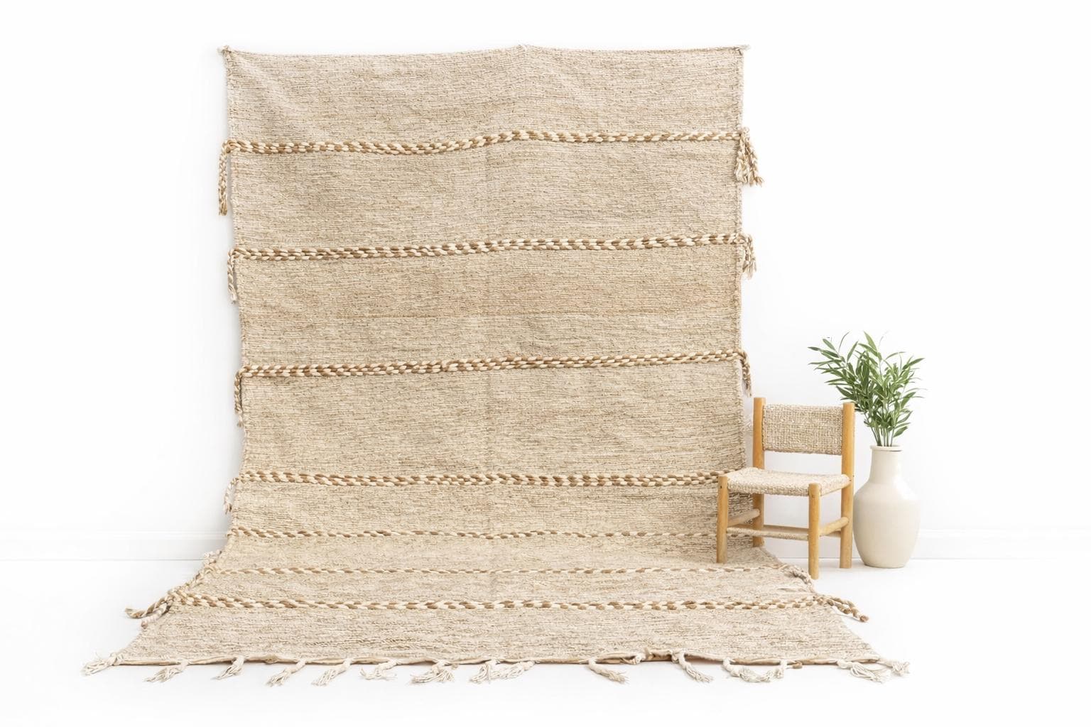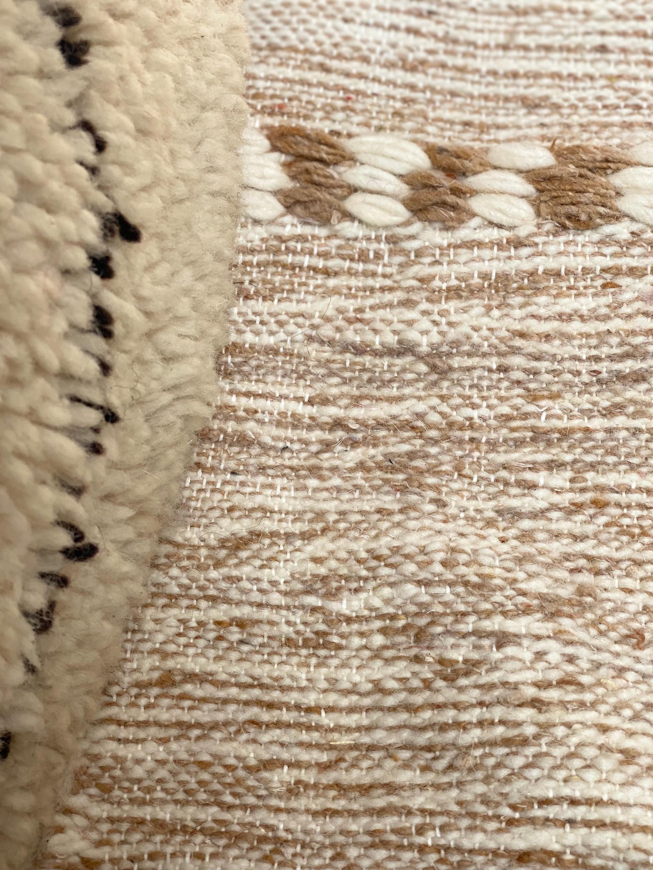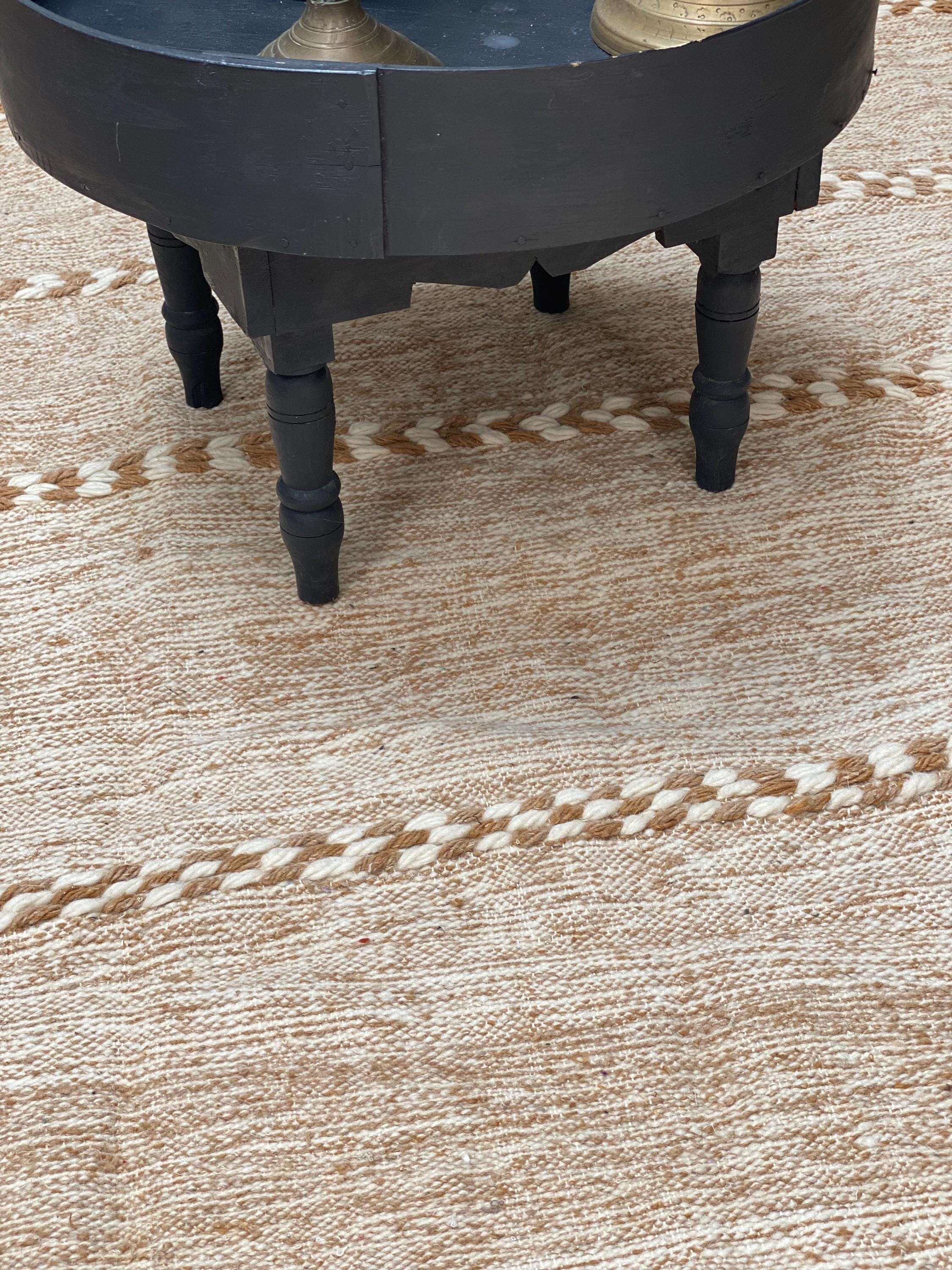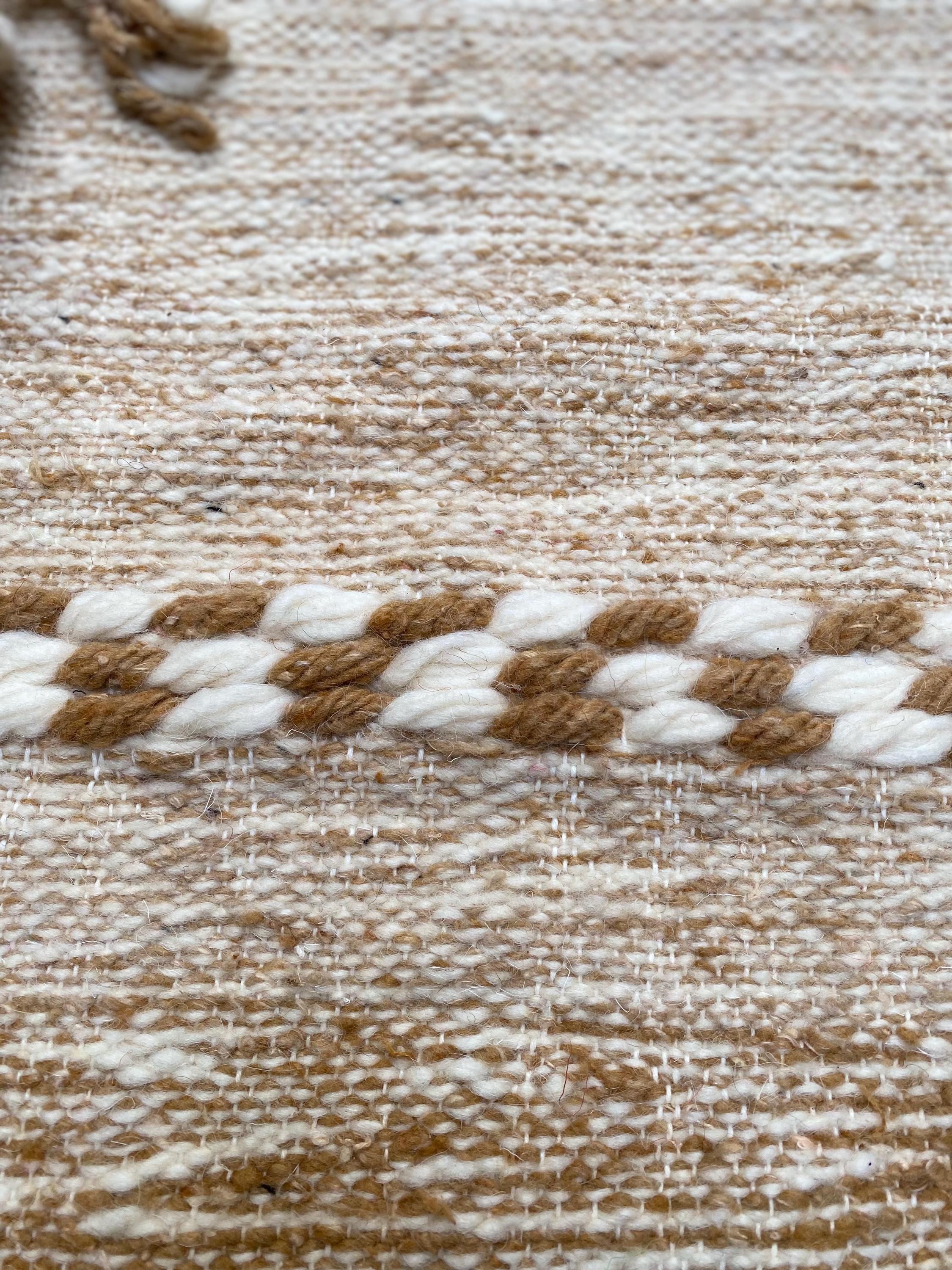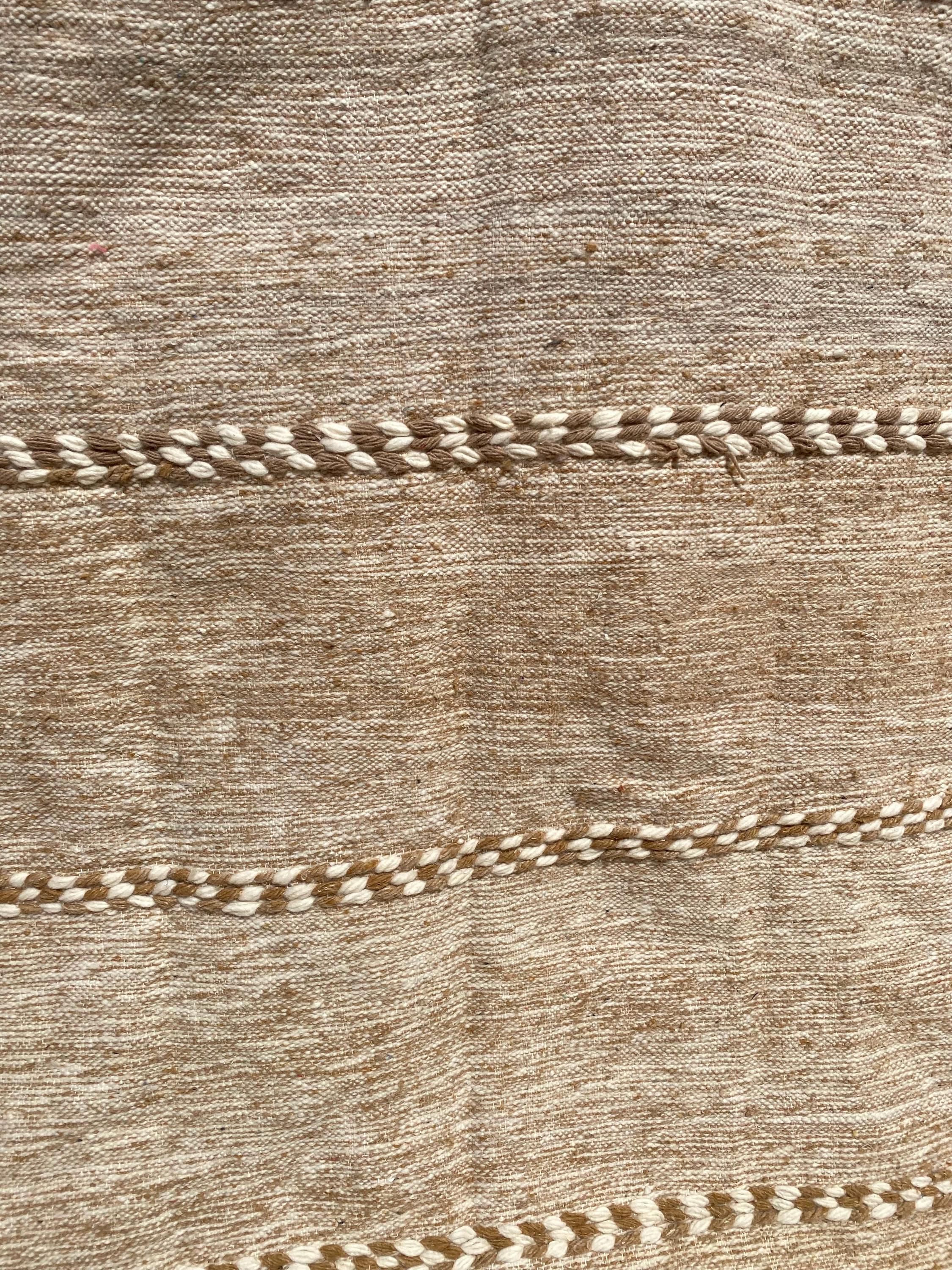 Unlike thick pile rugs, this flatweave Berber kilim is crafted from 100% natural sheep wool — naturally cool underfoot, making it ideal for hot climates, sun-filled rooms, and breezy summer interiors. The airy braided stripe design in soft ivory and sand tones brings a fresh, clean energy to any space.